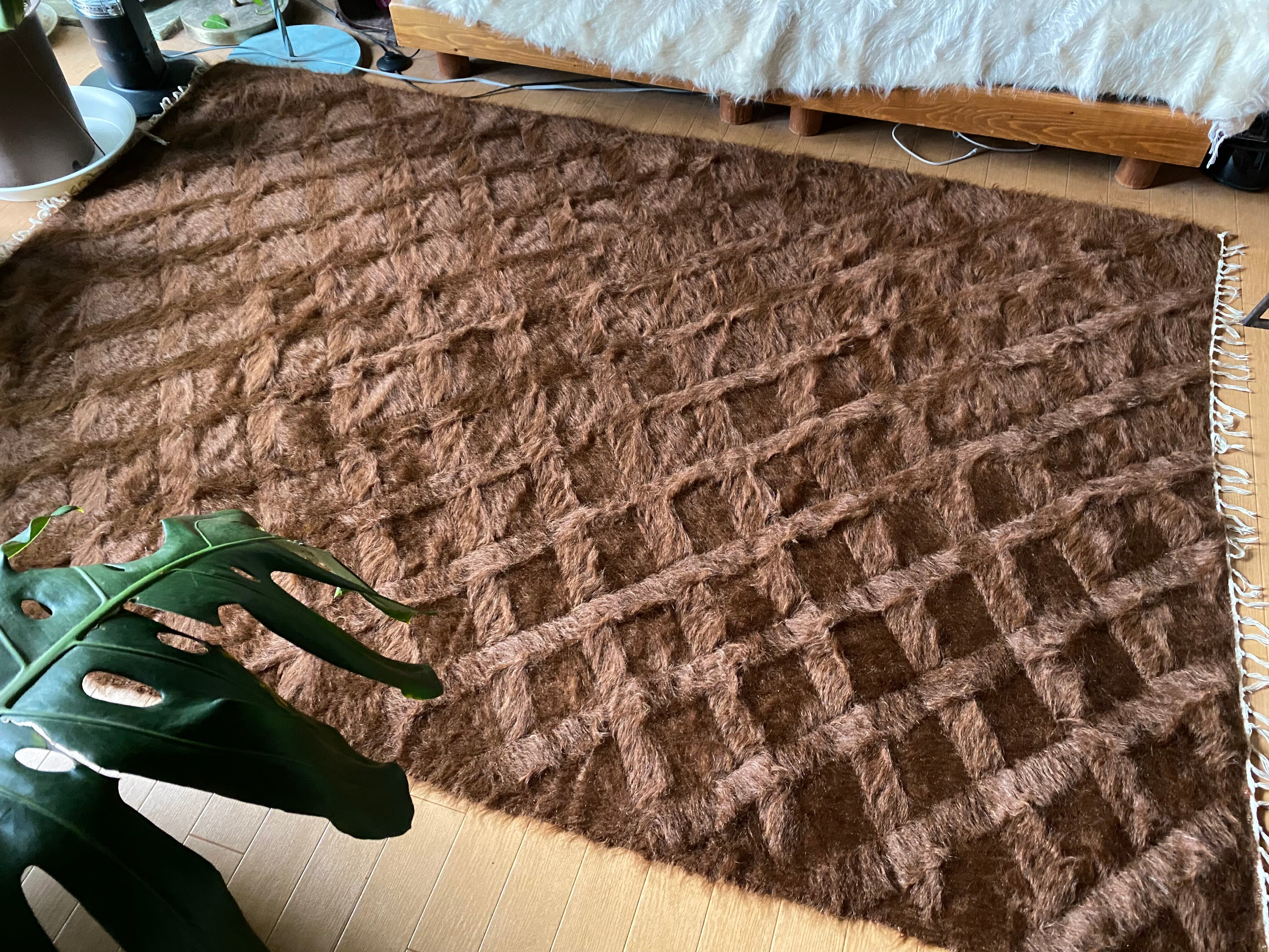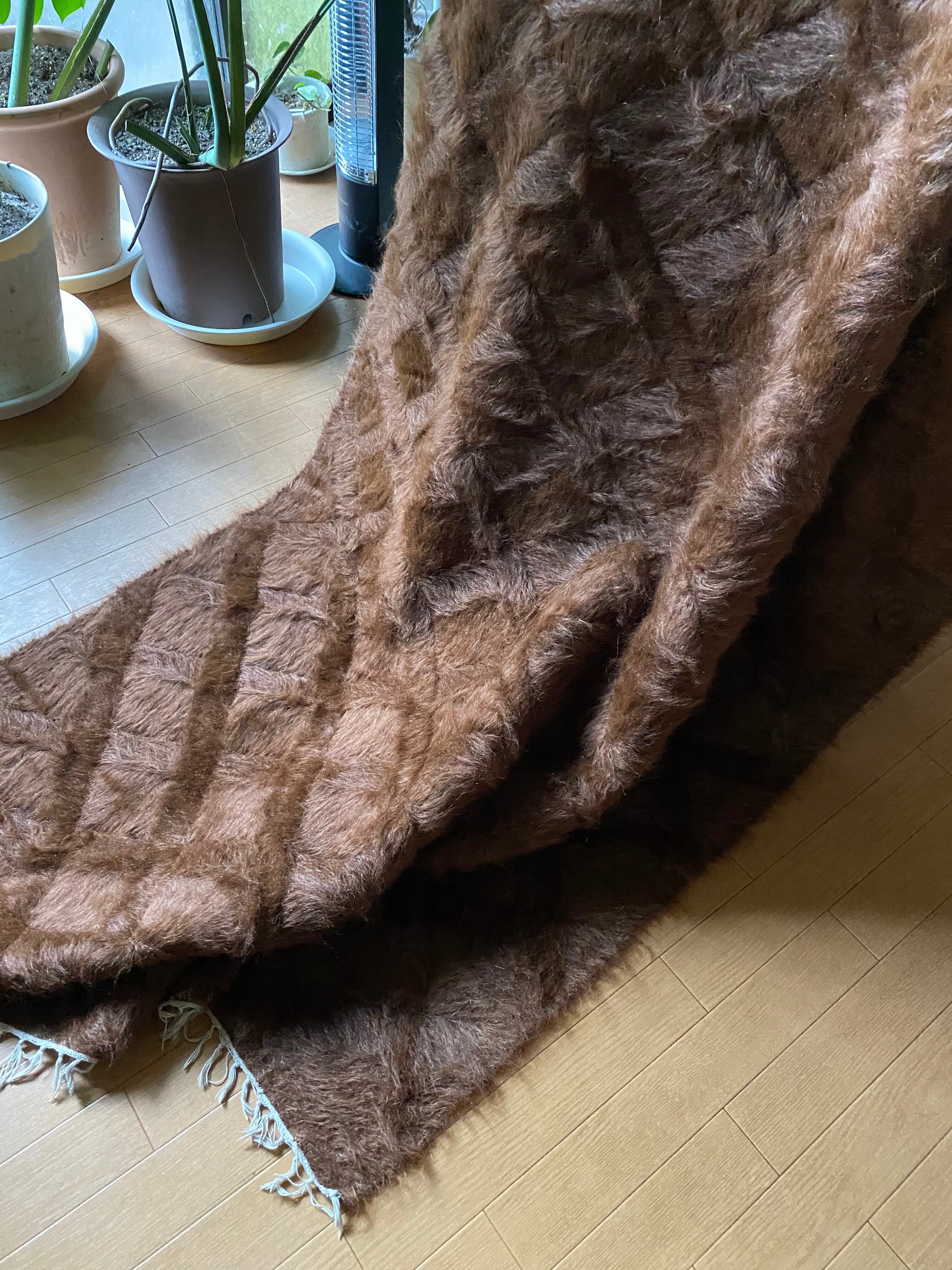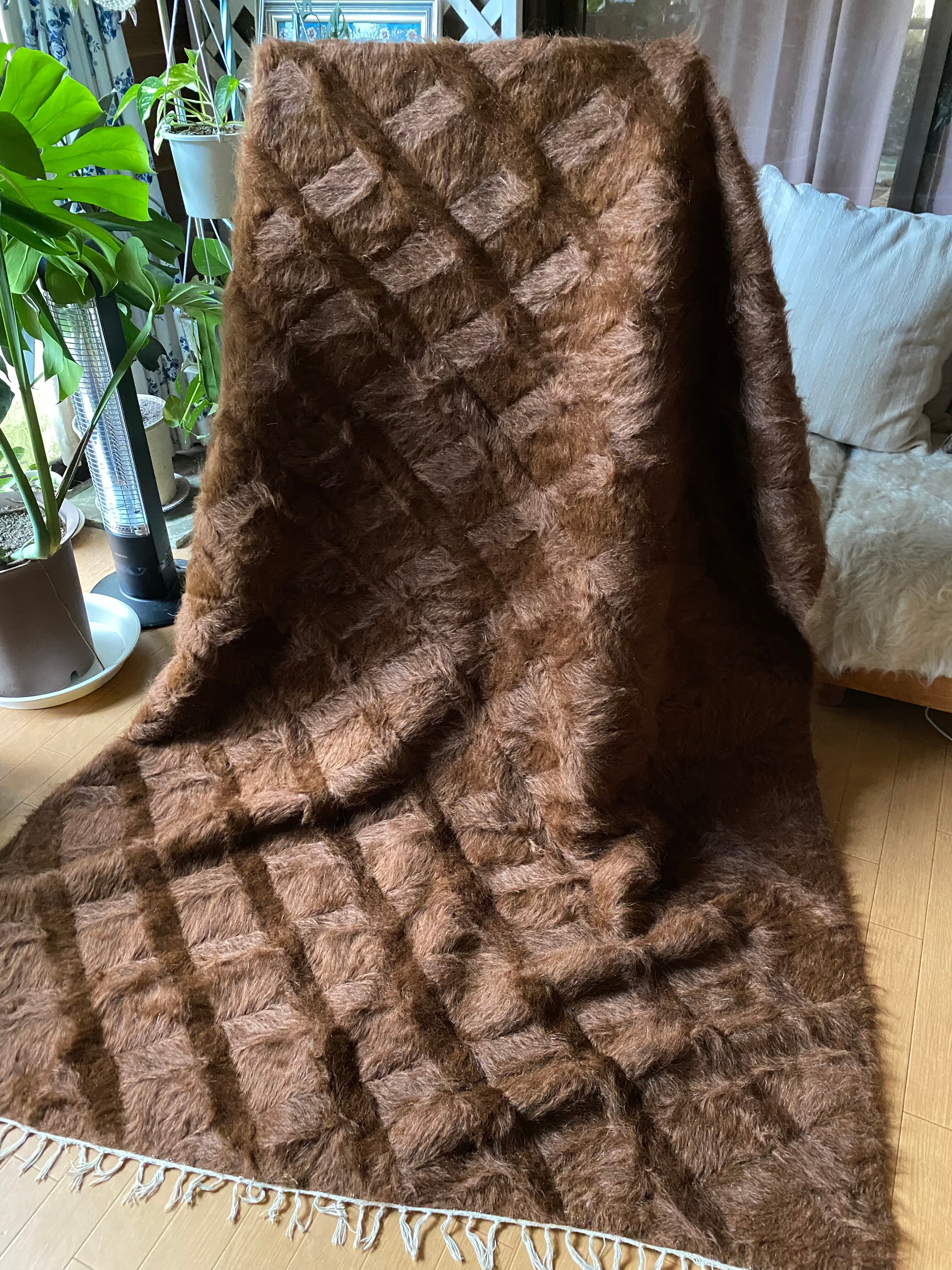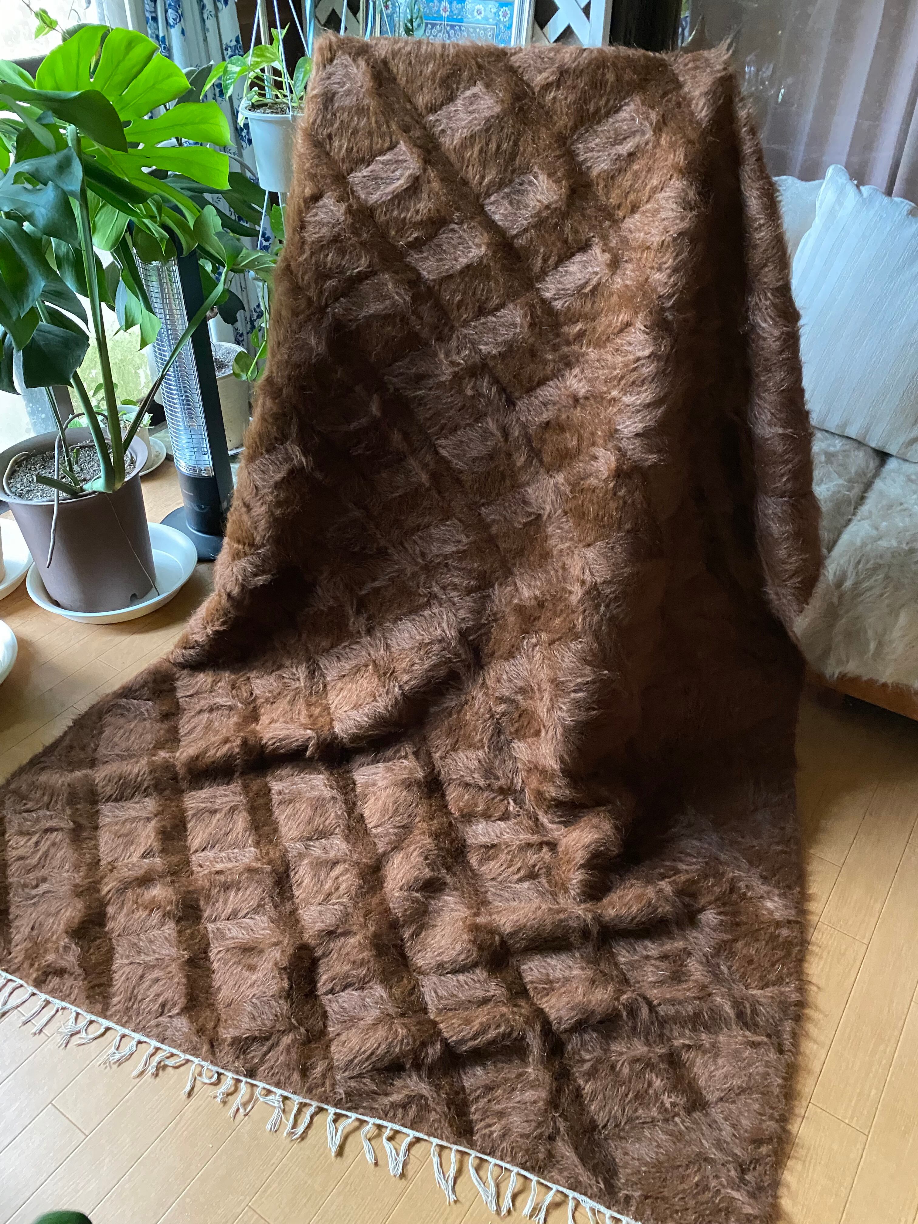 モフモフ素晴らしいミルクチョコ茶のヴィンテージ未使用品シイルトバッタニィエ!139×210毛量の多い艶々の茶のアンゴラヤギのモヘア100/毛羽立て模様が素敵な贅沢なずっしりとしたシイルトバッタニエトルコ東の遊牧民の生活の知恵で140年前から織られている毛布です