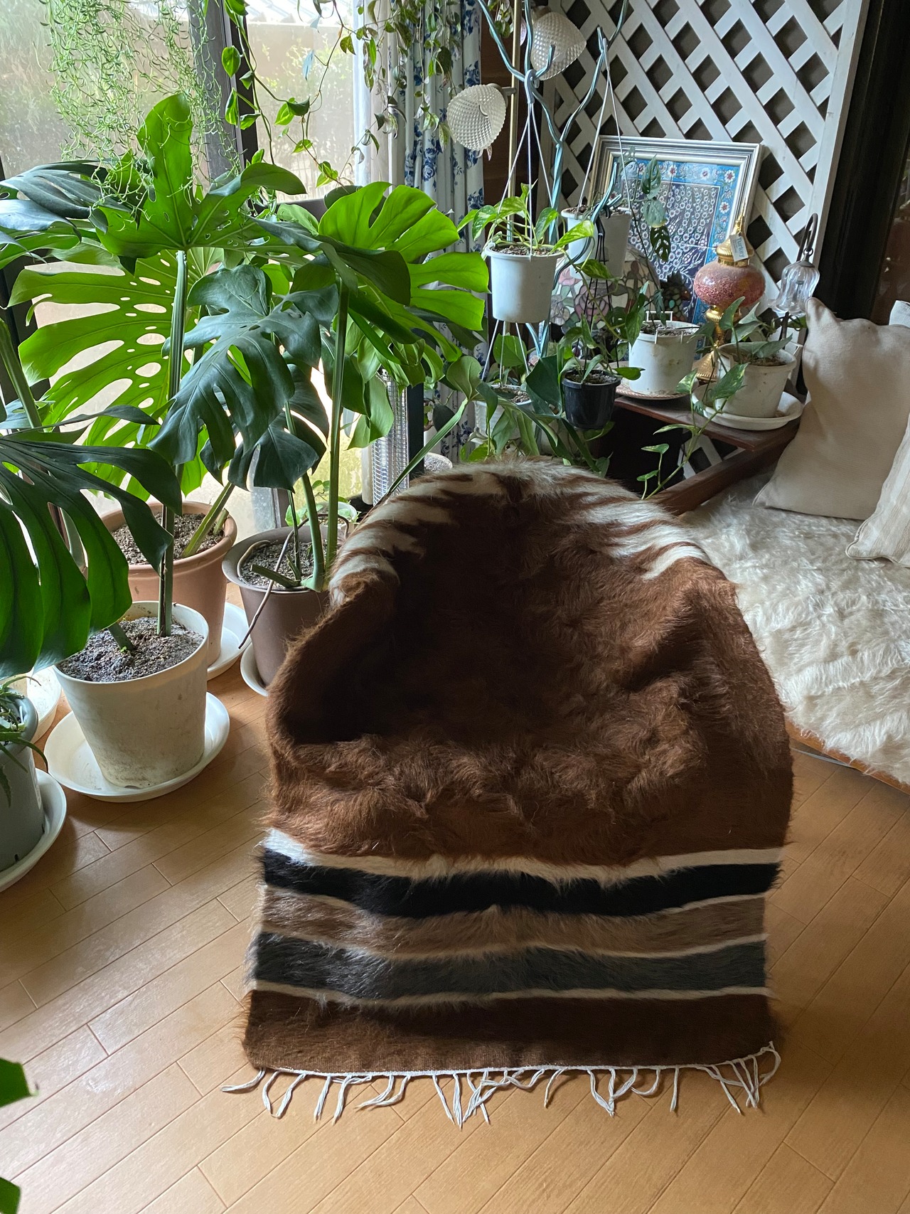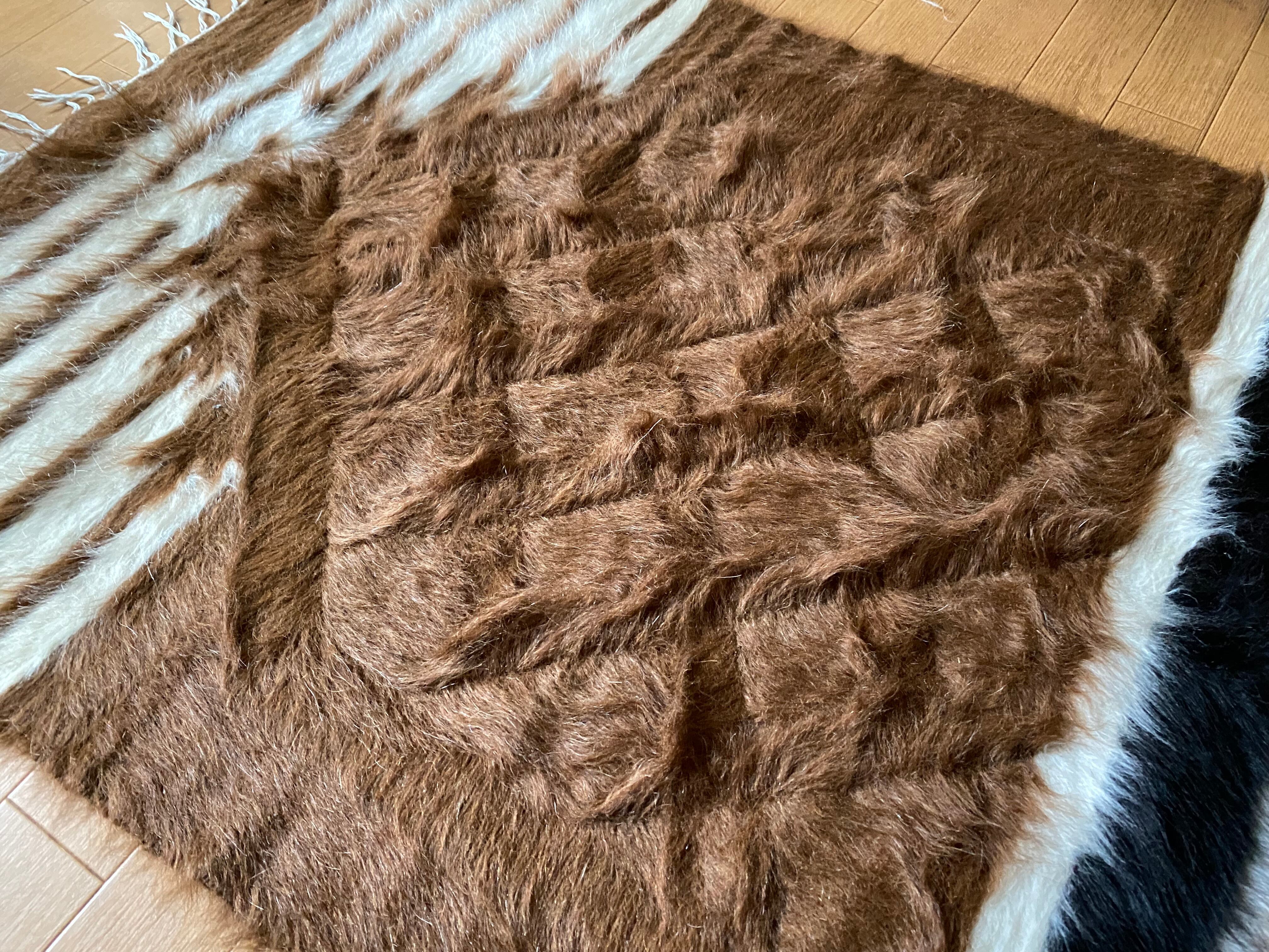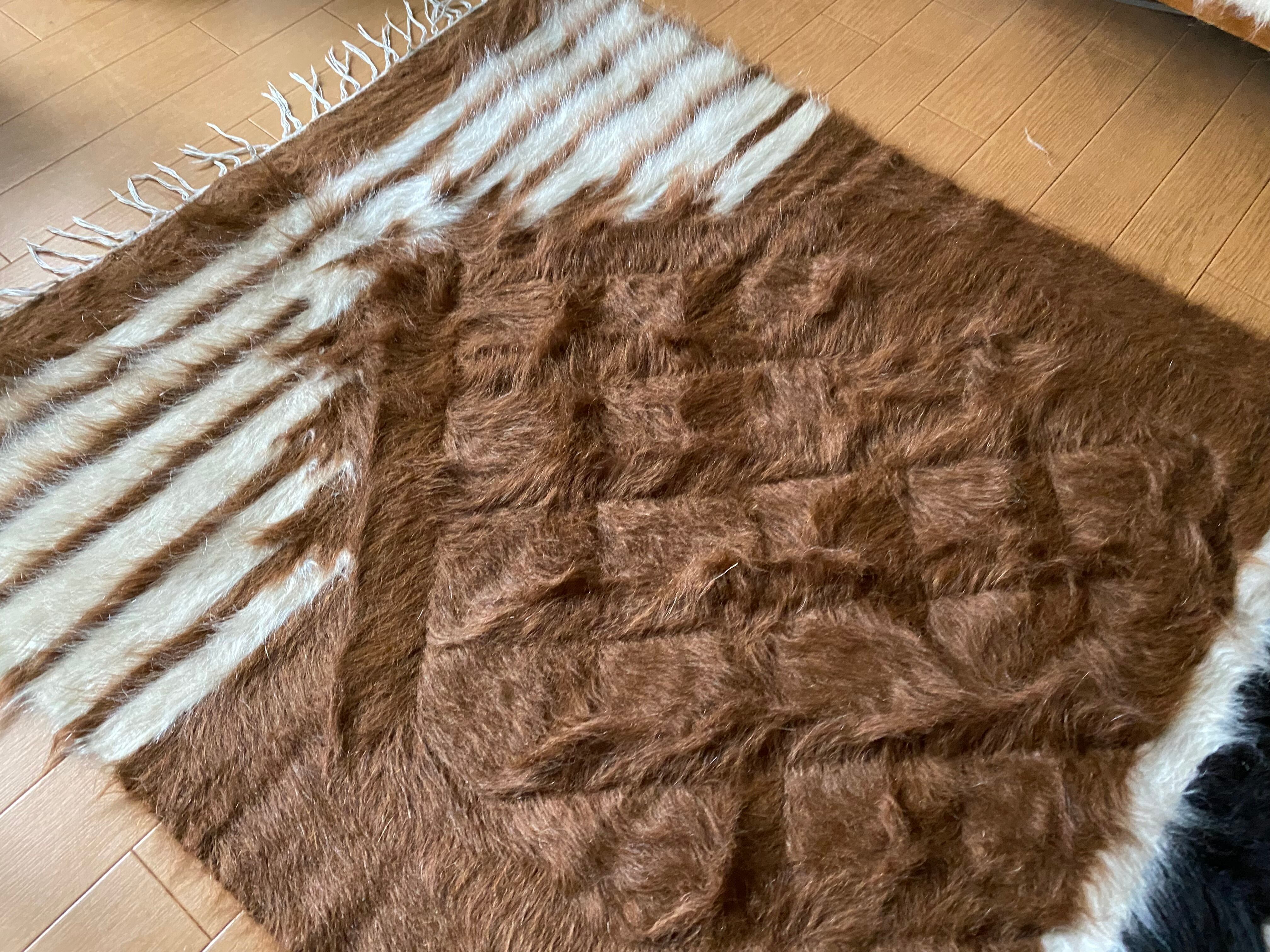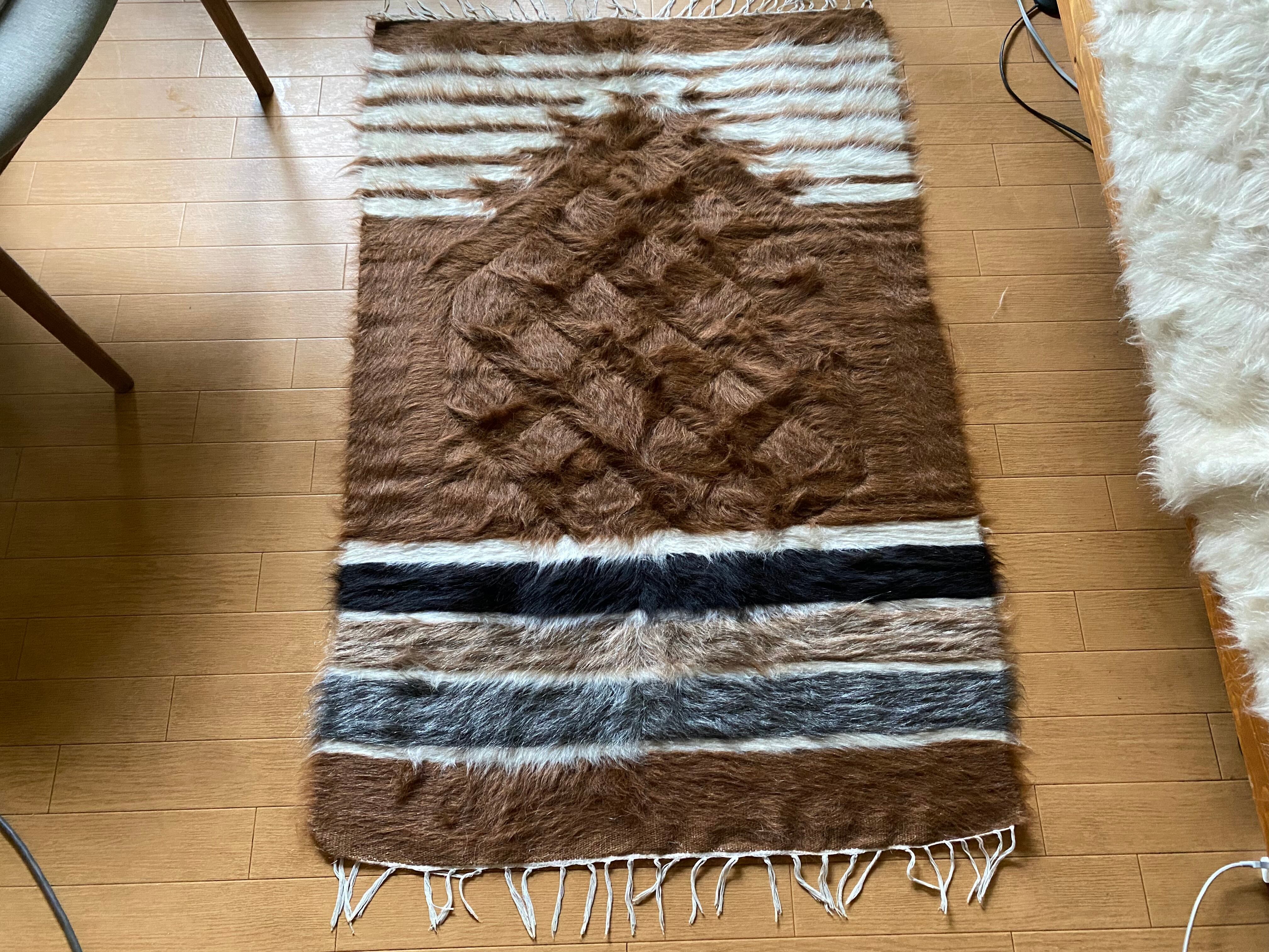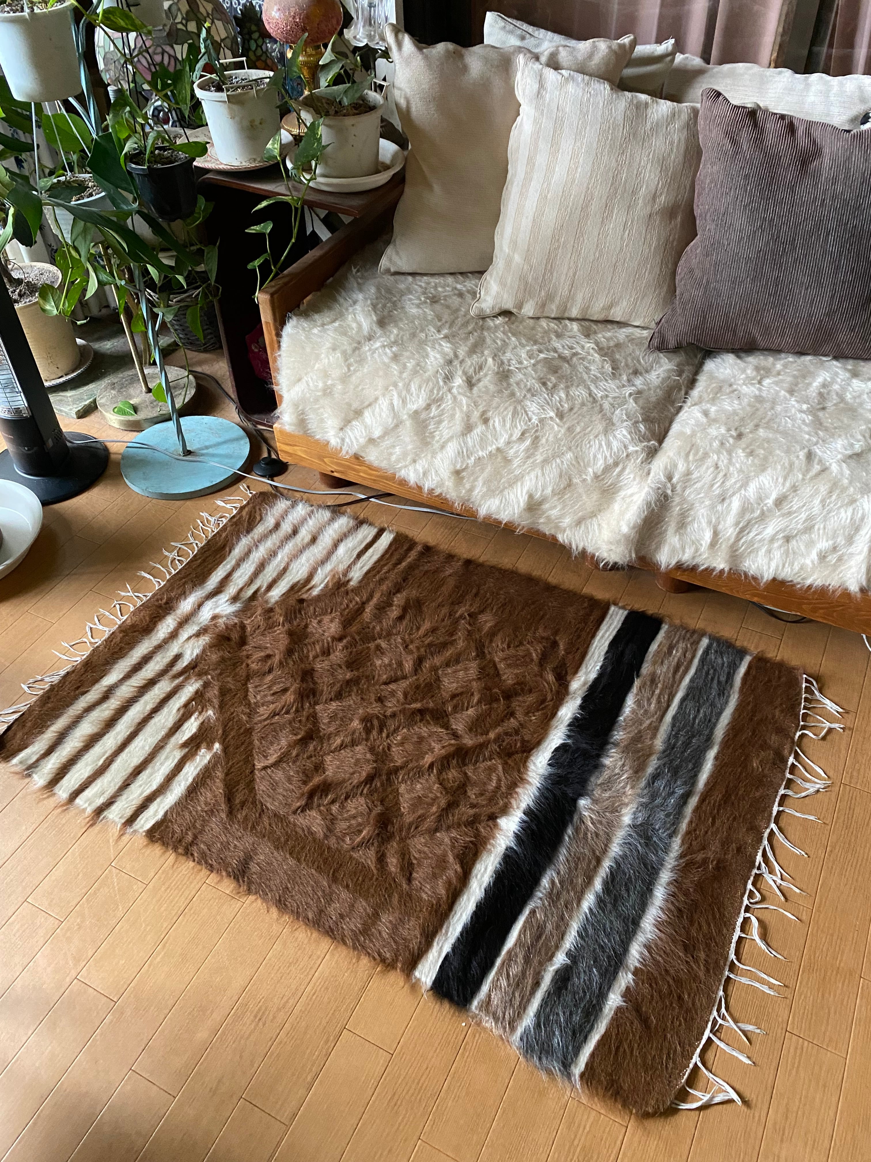 今の新しいものにくらべ、アンティークのバッタ二エと同じくらい密度が濃く、毛の艶がさらに良い山羊の毛で織られています。 未使用ですが、 ご覧いただけますように毛足も長めでつやつやです。30〜40年ほど前に織られていますが、ほぼ未使用のヴィンテージ未使用品になります。