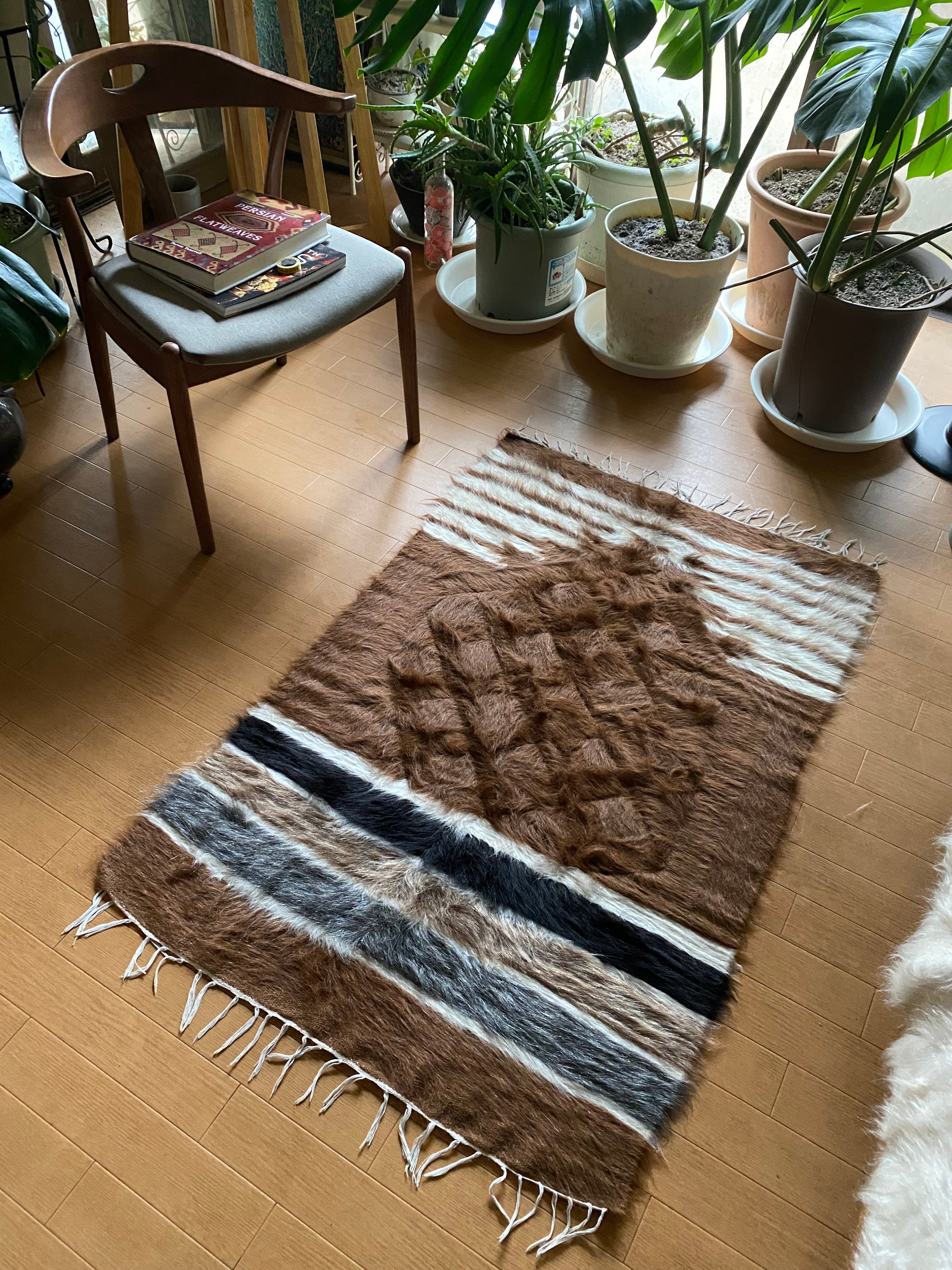 また、毛をけば立てて幾何学模様が入っておりますが、ウールではこのような毛羽立ちの模様はできないそうです。山羊ならではの模様をお楽しみください。 裏面でお使いいただければ、普通のキリムとして も使えます。