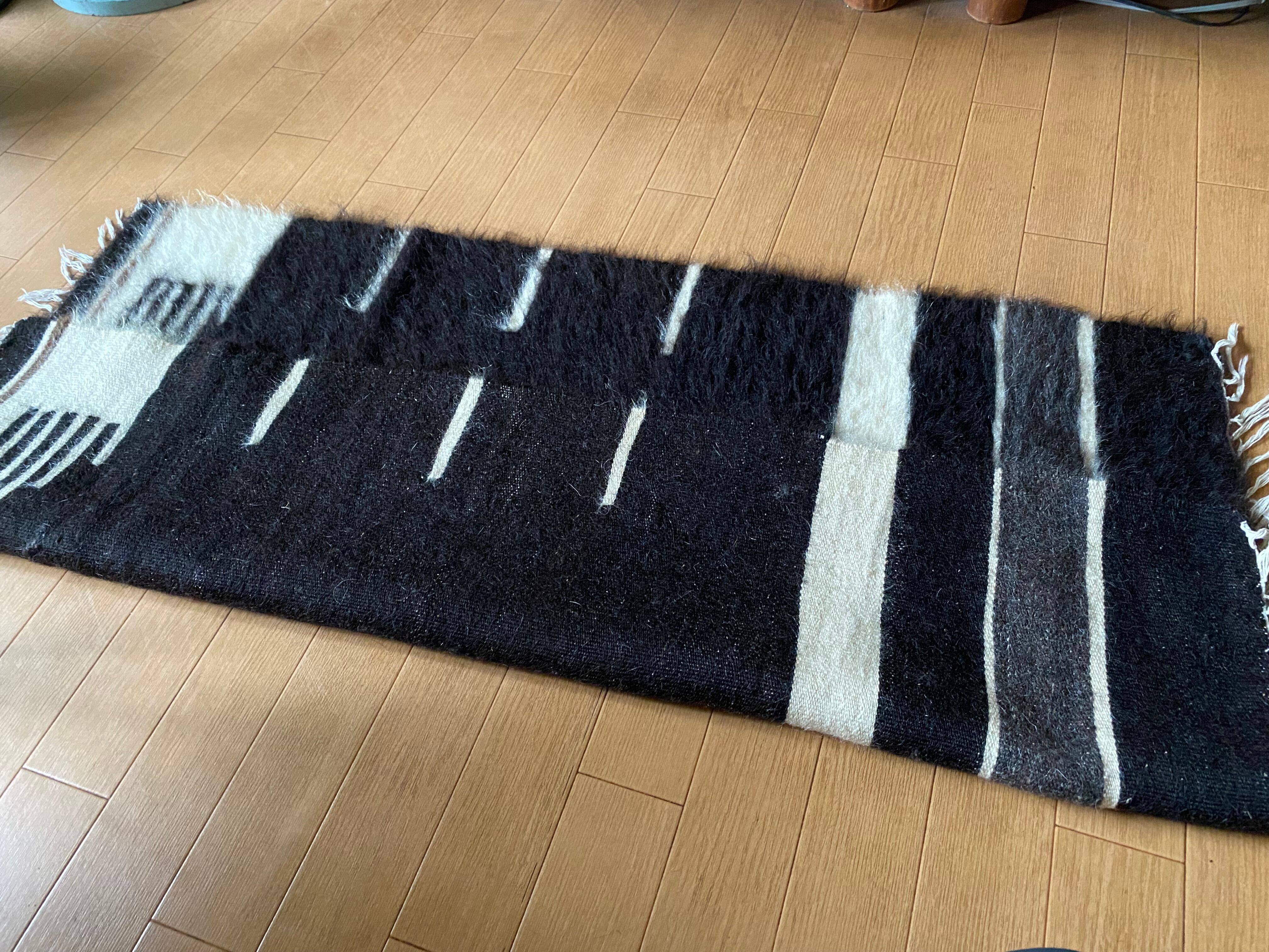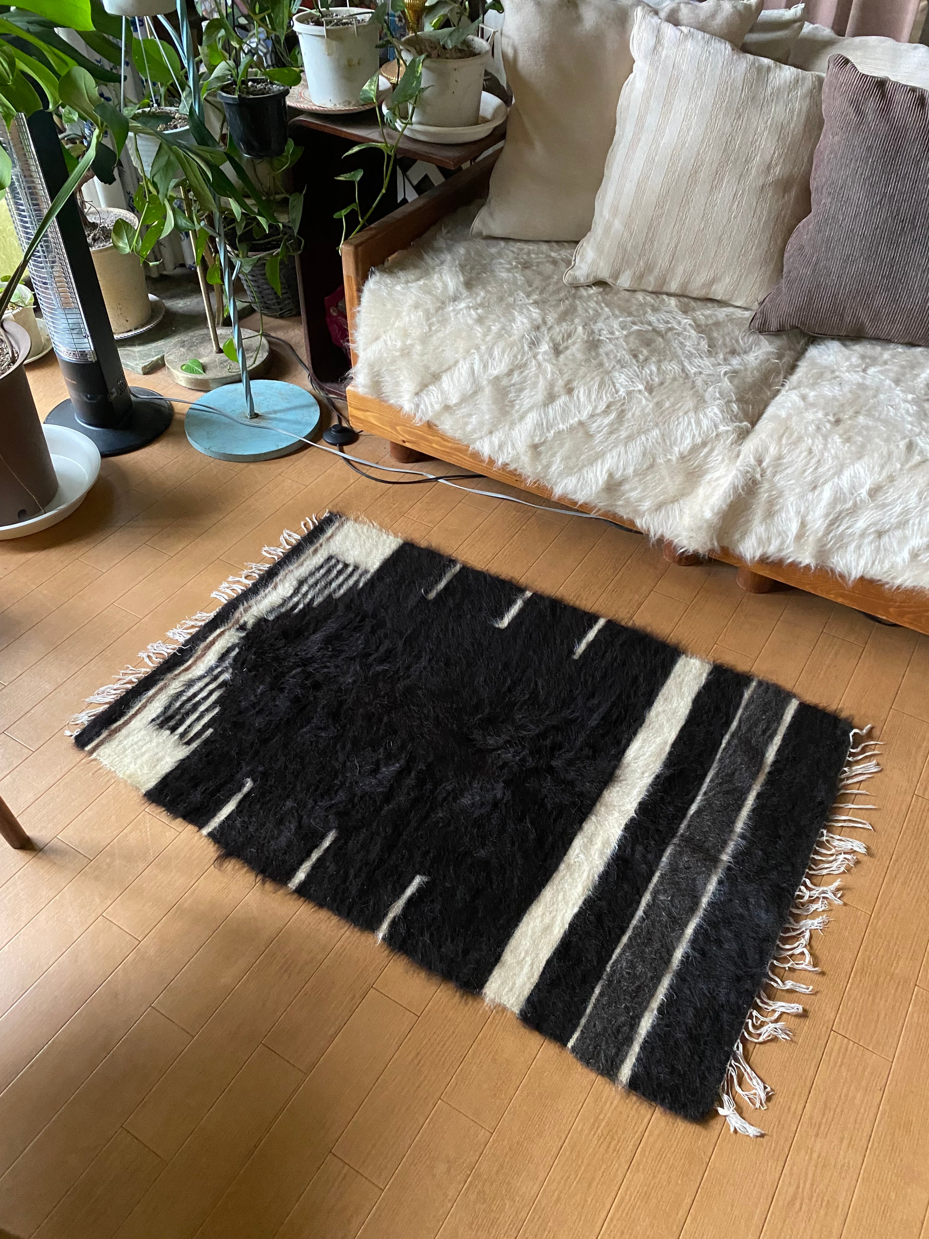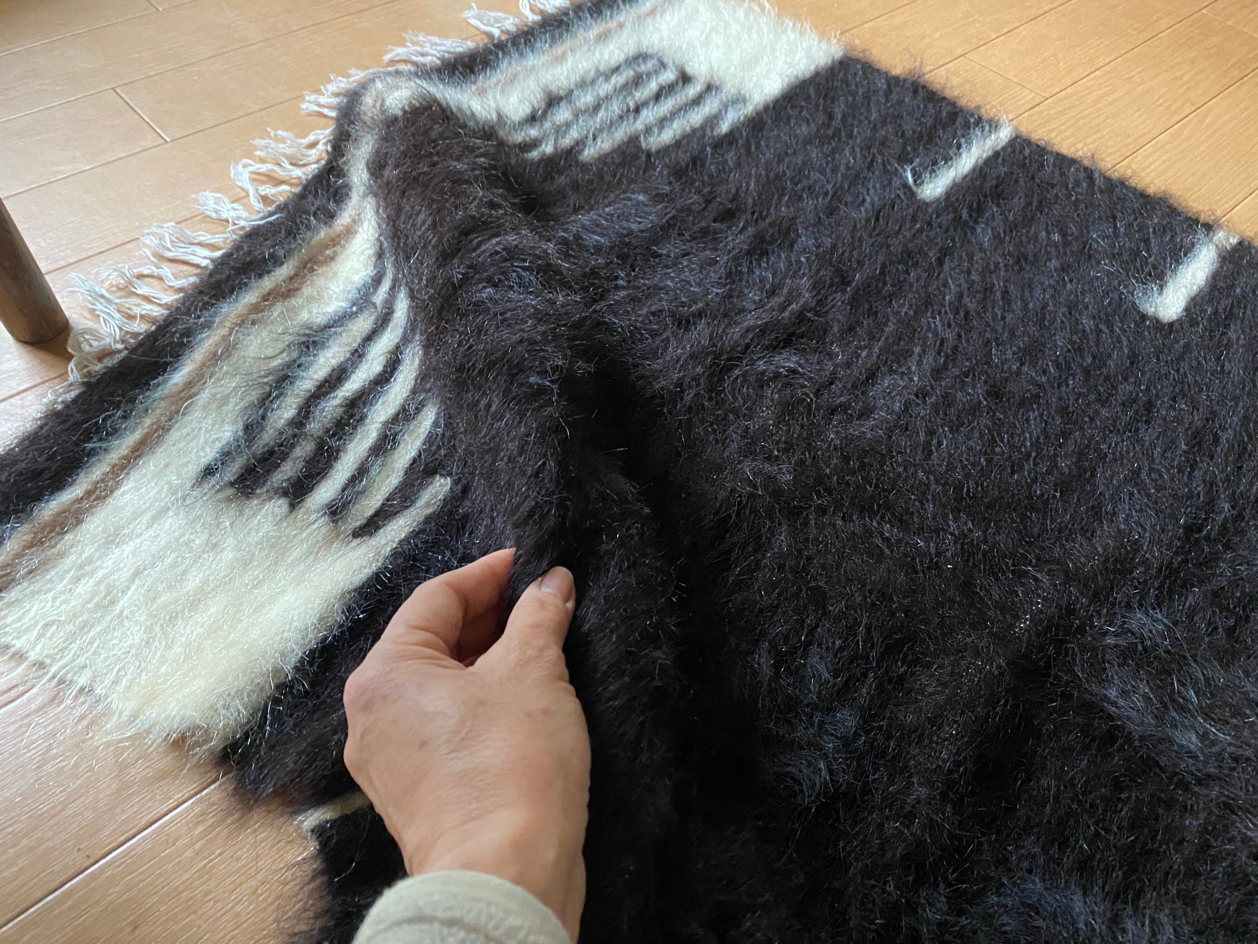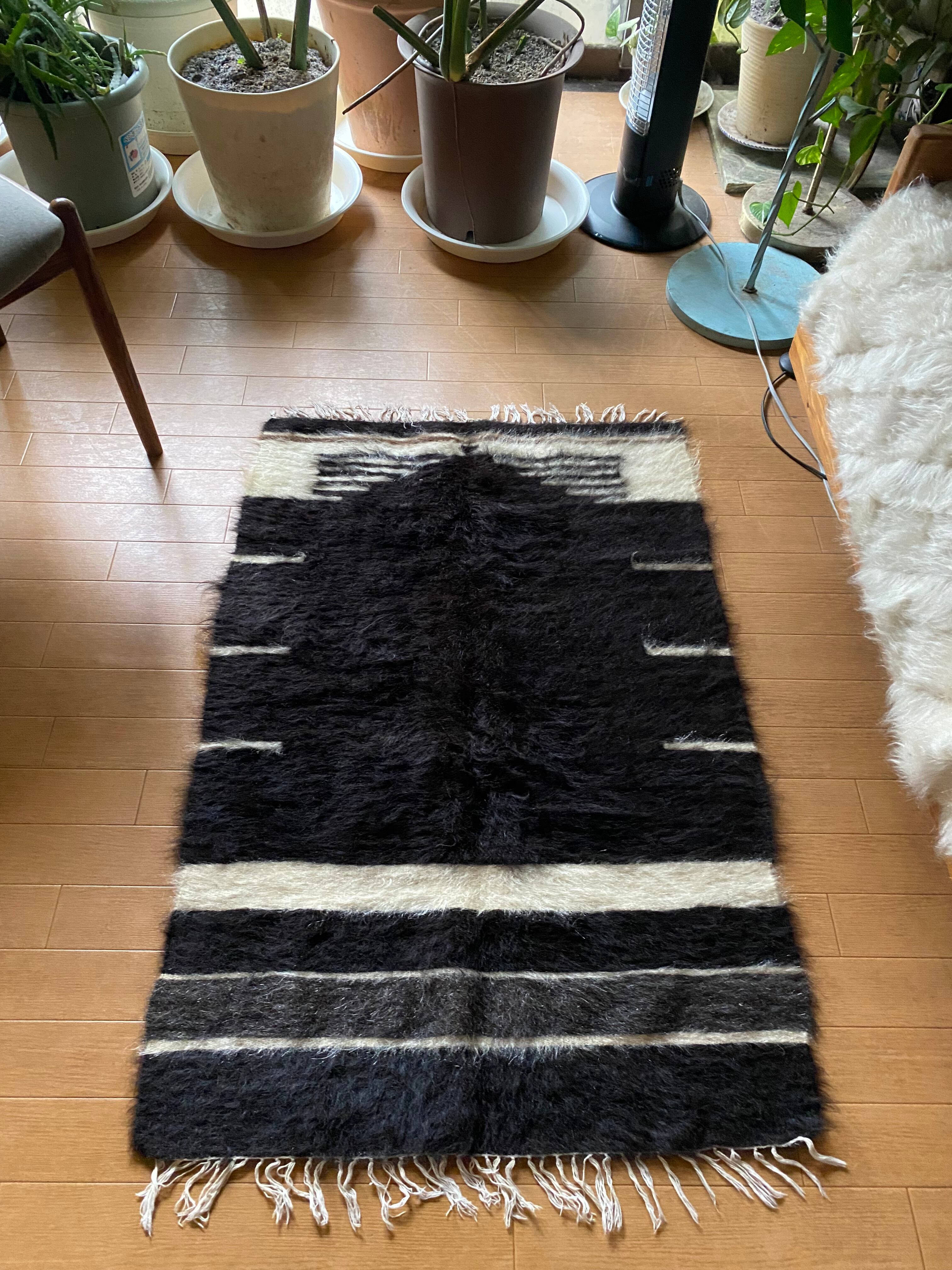 今の新しいものにくらべ、アンティークのバッタ二エと同じくらい密度が濃く、毛の艶がさらに良い山羊の毛で織られています。 未使用ですが、 ご覧いただけますように毛足も長めでつやつやです。30〜40年ほど前に織られていますが、ほぼ未使用のヴィンテージ未使用品になります。