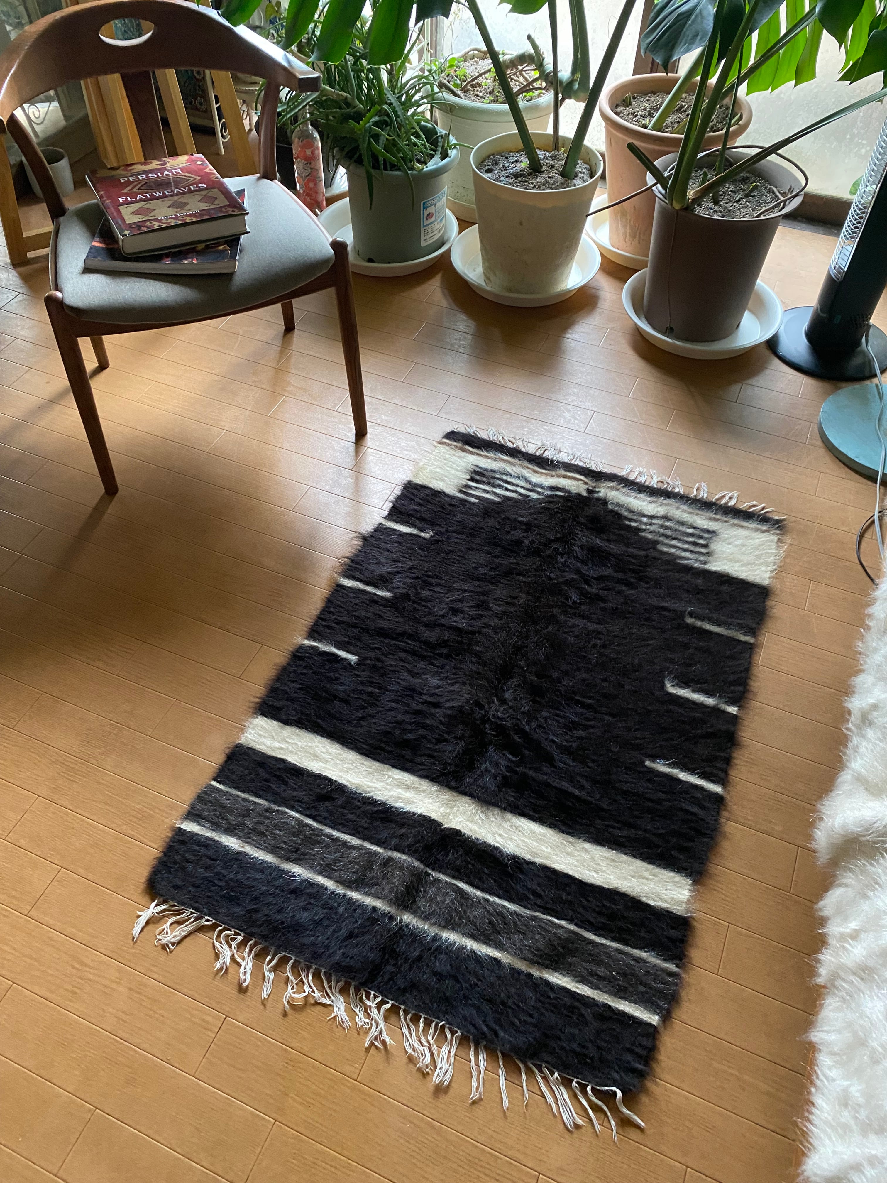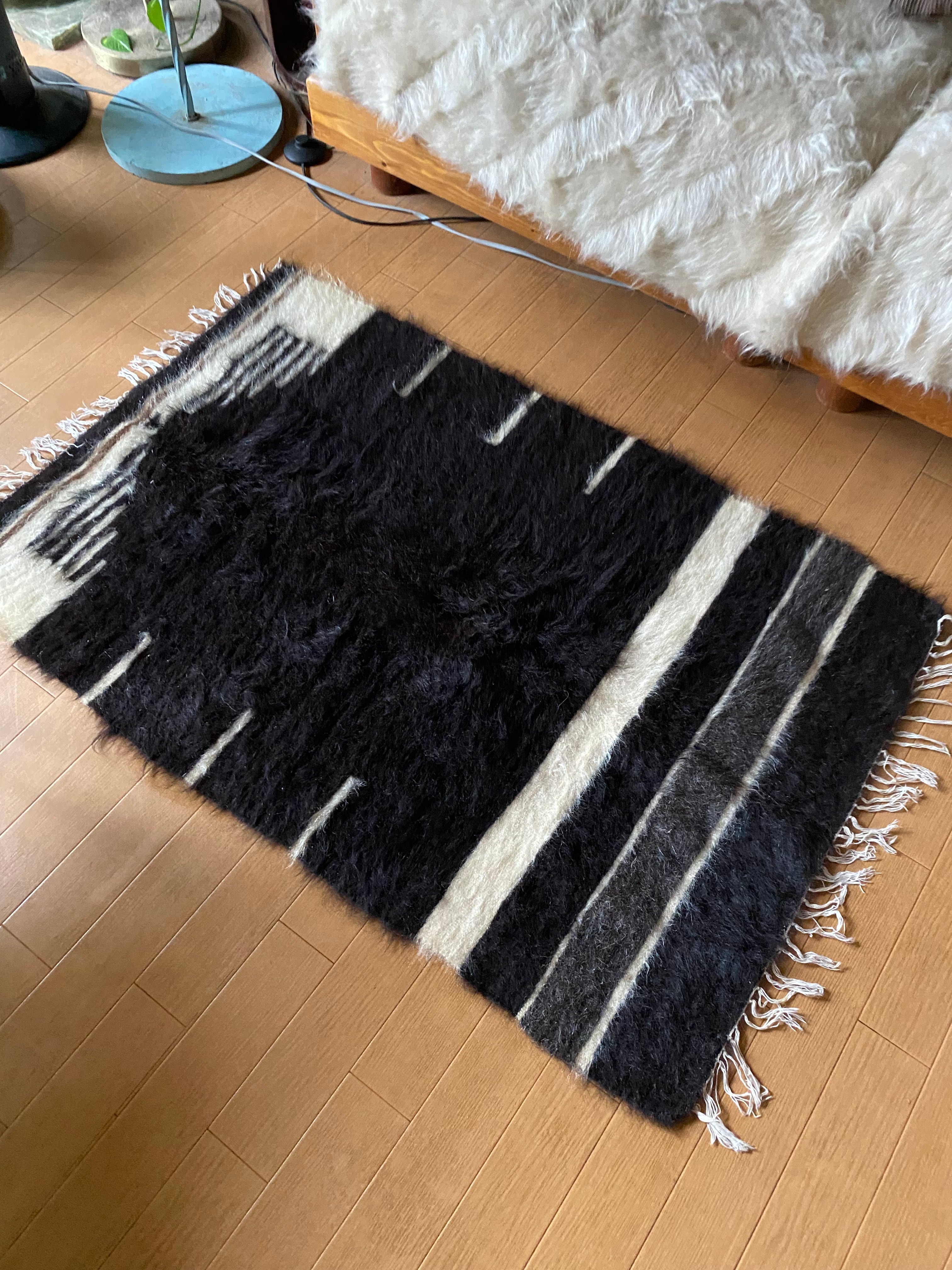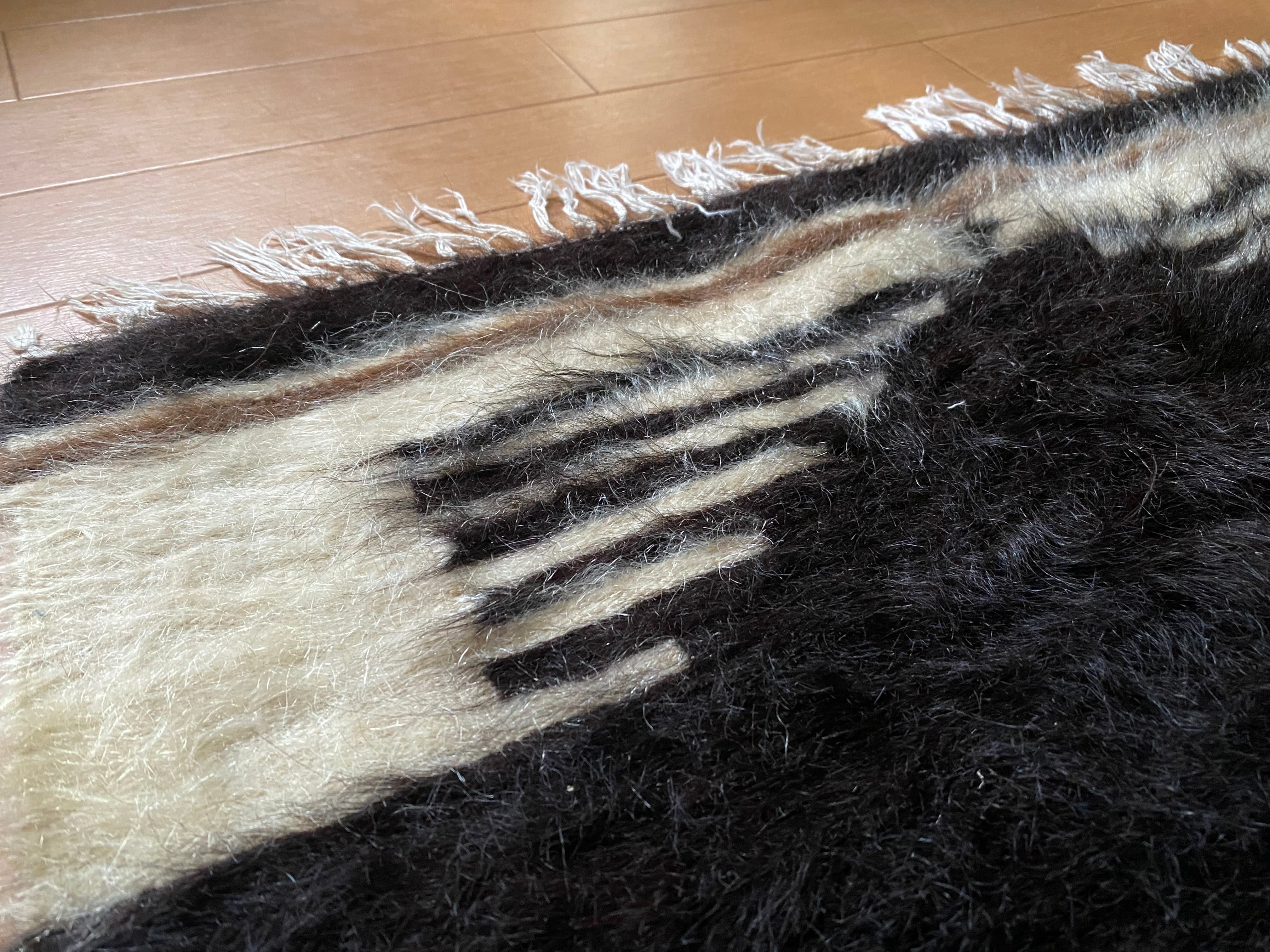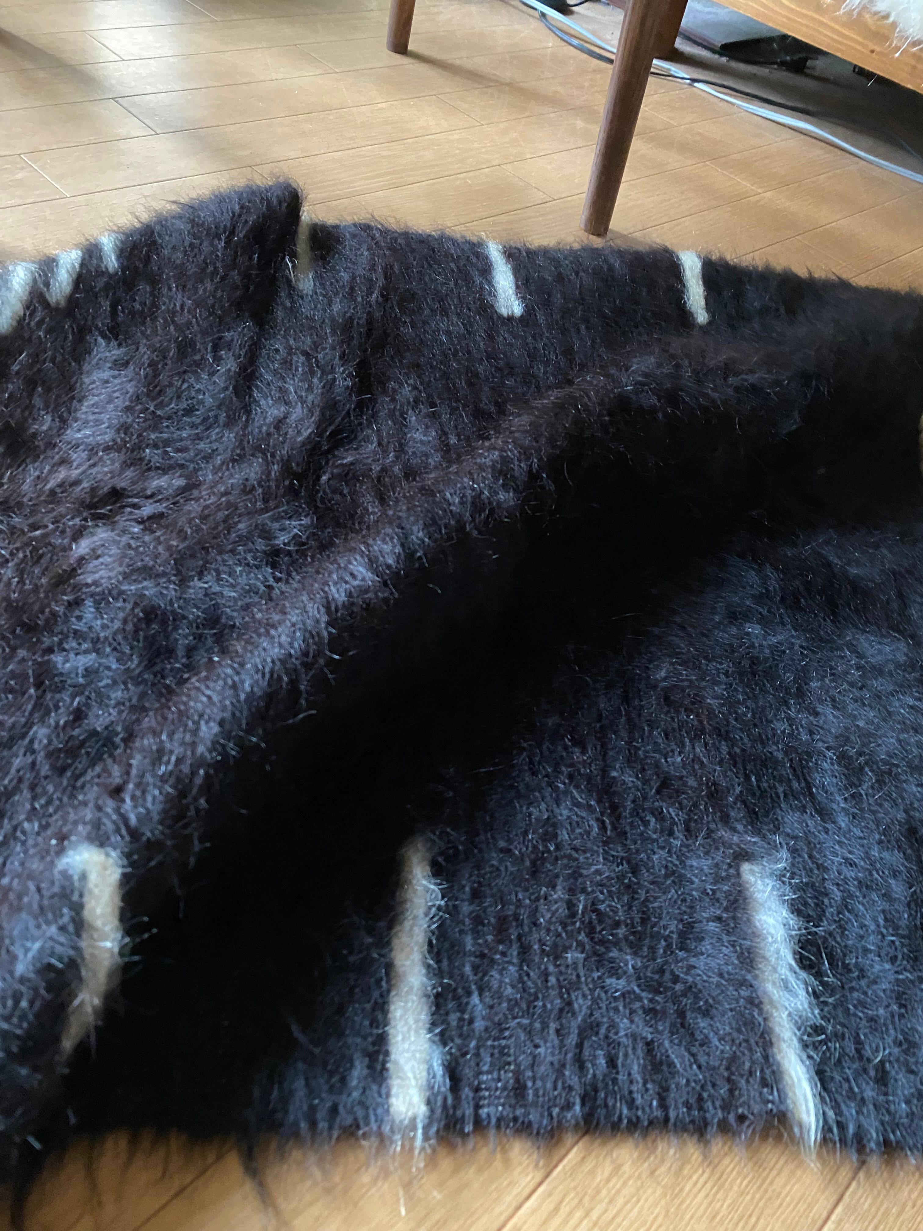 今の新しいものにくらべ、アンティークのバッタ二エと同じくらい密度が濃く、毛の艶がさらに良い山羊の毛で織られています。 未使用ですが、 ご覧いただけますように毛足も長めでつやつやです。30〜40年ほど前に織られていますが、ほぼ未使用のヴィンテージ未使用品になります。