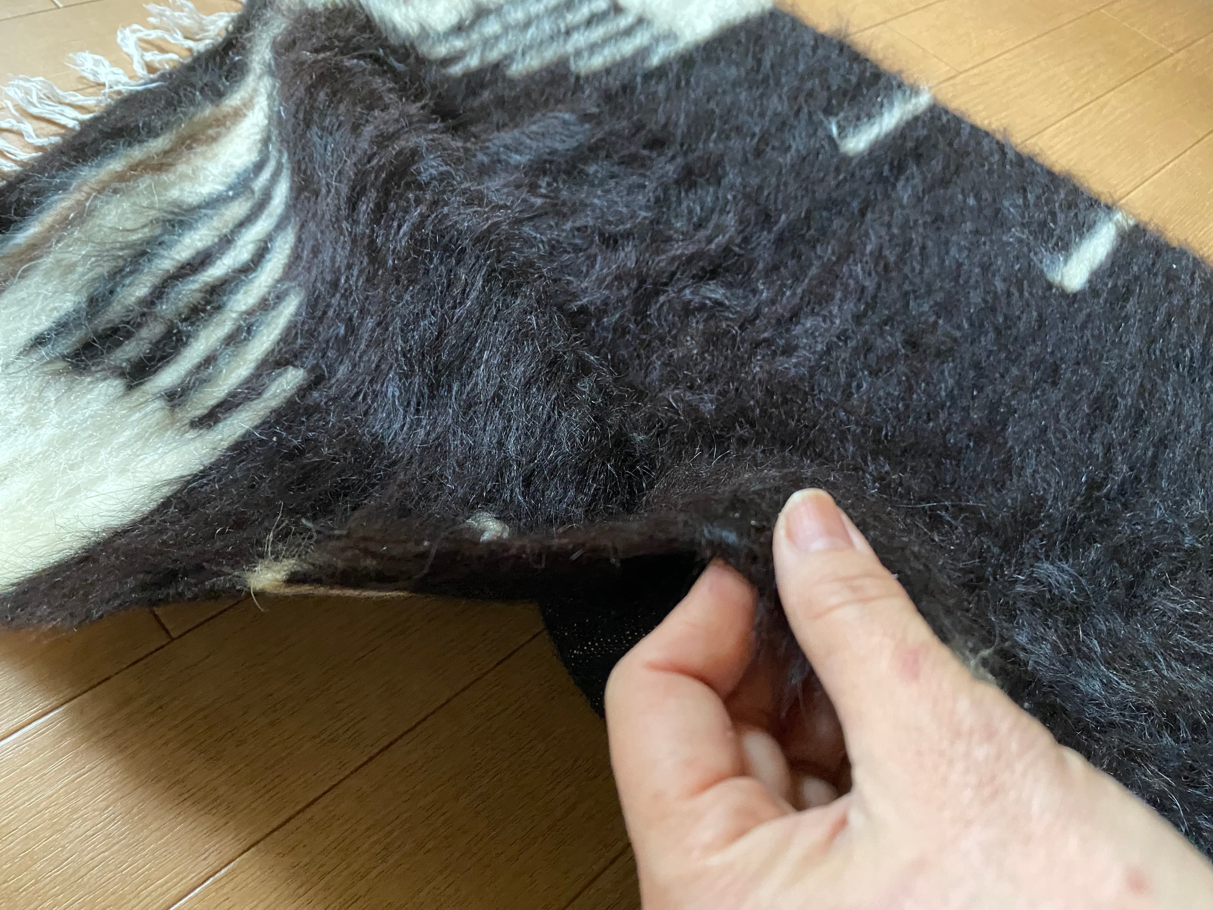 自然の山羊の毛を手で紡いだものが使われていますので、たまーにもみ殻がたまについていたり木の破片みたいなものが稀に織り込まれていることがありますので、ご了承ください。 できるだけ検品して取り除いていますが取り切れないこともありますのでご了承ください。