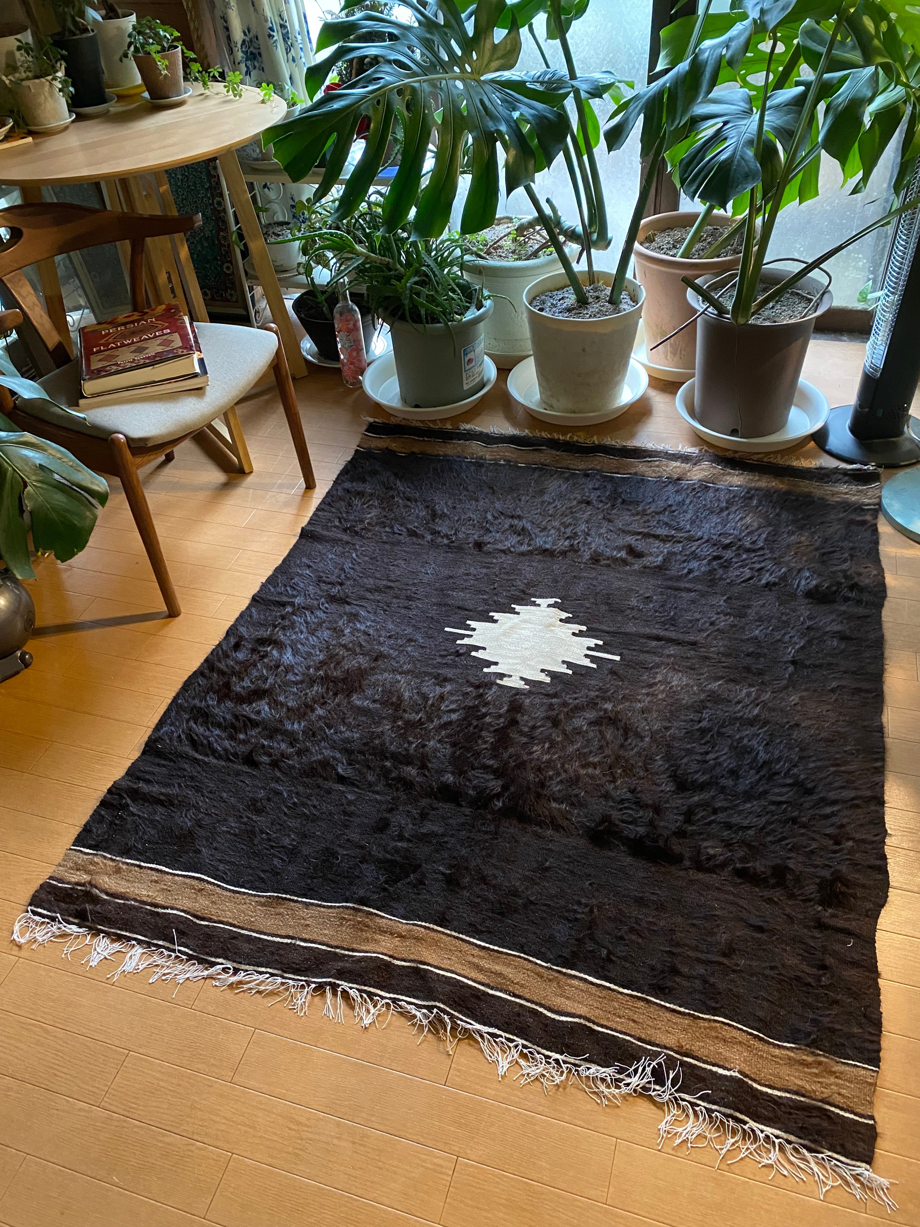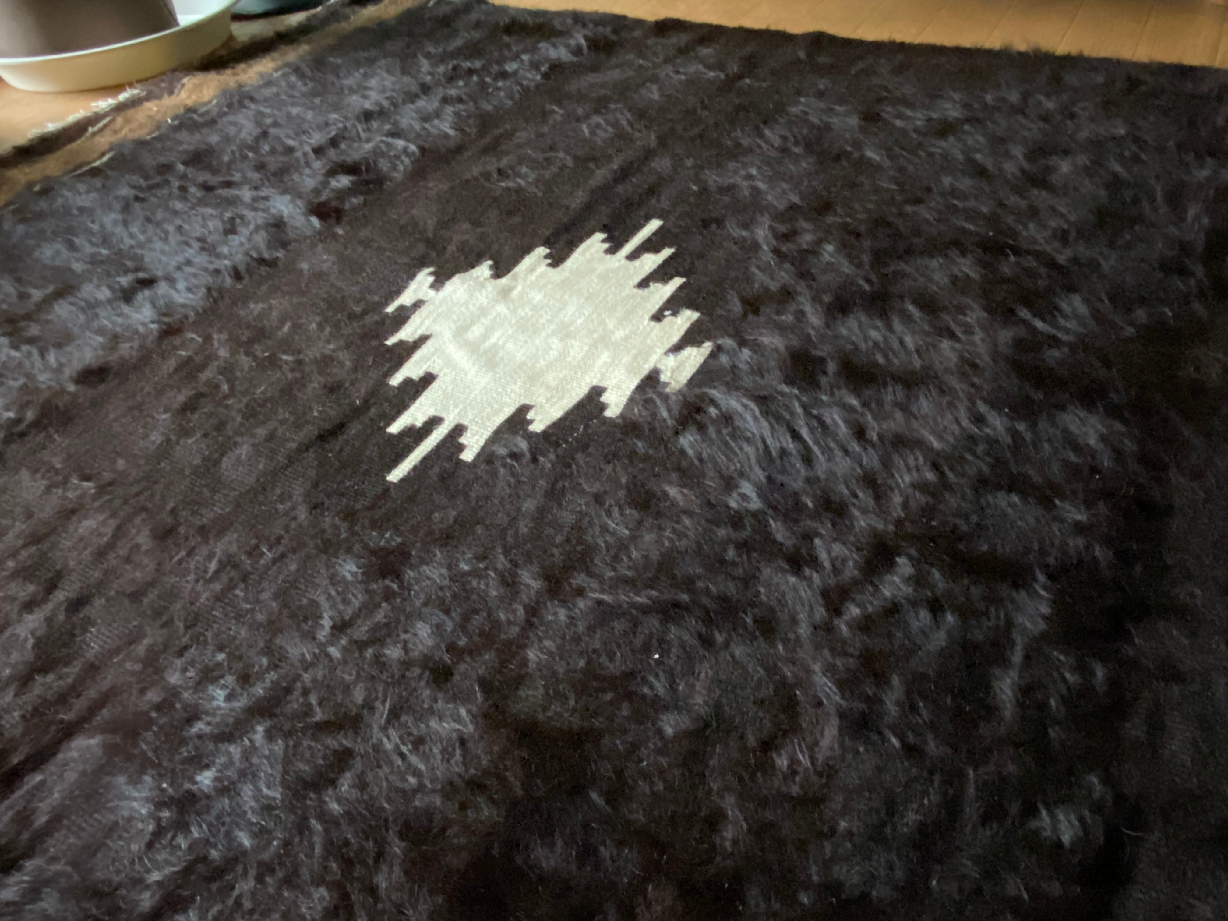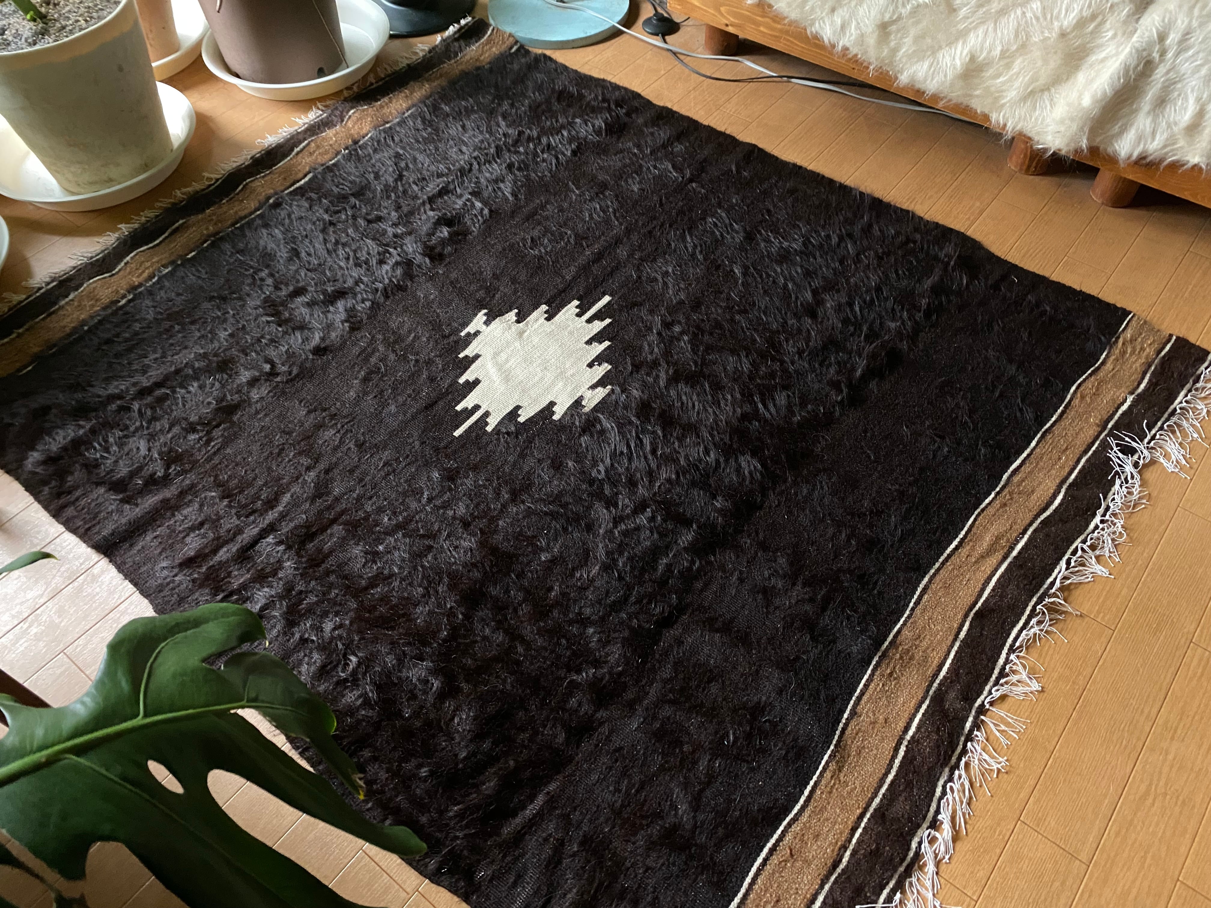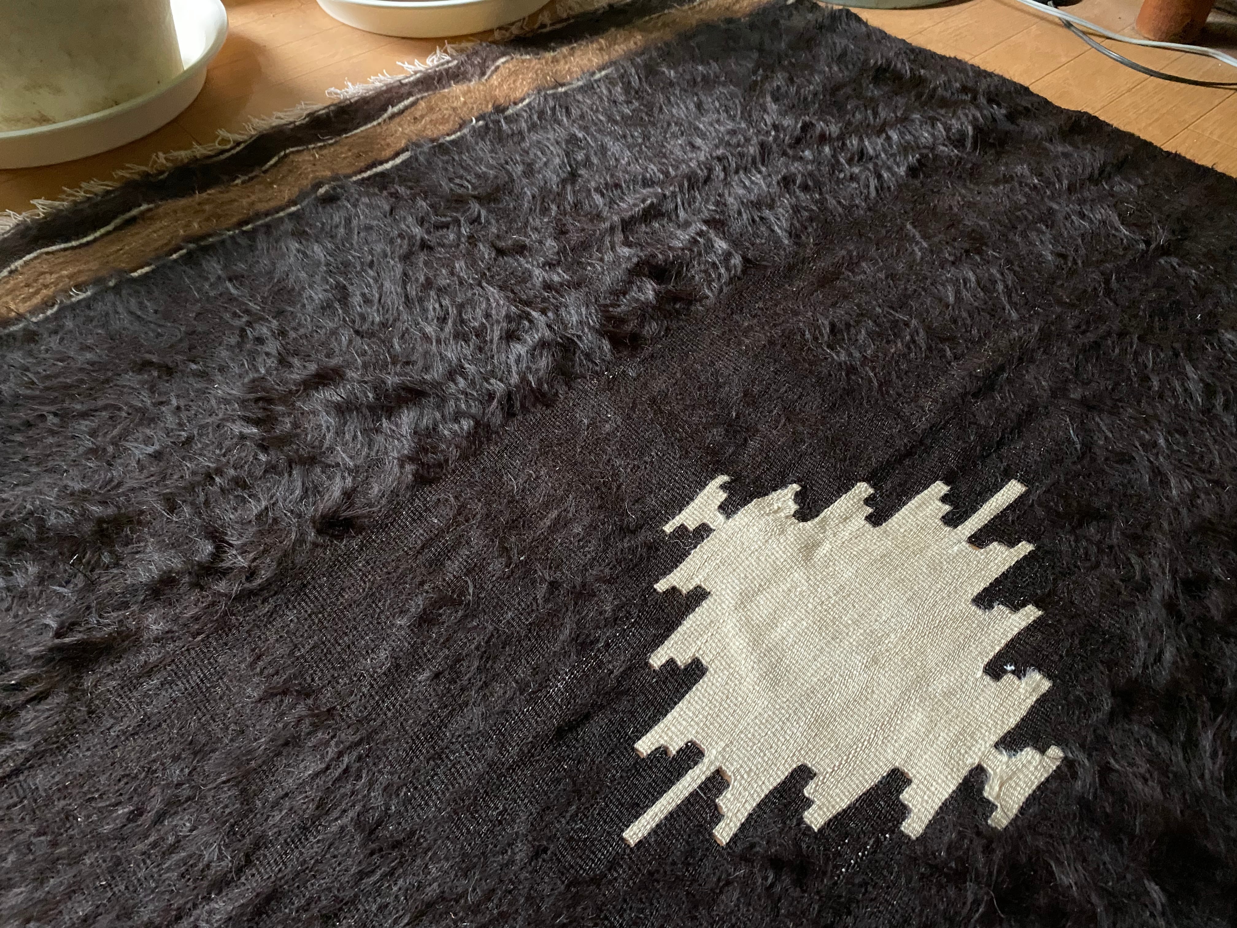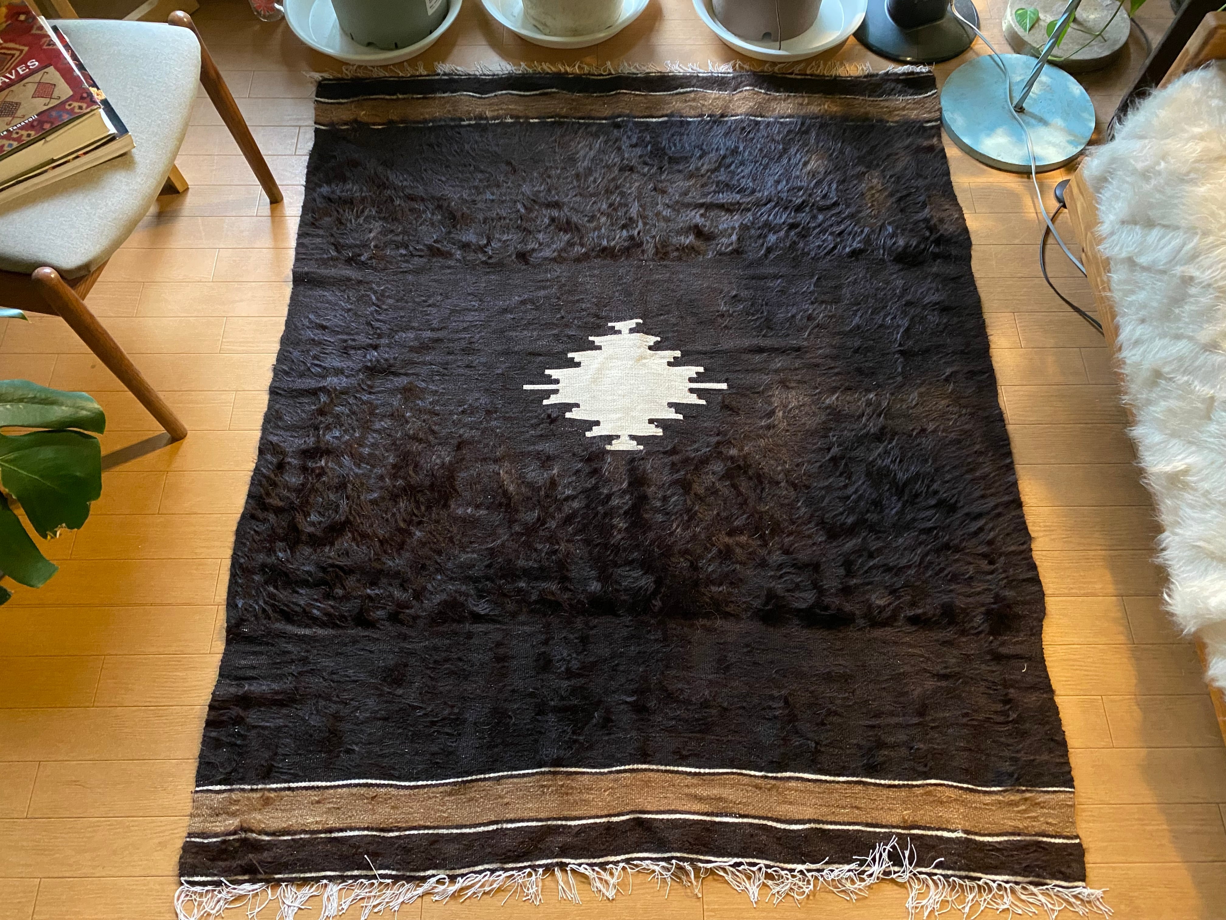 また、毛をけば立てて幾何学模様が入っておりますが、ウールではこのような毛羽立ちの模様はできないそうです。山羊ならではの模様をお楽しみください。 裏面でお使いいただければ、普通のキリムとして も使えます。