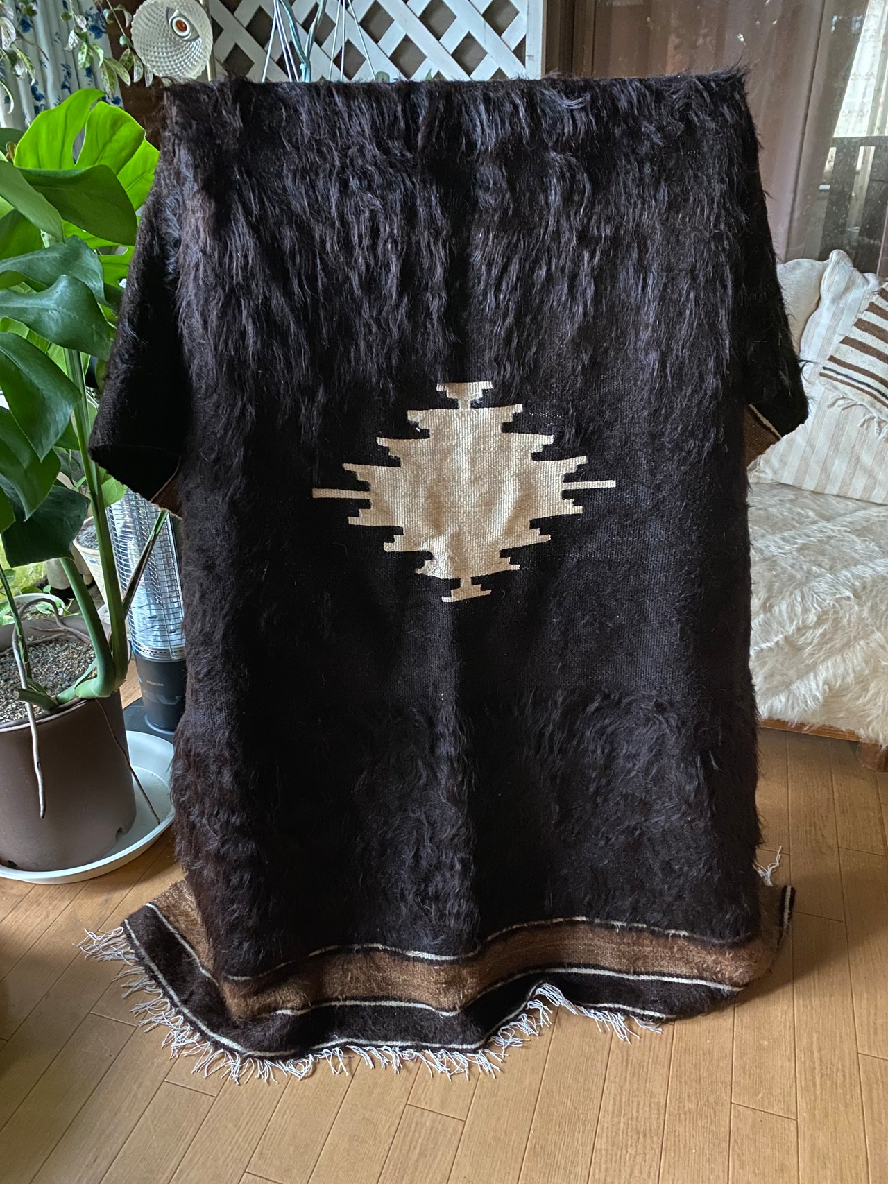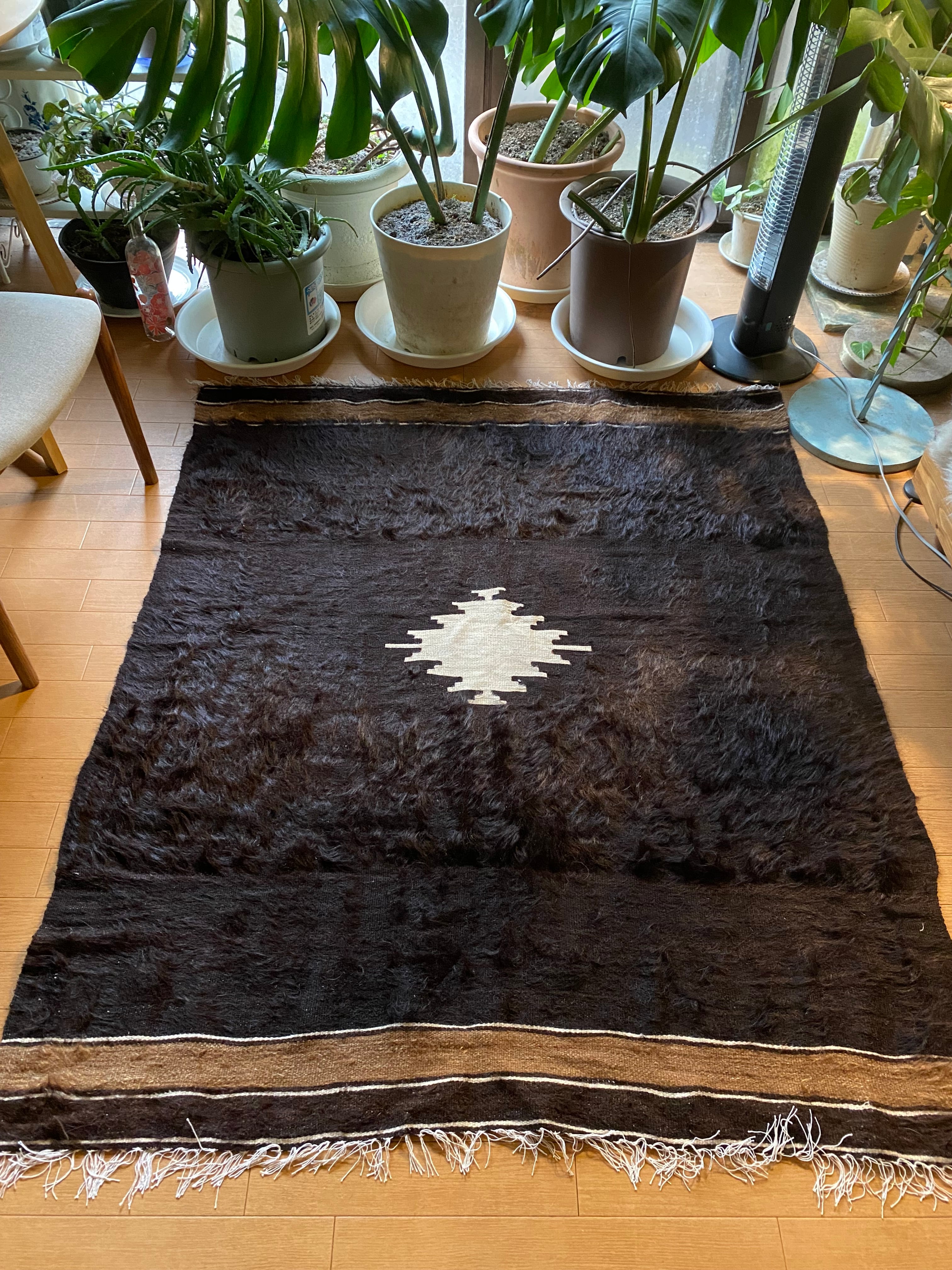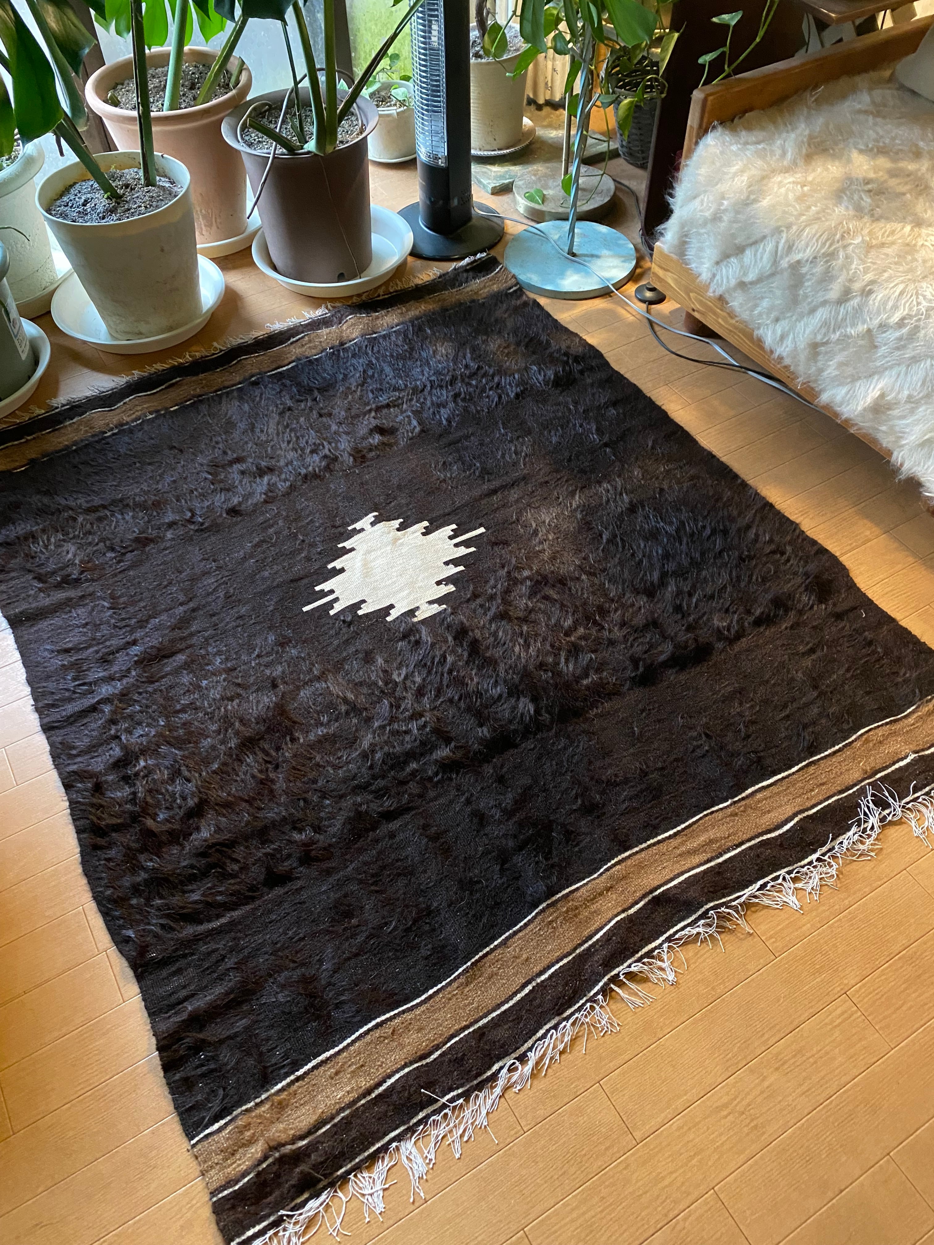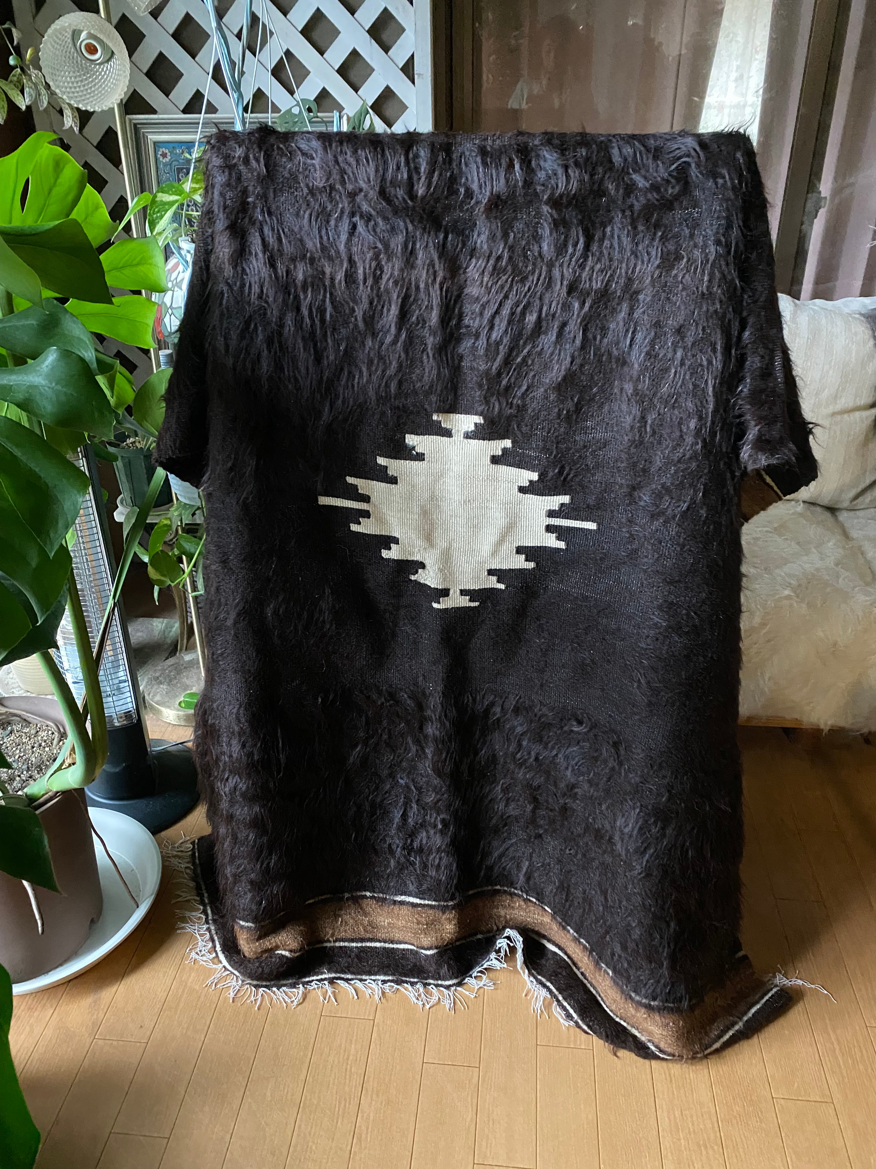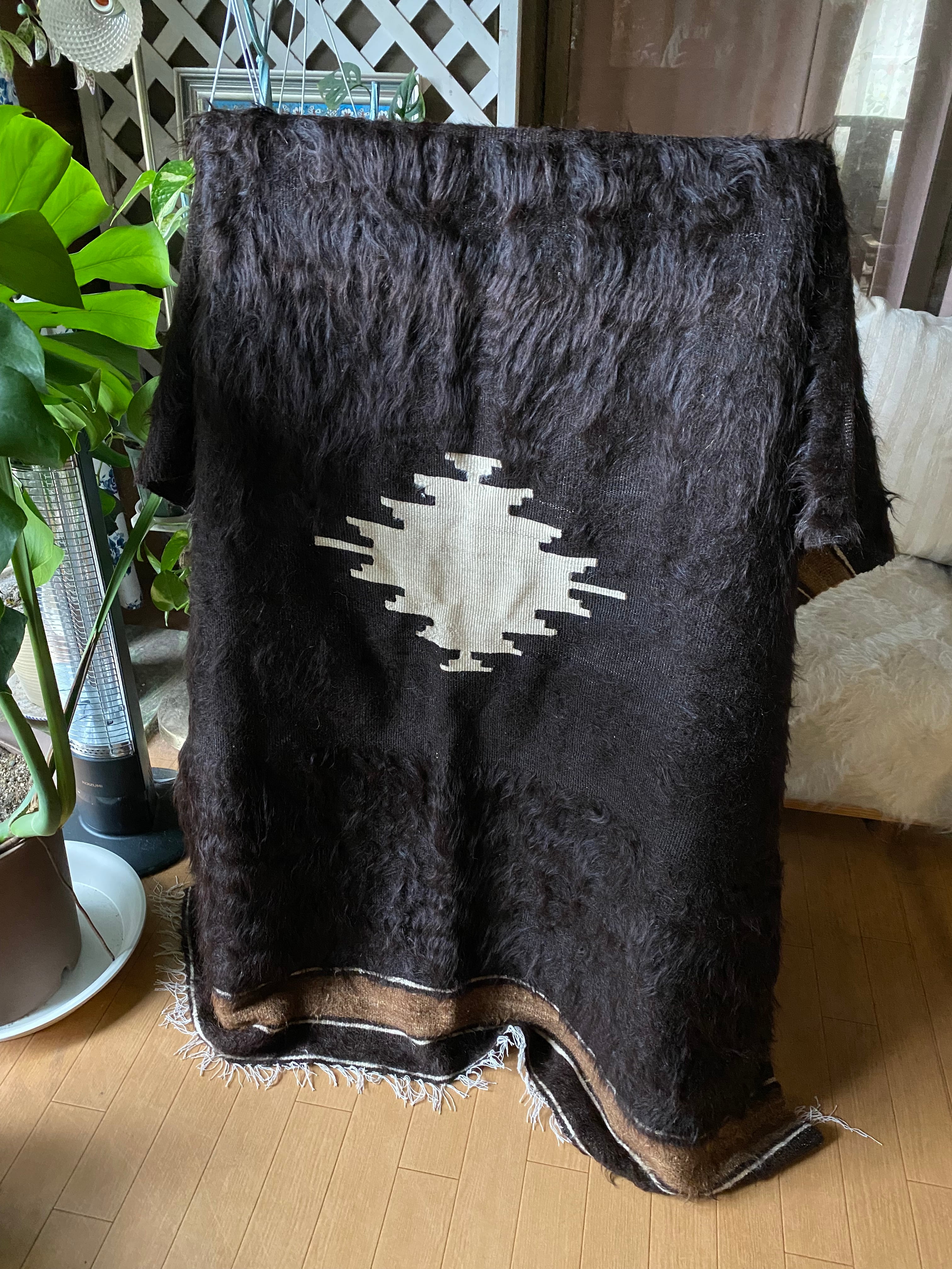 また、毛をけば立てて幾何学模様が入っておりますが、ウールではこのような毛羽立ちの模様はできないそうです。山羊ならではの模様をお楽しみください。 裏面でお使いいただければ、普通のキリムとして も使えます。
