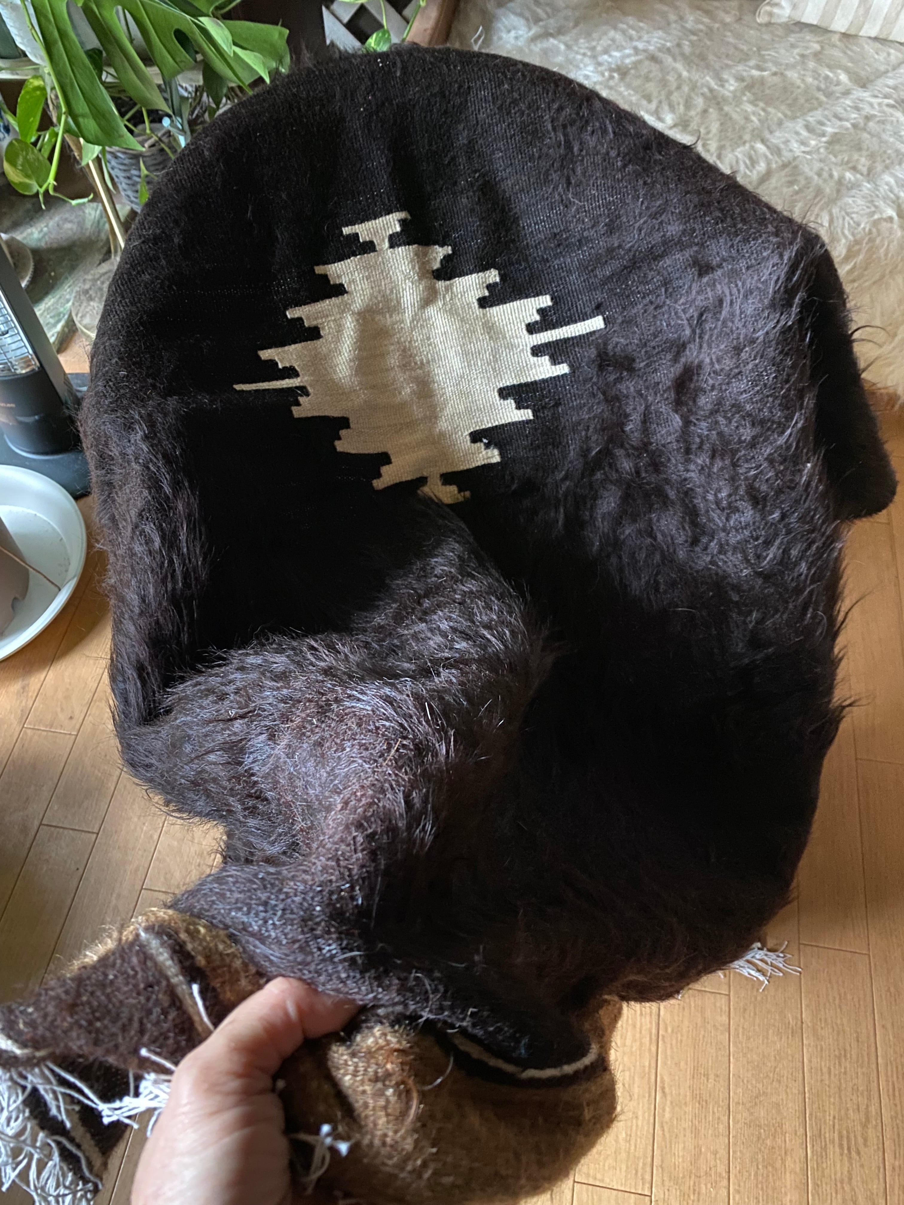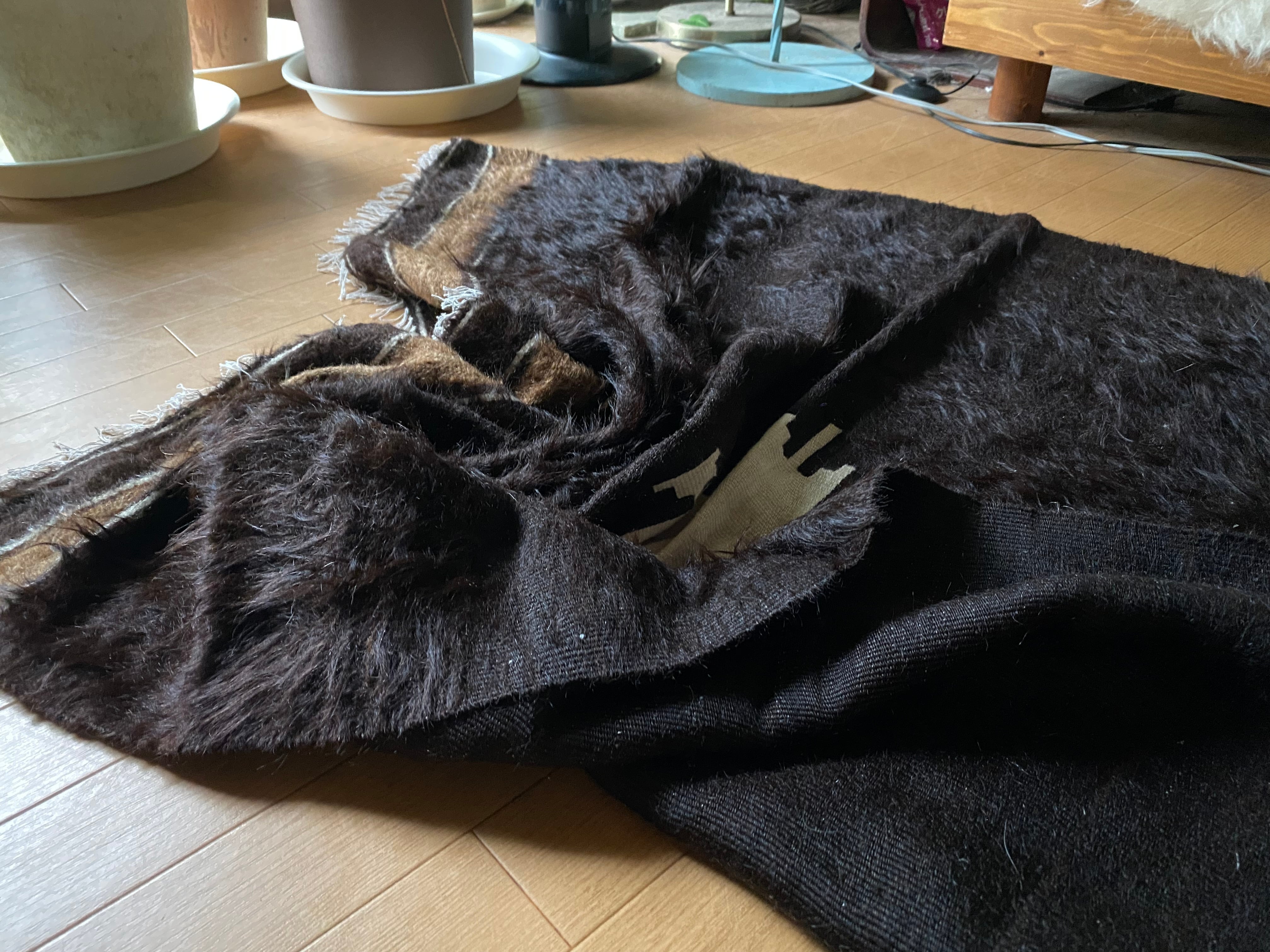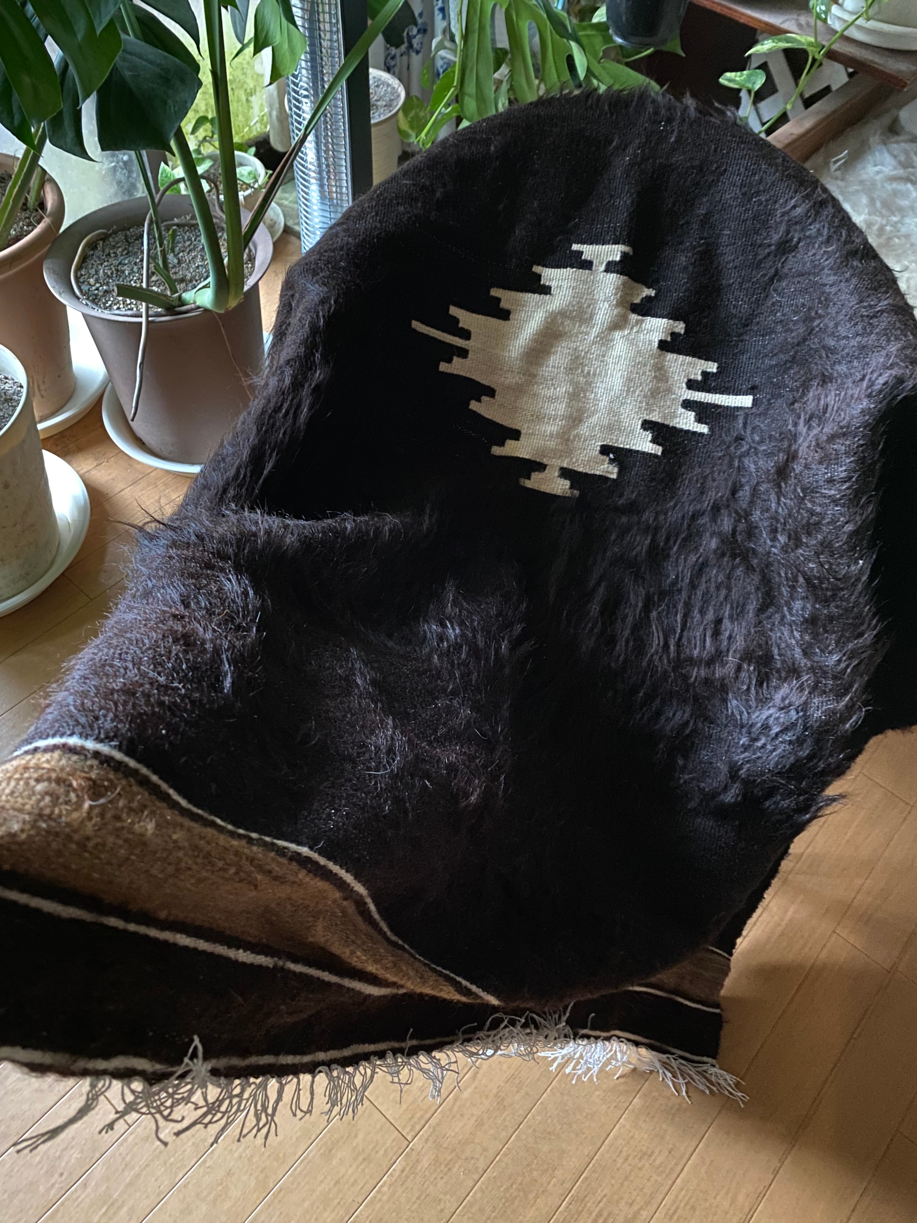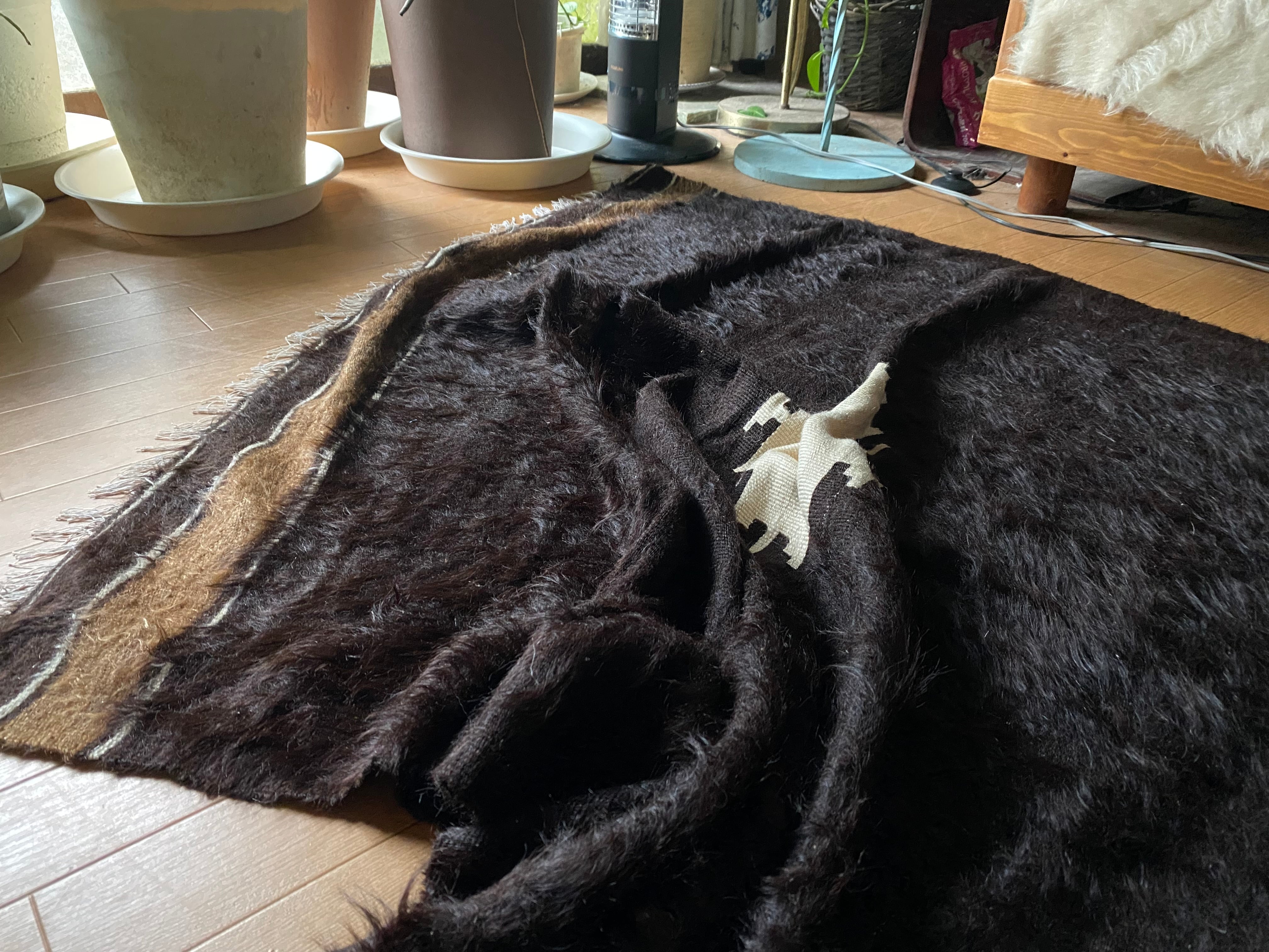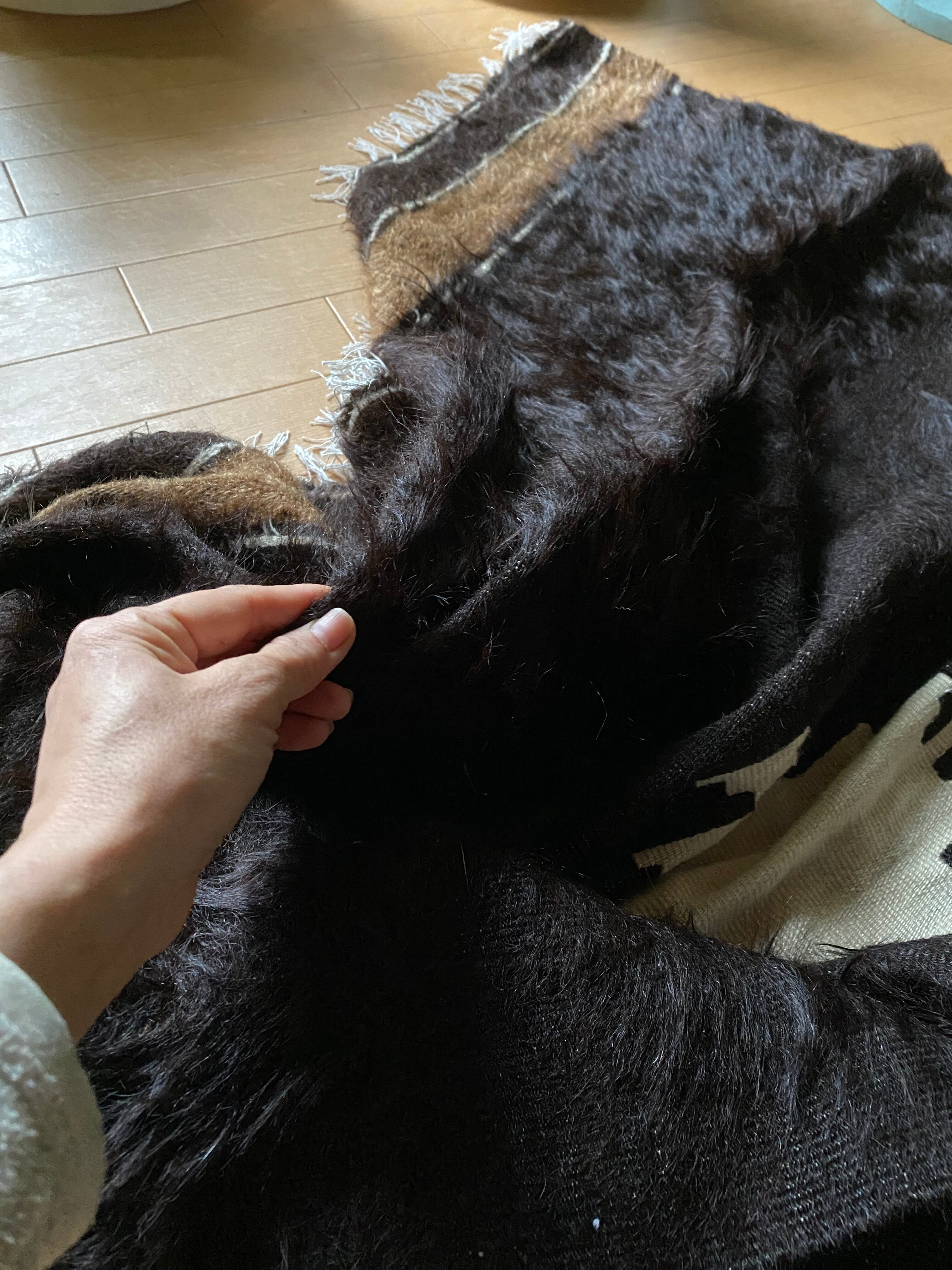 自然の山羊の毛を手で紡いだものが使われていますので、たまーにもみ殻がたまについていたり木の破片みたいなものが稀に織り込まれていることがありますので、ご了承ください。 できるだけ検品して取り除いていますが取り切れないこともありますのでご了承ください。