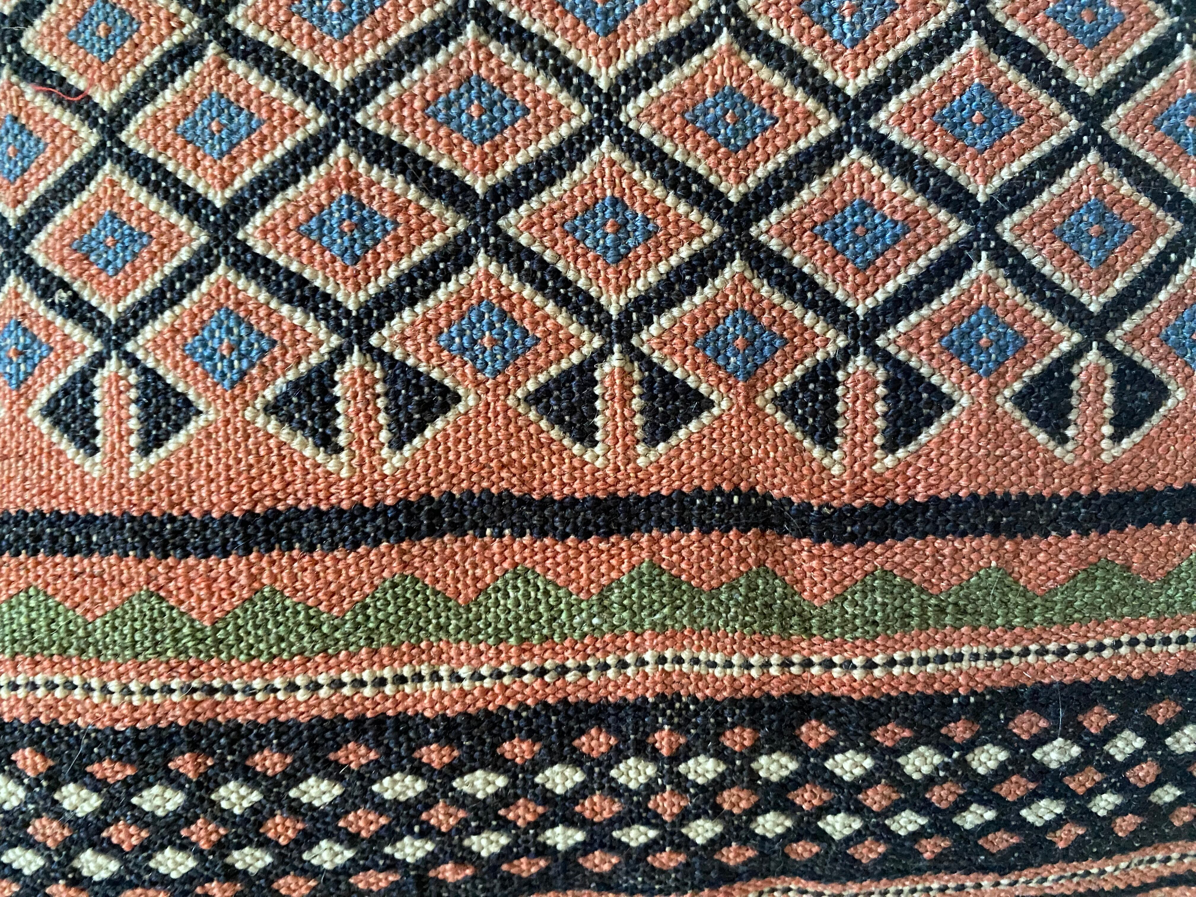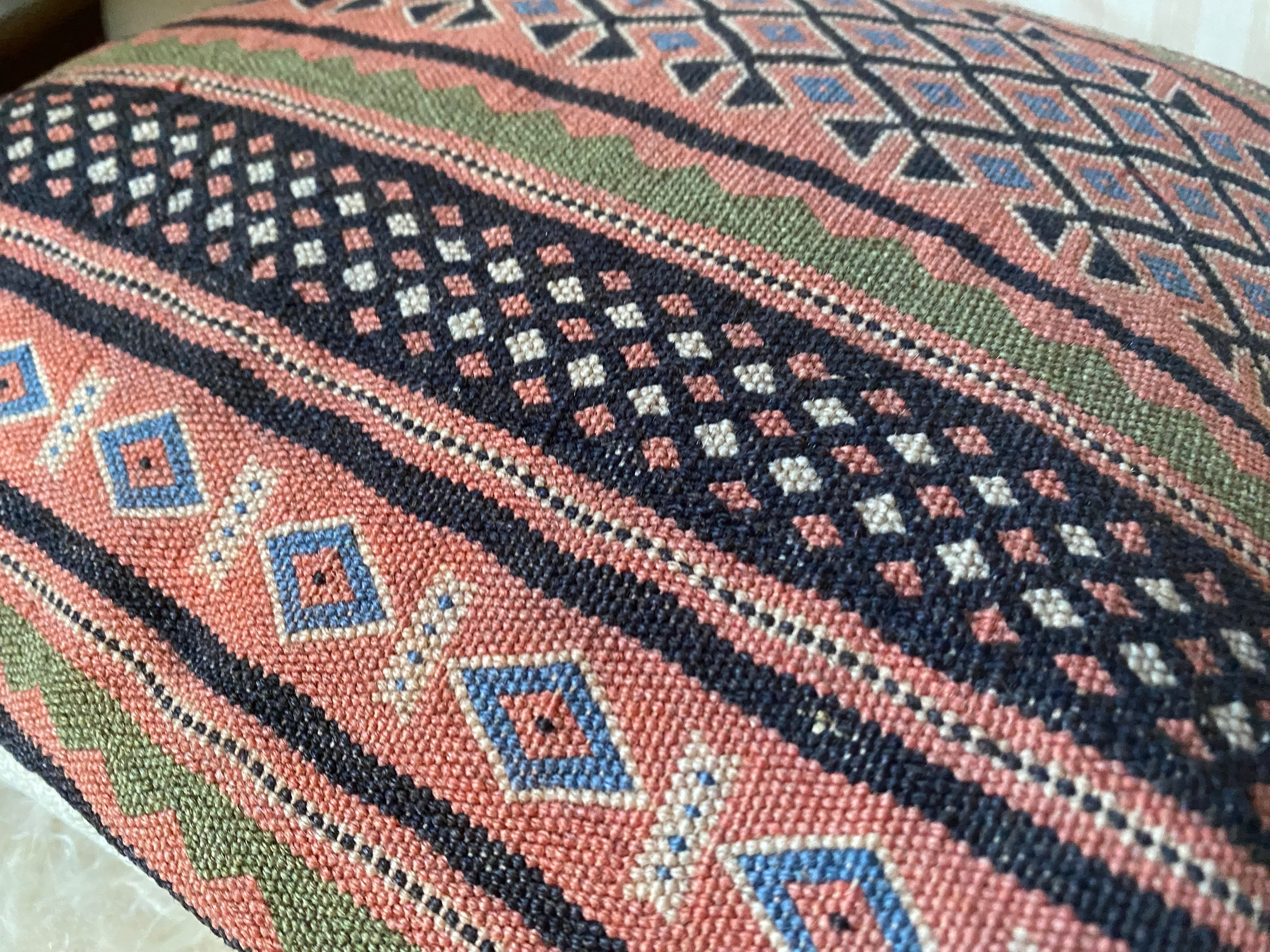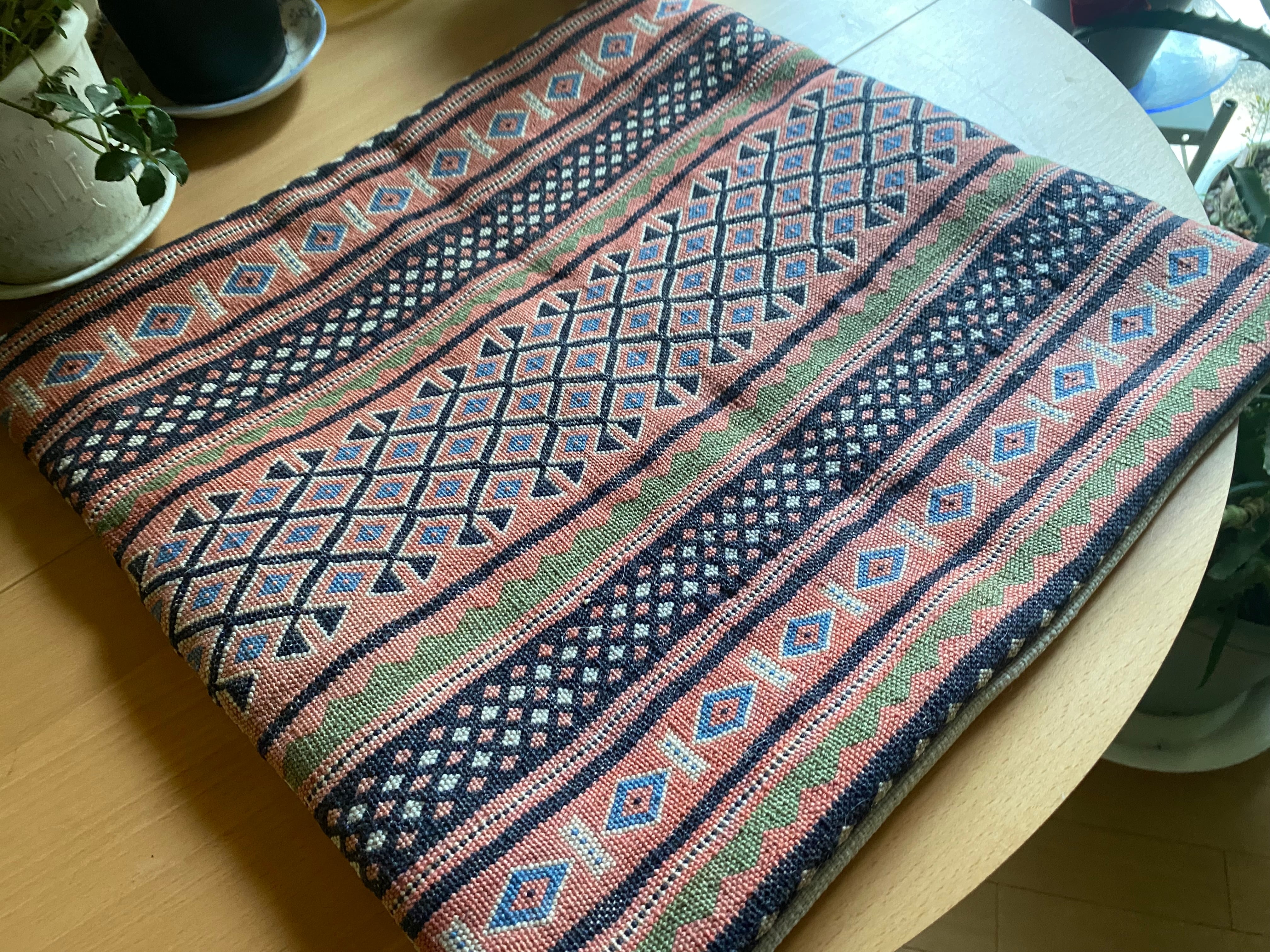 こちらはイランのラフラのスマック織のキリムを使ったクッションカバーです。ラフラは大変細かい織の貴重なスマック織でなんと1ノット7目ほどある素晴らしいキリムになります。