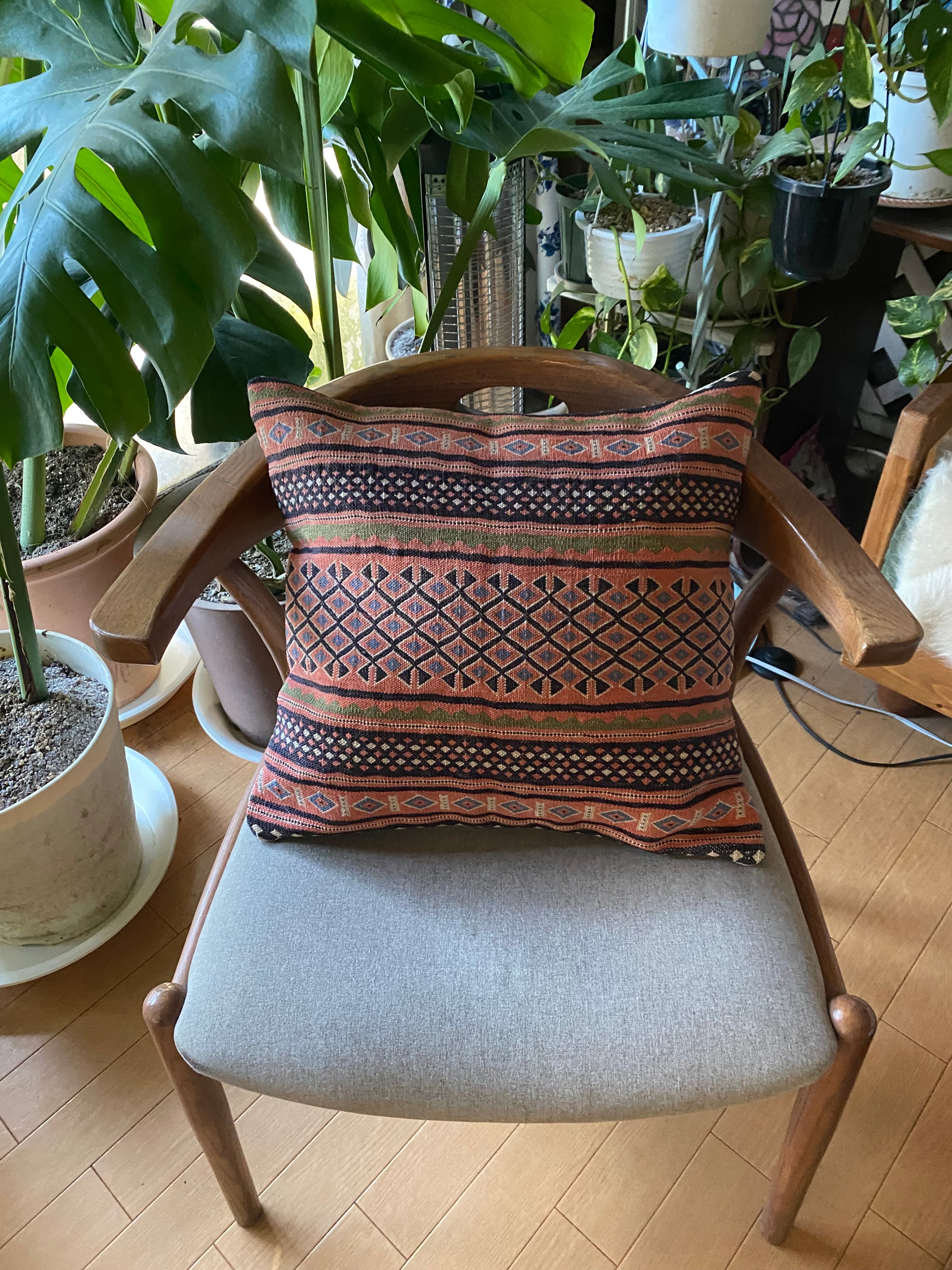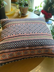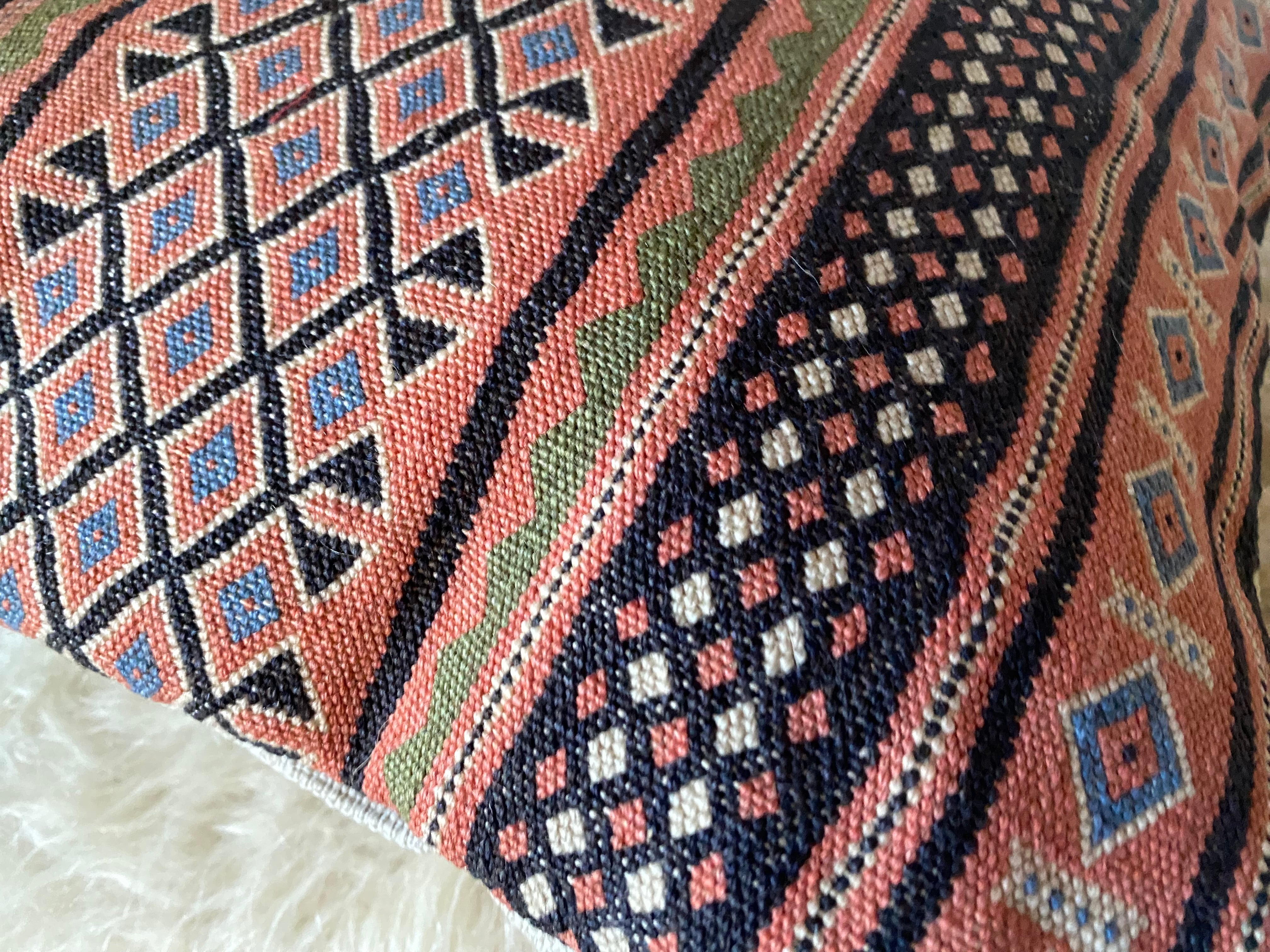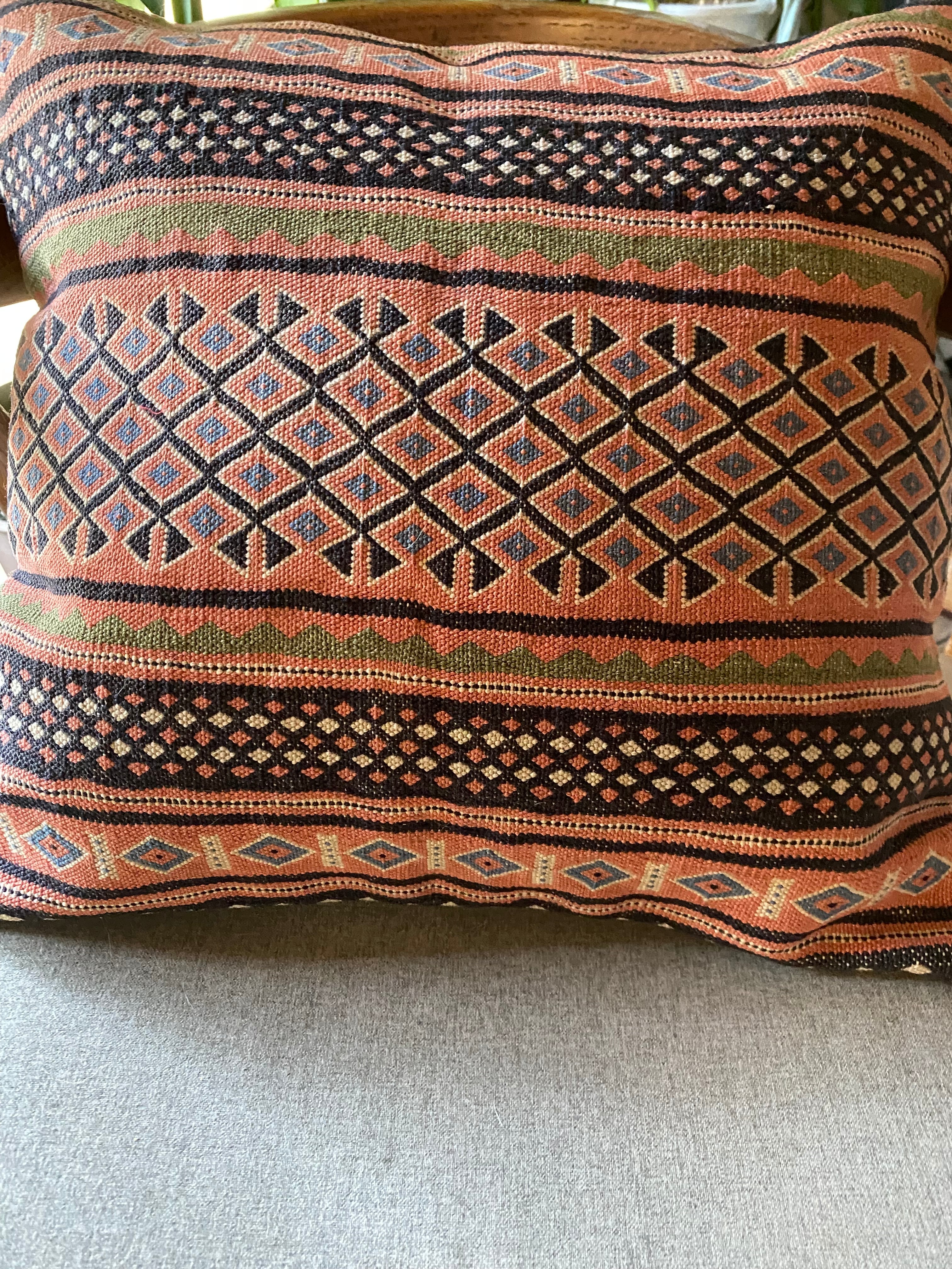 こちらはイランのラフラのスマック織のキリムを使ったクッションカバーです。ラフラは大変細かい織の貴重なスマック織でなんと1ノット7目ほどある素晴らしいキリムになります。