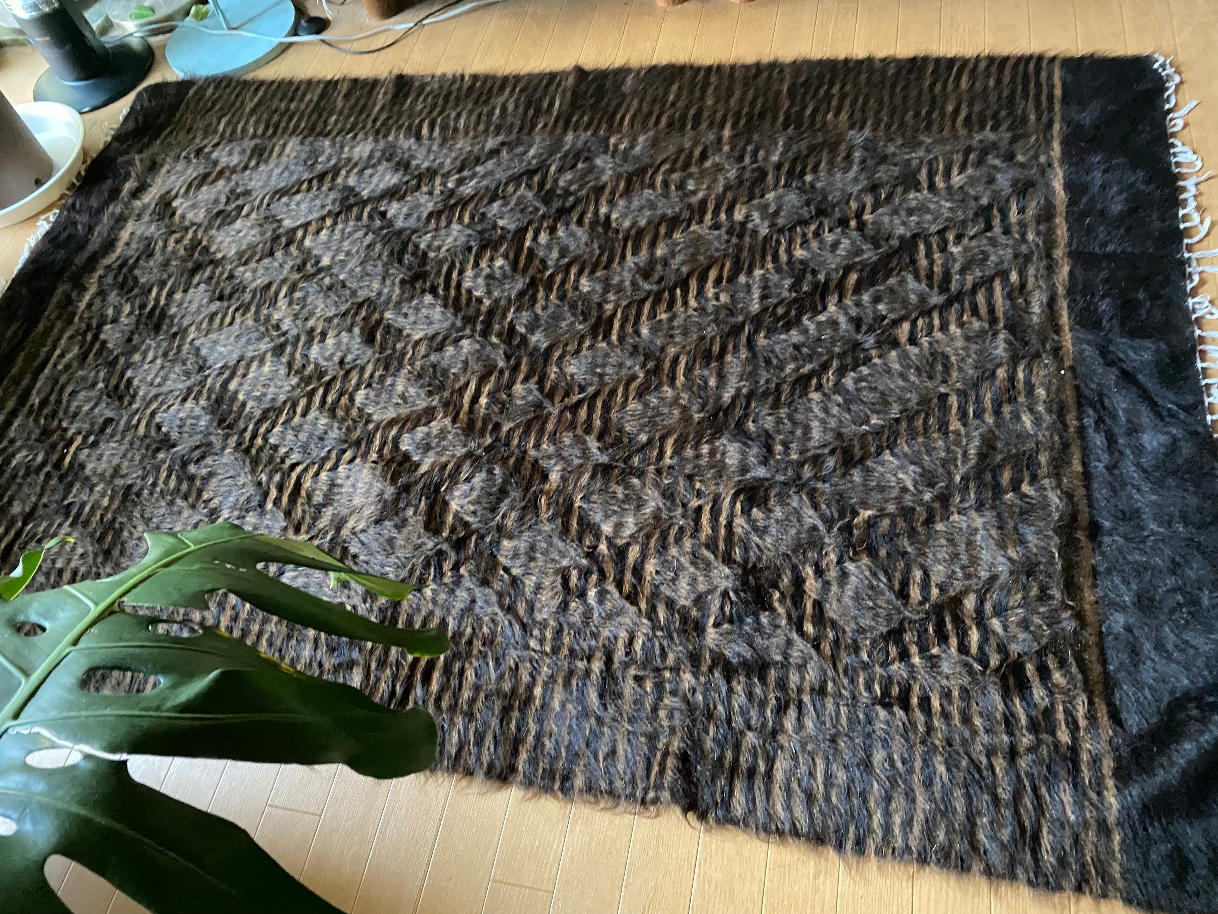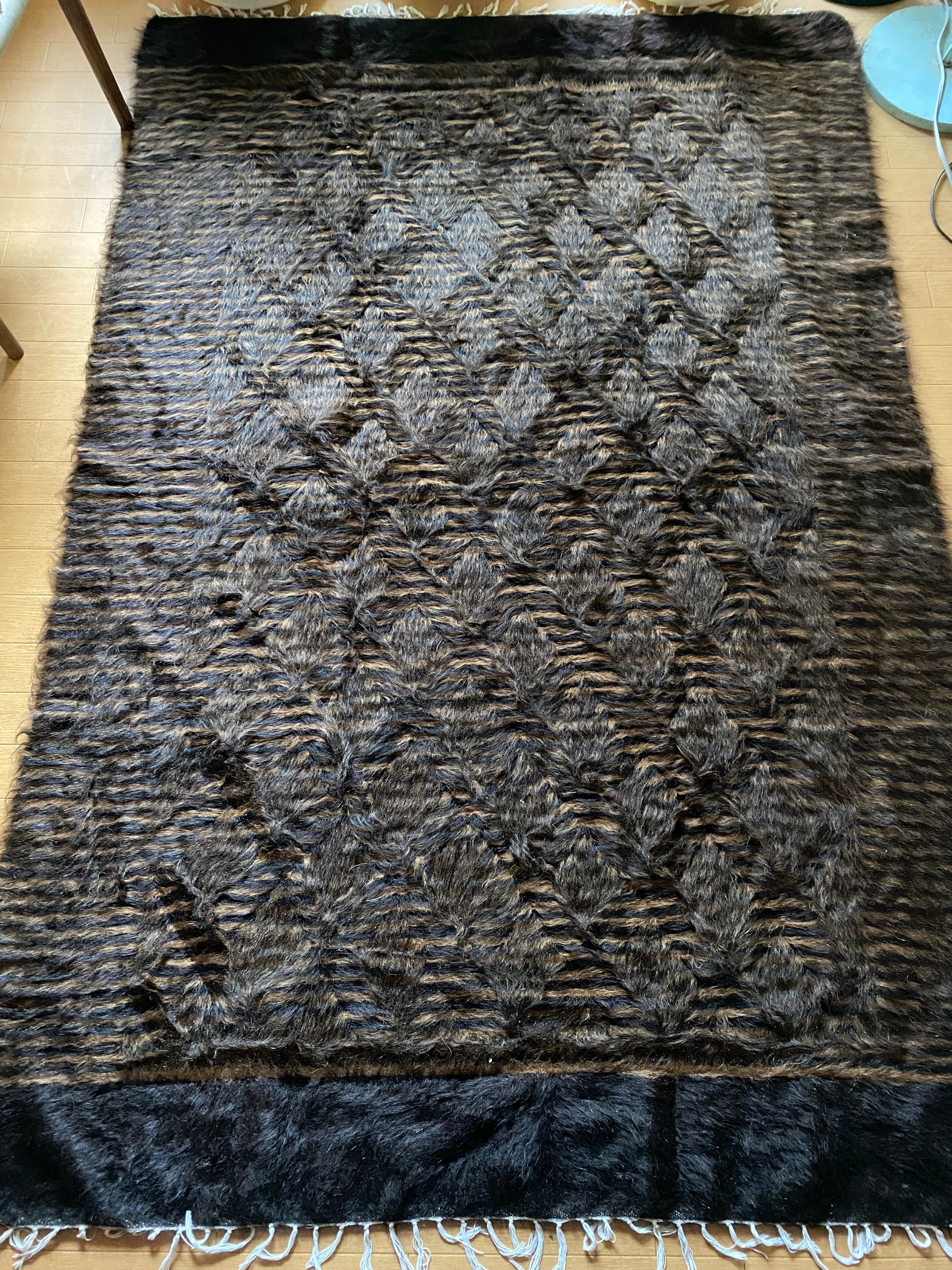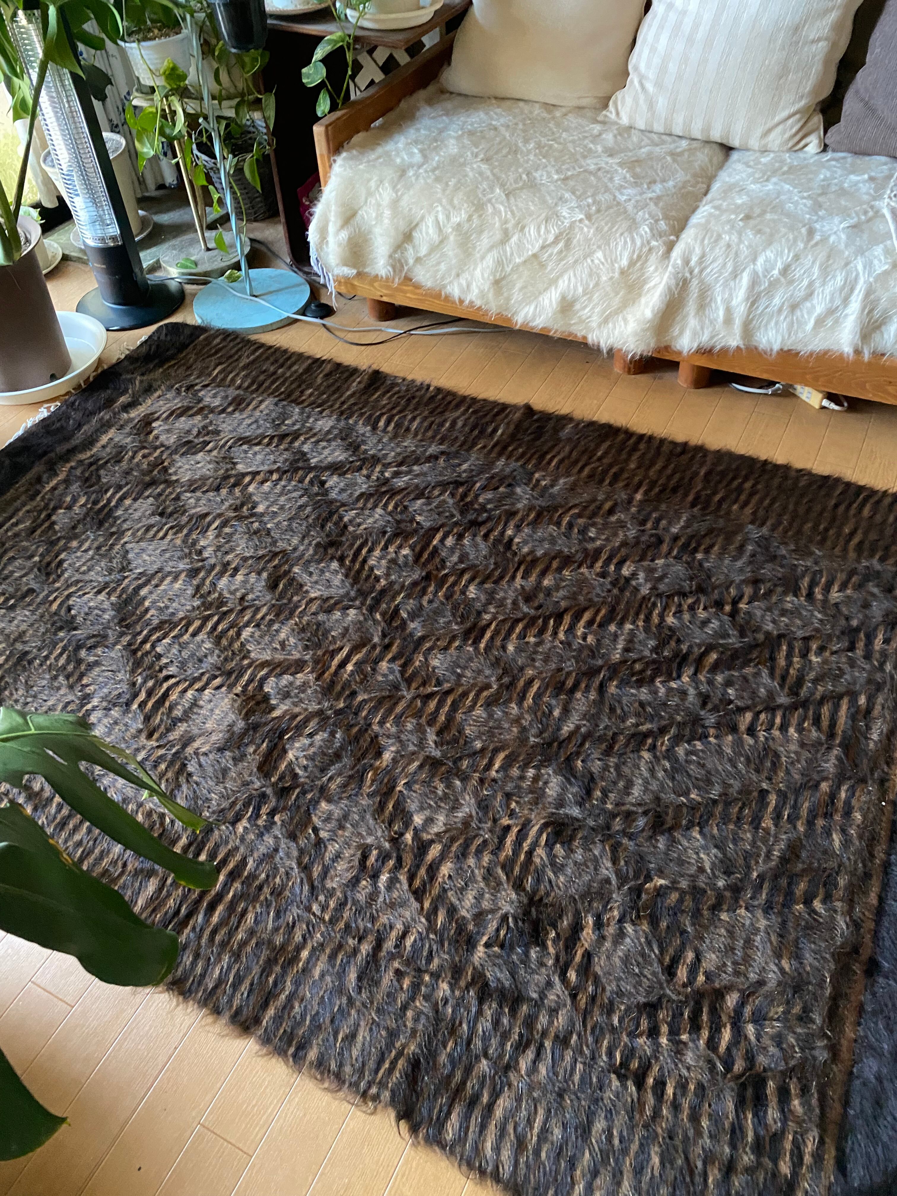 今の新しいものにくらべ、アンティークのバッタ二エと同じくらい密度が濃く、毛の艶がさらに良い山羊の毛で織られています。 未使用ですが、 ご覧いただけますように毛足も長めでつやつやです。30〜40年ほど前に織られていますが、ほぼ未使用のヴィンテージ未使用品になります。