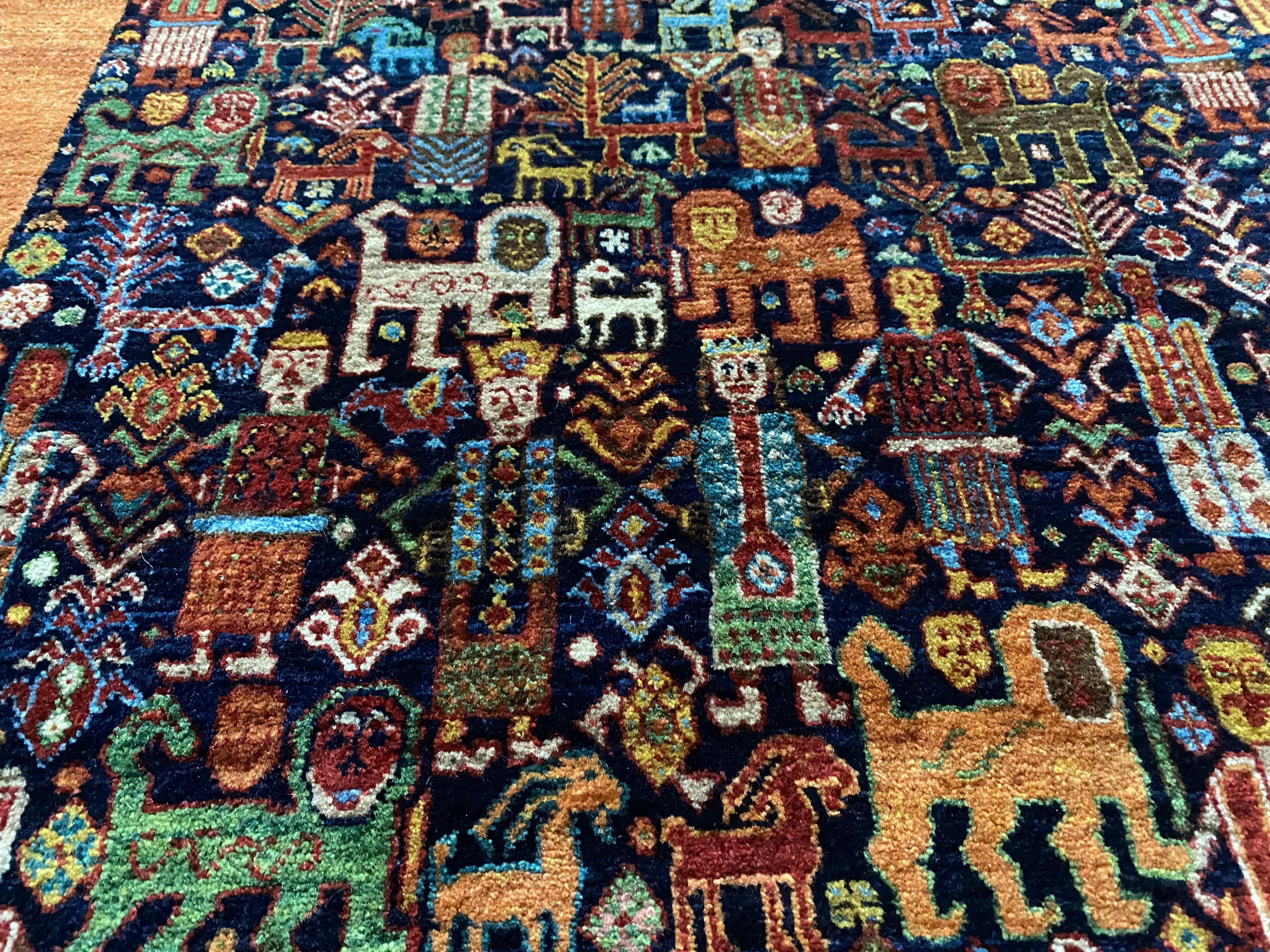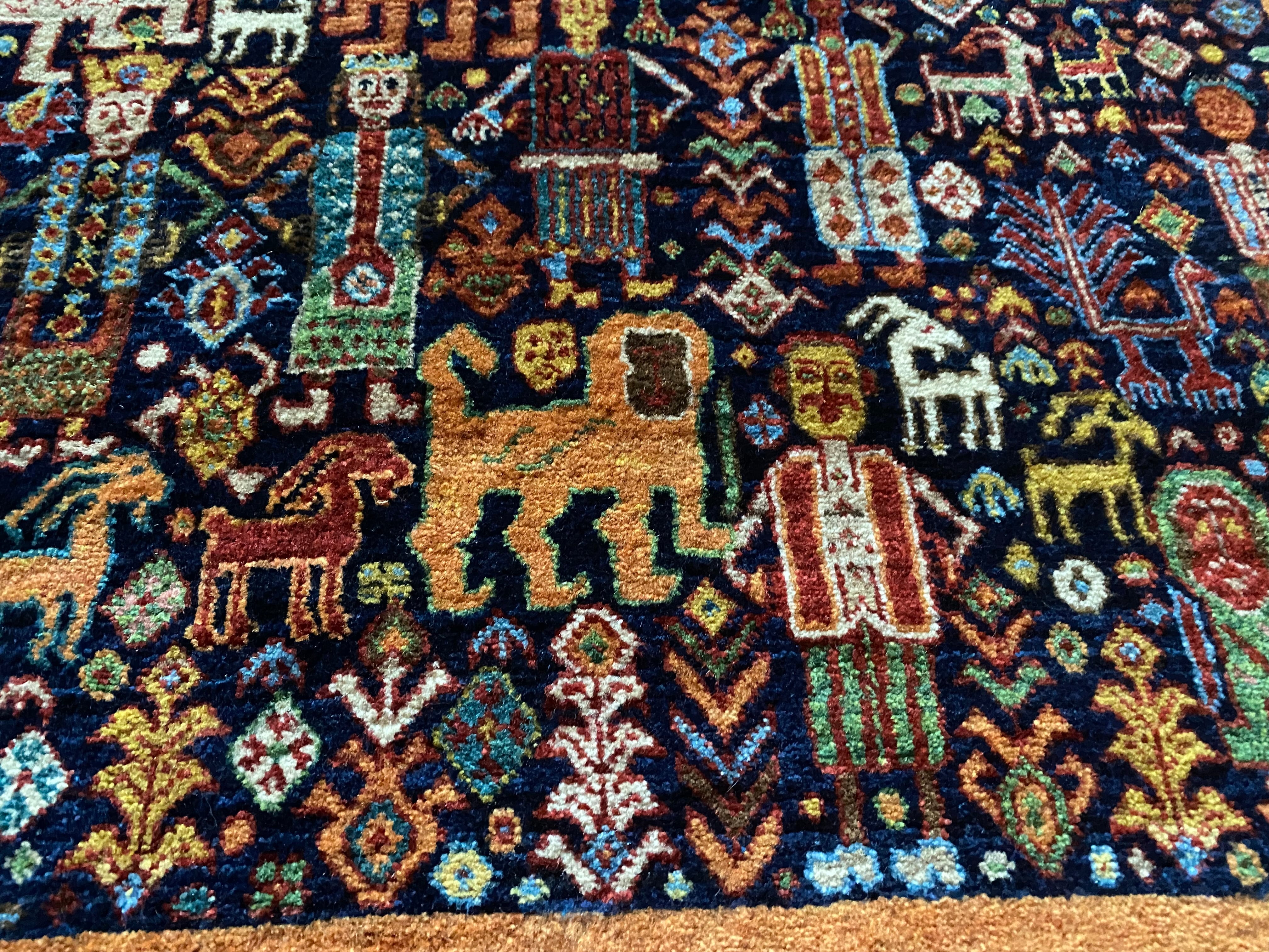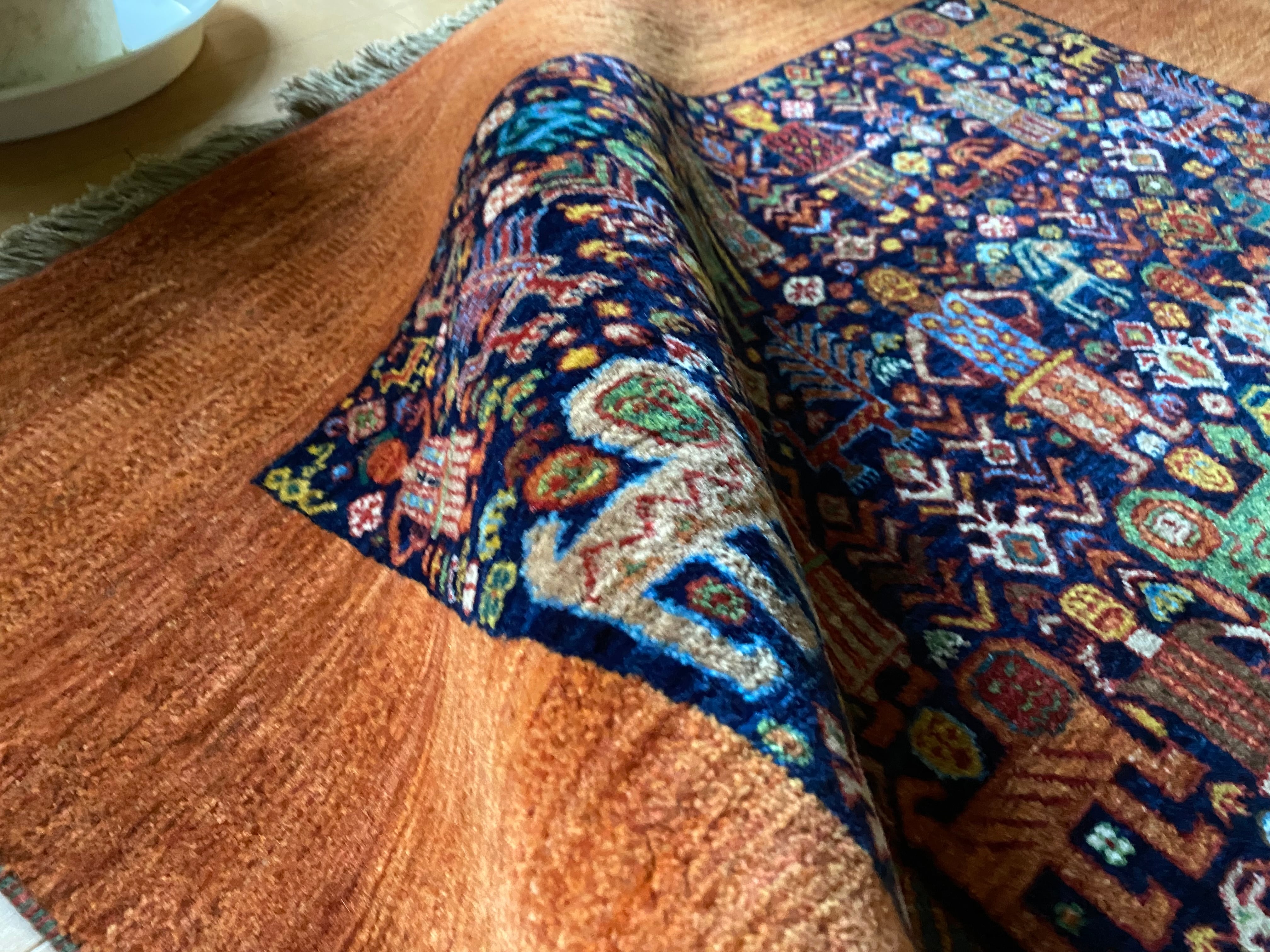 素晴らしい絵画のようなイランギャッベ絨毯ライオンや動物などびっしり細かい織大変貴重なコレクションピース新品未使用品(端に傷みあり)滅多にない逸品良いものをお探しの方へ