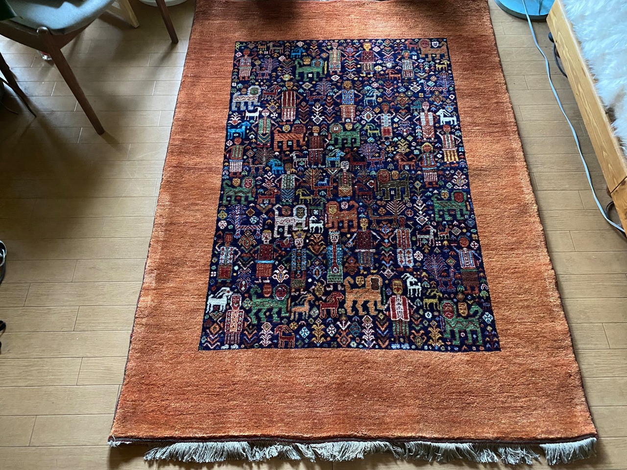 人や、動物、ライオン等びっしりと本当に絵画のように織り込まれている見事なギャッベ