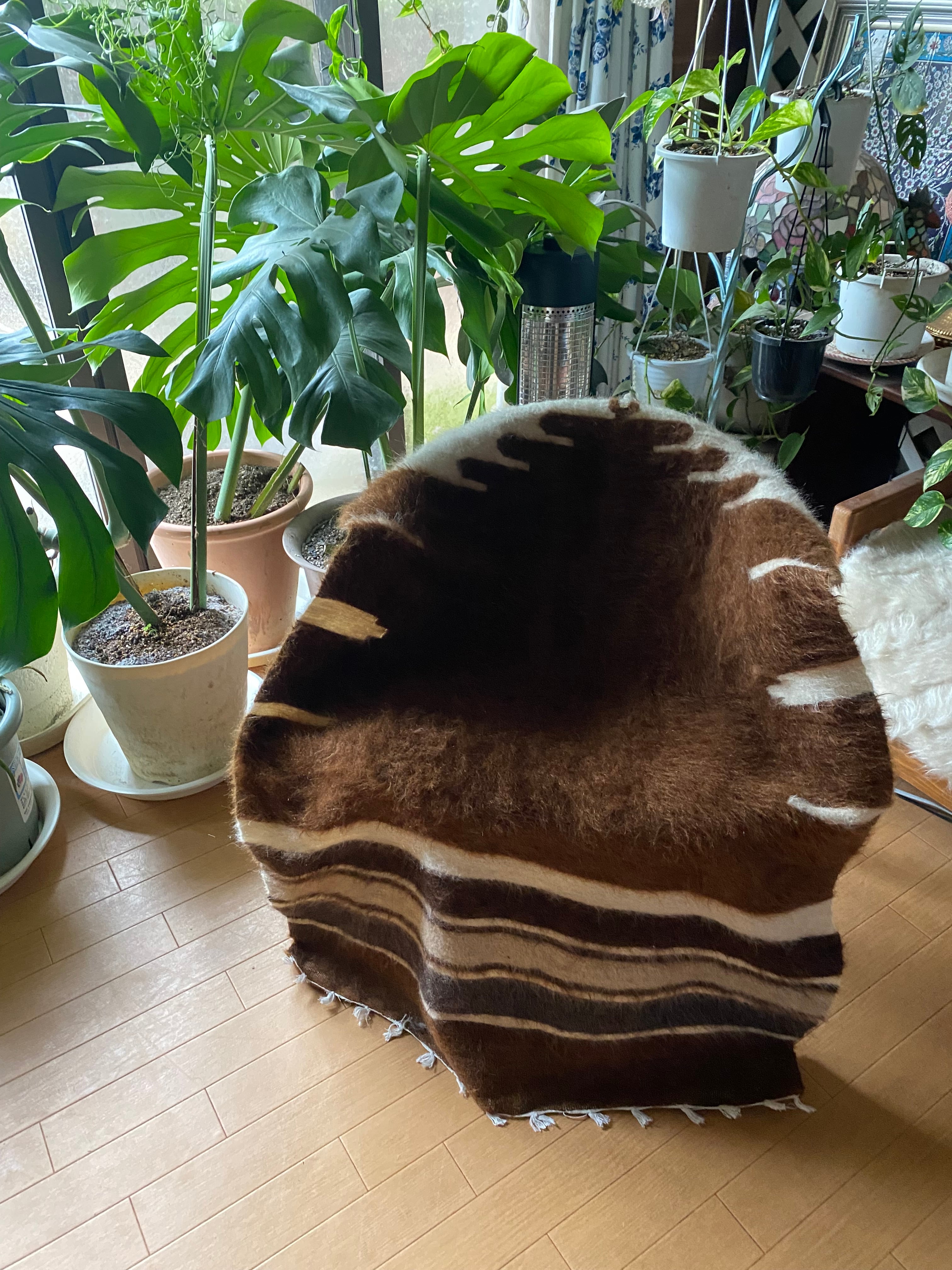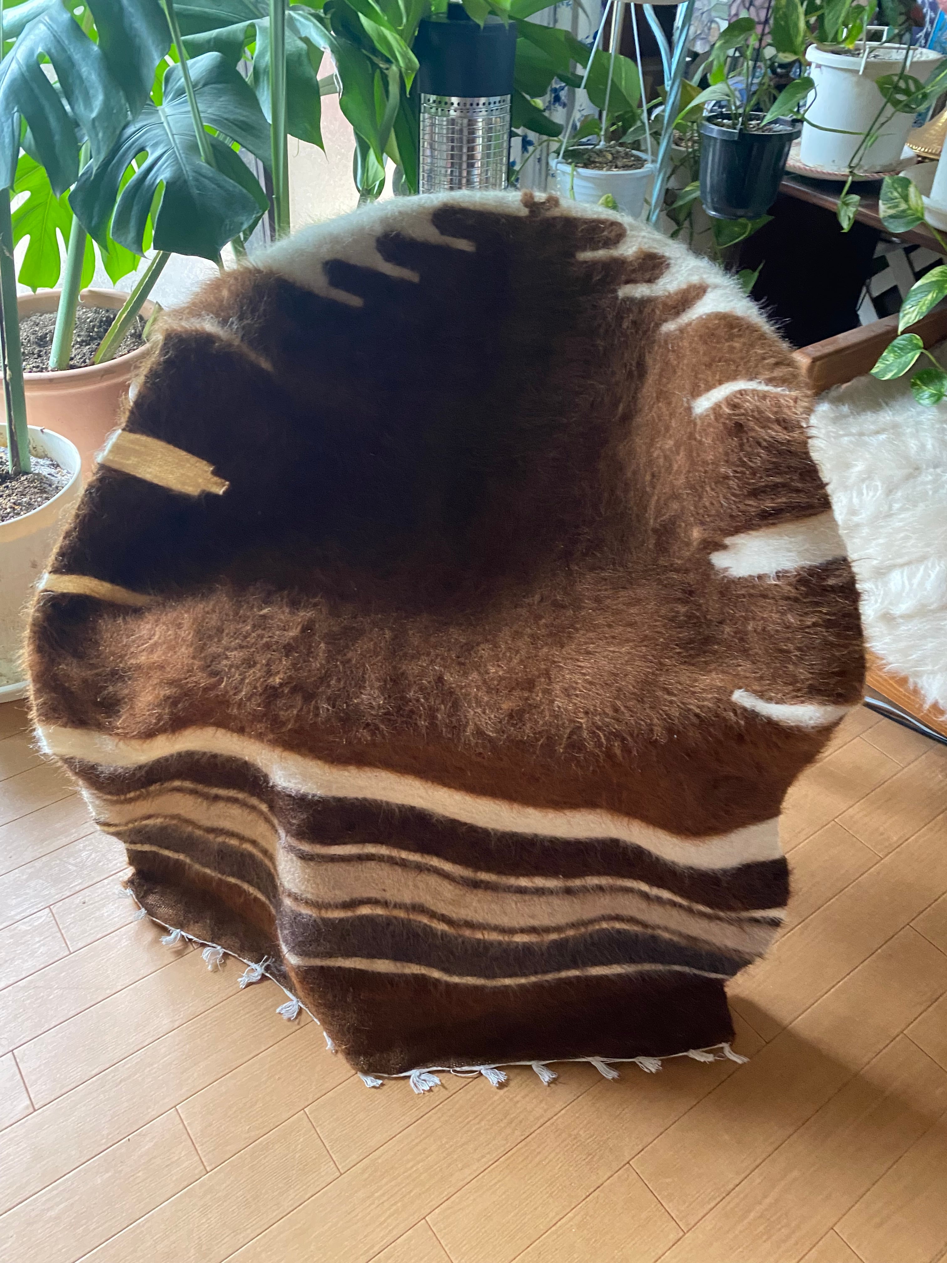 自然の山羊の毛を手で紡いだものが使われていますので、たまーにもみ殻がたまについていたり木の破片みたいなものが稀に織り込まれていることがありますので、ご了承ください。 できるだけ検品して取り除いていますが取り切れないこともありますのでご了承ください。