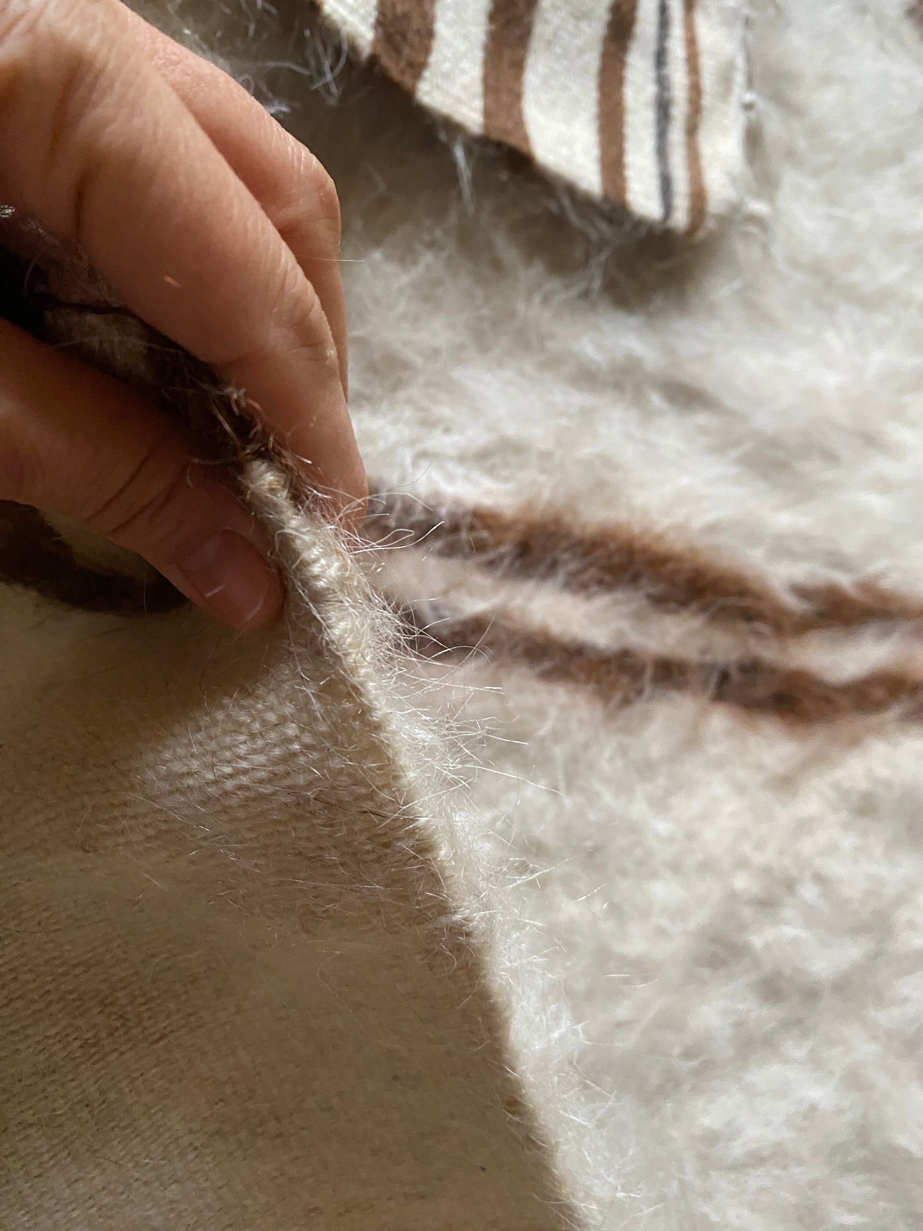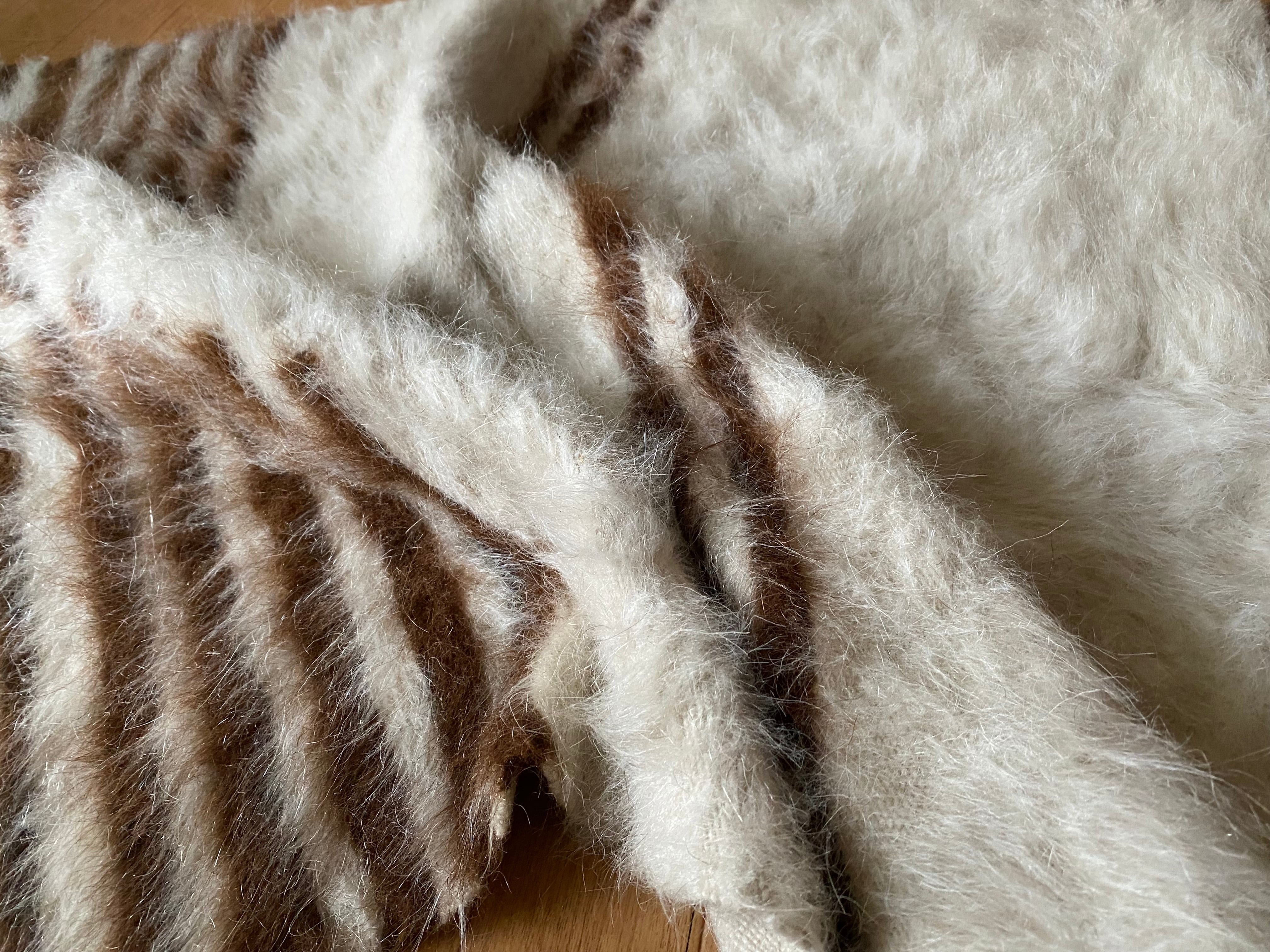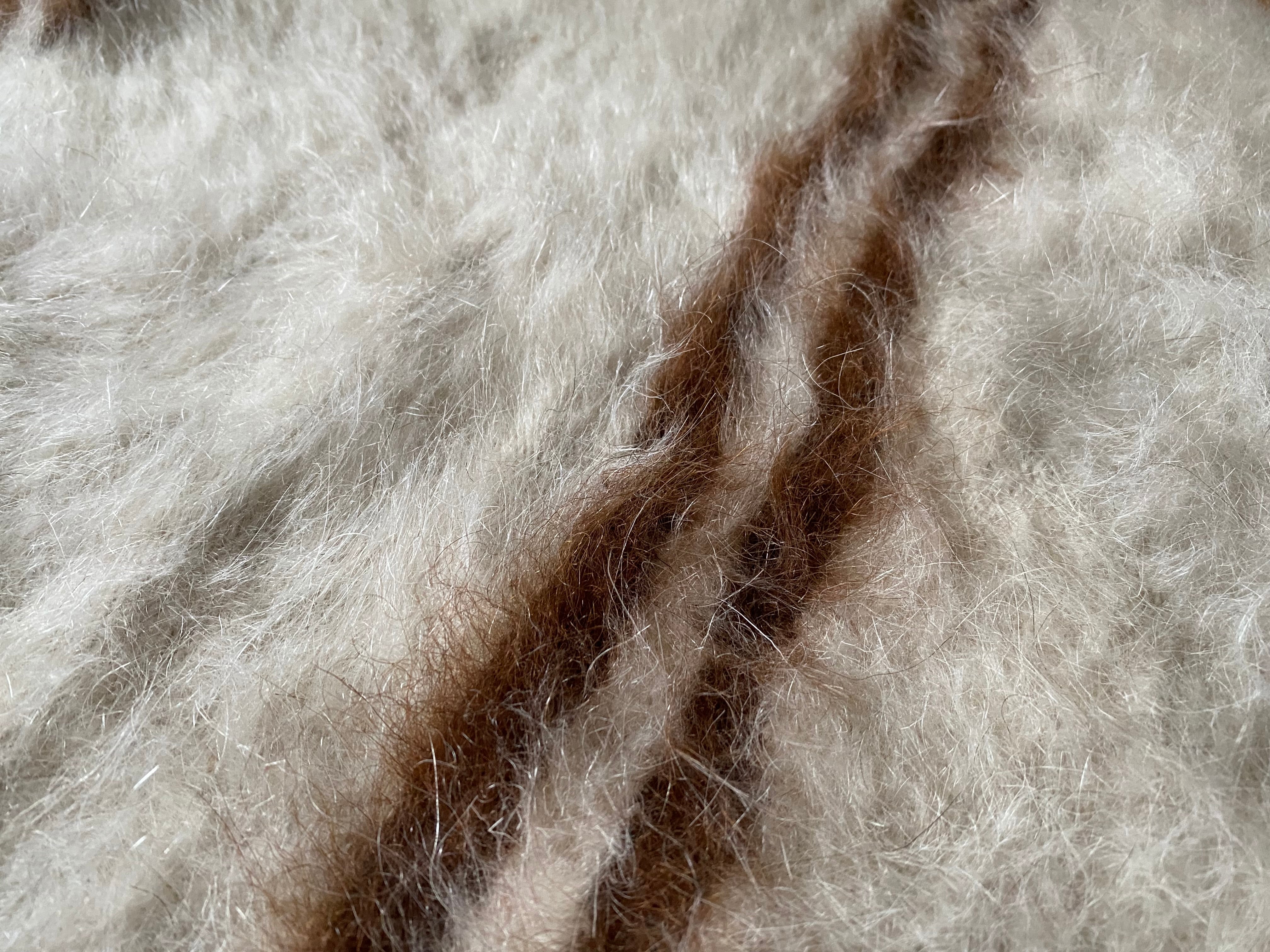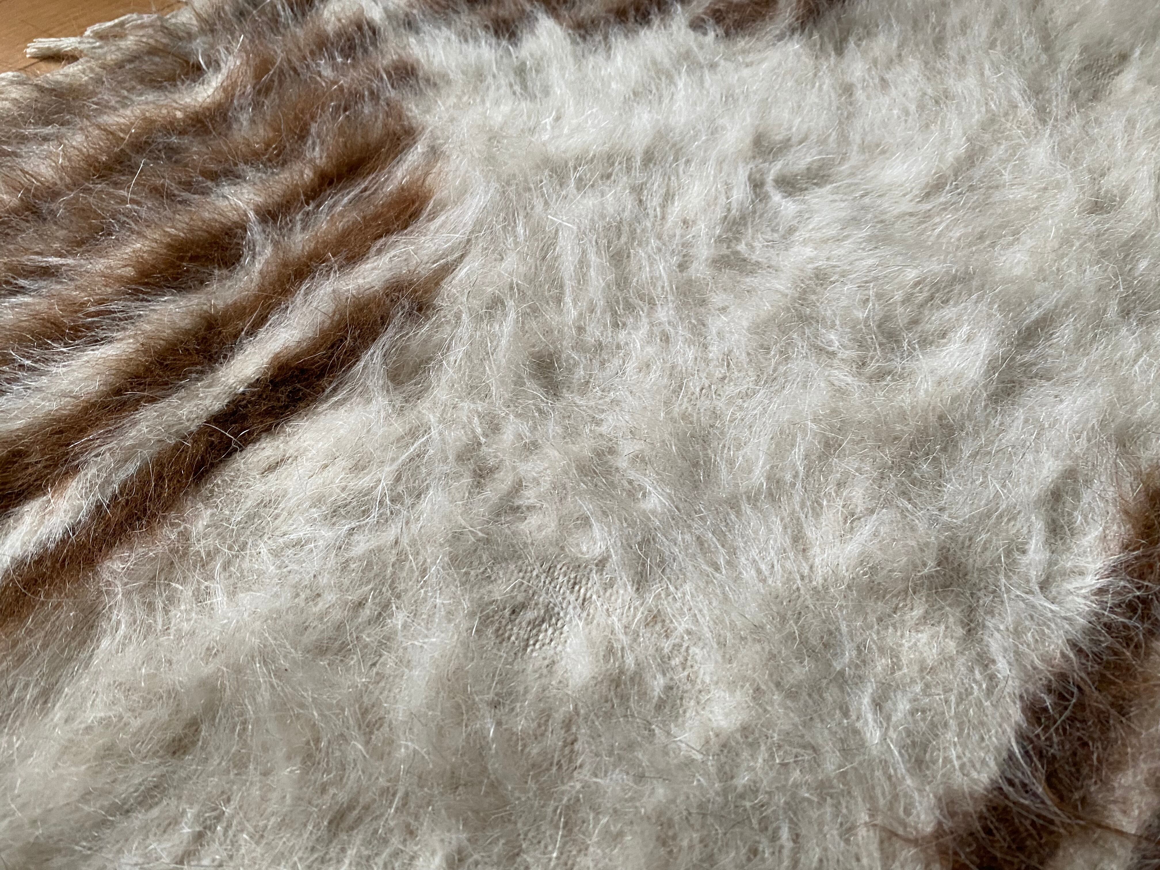 新しいものにはない細かい柄で唯一無二です。経年でとても上質の柔らかいモヘアです。セミアンティークですので毛が薄くなっている部分もありますのでご了承ください。