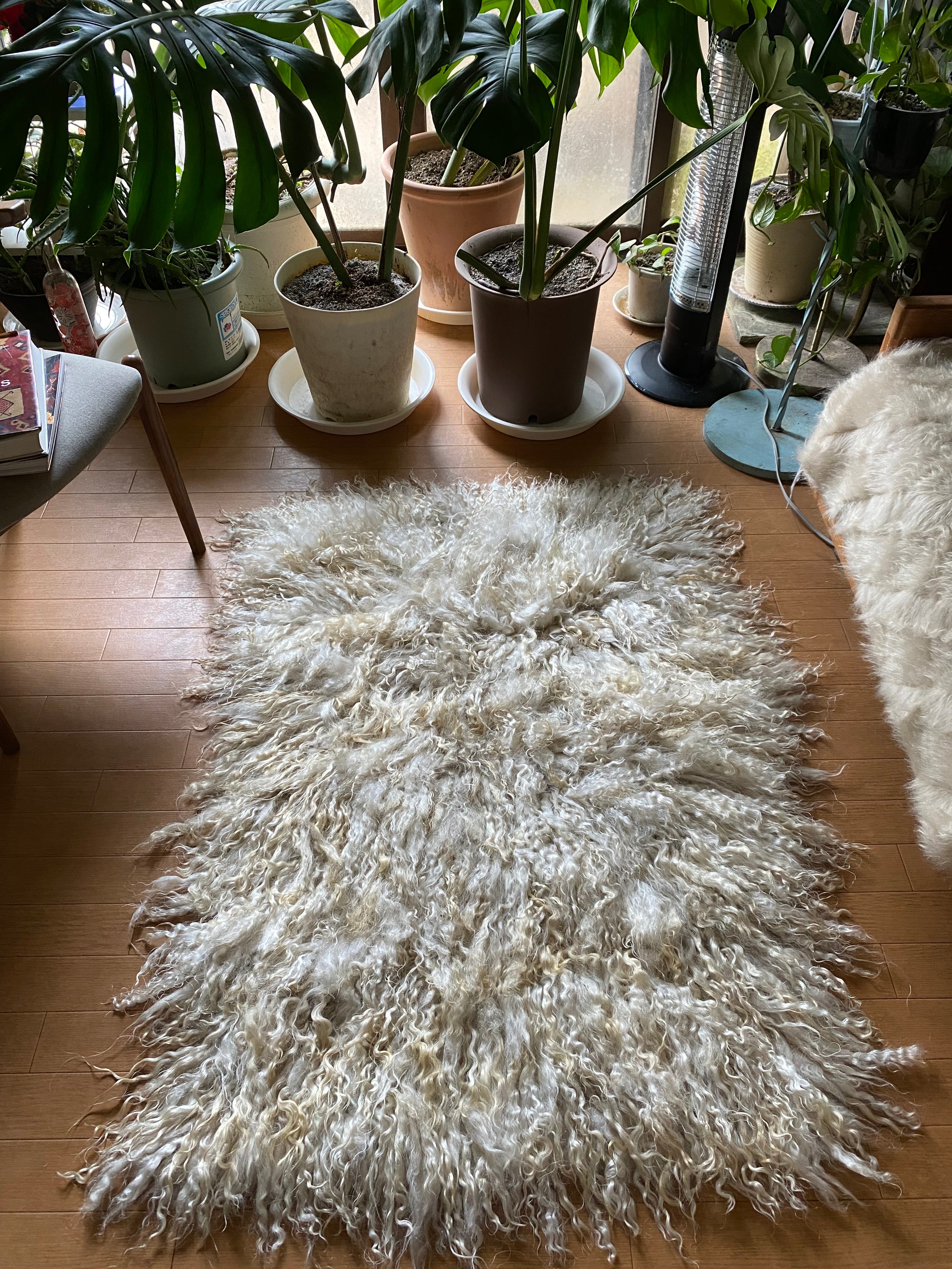 モフモフの羊毛のみのナチュラルラグTULU!白とシャンパンゴールドの自然の羊さんを傷つけないでキリムに織り込まれたトルコ遊牧生活の必需品!まるでムートンずっしりのラグ!品のある色合いが贅沢です!ラグはもちろんソファや椅子にも掛けるとゴージャス車にも80×125