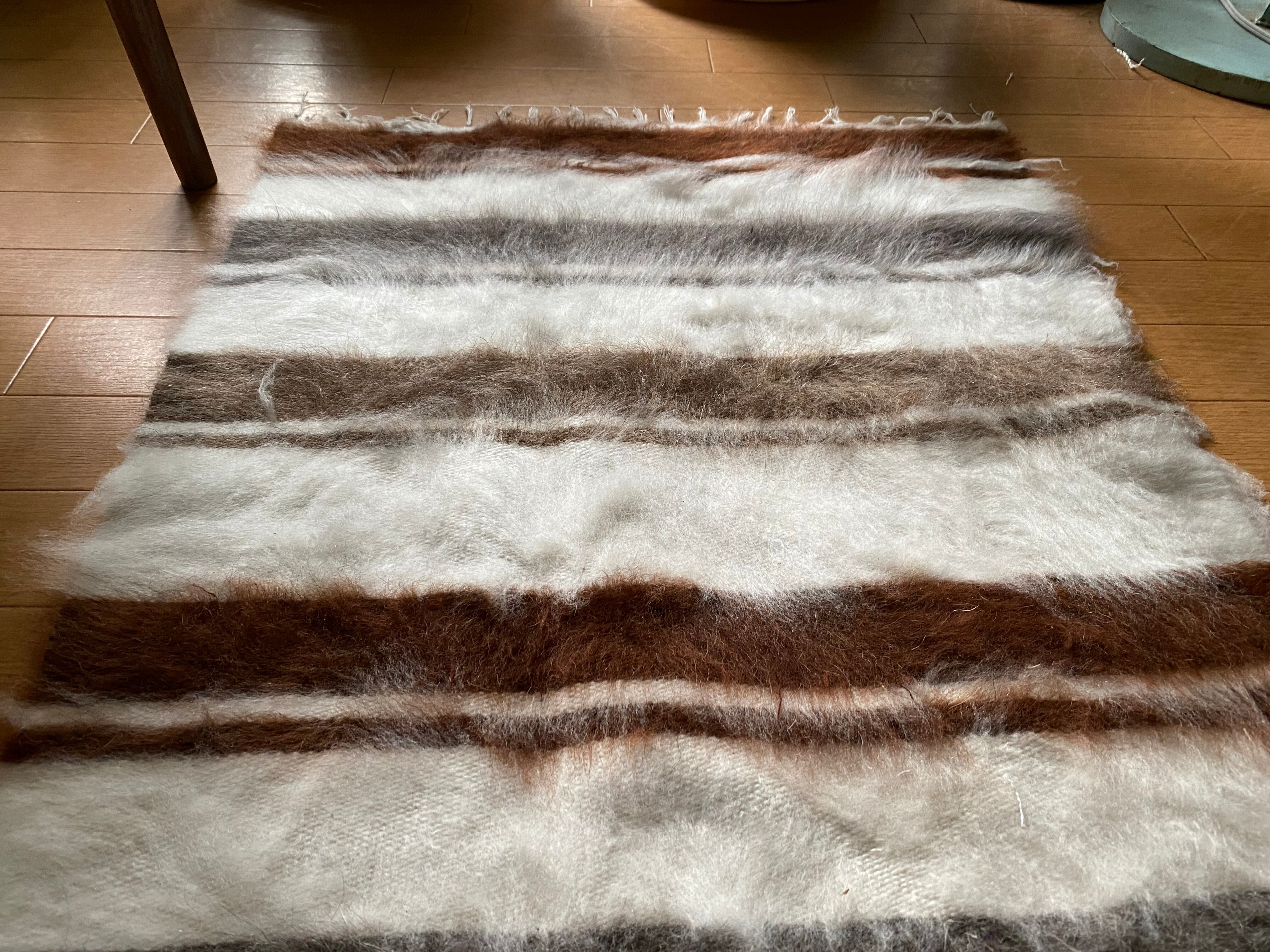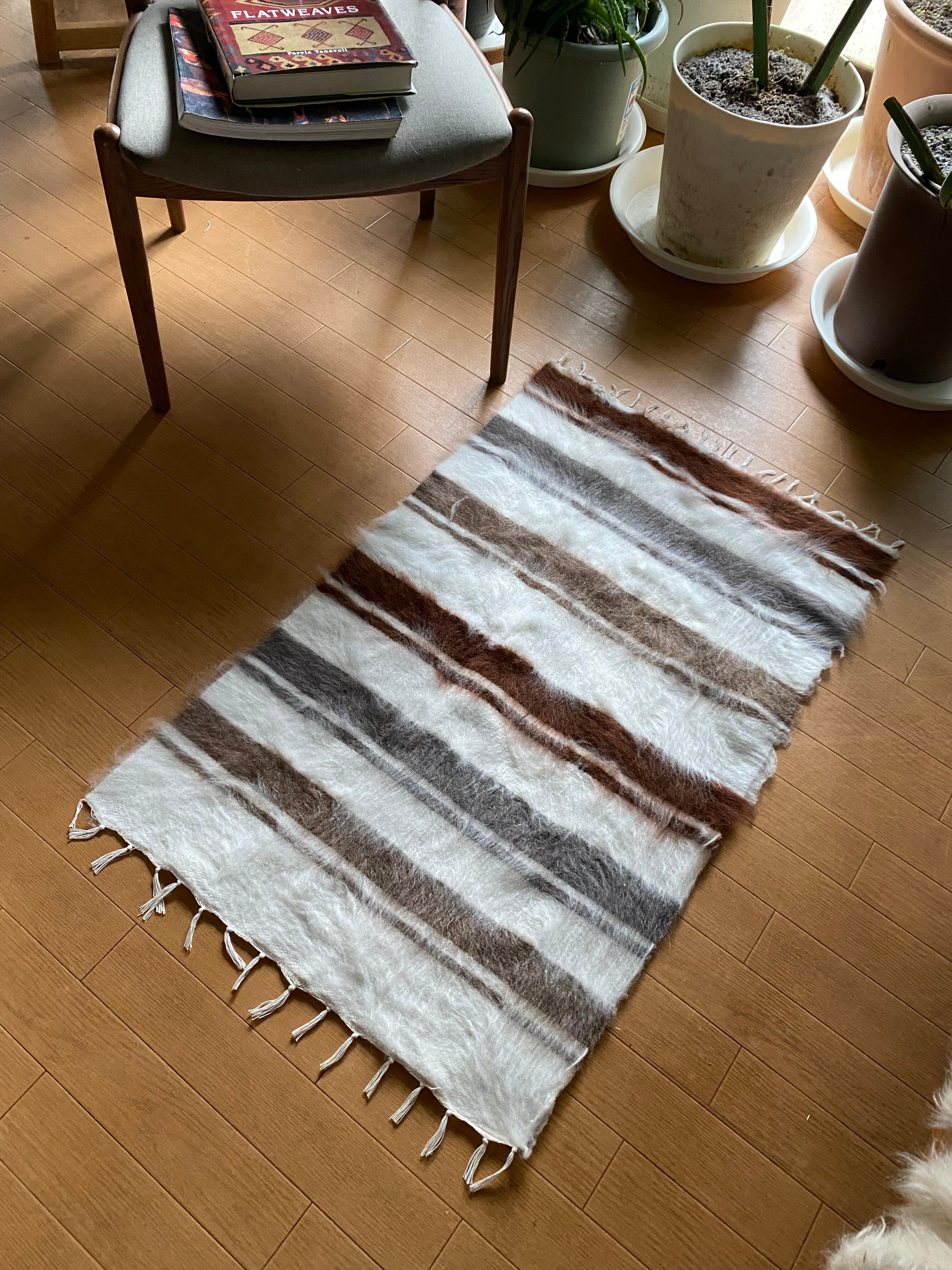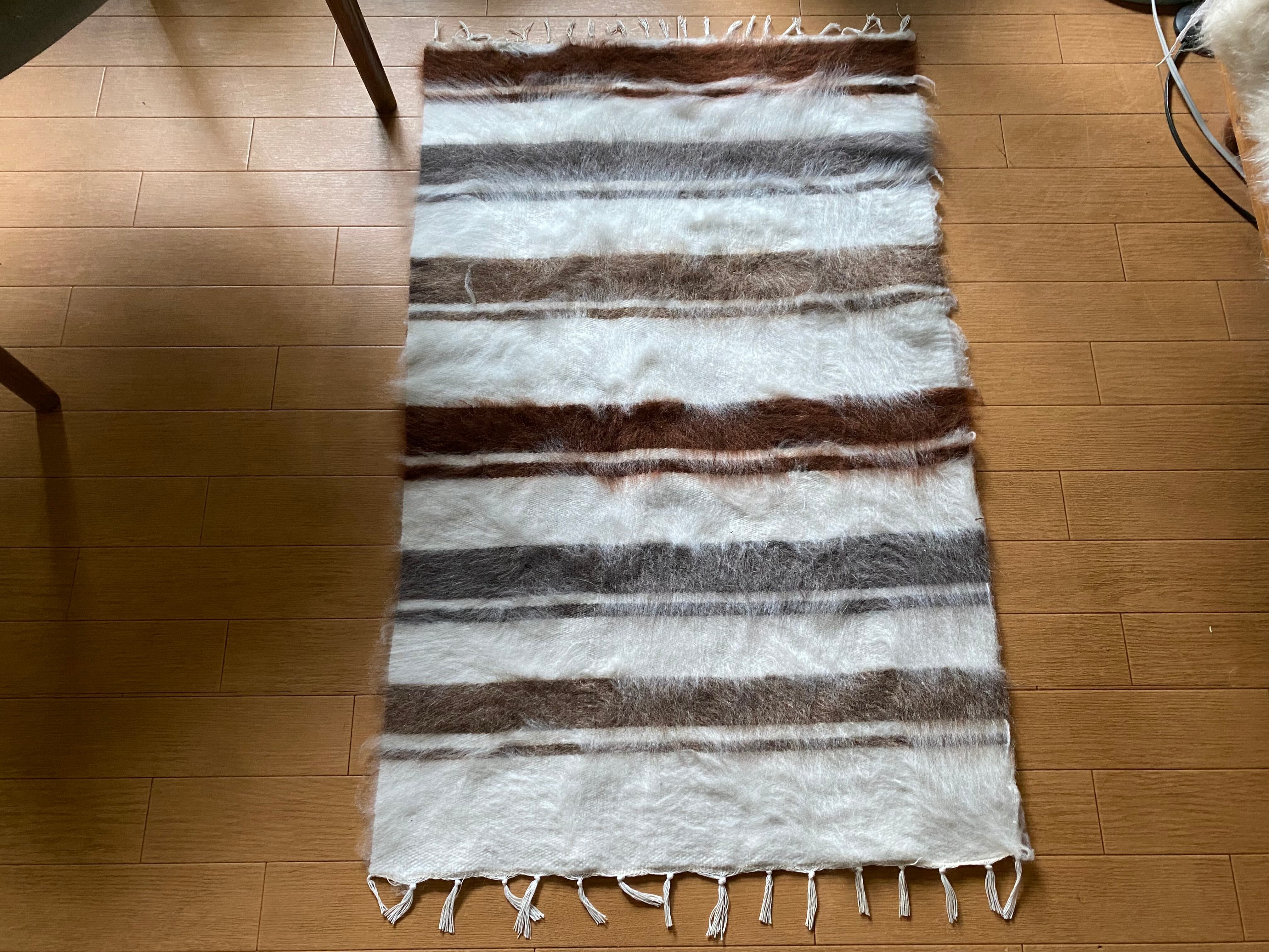 山羊ならではの模様をお楽しみください。 片面だけ毛が出ていて裏は毛がとってあるのだとおもいますので、裏面でお使いいただければ、普通のキリムとして も使えます。 冬は毛がある面で、夏は裏面でキリムとしてお使いいただける優れものです。 また毛のある表は毛をけばだたせて、模様も作っていますのでとてもおしゃれ度が高いです。 新品未使用品です。