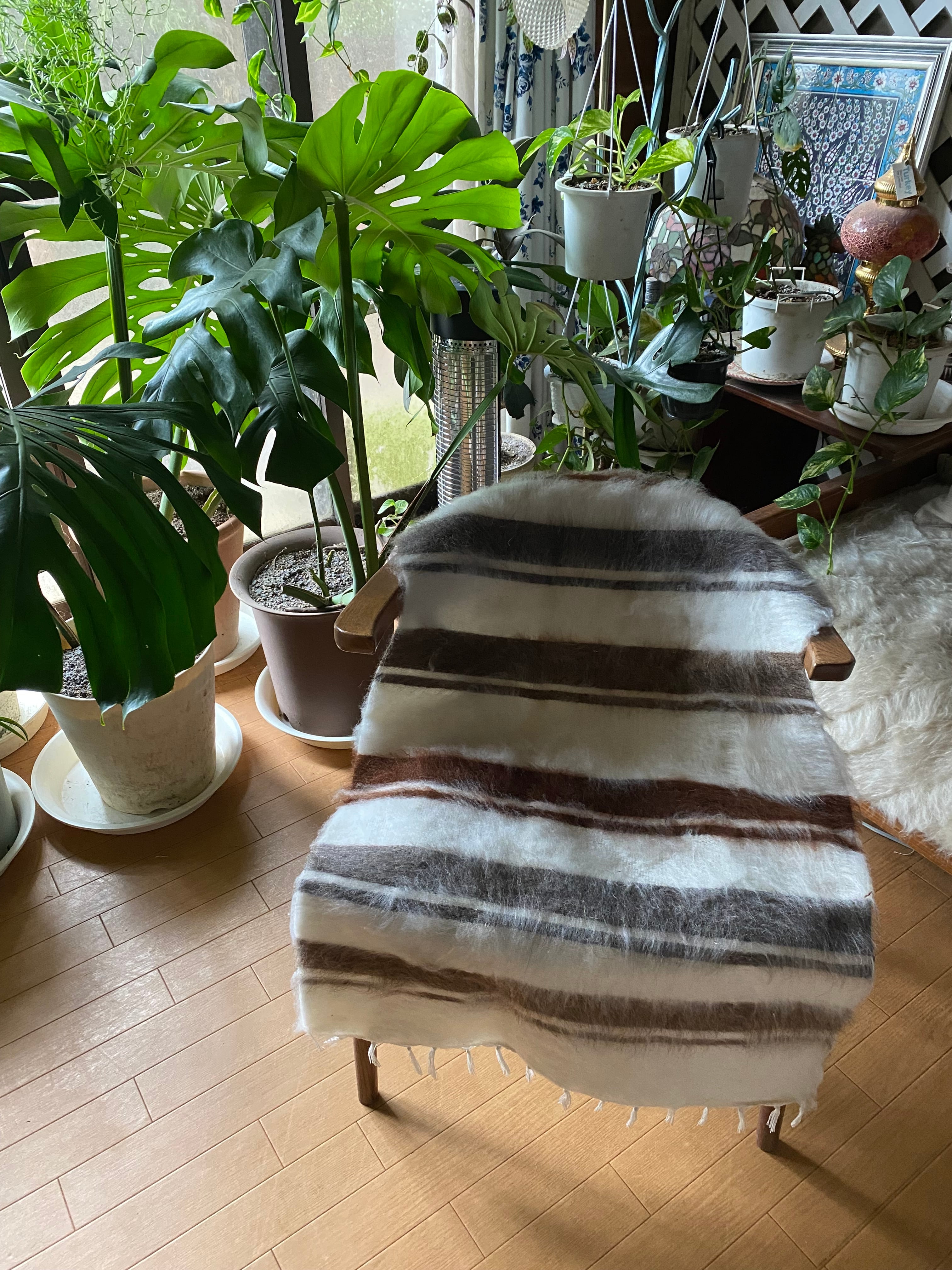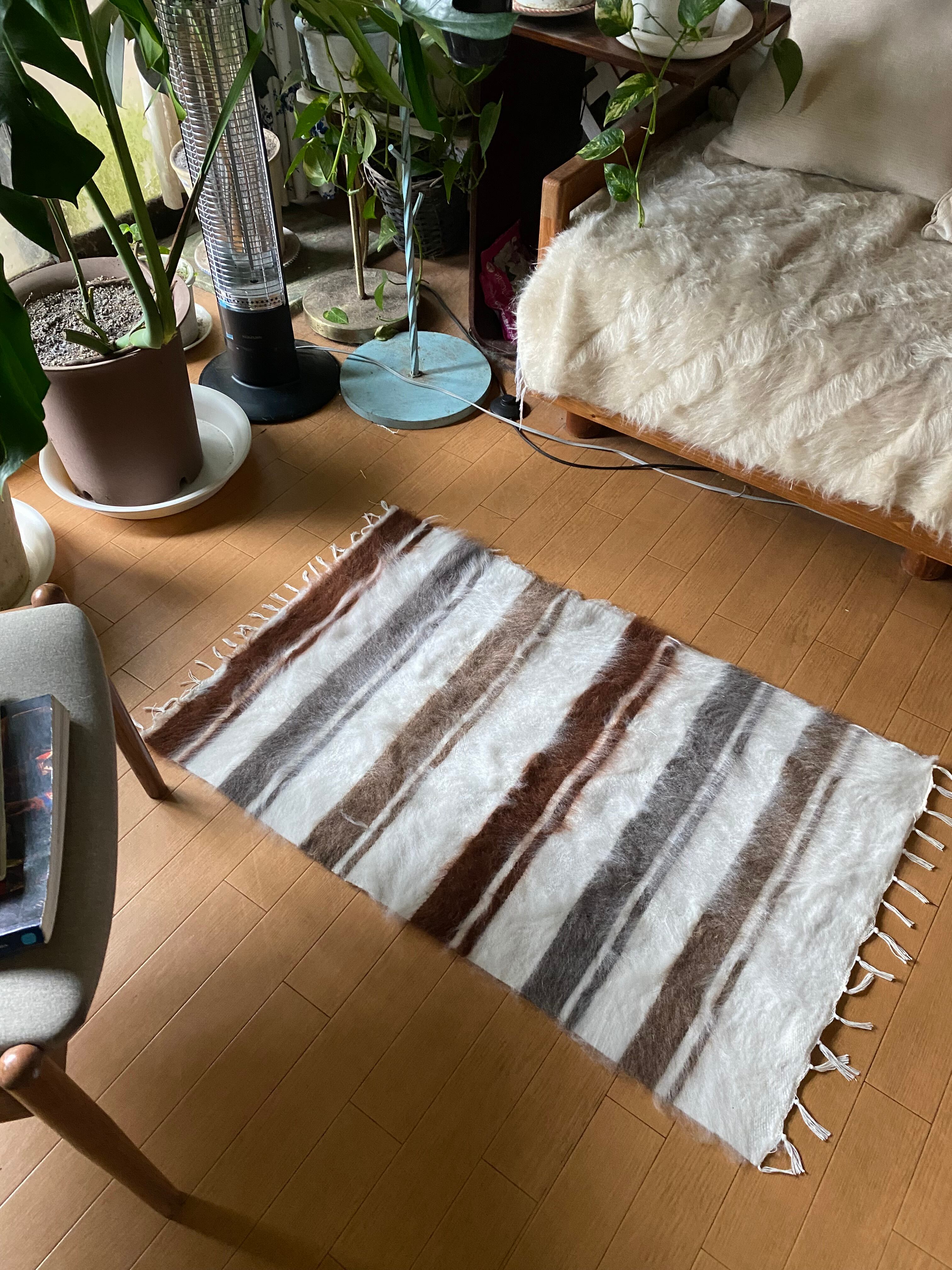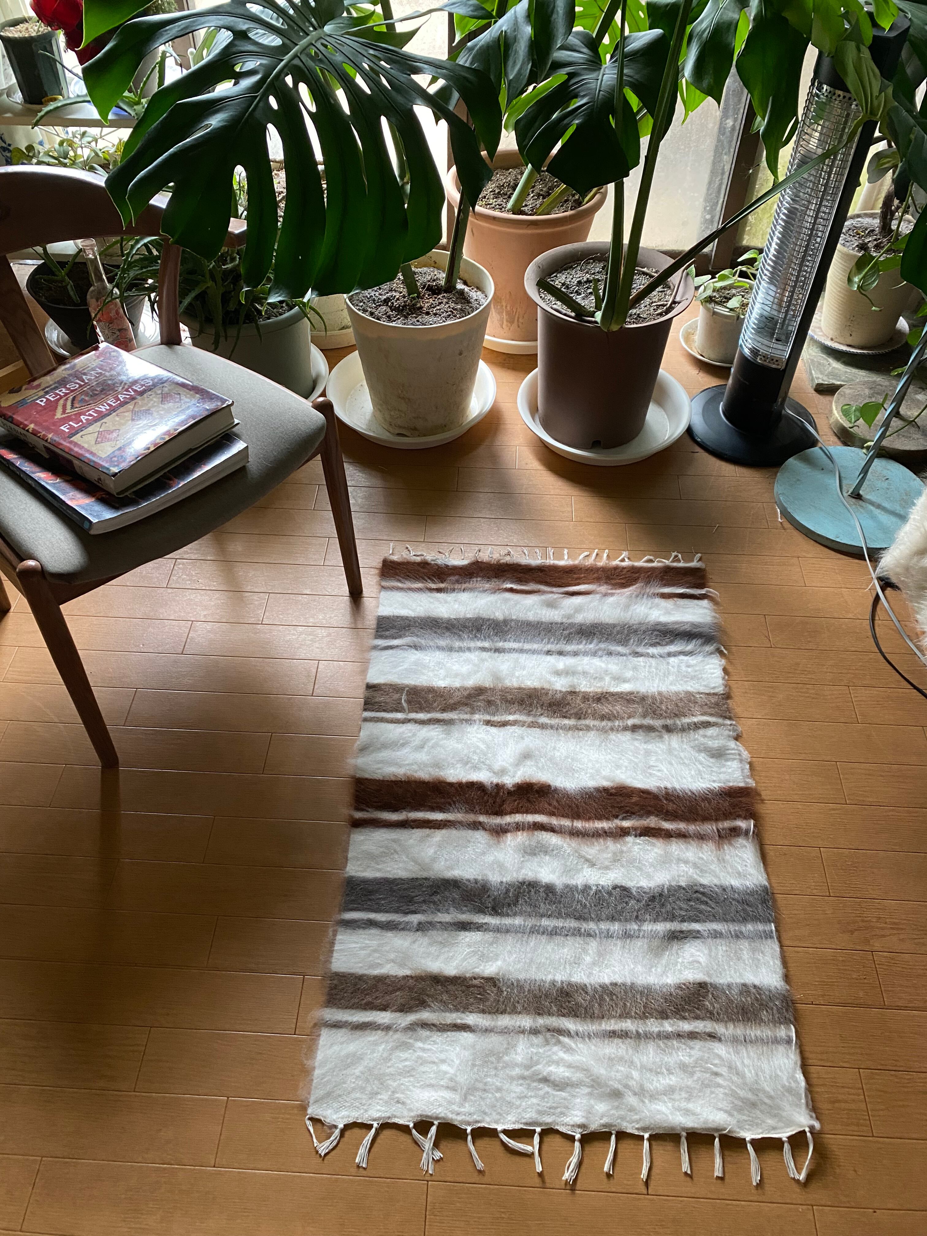 山羊ならではの模様をお楽しみください。 片面だけ毛が出ていて裏は毛がとってあるのだとおもいますので、裏面でお使いいただければ、普通のキリムとして も使えます。 冬は毛がある面で、夏は裏面でキリムとしてお使いいただける優れものです。 また毛のある表は毛をけばだたせて、模様も作っていますのでとてもおしゃれ度が高いです。 新品未使用品です。
