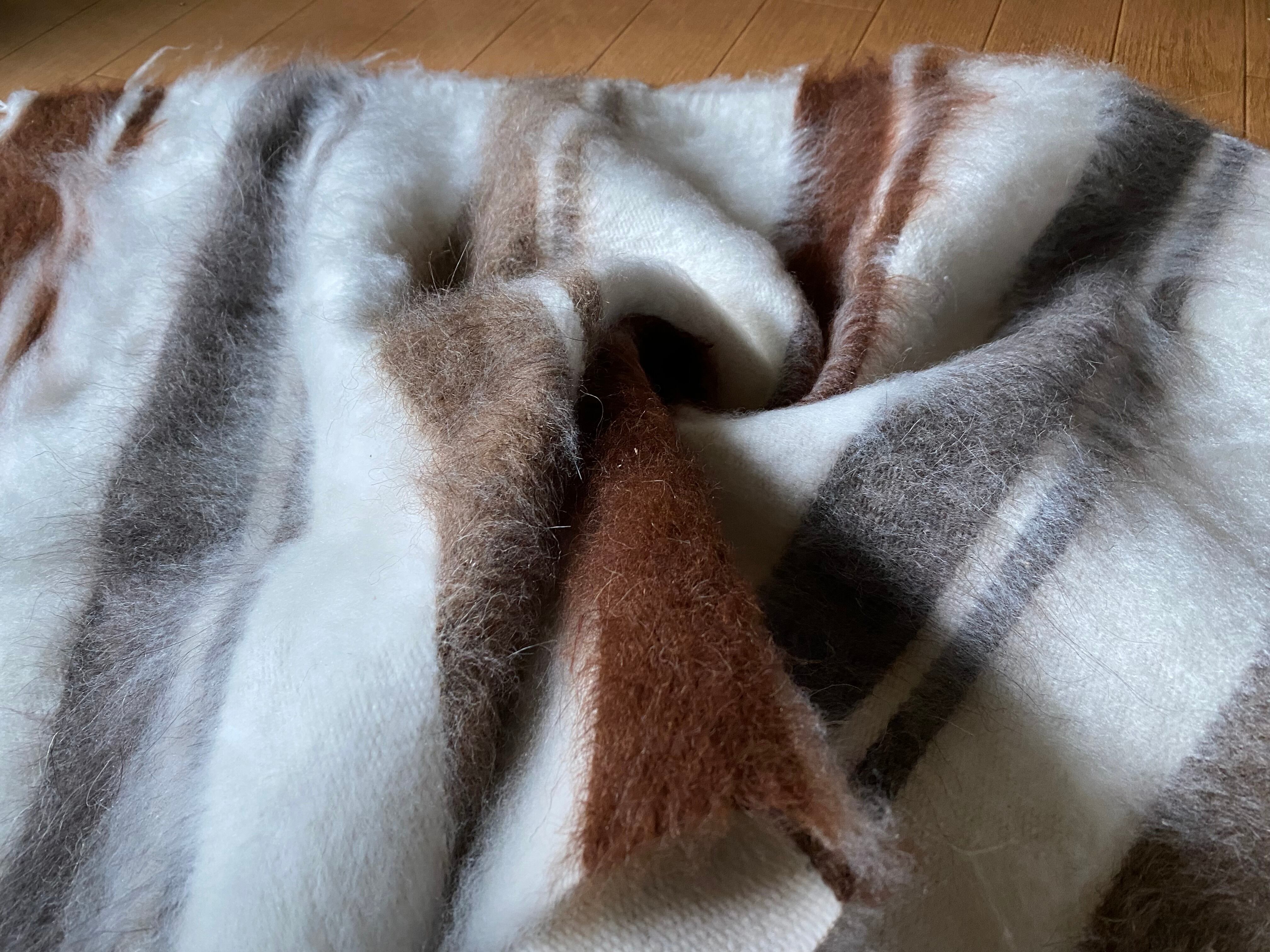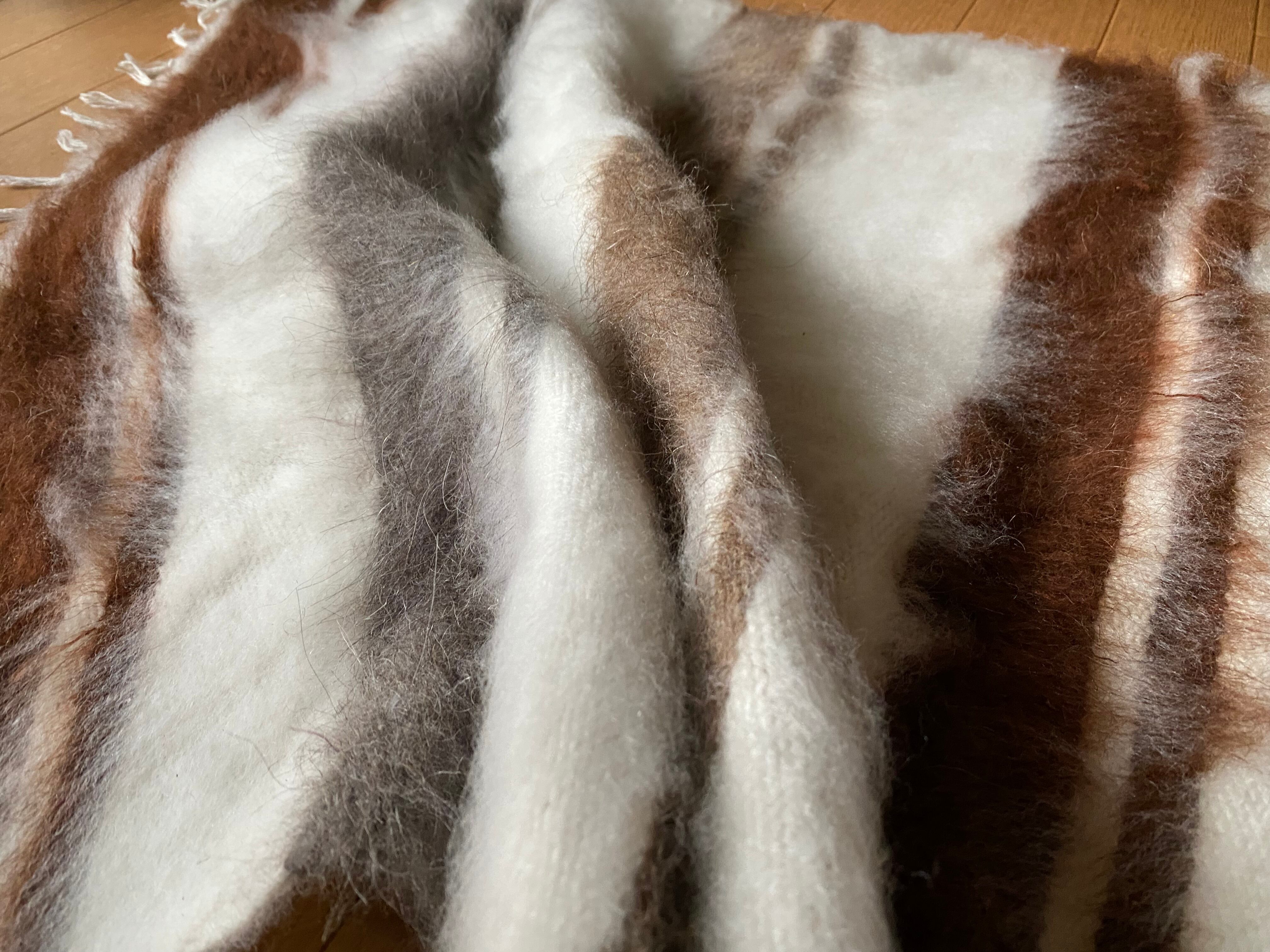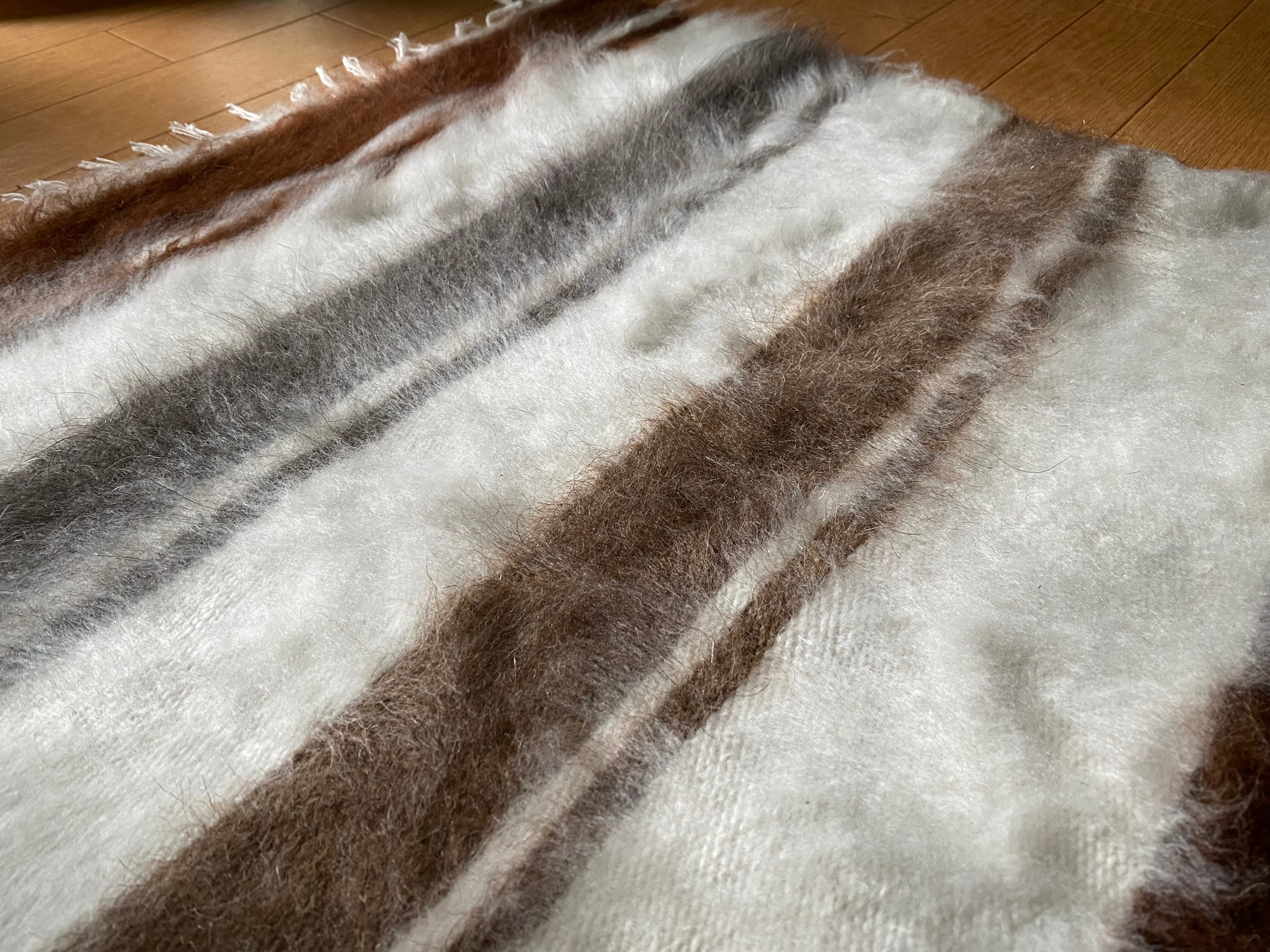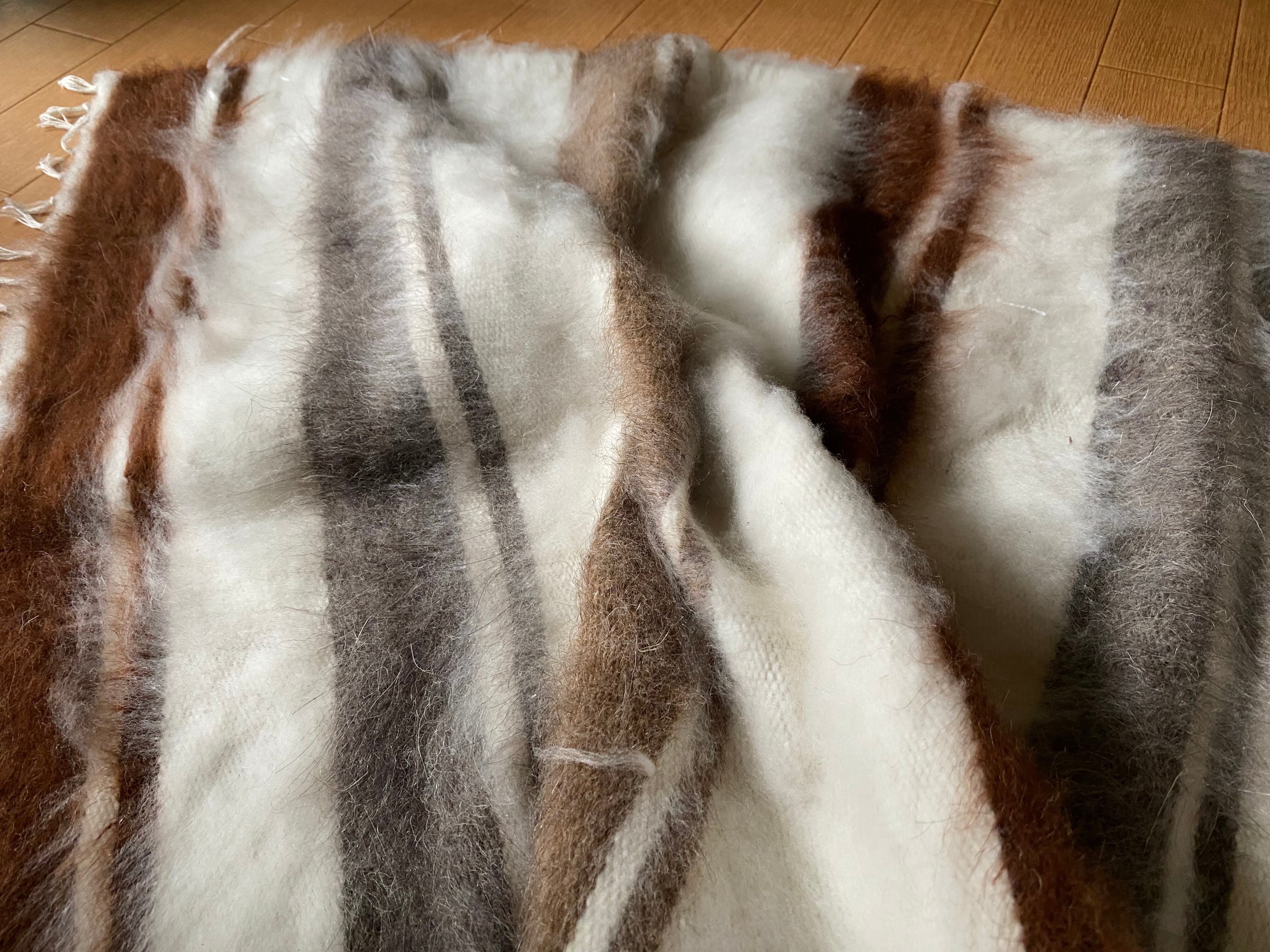 自然のヤギの毛で織られていますので、独特のくるくるとした感じも可愛く、とてもナチュ ラルな感じです。アンゴラ山羊は18世紀の中ごろまでオスマントルコが飼育を独占していたらしいです。 その後改良され、良質のモヘアとして世界的に発展していったそうです。モヘアと言えば、カシミヤと並ぶ素材ですね。山羊の毛ですので、羊より高級で暖かです。