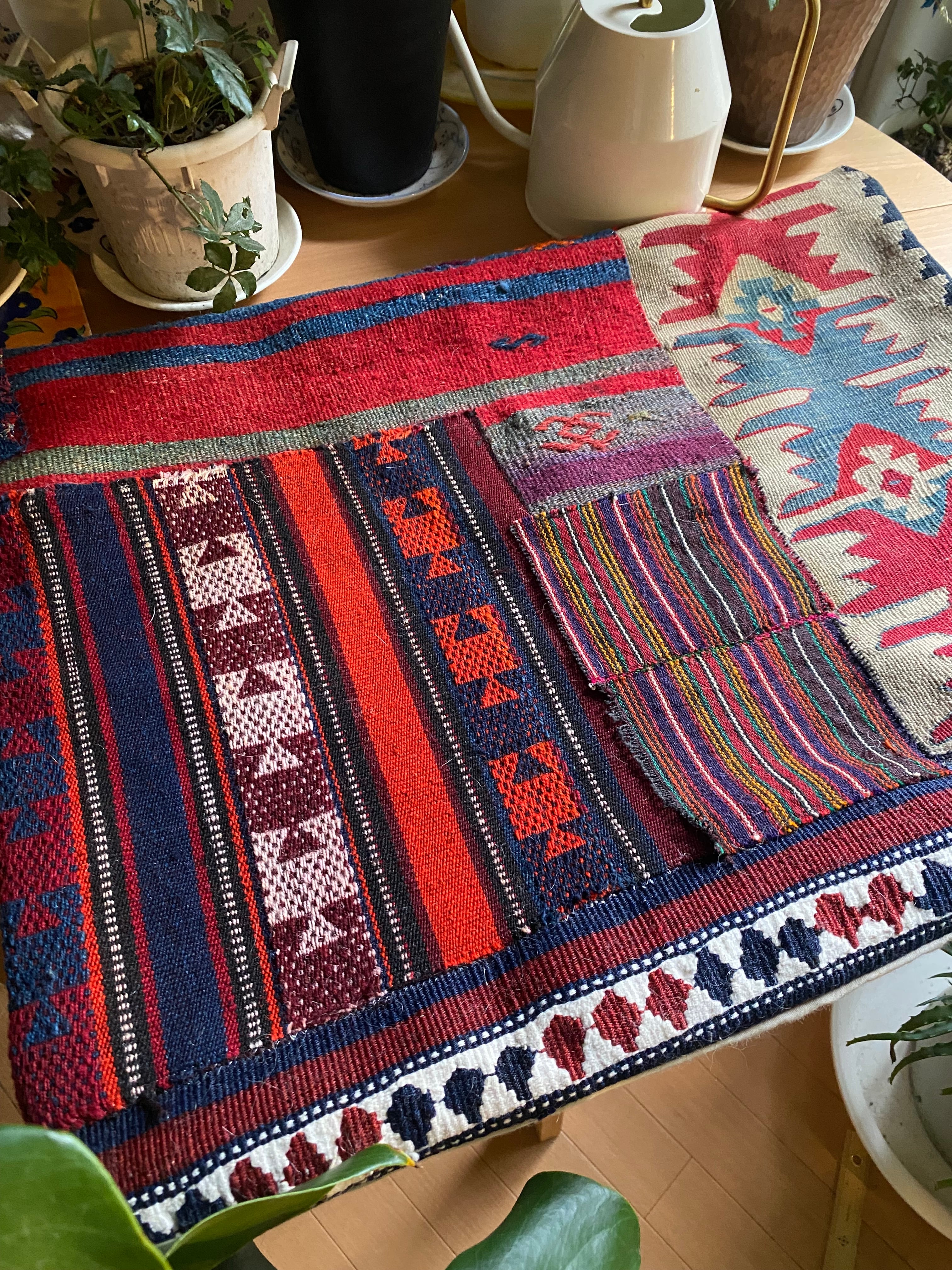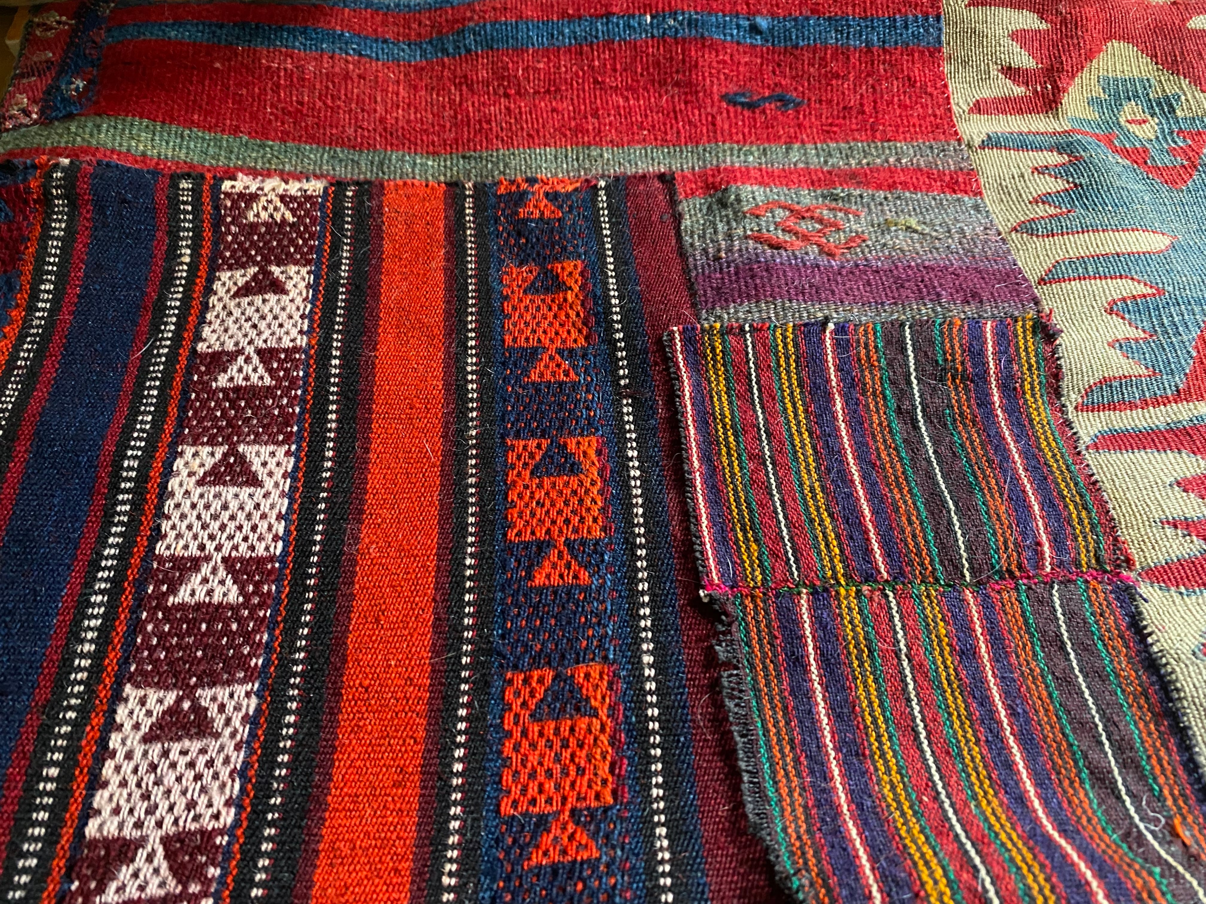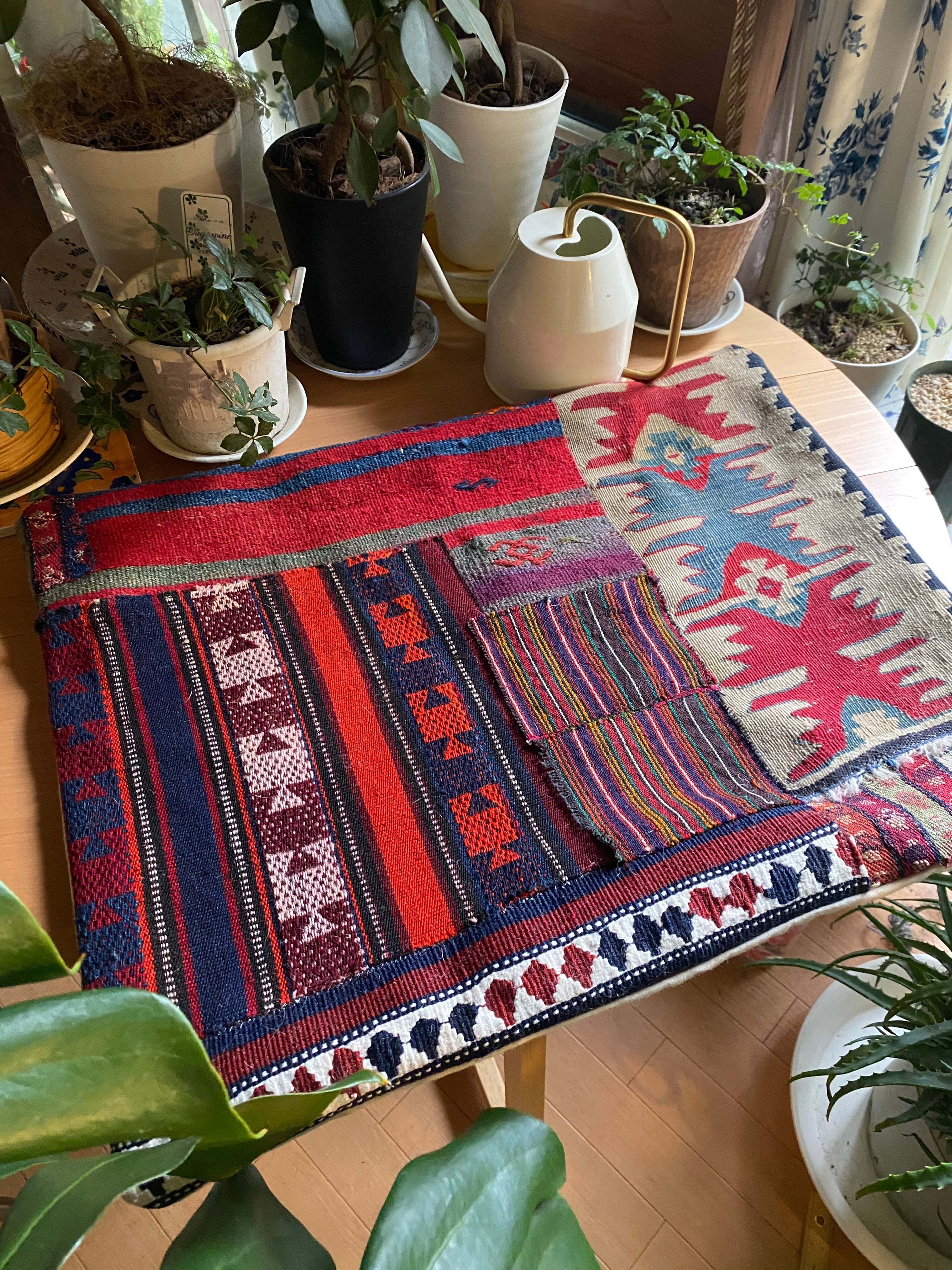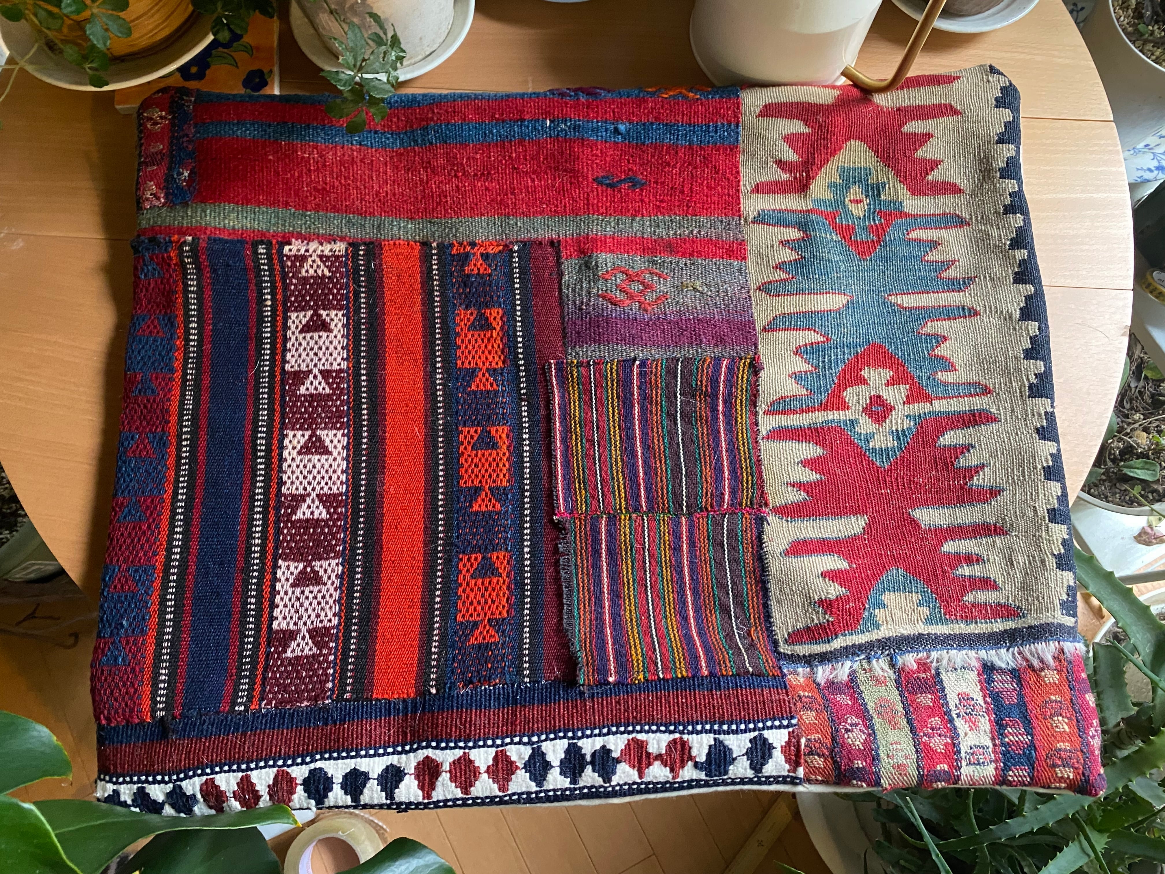 トルコアンティークキリム総草木染のみのパッチワーククッションカバー!シャルキョイはじめトルコ有名産地の総草木染アンティークキリムのみを使用一枚で存在感のあるインテリア!中身を入れなくてもティーマットや椅子カバーに!1点のみ世界に1つのオリジナル!44×55大判