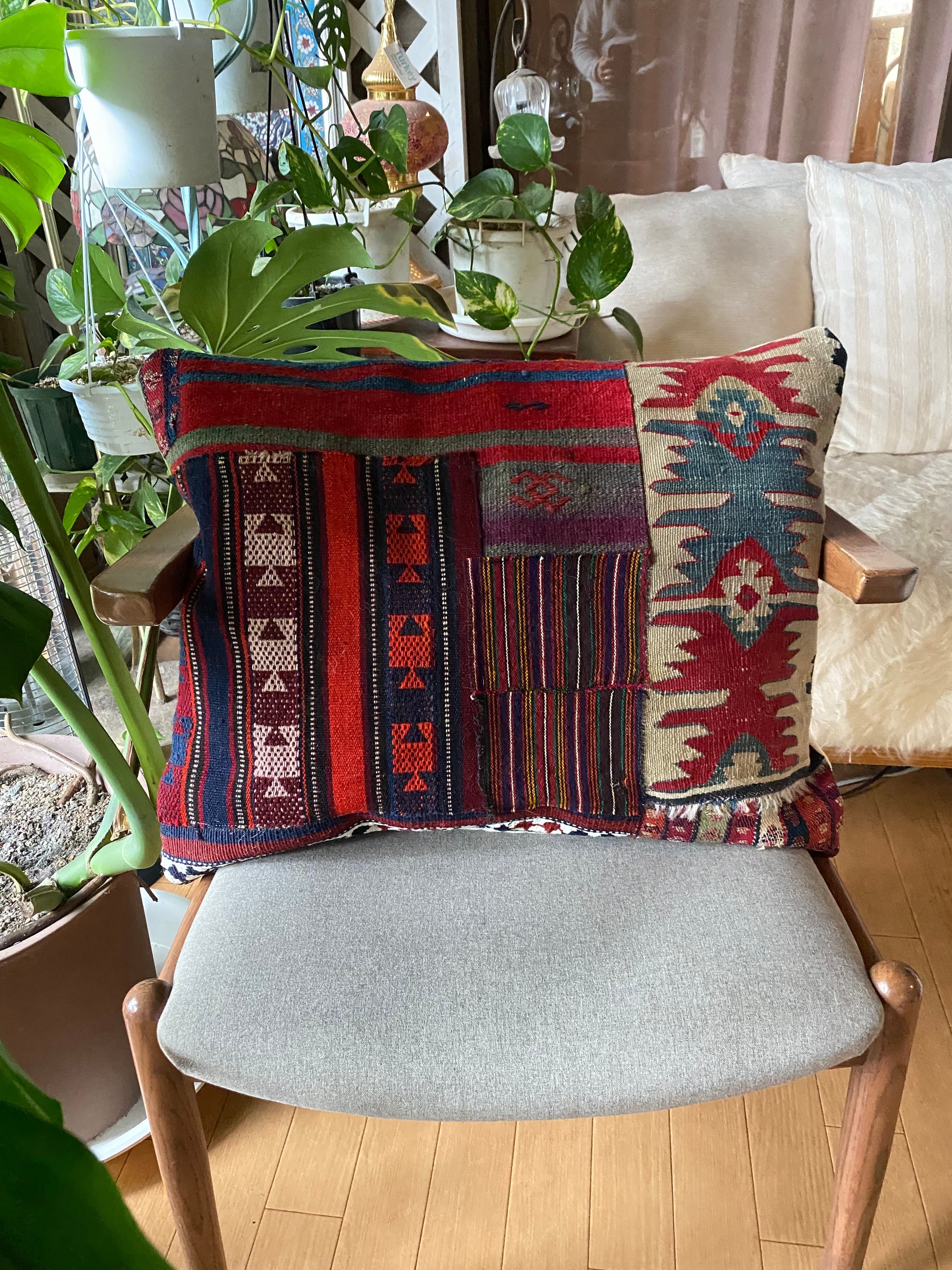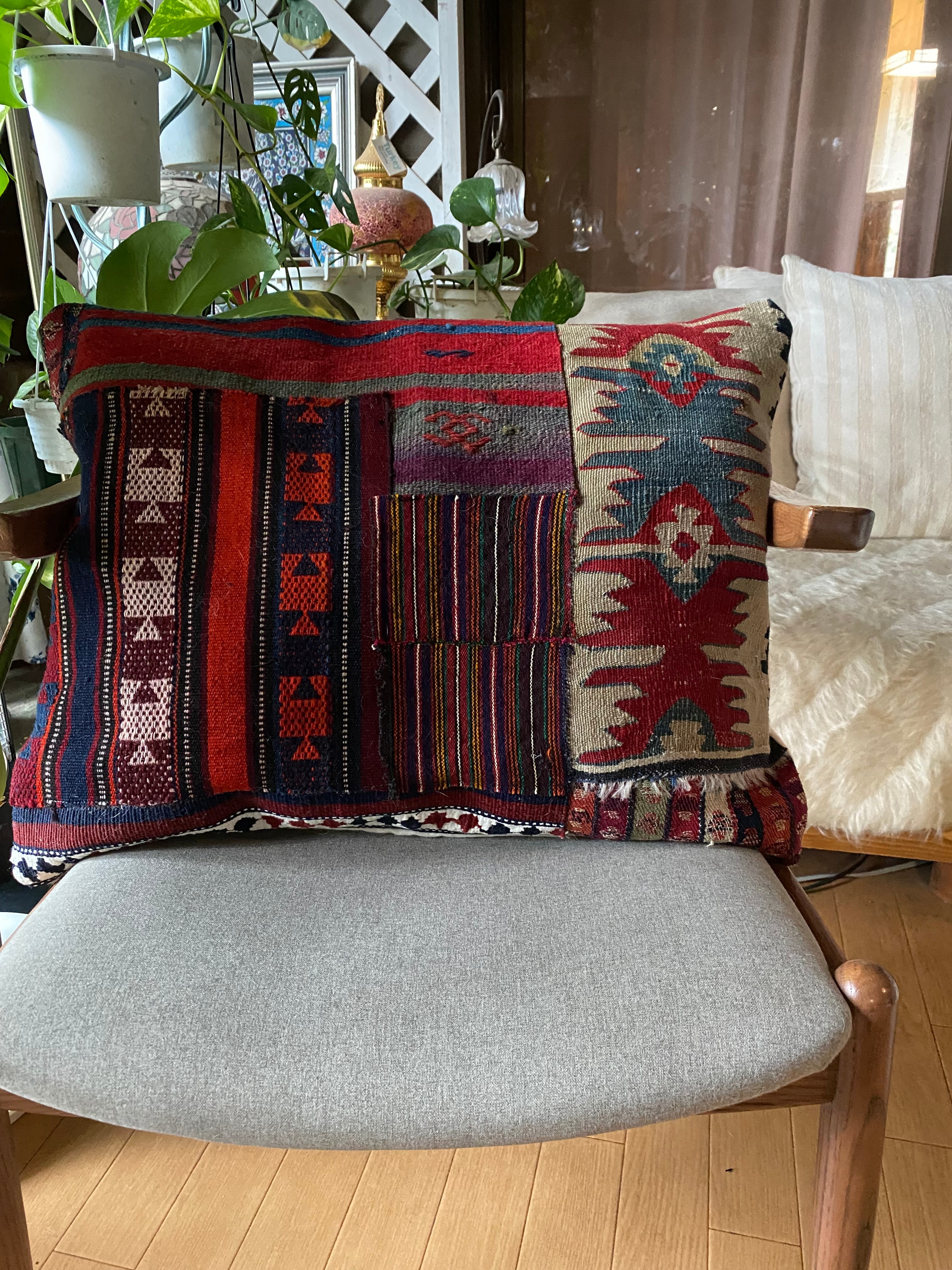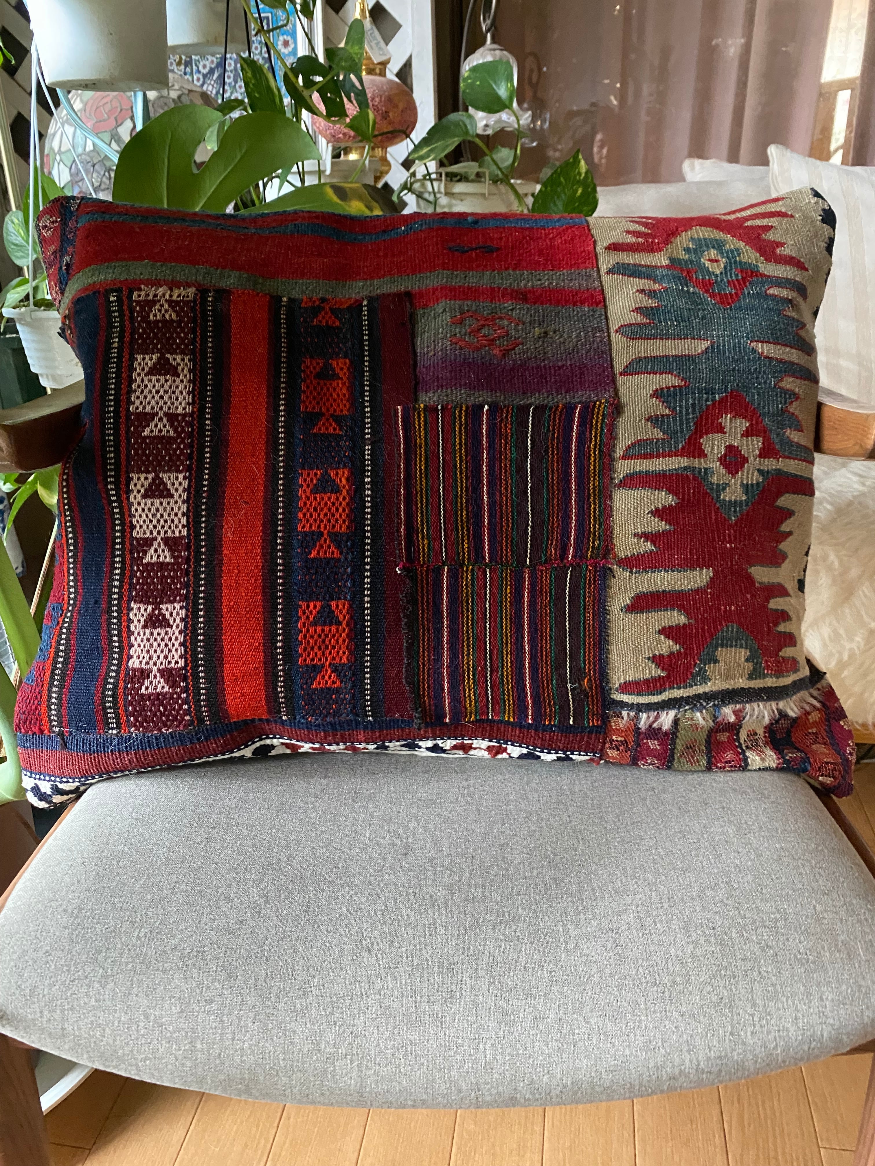 総草木染のアンティークのキリムのみを用いて作った 当店オリジナルの大判のクッションカバーです。画像でご覧いただけるように 色々な産地のキリムでパッチワークにして作っています。
