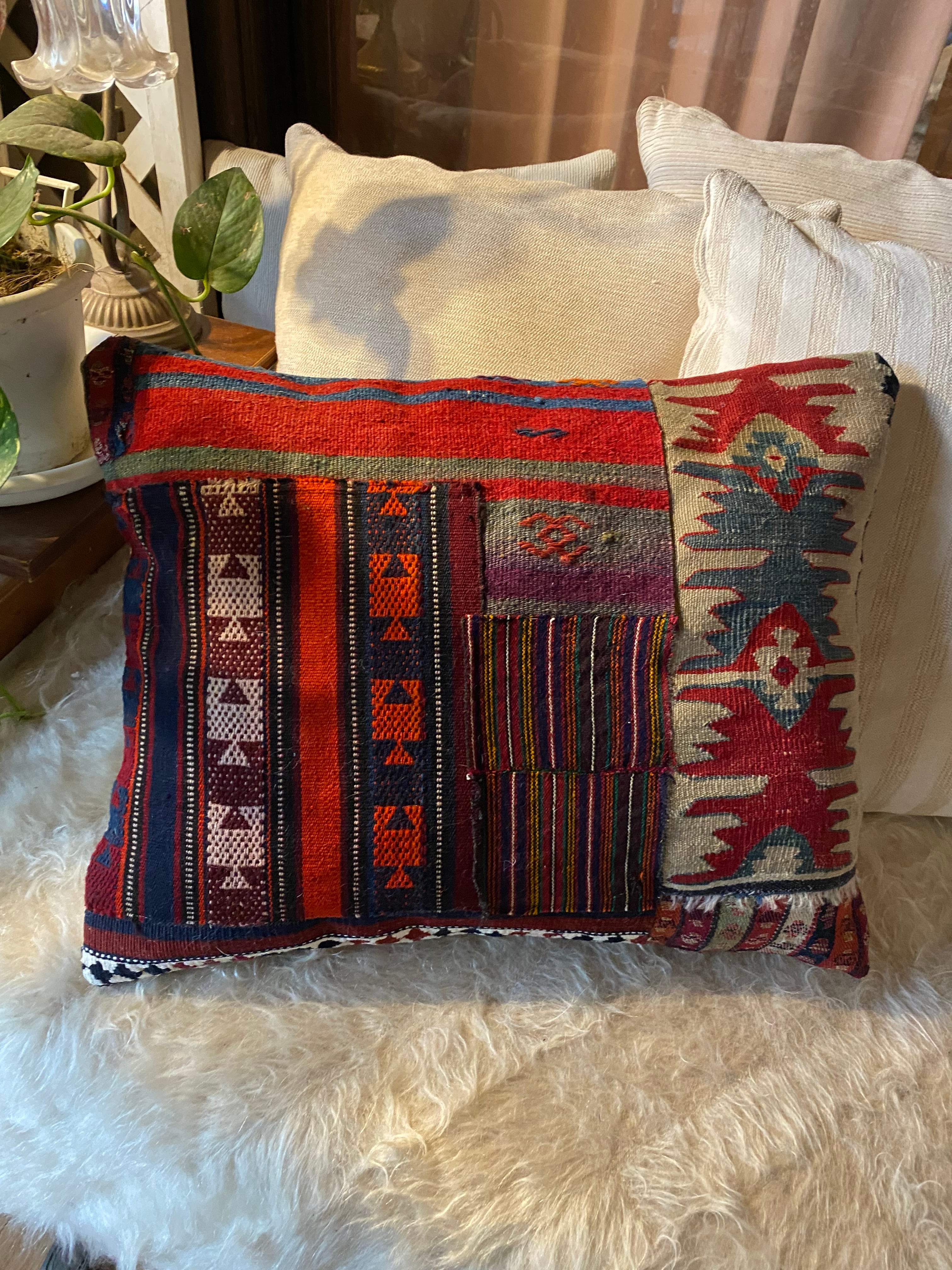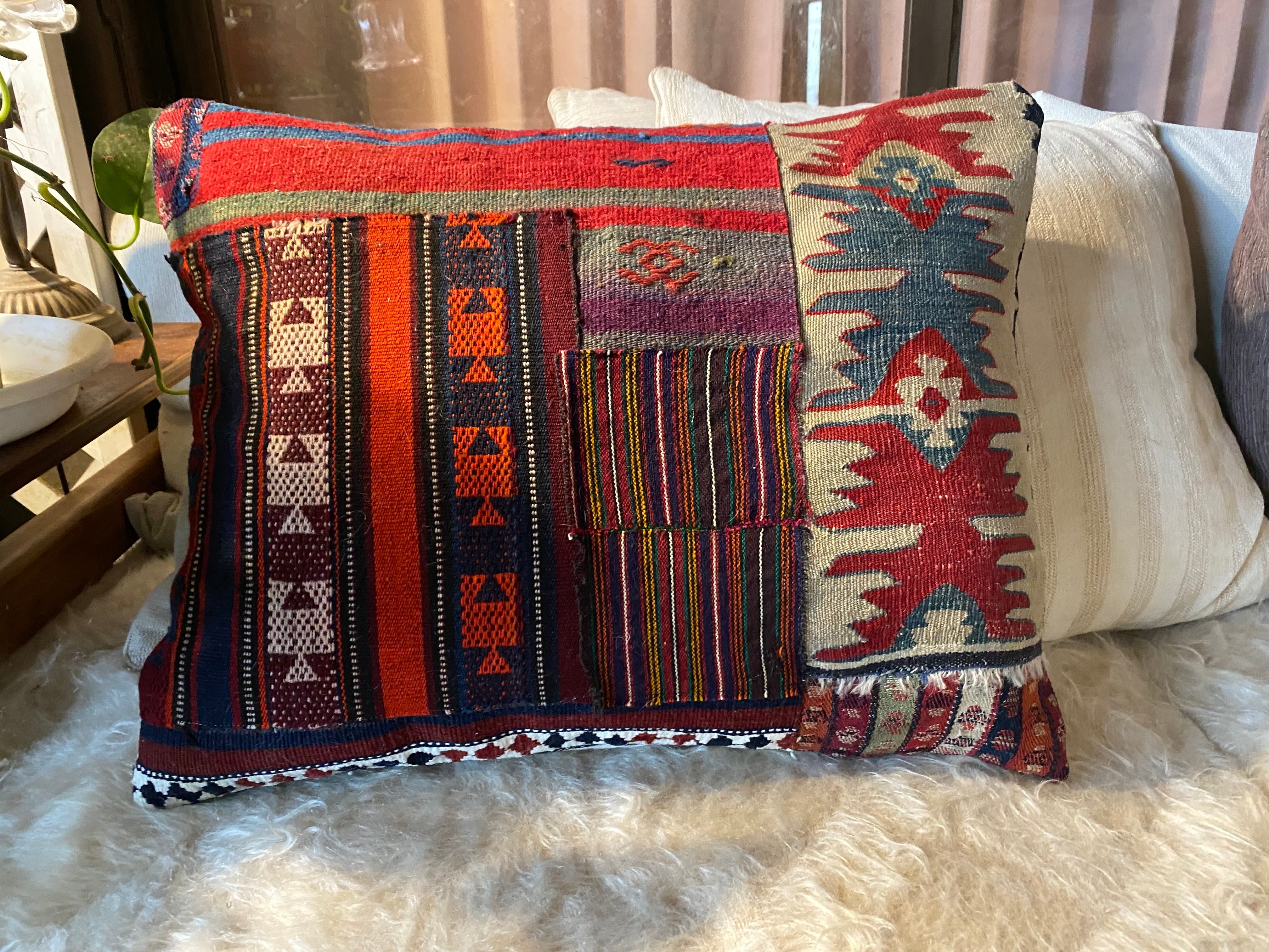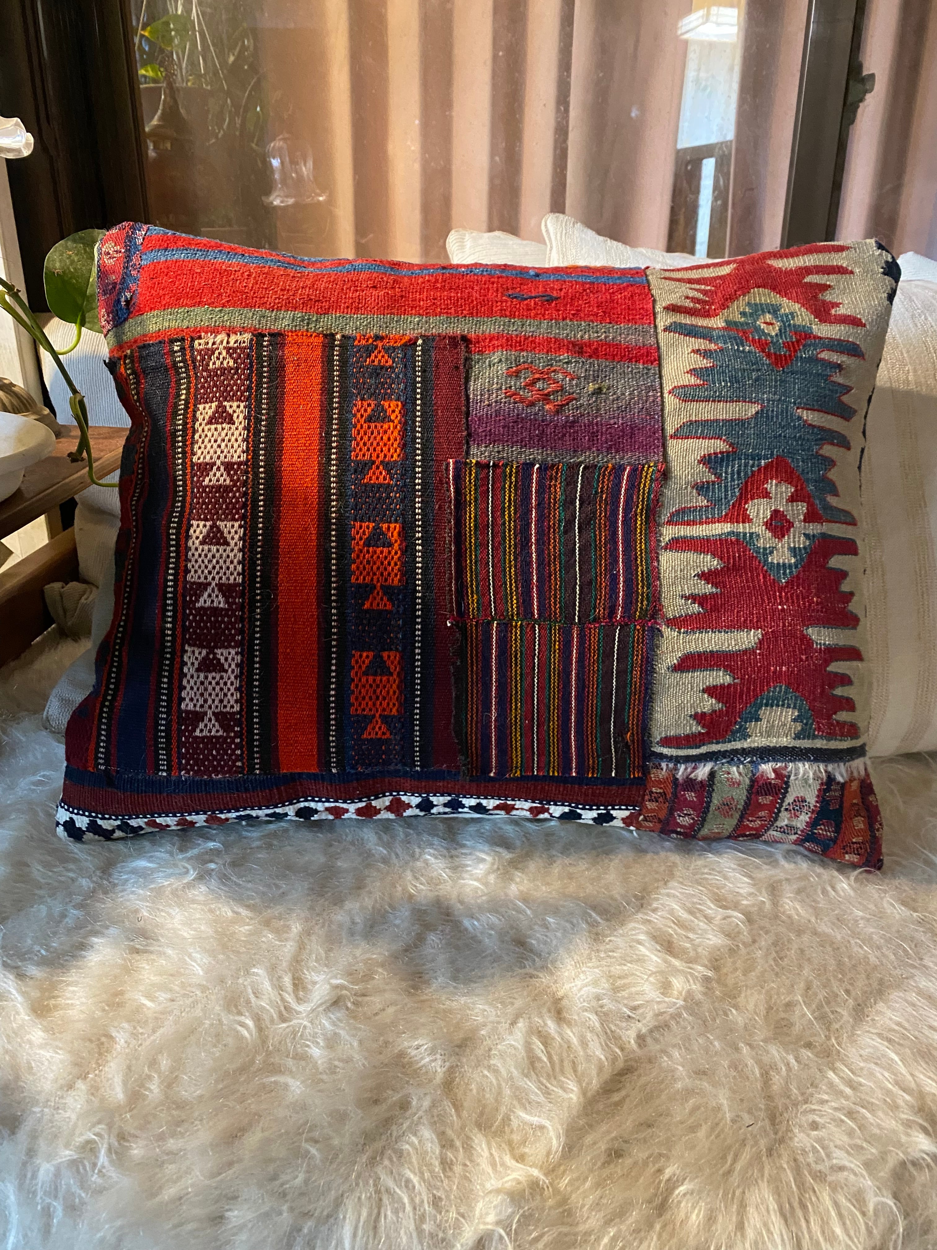 総草木染のアンティークのキリムのみを用いて作った 当店オリジナルの大判のクッションカバーです。画像でご覧いただけるように 色々な産地のキリムでパッチワークにして作っています。