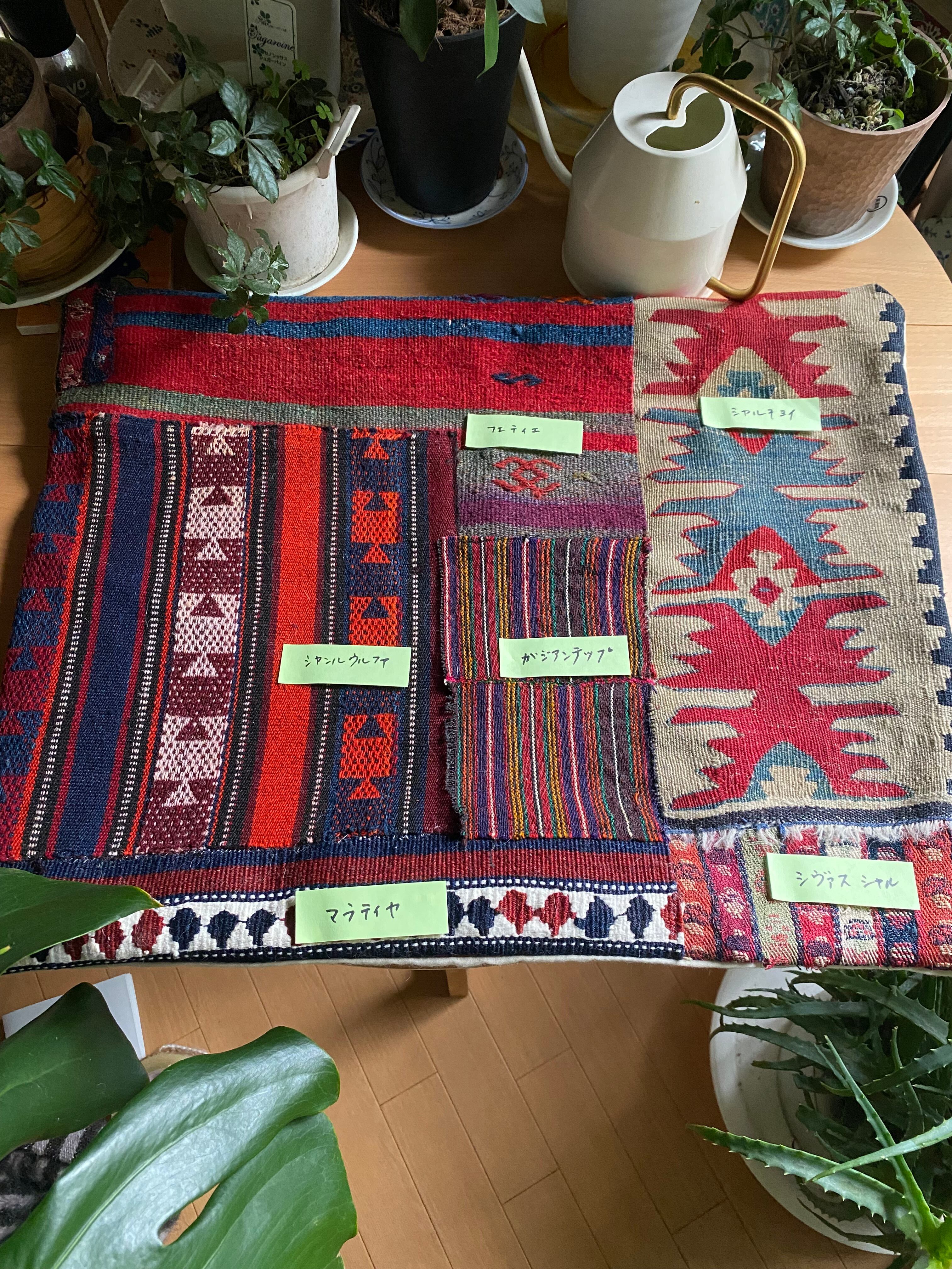 ご覧いただけますように、シャルキョイ、マラティヤ、フェティエ、ガジアンテップ、シャンルウルファ、シヴァスのシャル、など 沢山の総草木染のキリムで作っています。