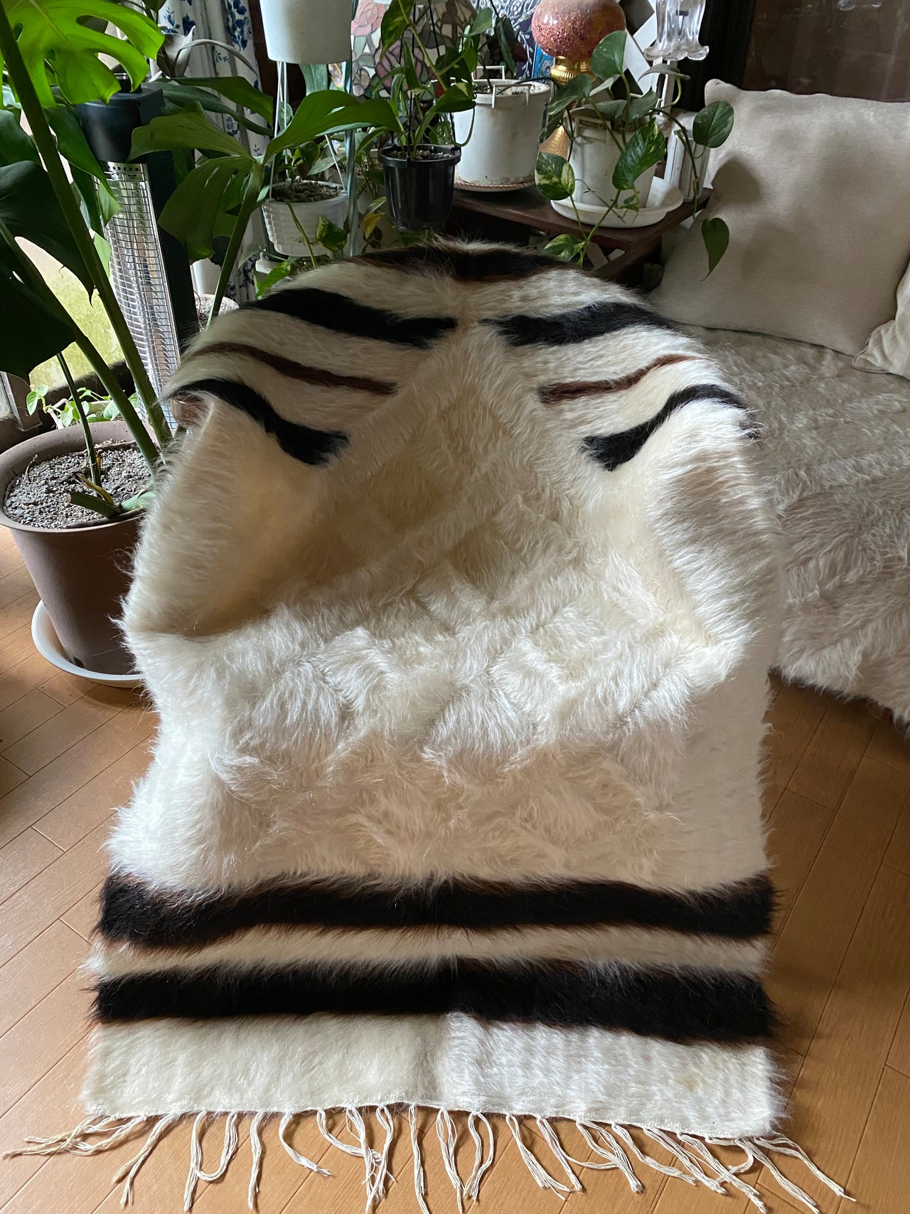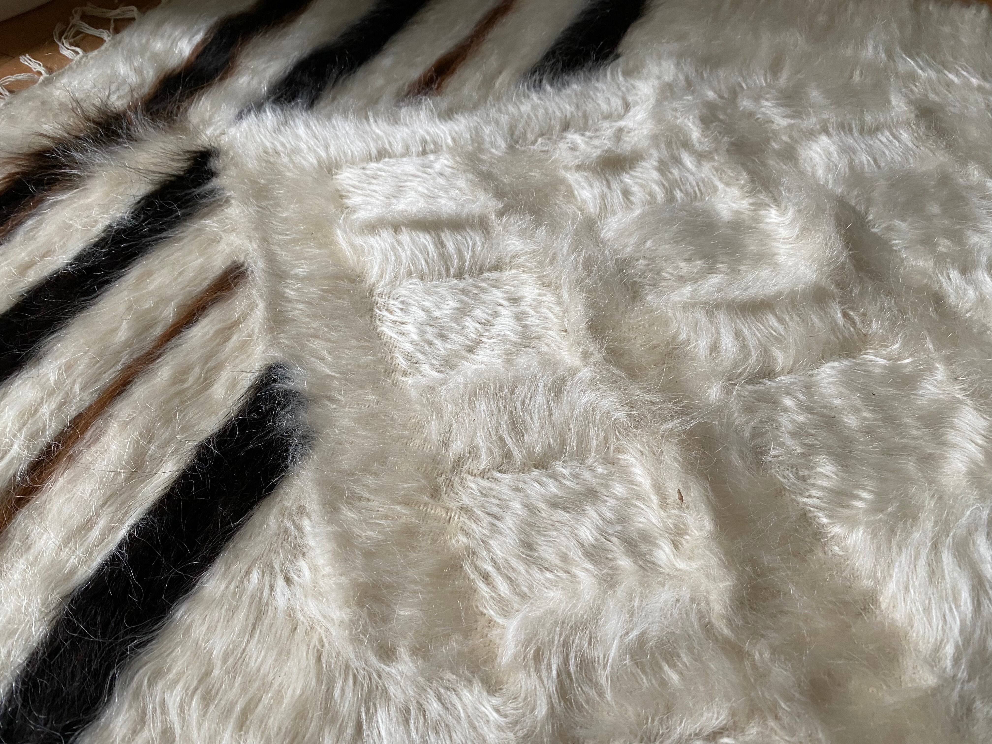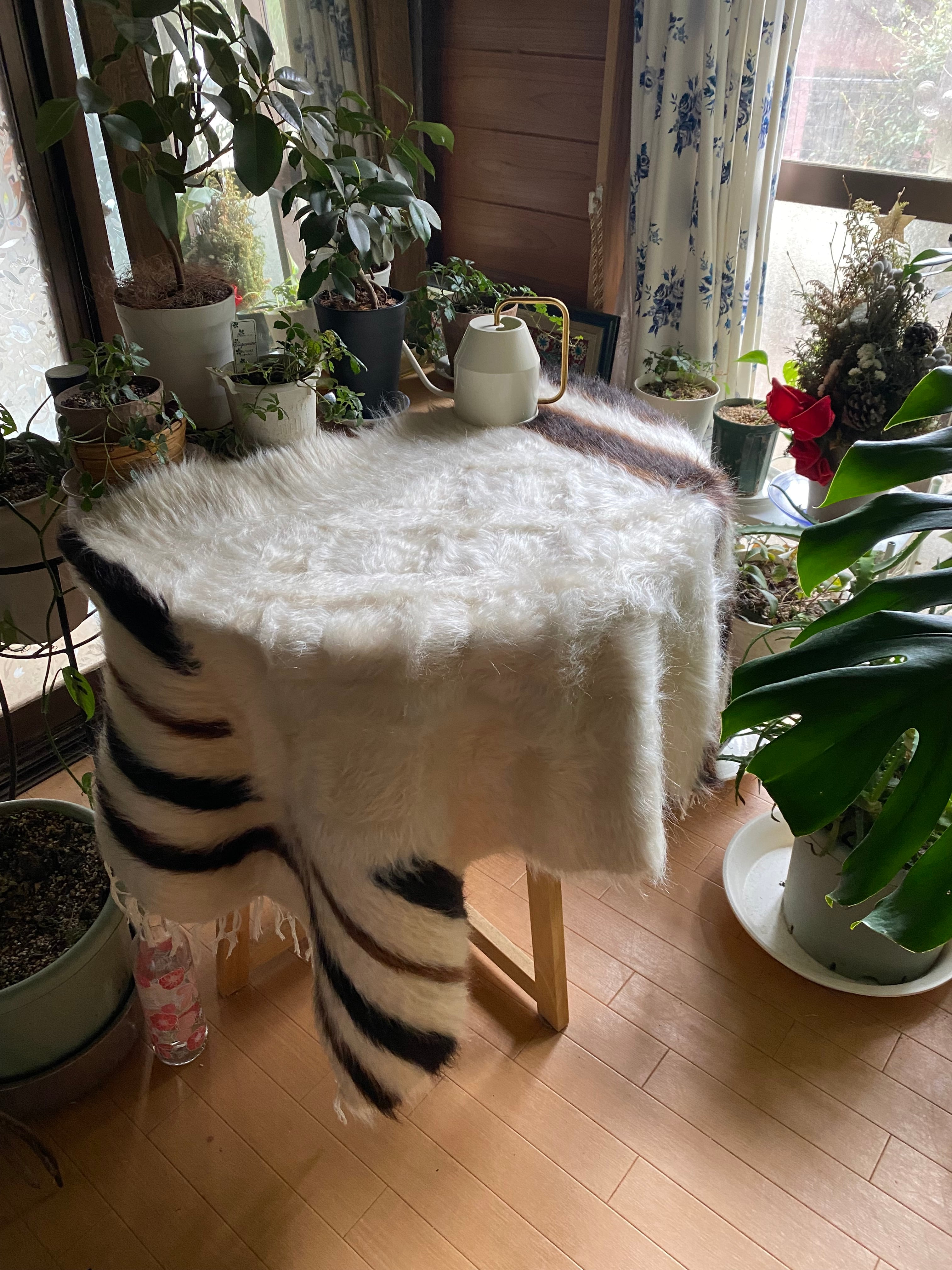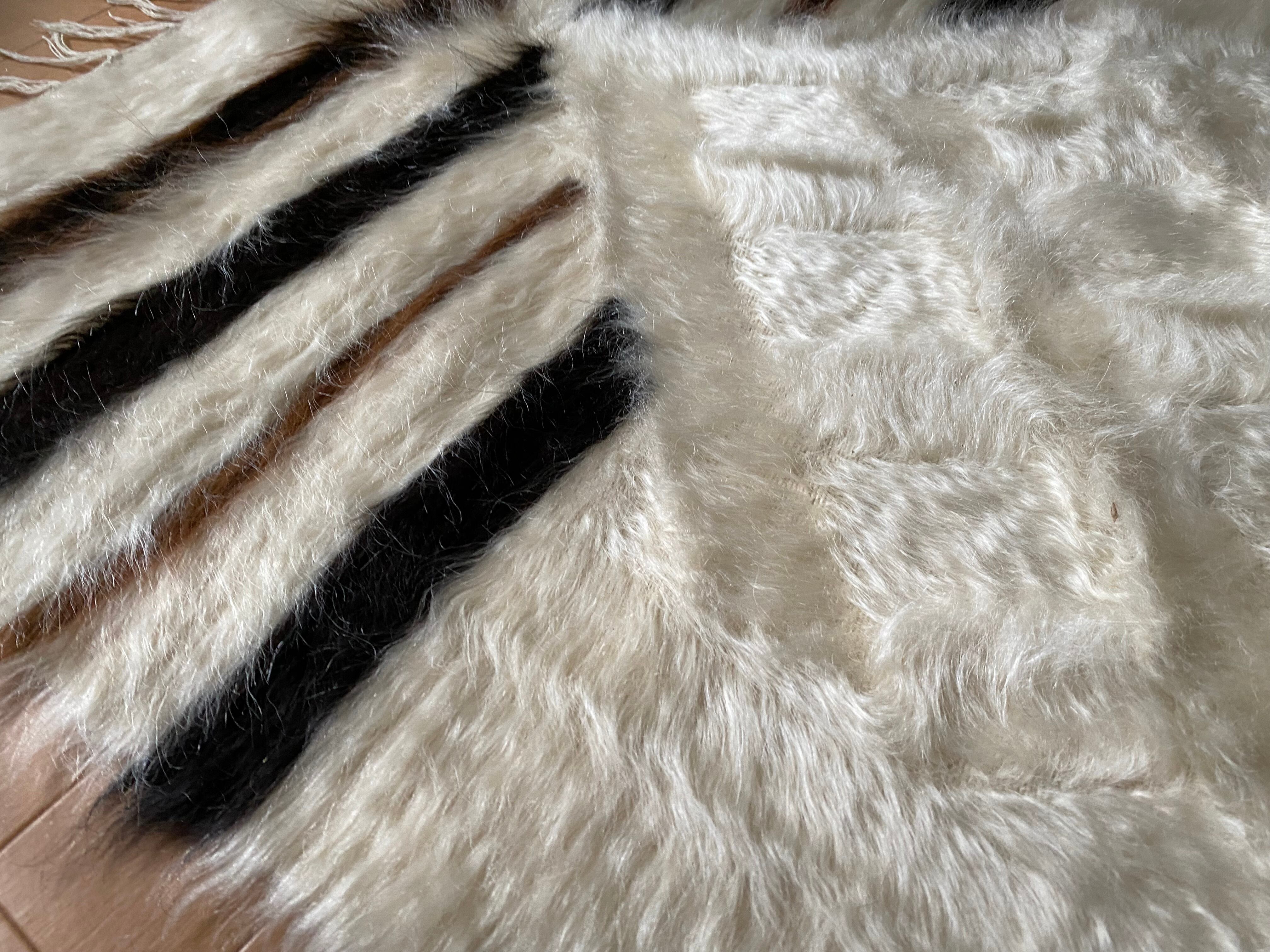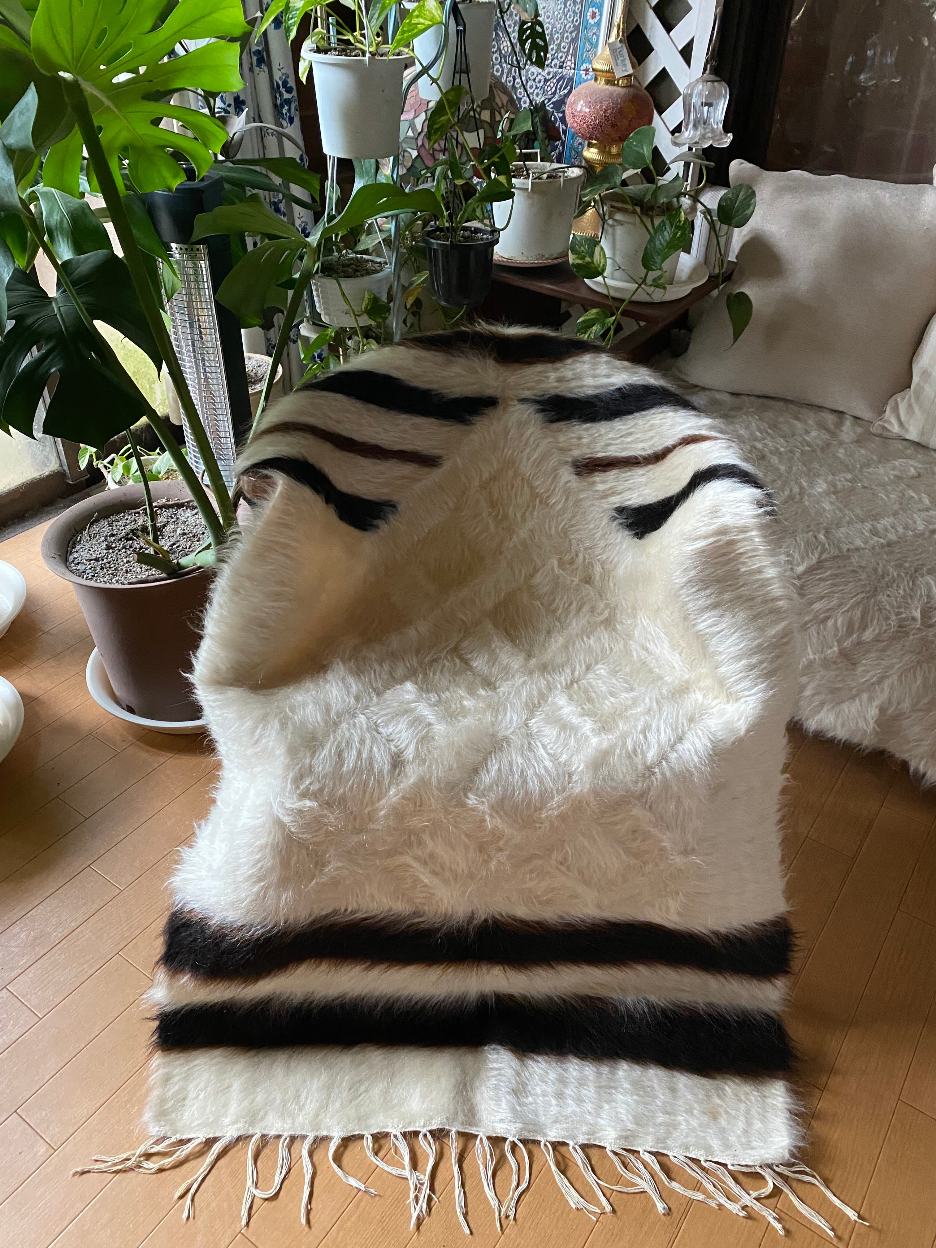 特にアンゴラ山羊からのモヘヤを使って織られているこのシイルトは大変価値も高いもので、艶もあり、素晴らしく温かいです。 自然のアンゴラヤギの毛で織られていますので、独特のくるくるとした感じも可愛く、とてもナチュ ラルな感じです。アンゴラ山羊は18世紀の中ごろまでオスマントルコが飼育を独占していたらしいです。