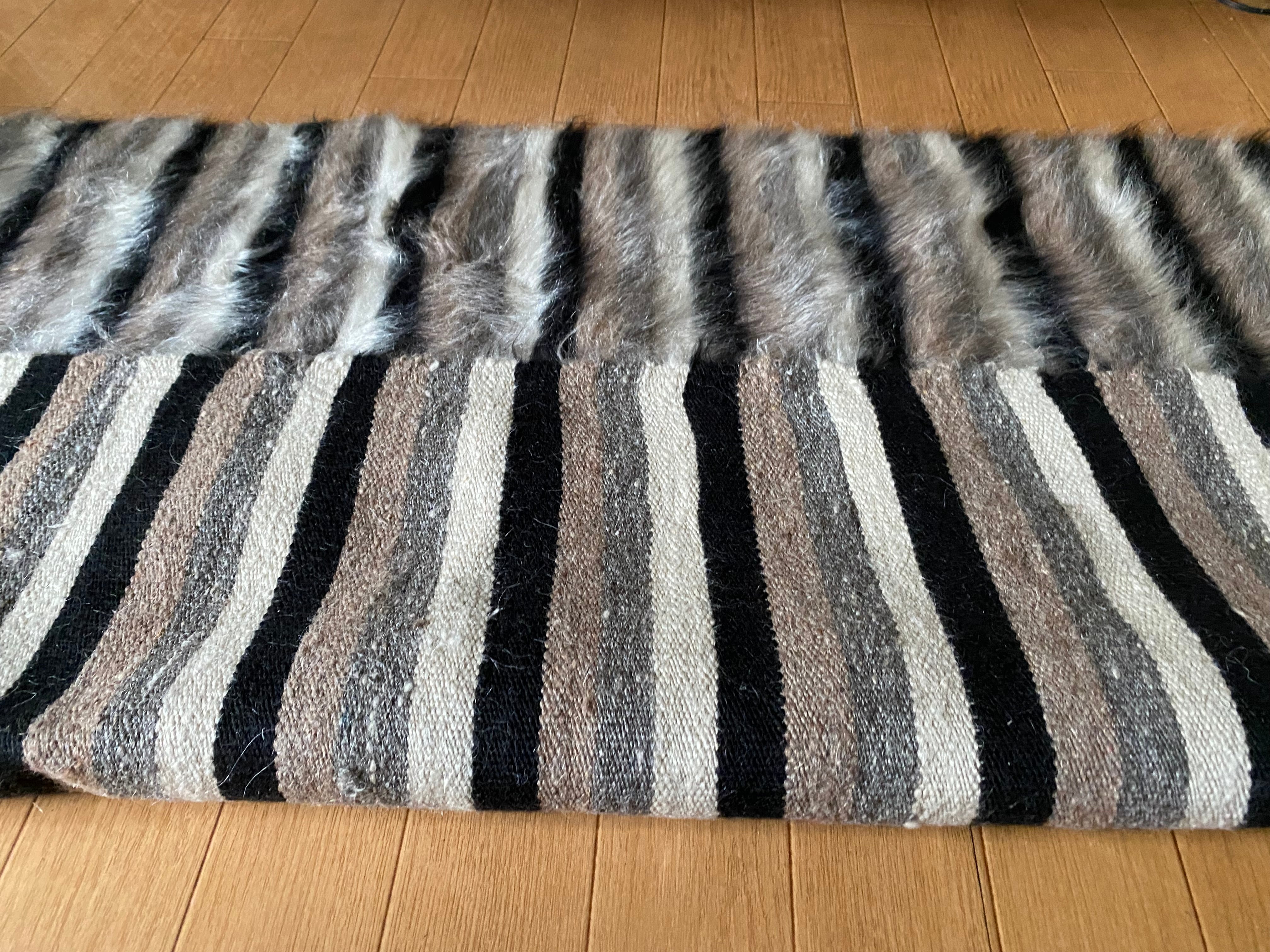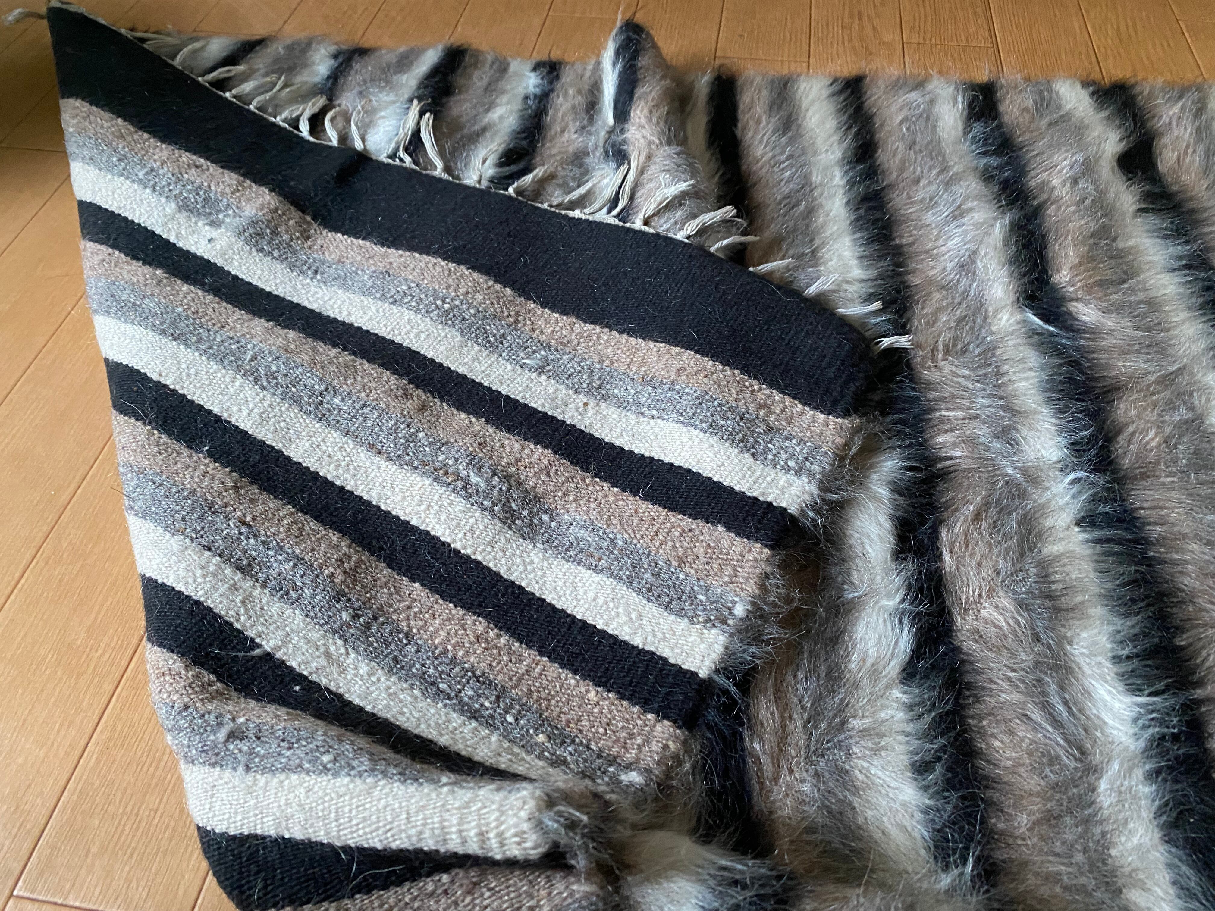 また、毛をけば立てて幾何学模様が入っておりますが、ウールではこのような毛羽立ちの模様はできないそうです。山羊ならではの模様をお楽しみください。 裏面でお使いいただければ、普通のキリムとして も使えます。