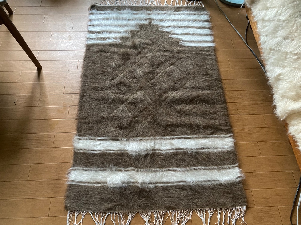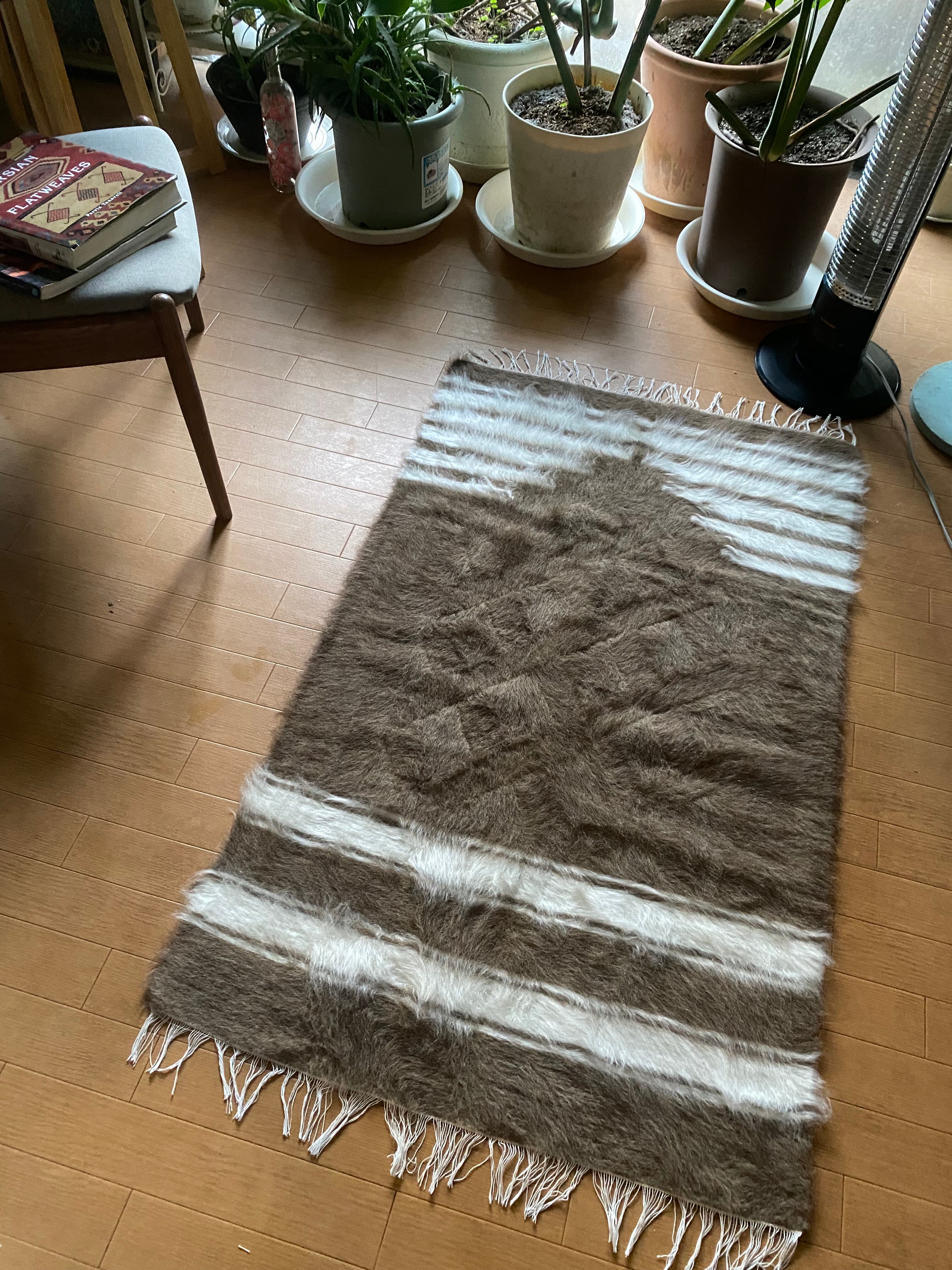 山羊ならではの模様をお楽しみください。 片面だけ毛が出ていて裏は毛がとってあるのだとおもいますので、裏面でお使いいただければ、普通のキリムとして も使えます。 冬は毛がある面で、夏は裏面でキリムとしてお使いいただける優れものです。 また毛のある表は毛をけばだたせて、模様も作っていますのでとてもおしゃれ度が高いです。 新品未使用品です。