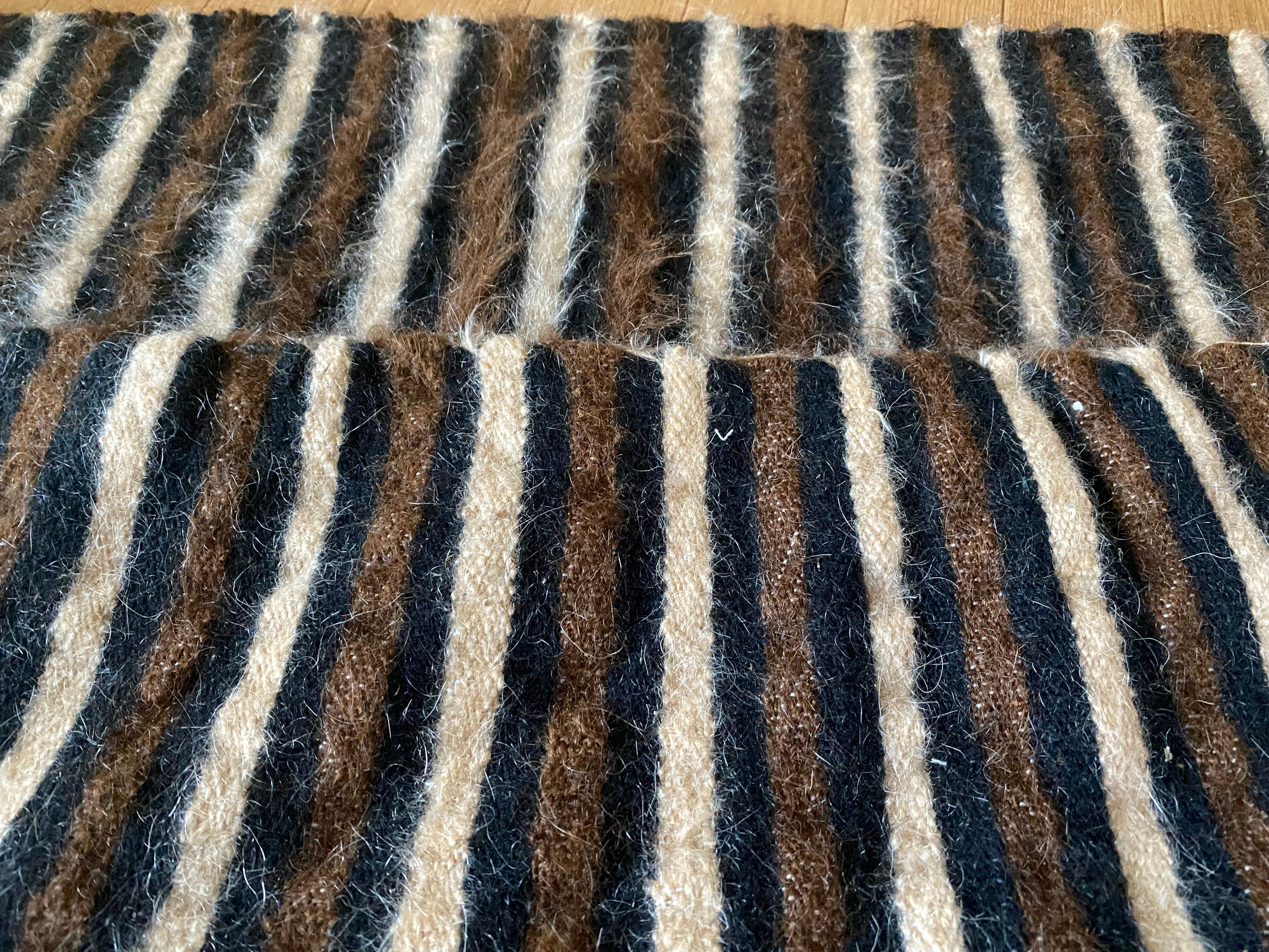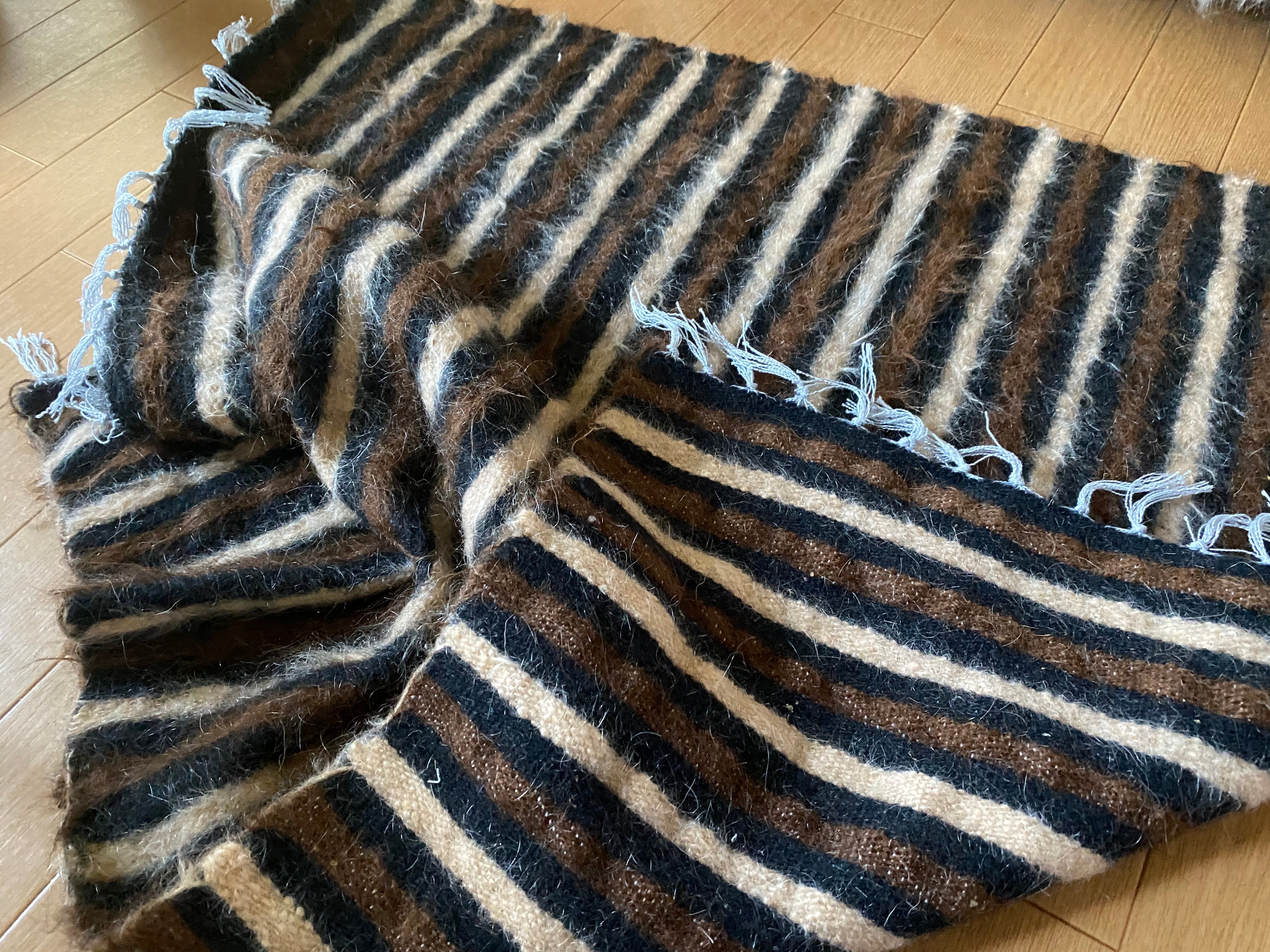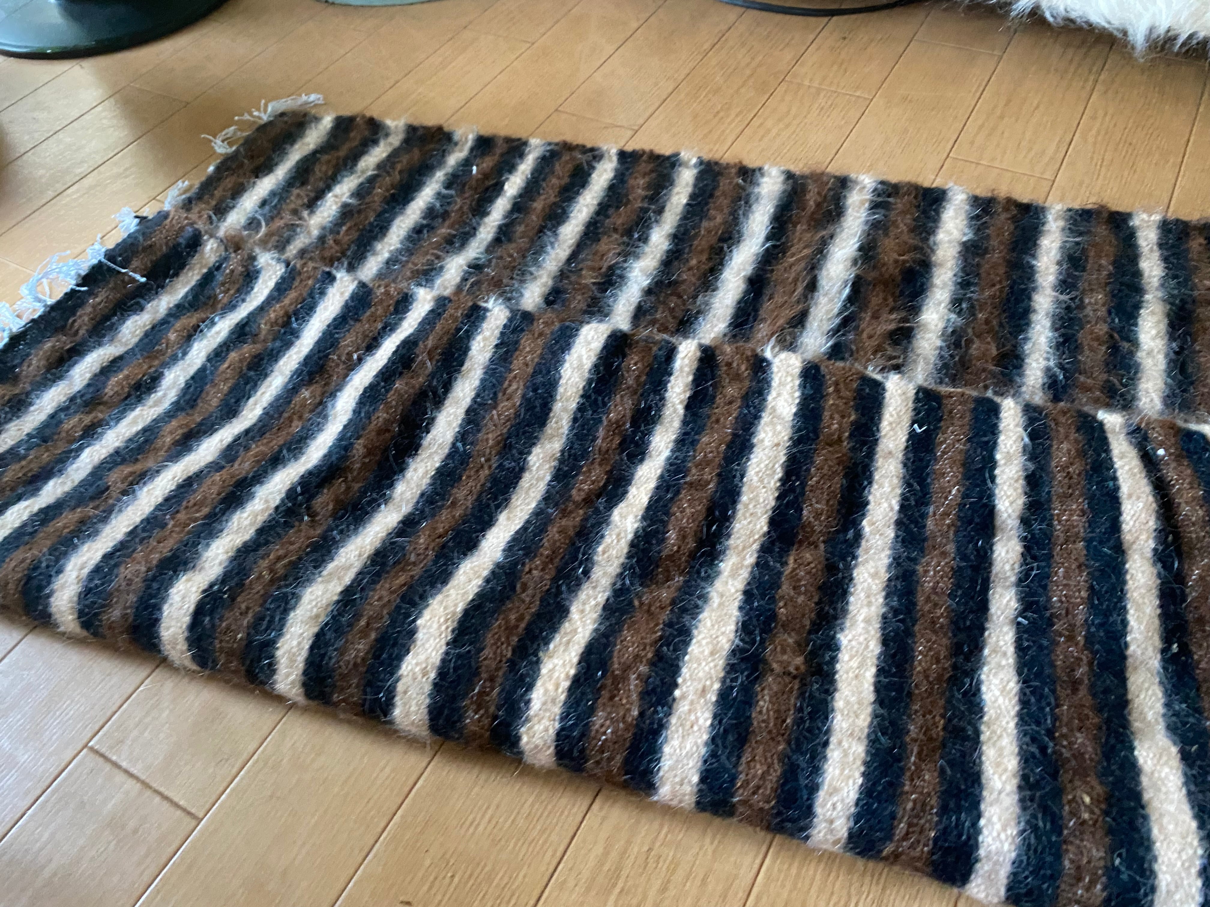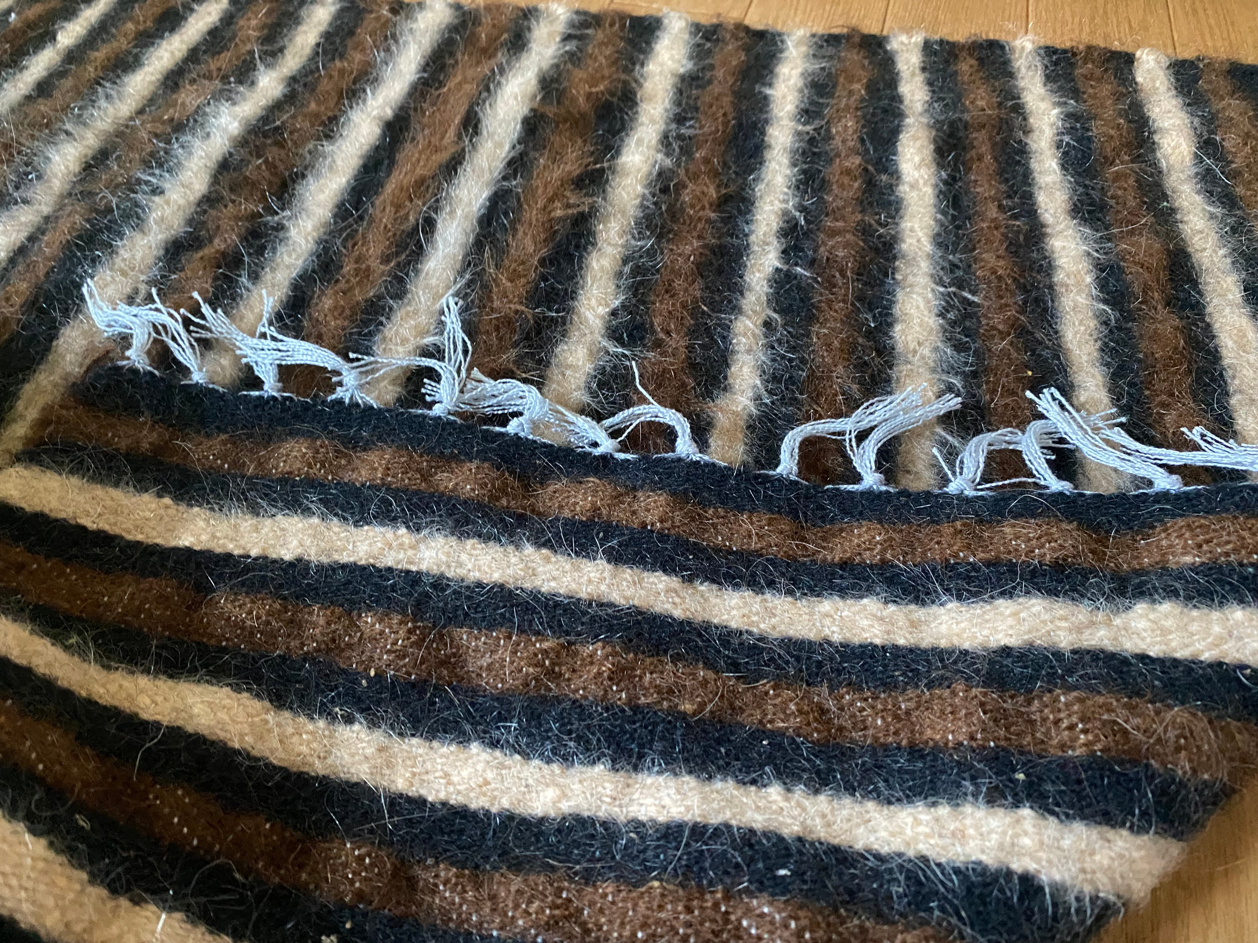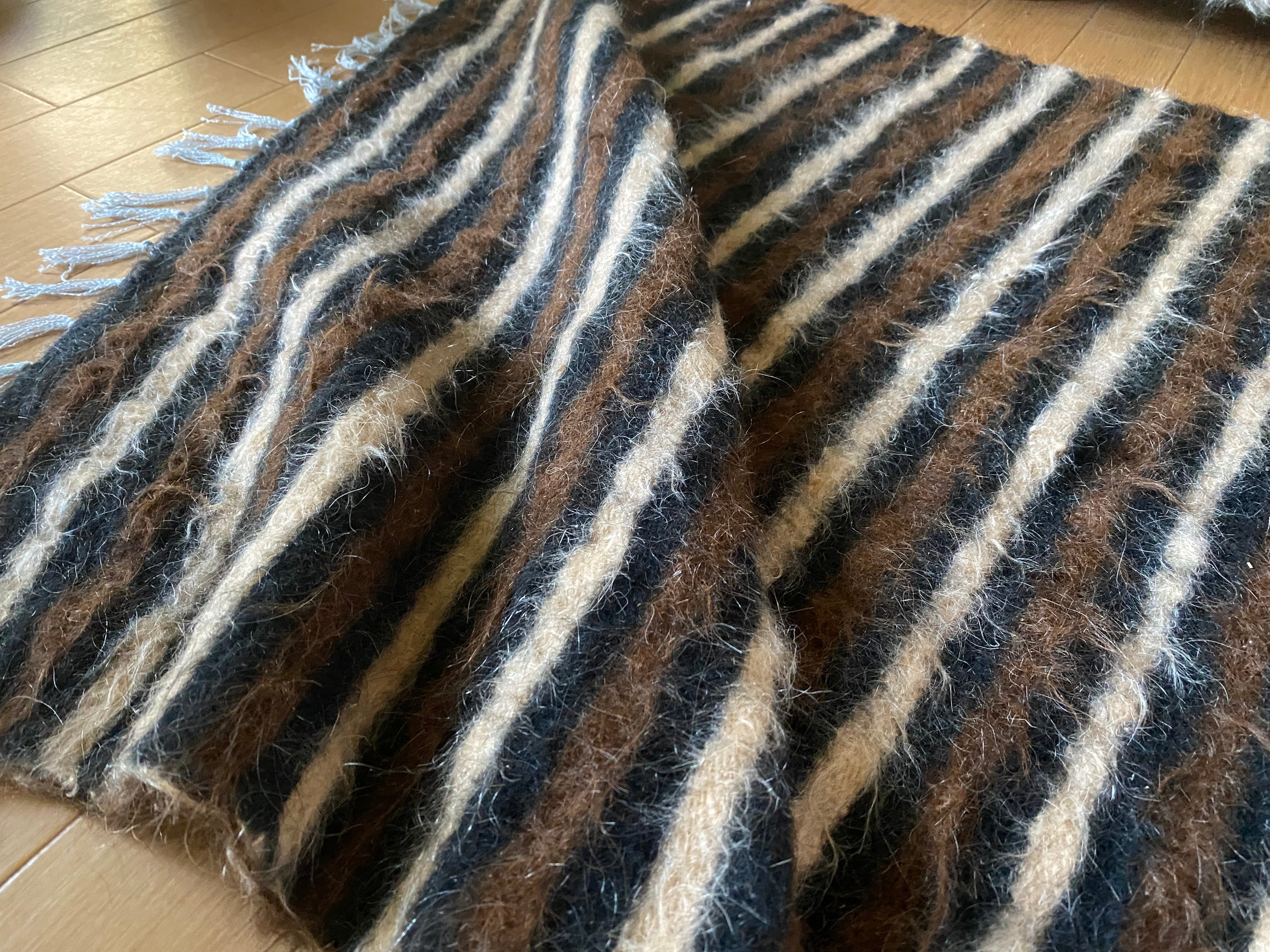 1点のみ極上の古い時代のアンゴラヤギモヘア100使用3色のボーダーのシイルトバッタニイェ!密な織でフェルトのような厚みで素晴らしい!ラグだけではなく、膝掛けや椅子にさりげなくかけても!期間限定18800円→16800円!動物を傷つけない四季を通じて重宝な織物