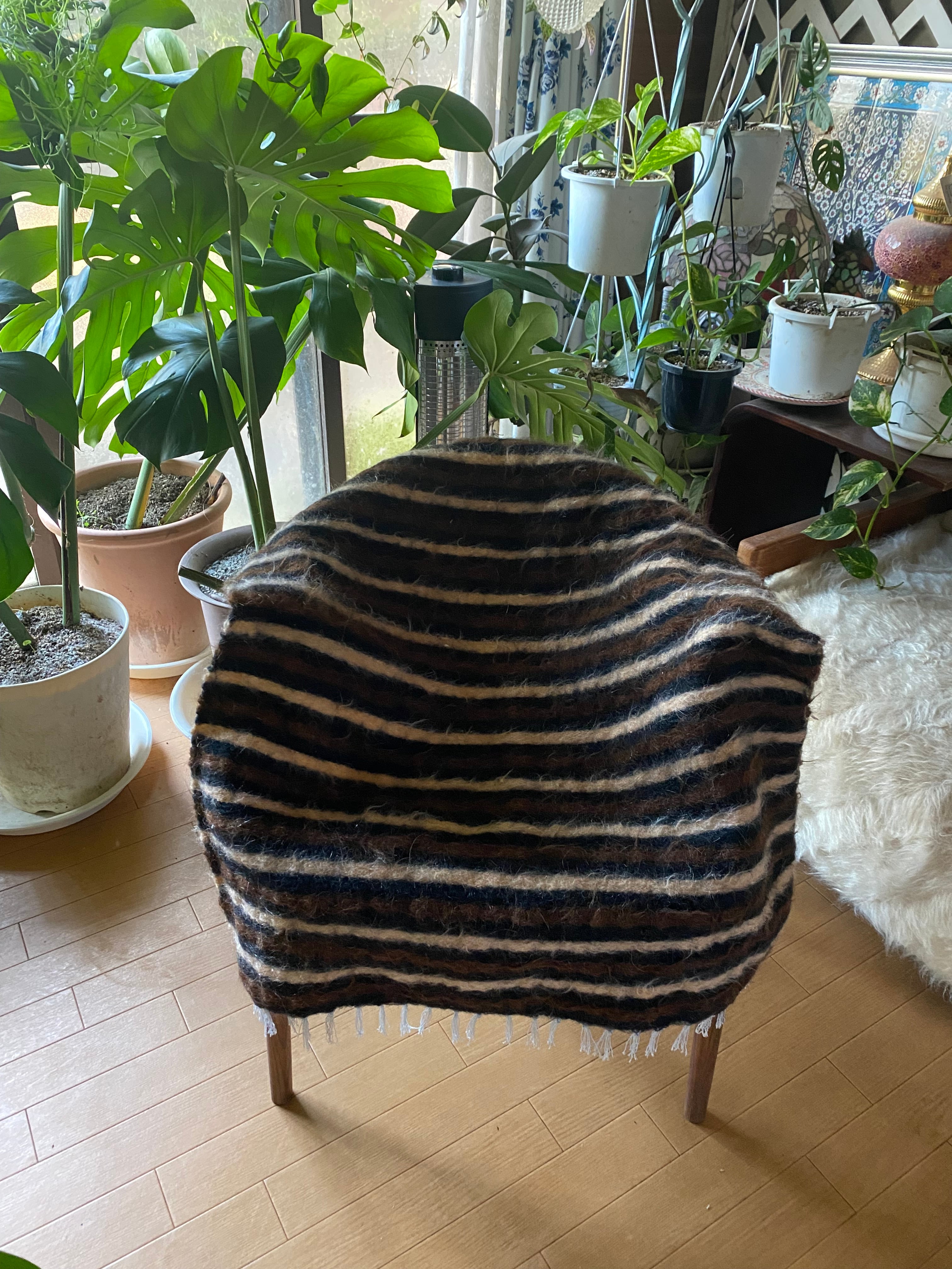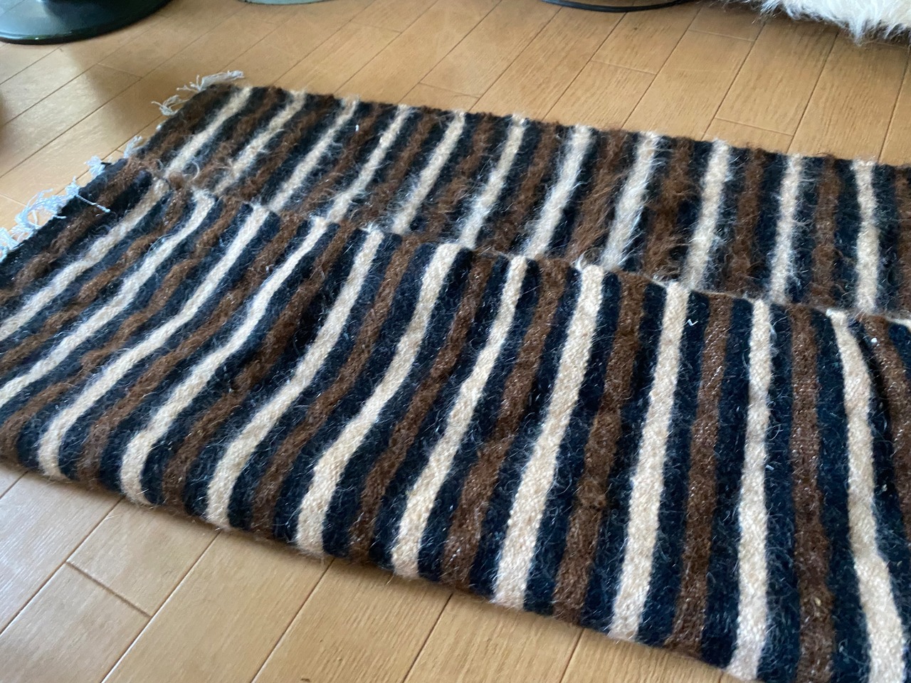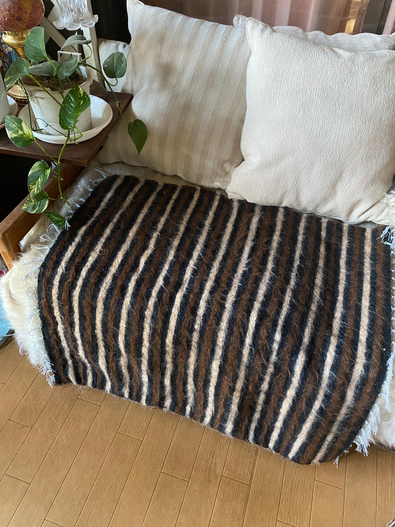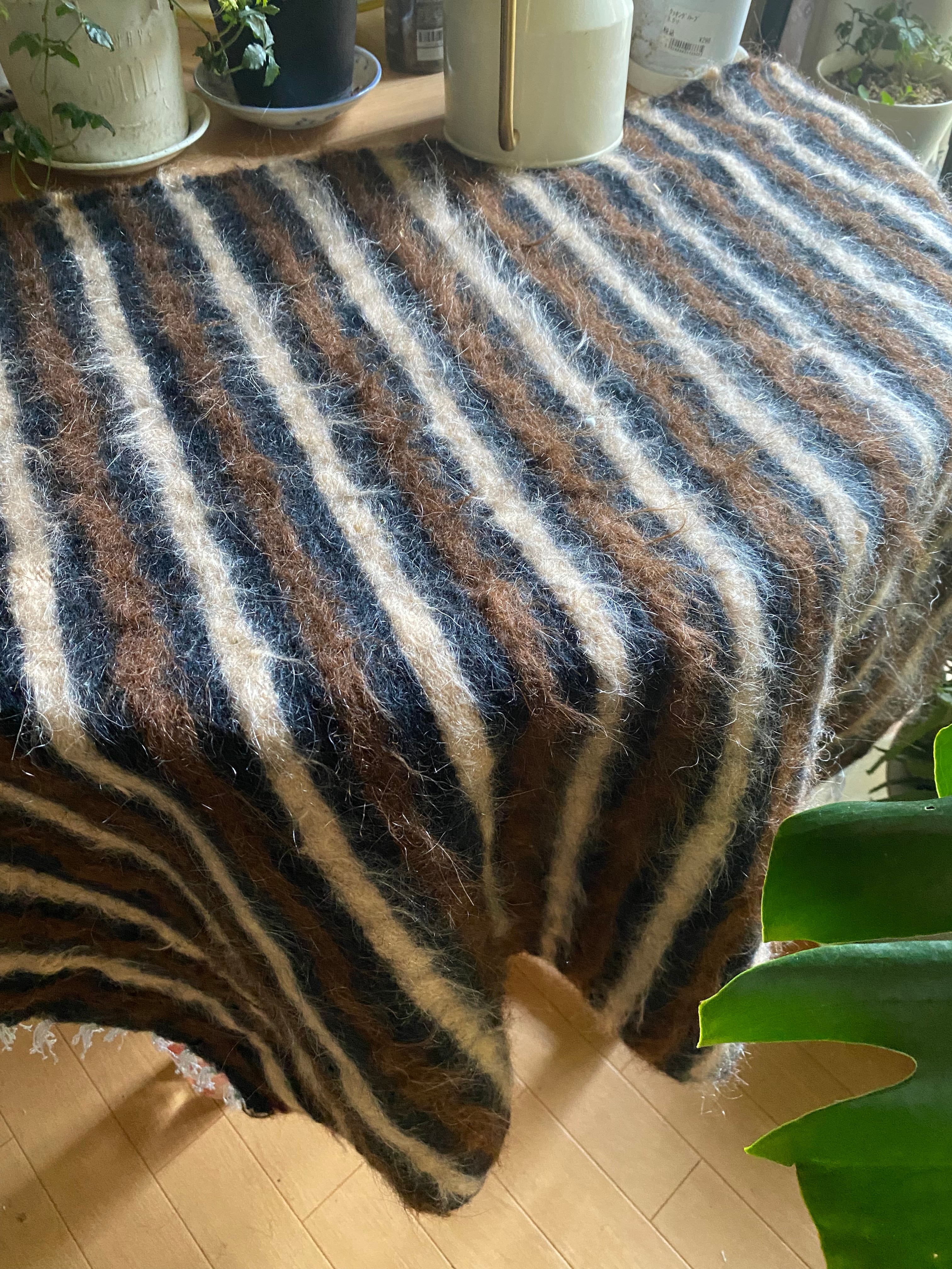 1点のみ極上の古い時代のアンゴラヤギモヘア100使用3色のボーダーのシイルトバッタニイェ!密な織でフェルトのような厚みで素晴らしい!ラグだけではなく、膝掛けや椅子にさりげなくかけても!期間限定18800円→16800円!動物を傷つけない四季を通じて重宝な織物