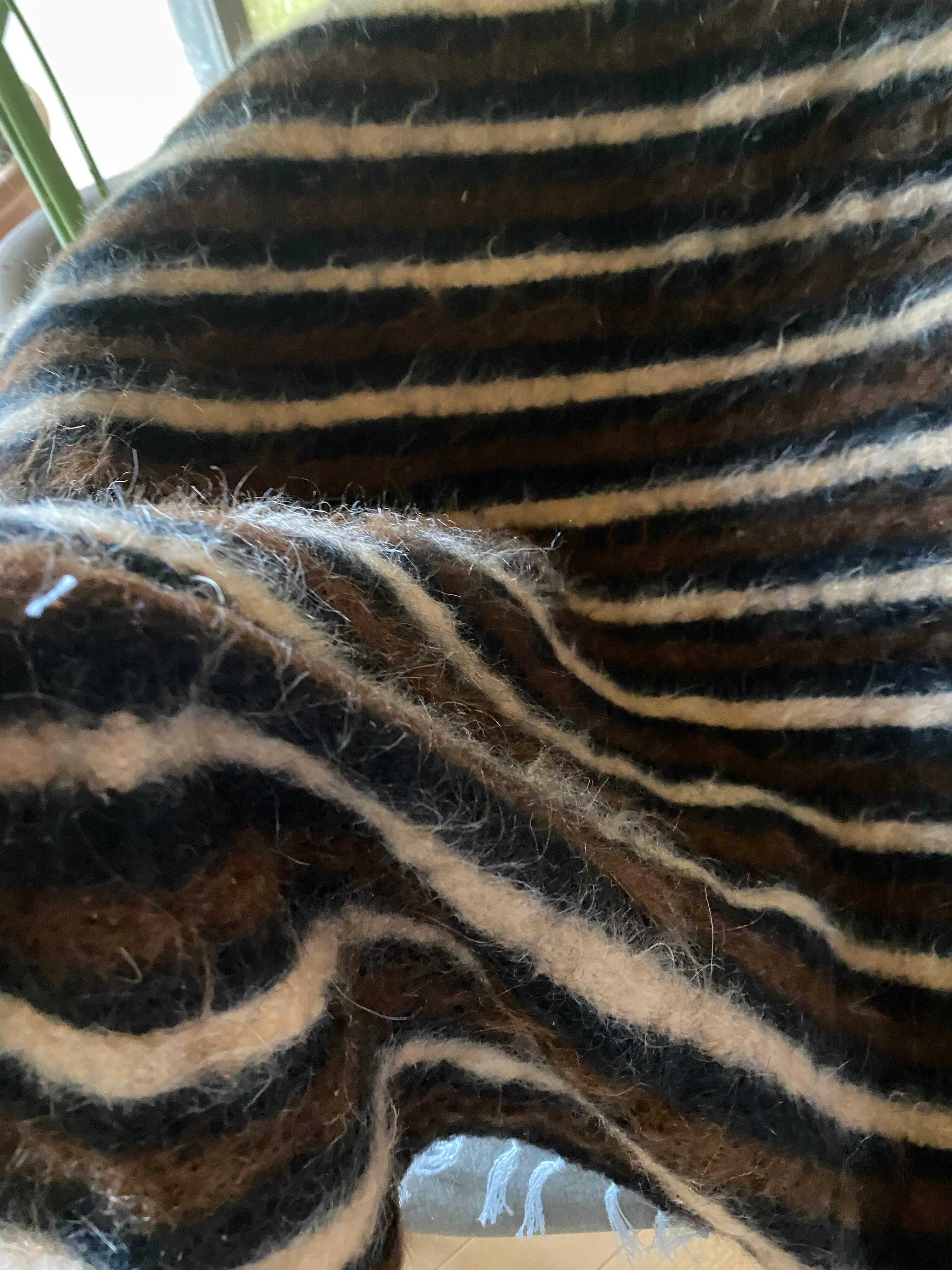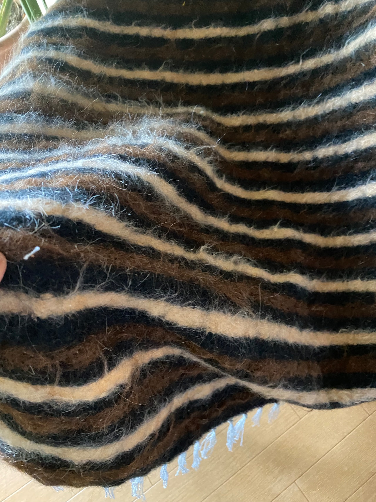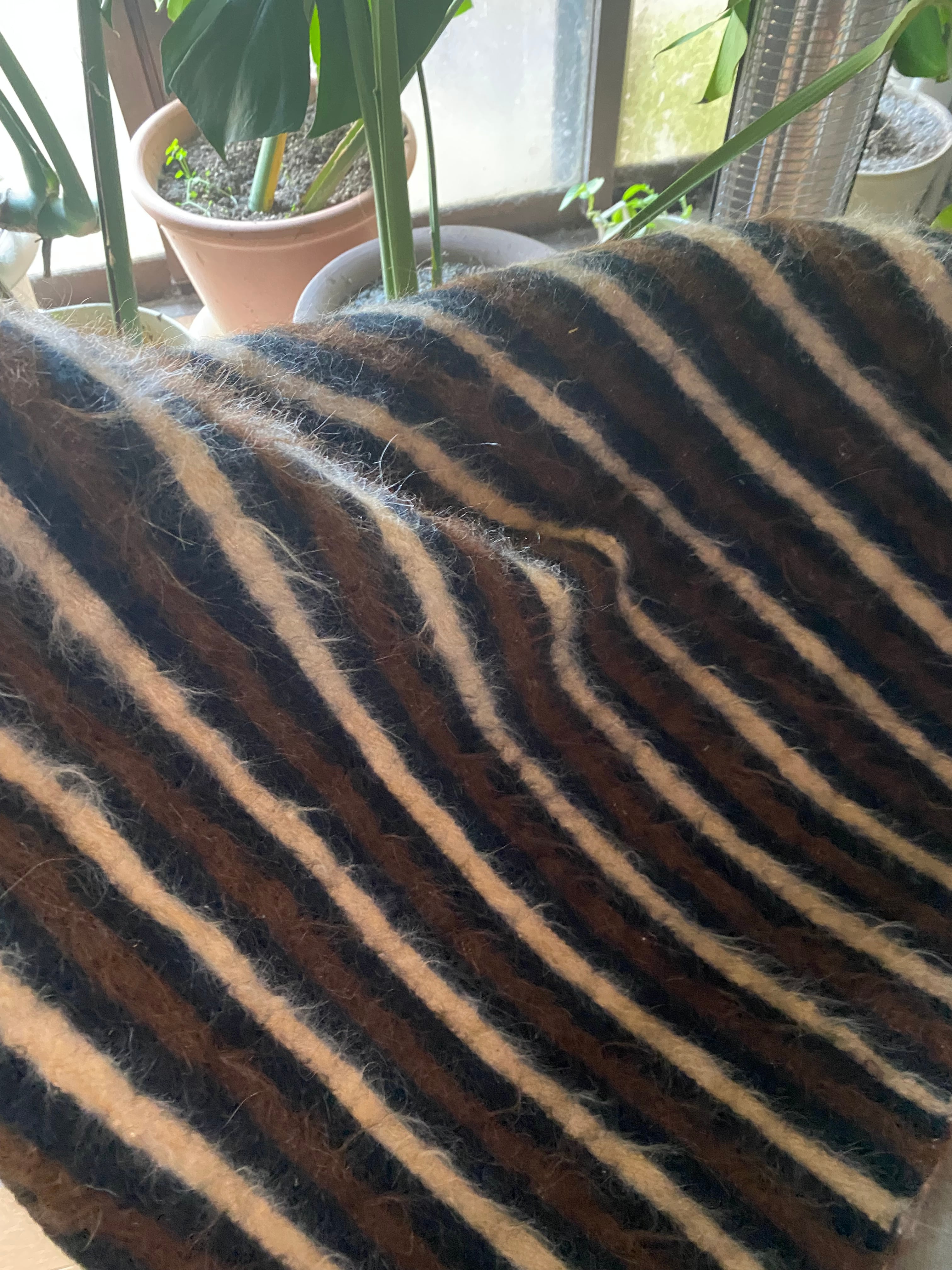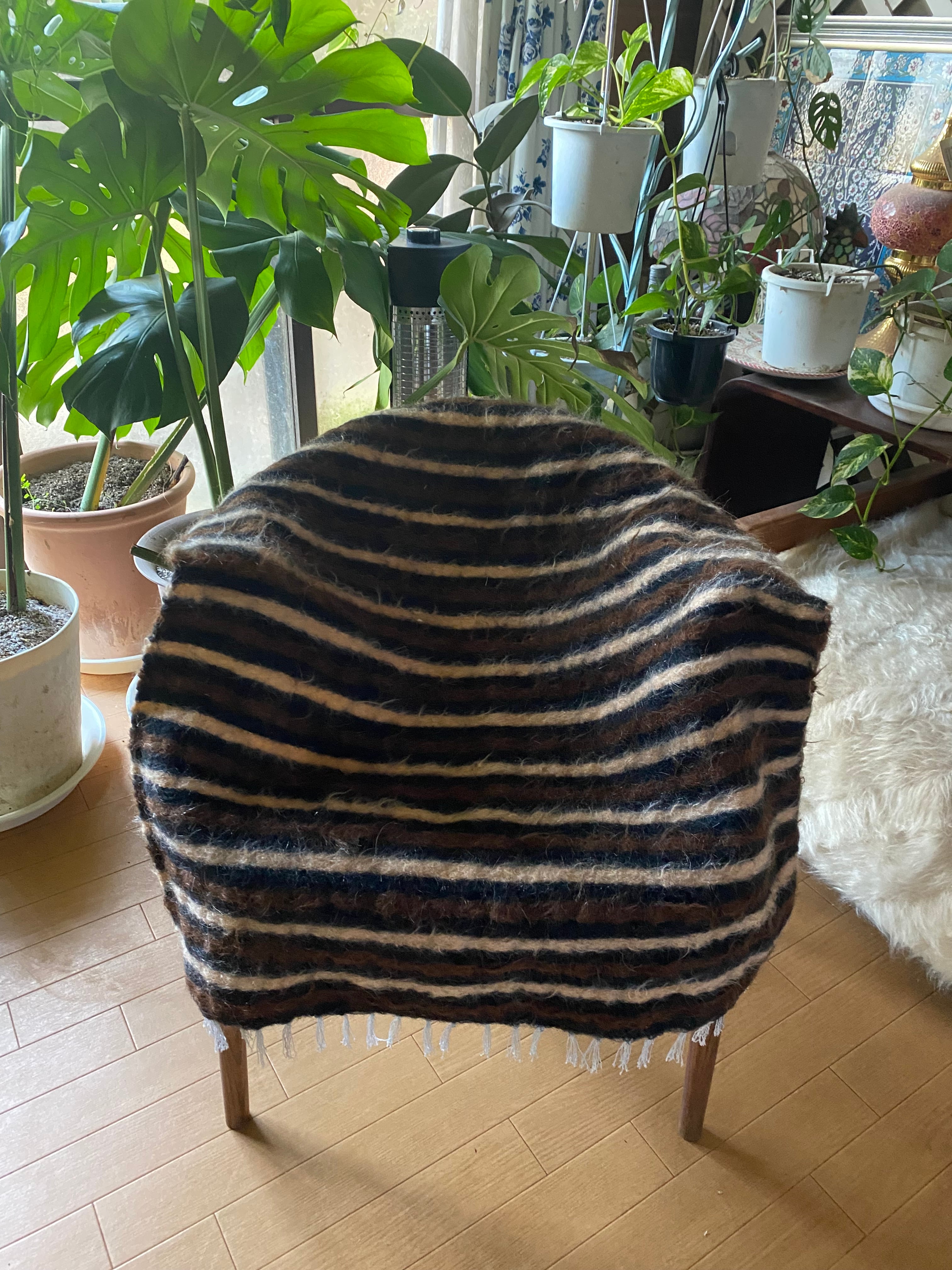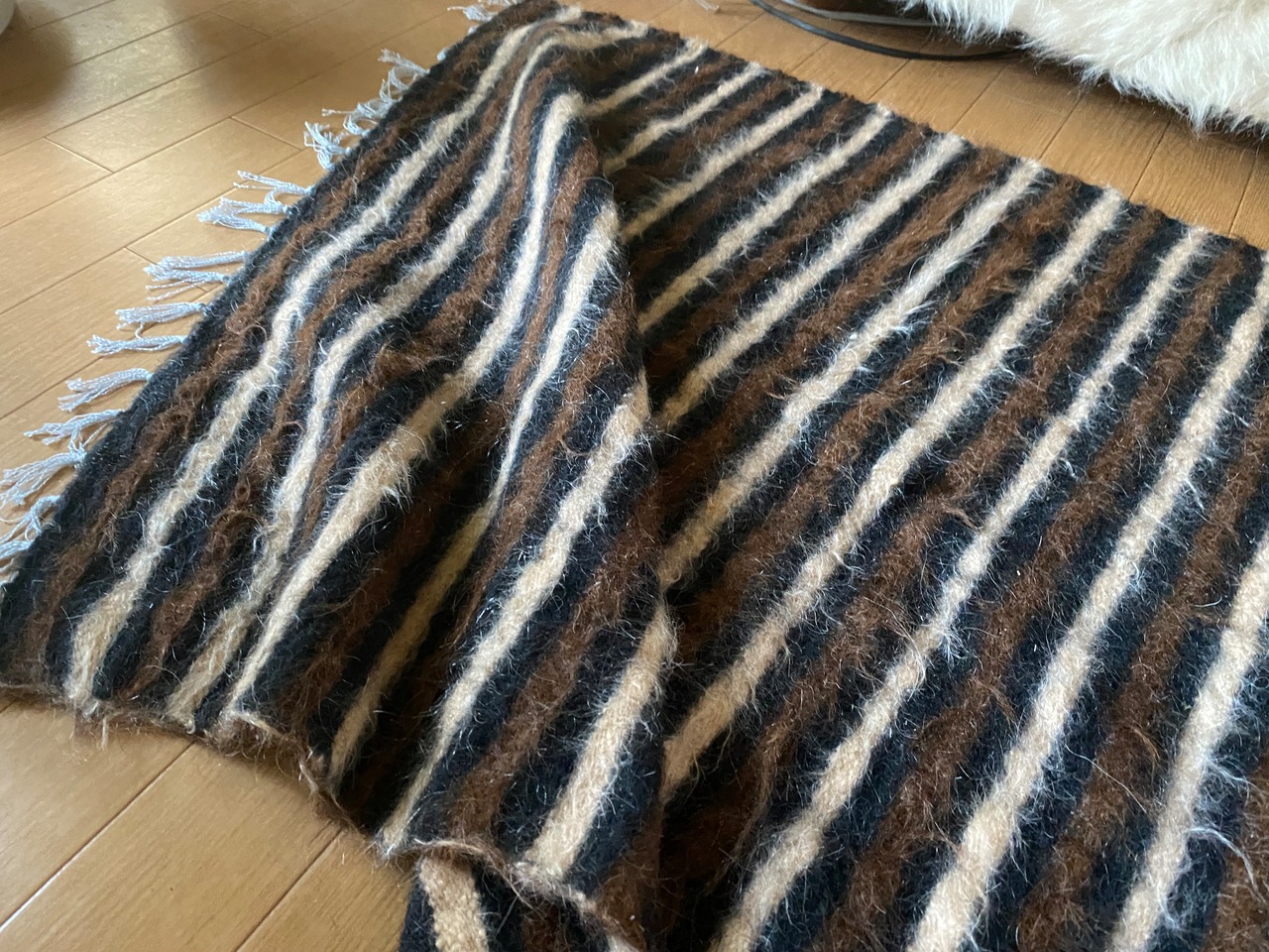 1点のみ極上の古い時代のアンゴラヤギモヘア100使用3色のボーダーのシイルトバッタニイェ!密な織でフェルトのような厚みで素晴らしい!ラグだけではなく、膝掛けや椅子にさりげなくかけても!期間限定18800円→16800円!動物を傷つけない四季を通じて重宝な織物