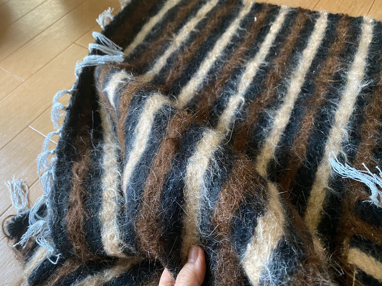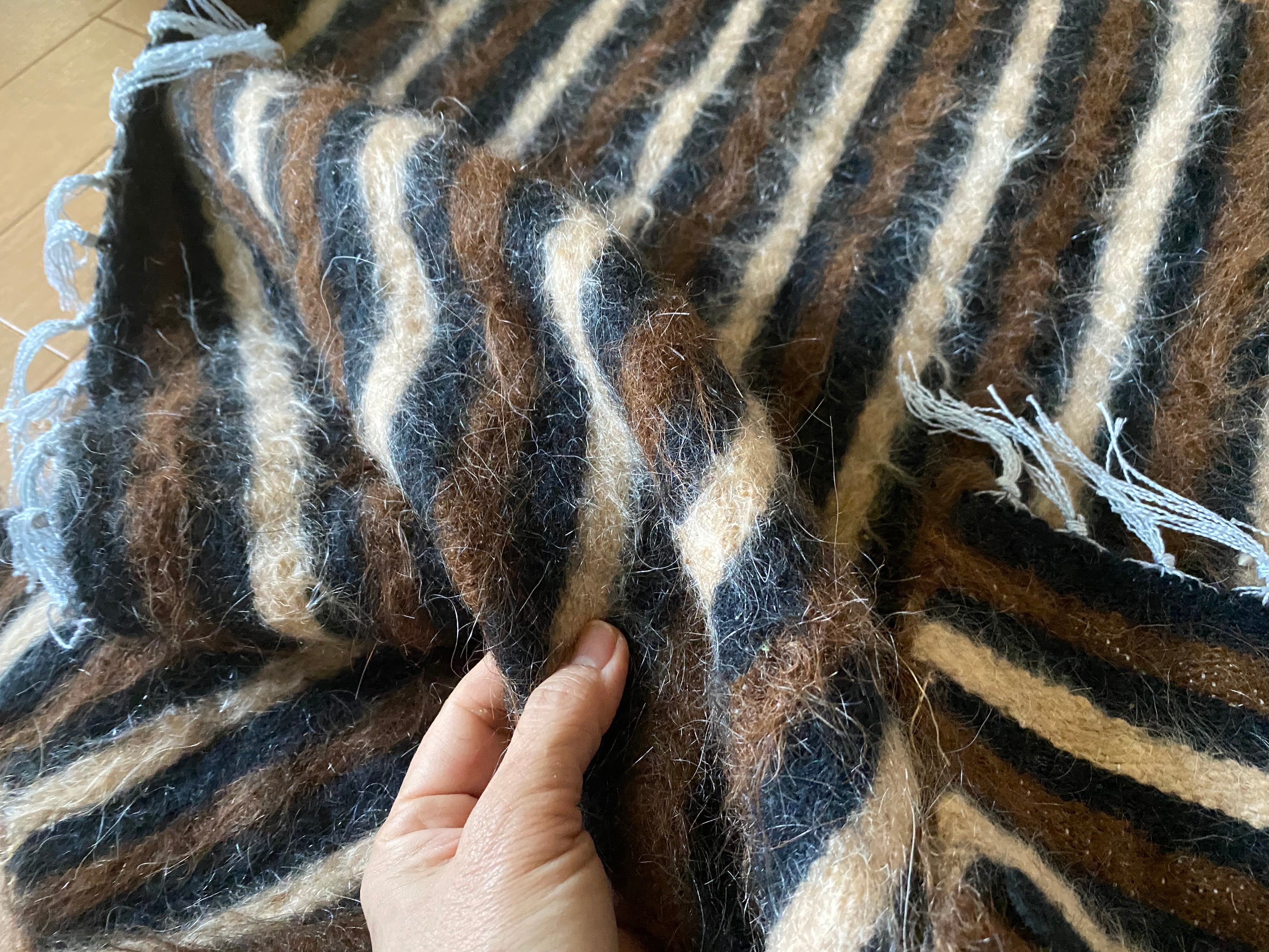 自然の山羊の毛を手で紡いだものが使われていますので、たまーにもみ殻がたまについていたり木の破片みたいなものが稀に織り込まれていることがありますので、ご了承ください。 できるだけ検品して取り除いていますが取り切れないこともありますのでご了承ください。