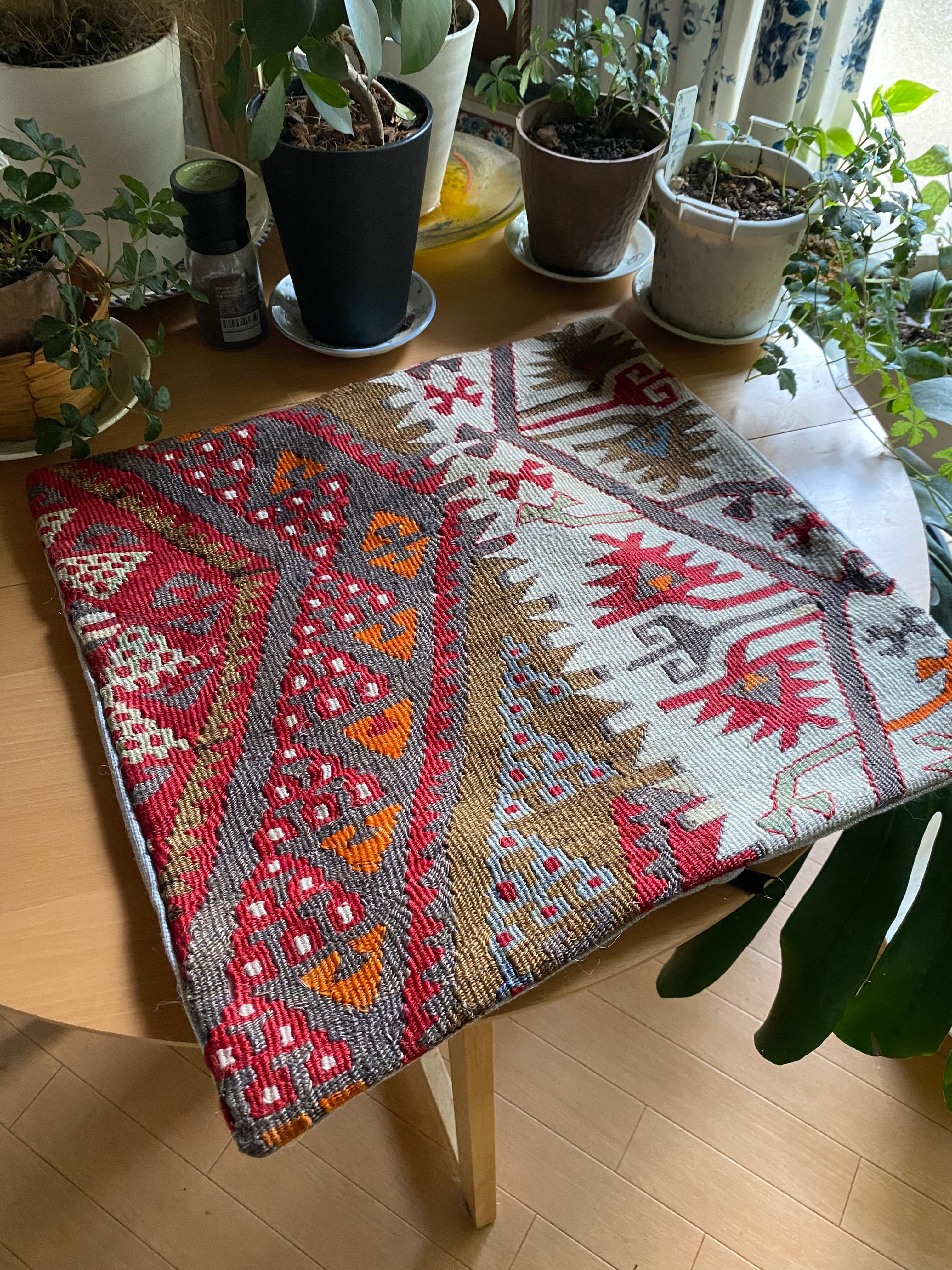 厳選したオールドキリムをカットして作ったカバーです。通常観光地などで販売されているカバーはトルコの絨毯屋で、もう捨てるようなはぎれでつく っておりますのでお安く質もあまりよくないものが多いですが、当店のカバーは一つ一つ厳選したキリムをカットして作っております。