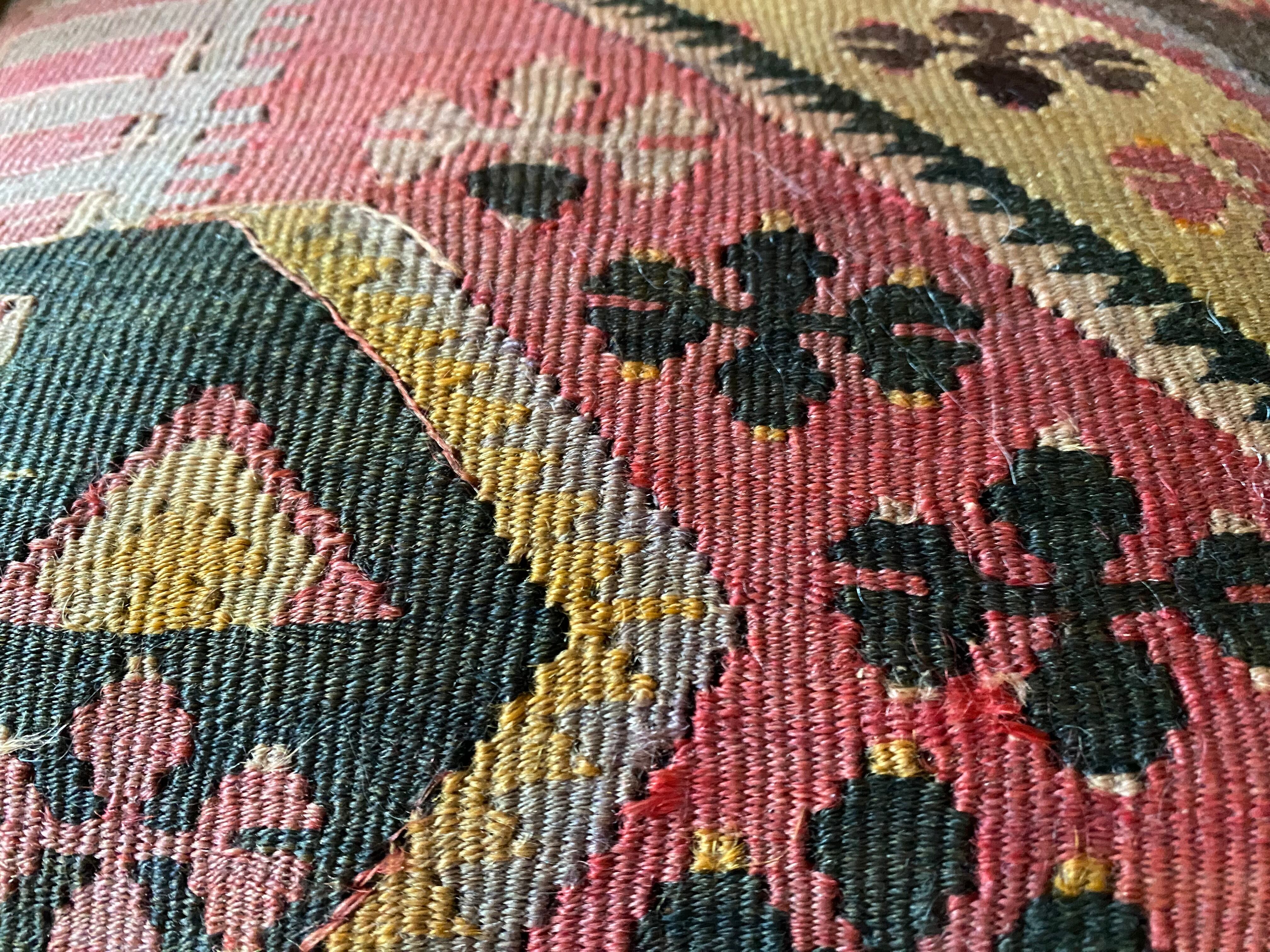 オールドキリム~アンティークキリムから作ったカバーには多少の色染みや、修理跡のあるもの、セミアンティークなどは縦糸 が見えているものもございます。