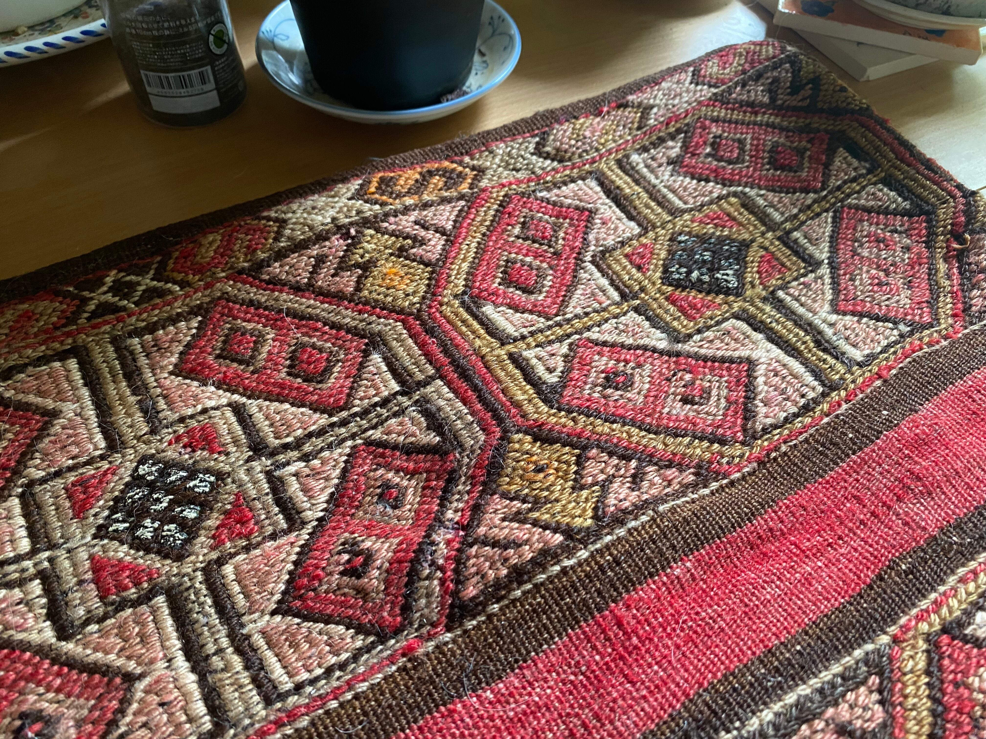 オールドキリム~アンティークキリムから作ったカバーには多少の色染みや、修理跡のあるもの、セミアンティークなどは縦糸 が見えているものもございます。