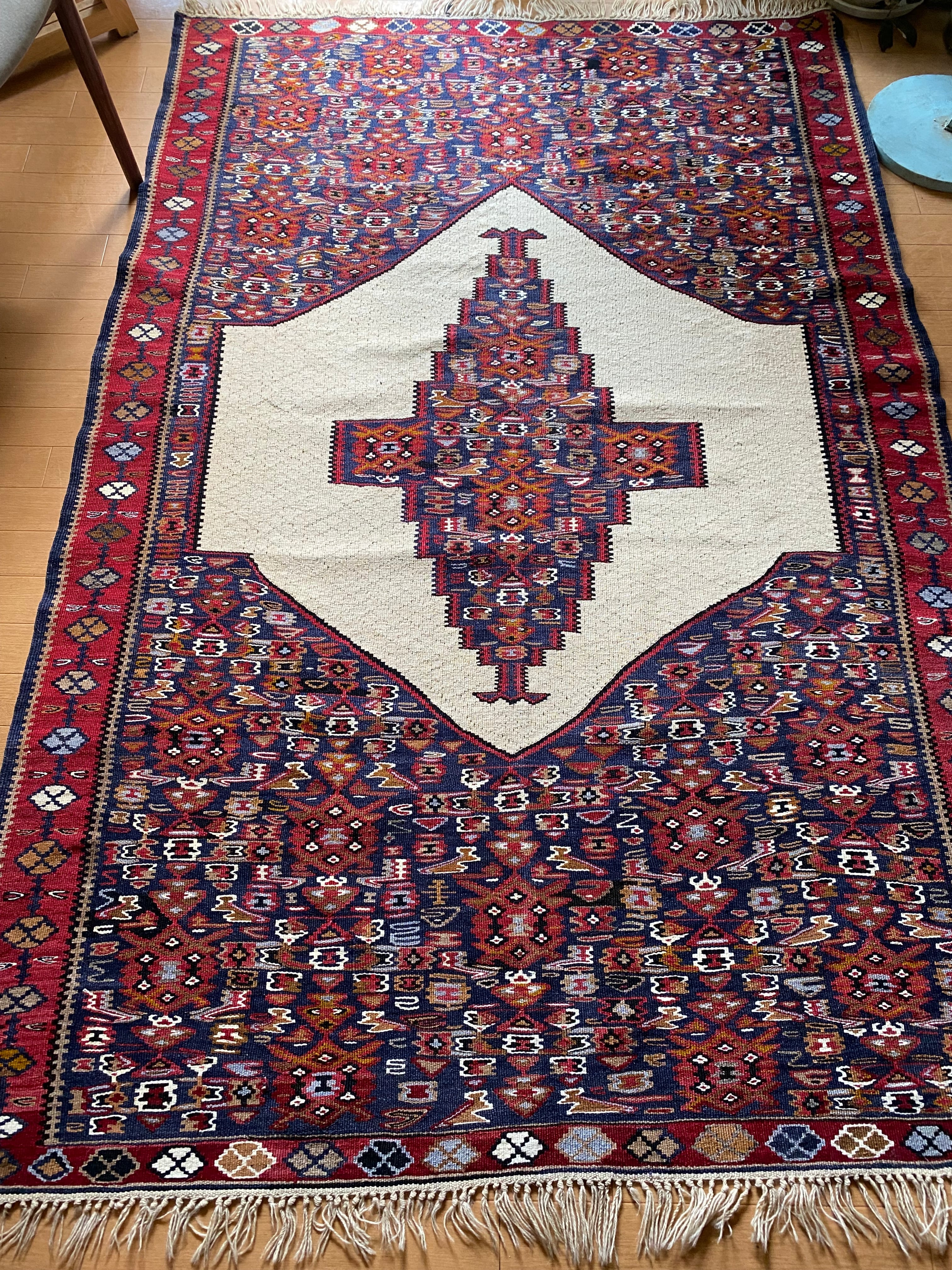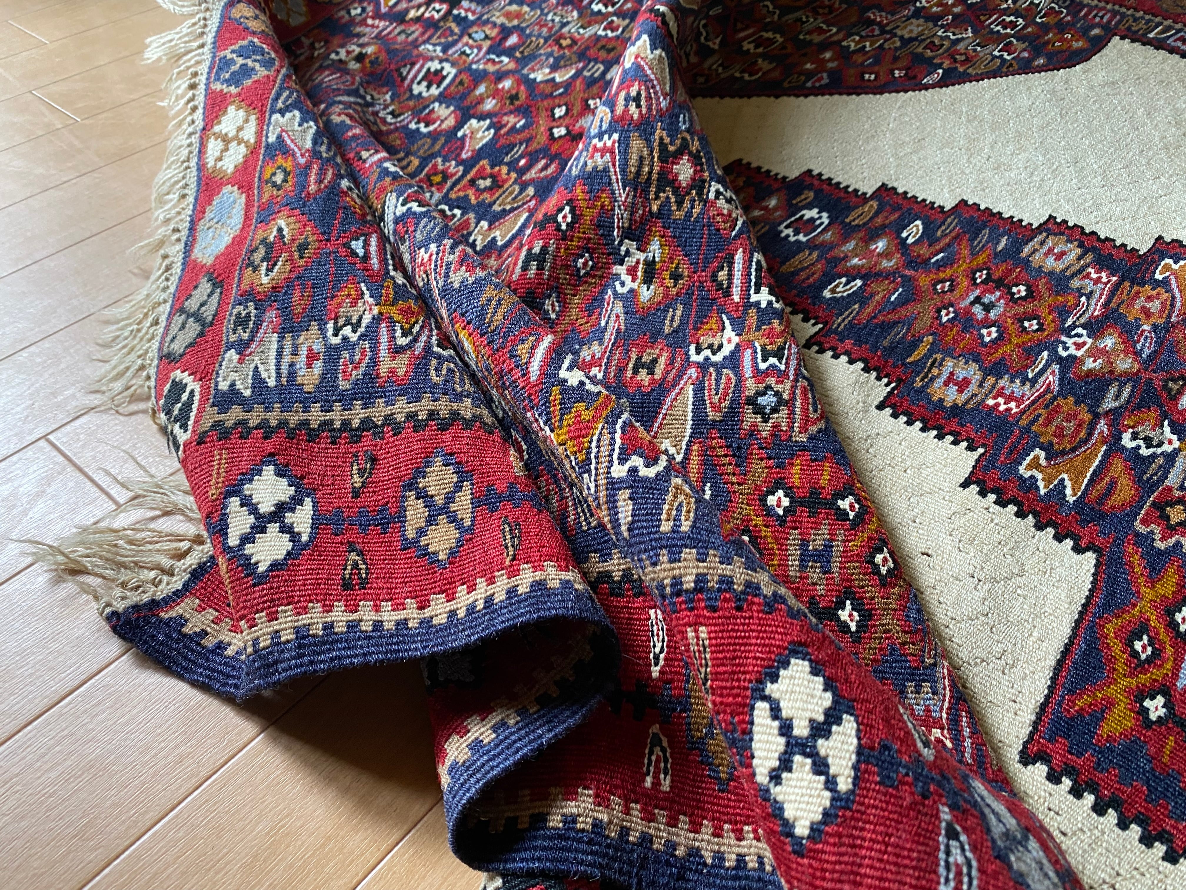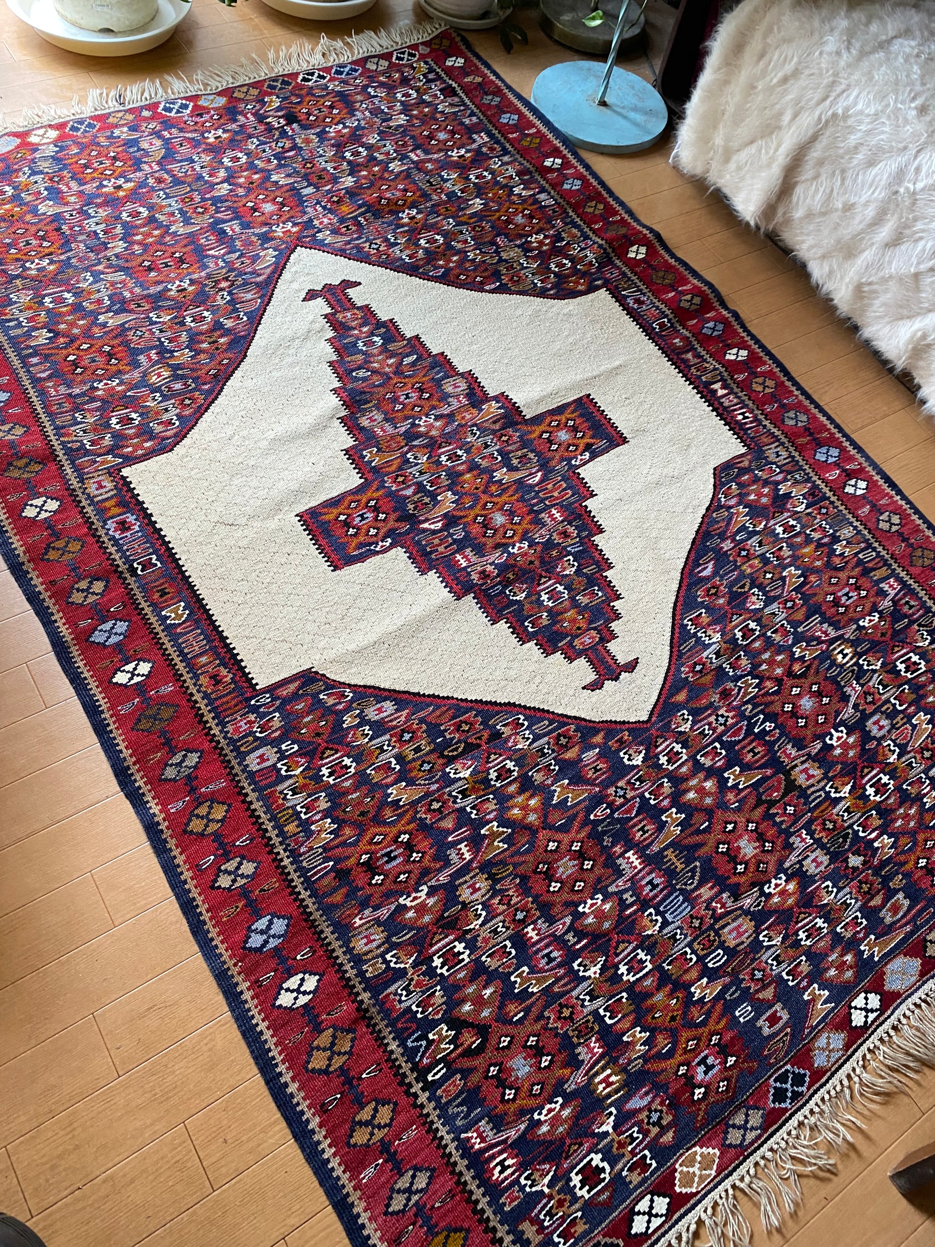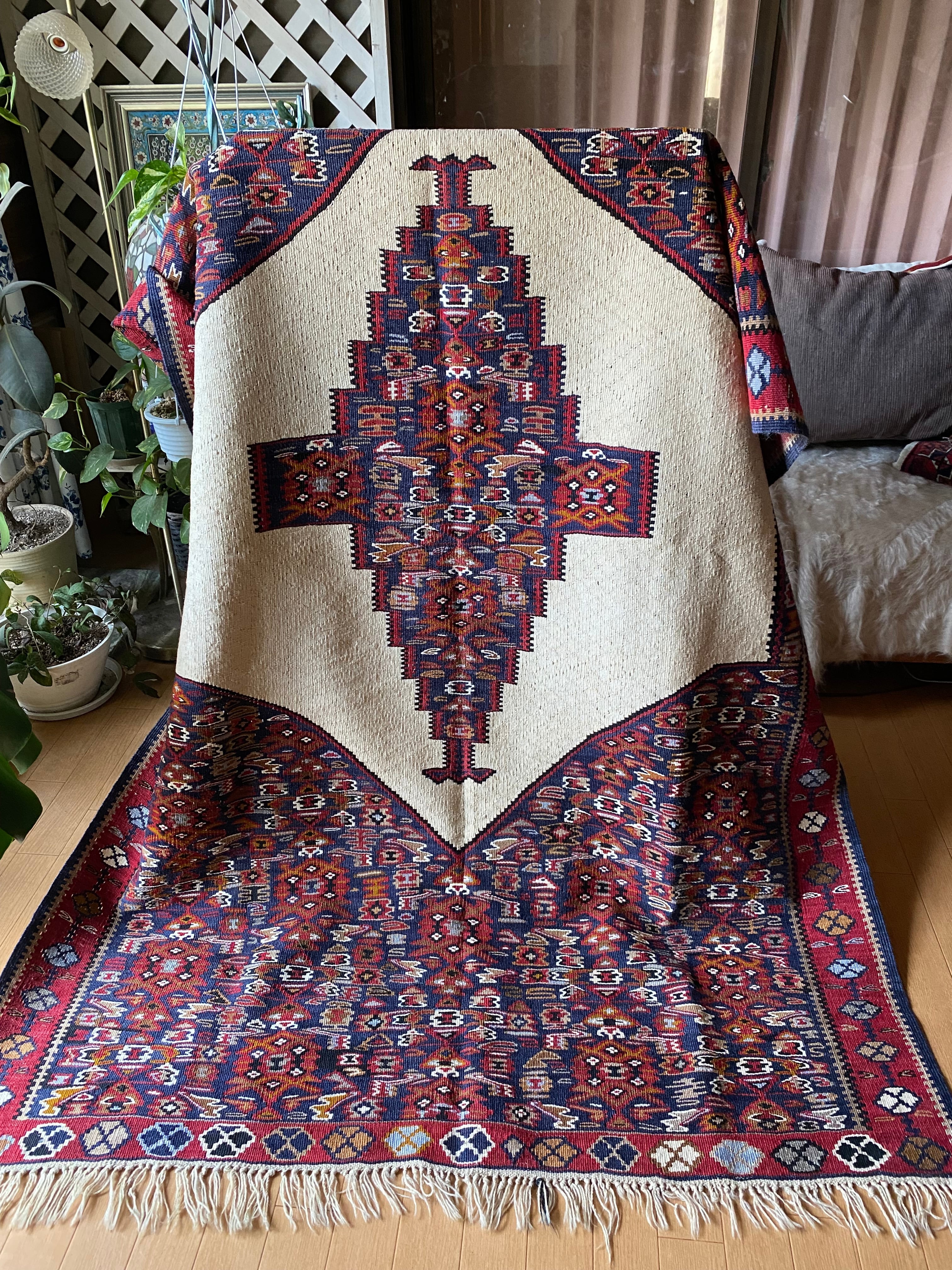 この織りデザイン大きさでこのお値段では現地でもそう手に入らないと思いますし今後は更に高くなっていくと思います。 市場ではこのランクのセネキリムは8万以上で売られております。お調べください。 セネは本当に色々ピンからキリまでありまして、柄の細かくないごわごわした厚 い織りのも のはすごく安いですし、アンティークの目の詰まったものになりますと、20万前 後いたします。セネのお好きな方はご存知だと思います
