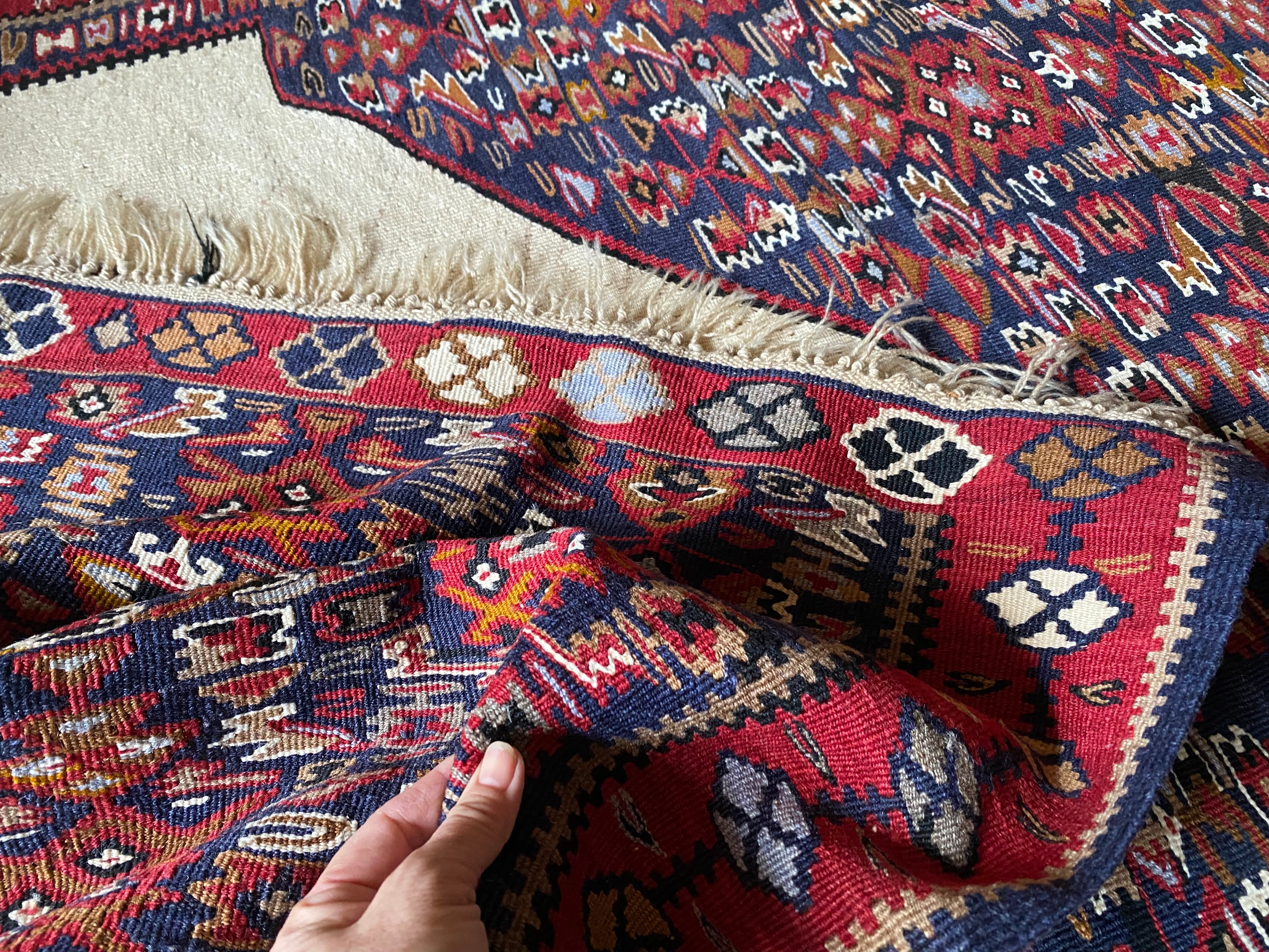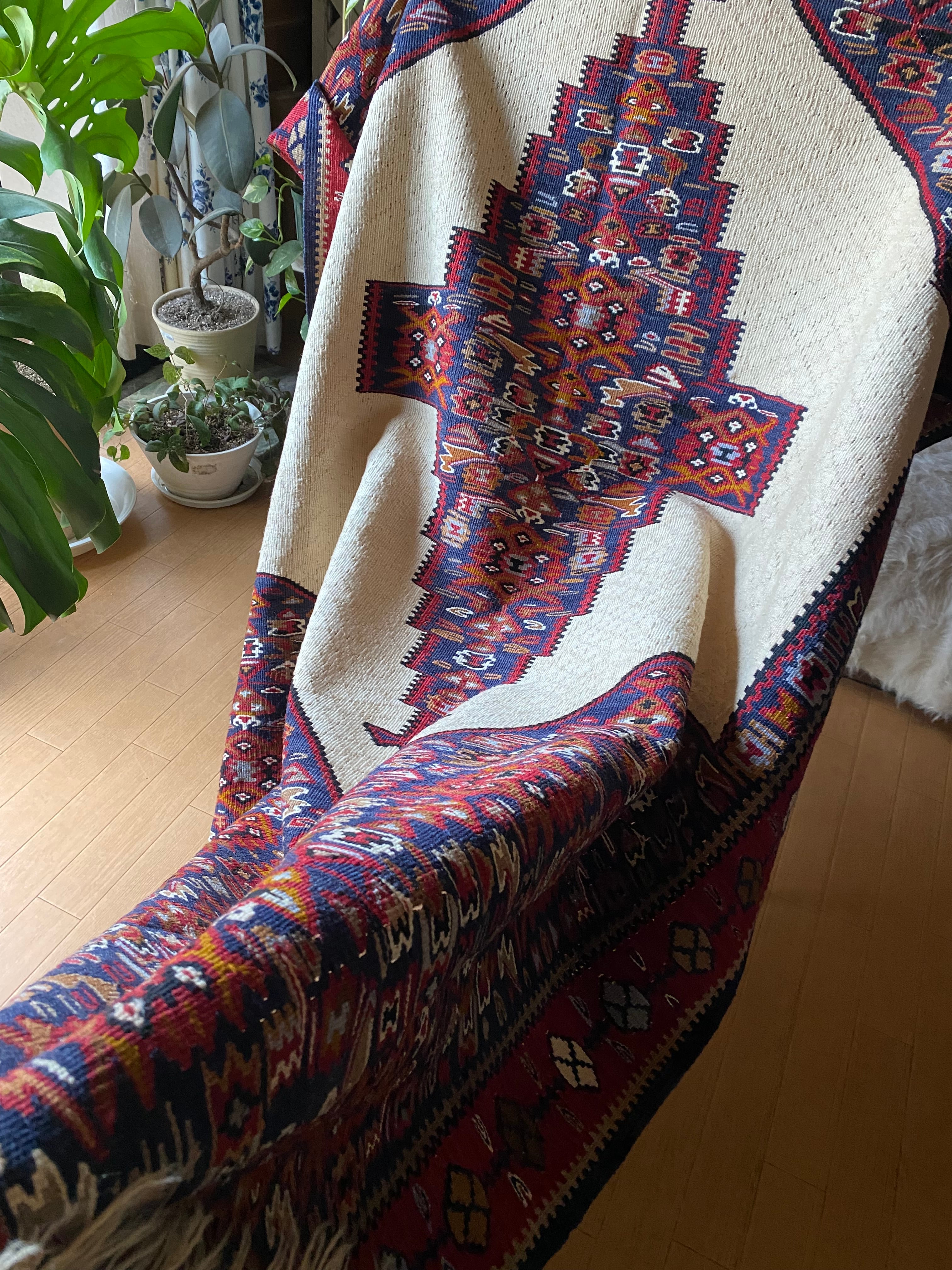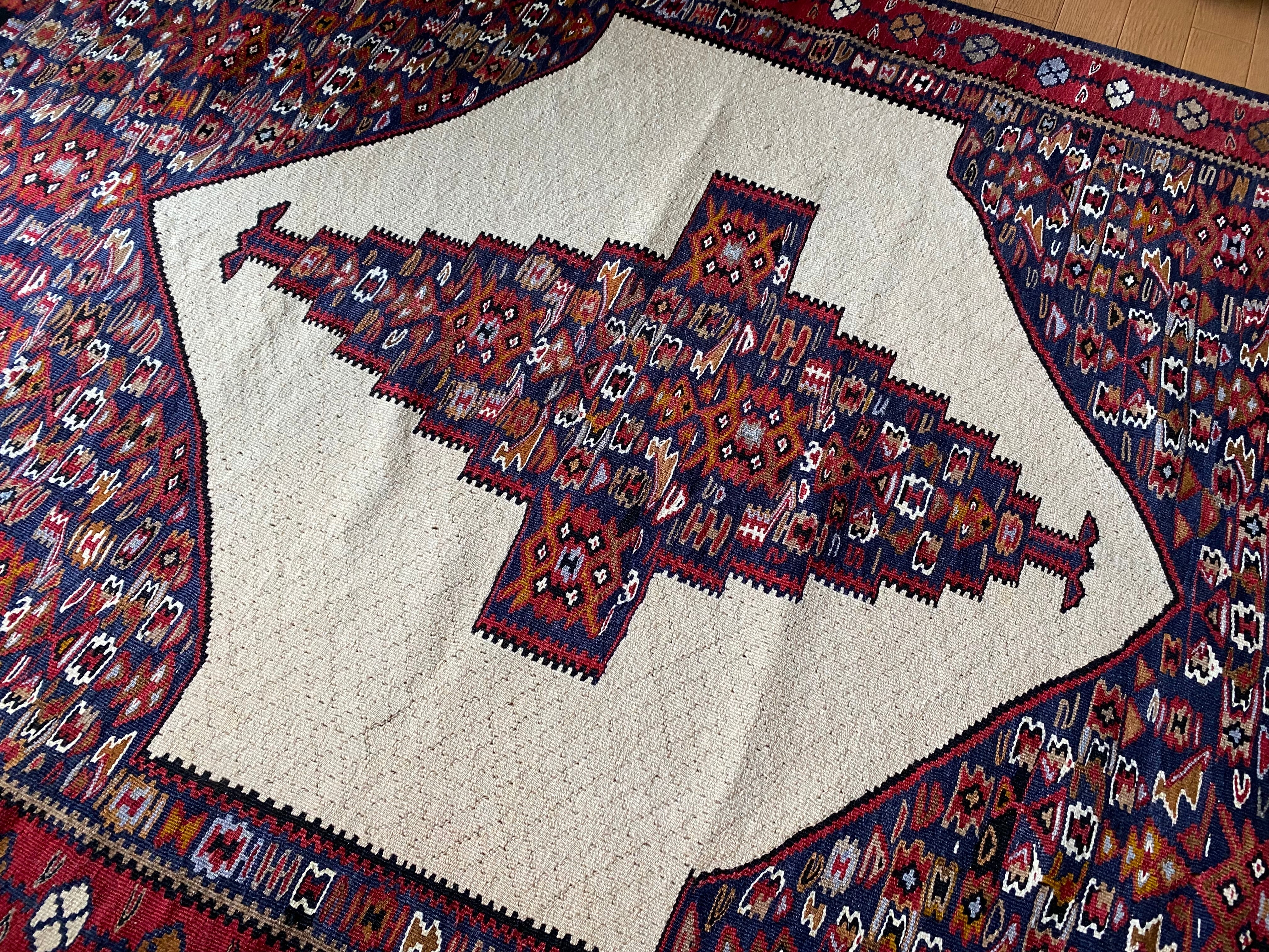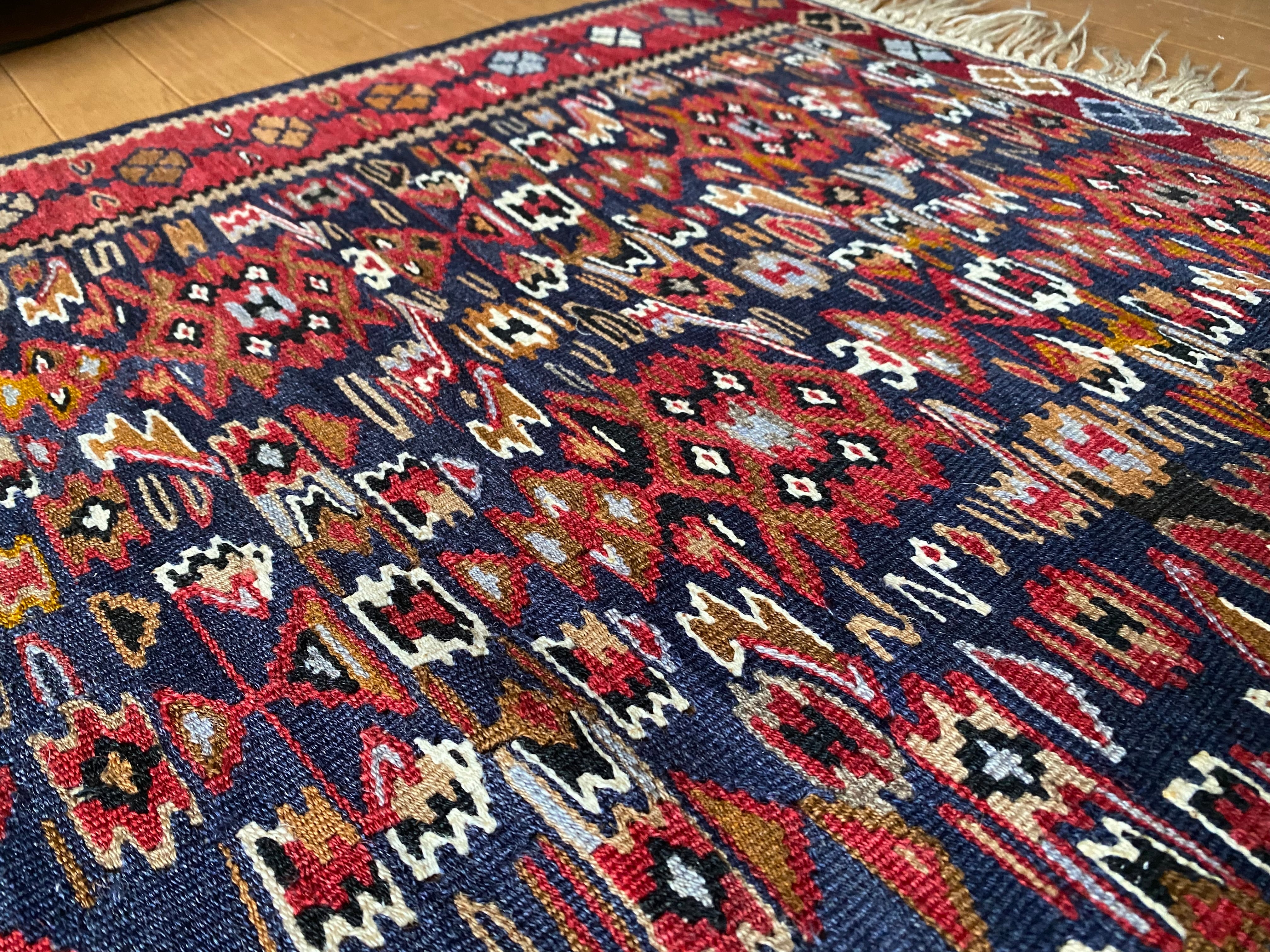 この織りデザイン大きさでこのお値段では現地でもそう手に入らないと思いますし今後は更に高くなっていくと思います。 市場ではこのランクのセネキリムは8万以上で売られております。お調べください。 セネは本当に色々ピンからキリまでありまして、柄の細かくないごわごわした厚 い織りのも のはすごく安いですし、アンティークの目の詰まったものになりますと、20万前 後いたします。セネのお好きな方はご存知だと思います