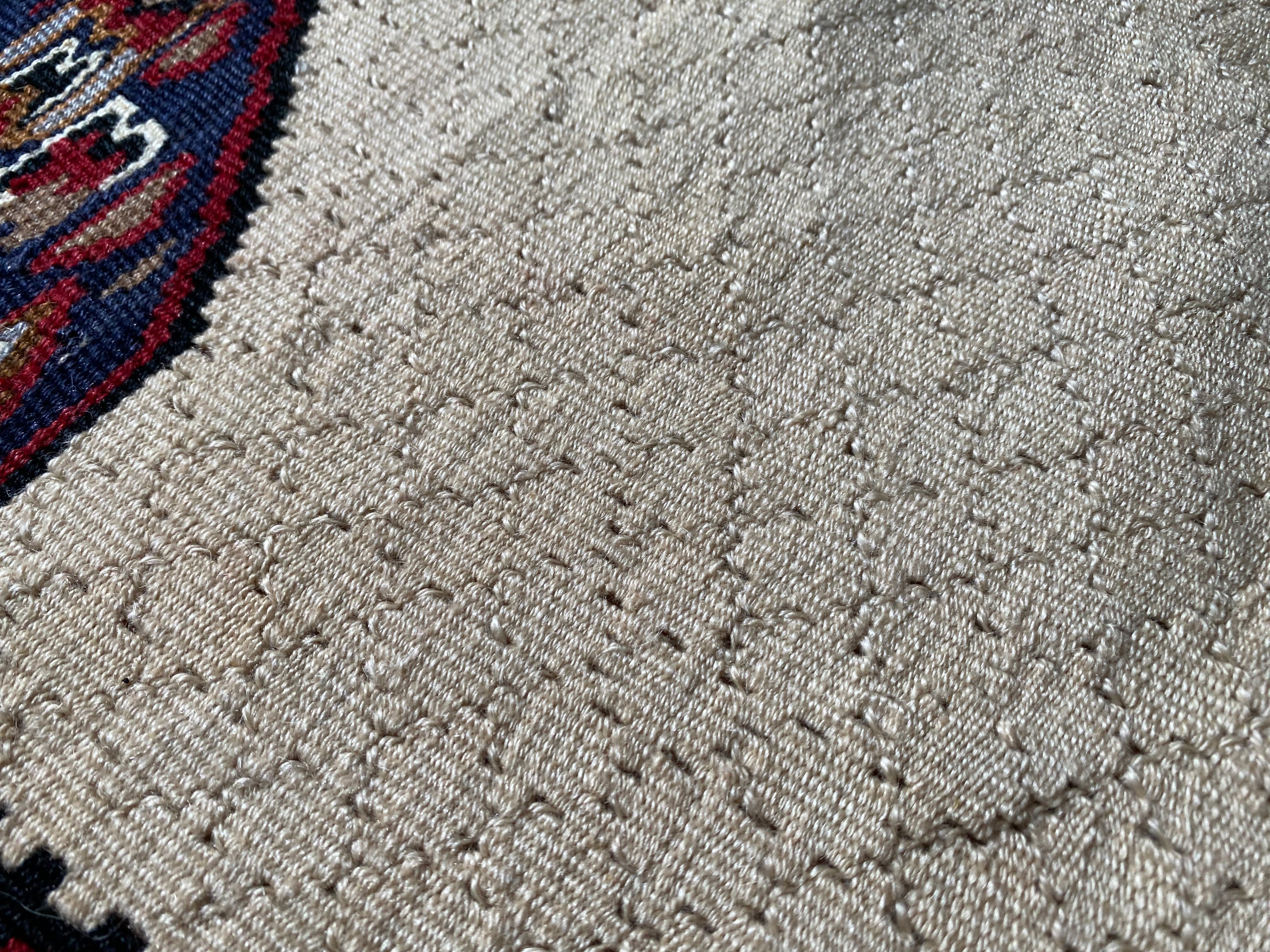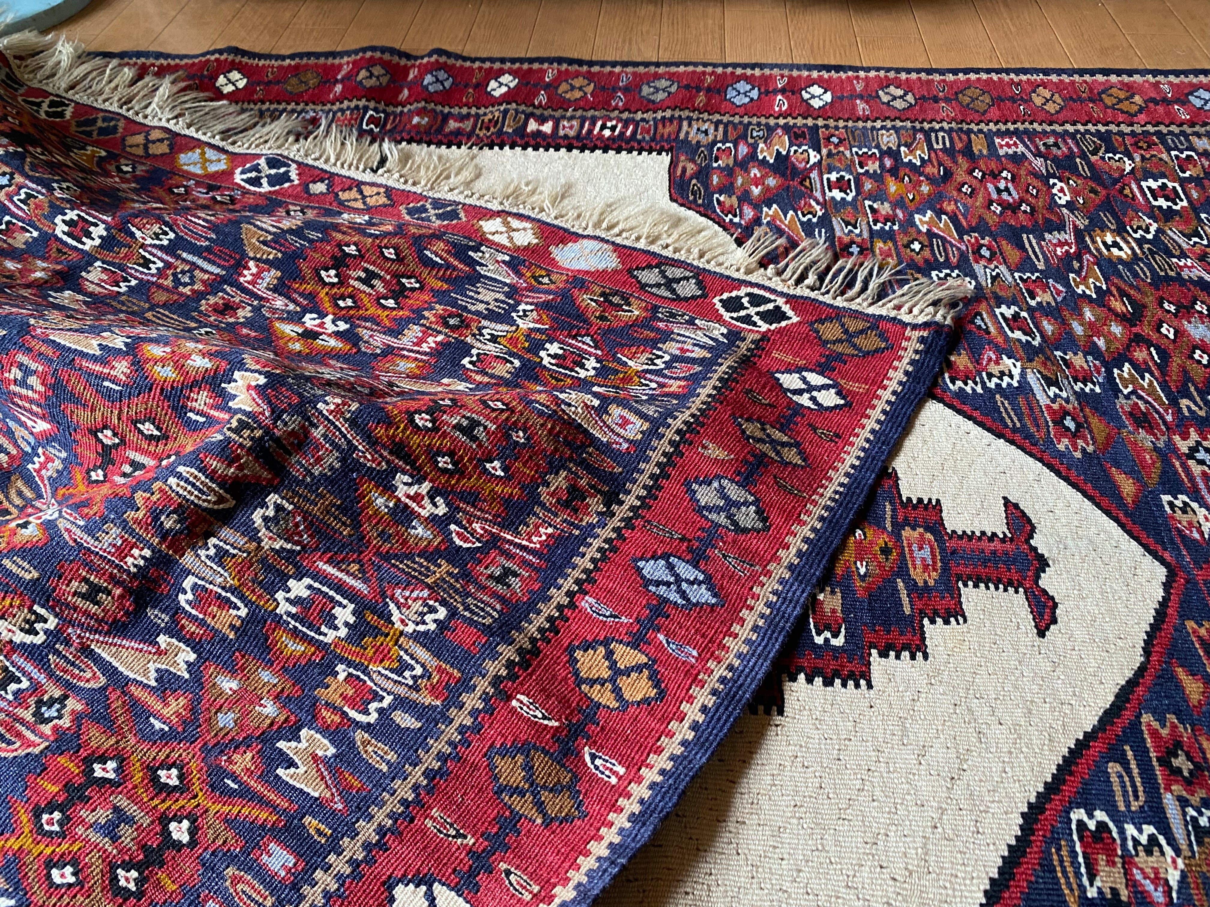 またこちらオールドですが、踏んでも大丈夫です。人通りの多いところ においていただいても踏むに耐えうるアンティークですのでじゃんじゃん踏んで しっとり素敵なアンティークにしてください。 よく、アンティークは踏んで大丈夫ですか?というご質問がありますが、絨毯、 キリムは踏めば踏むほど艶が出ます。長年たくさんの人が踏むと足のアブラがな じむのでしょうか! 欧米のように直接ハイヒールでがんがん踏まない限り、ほつれたり、傷んだりす ることはありません。