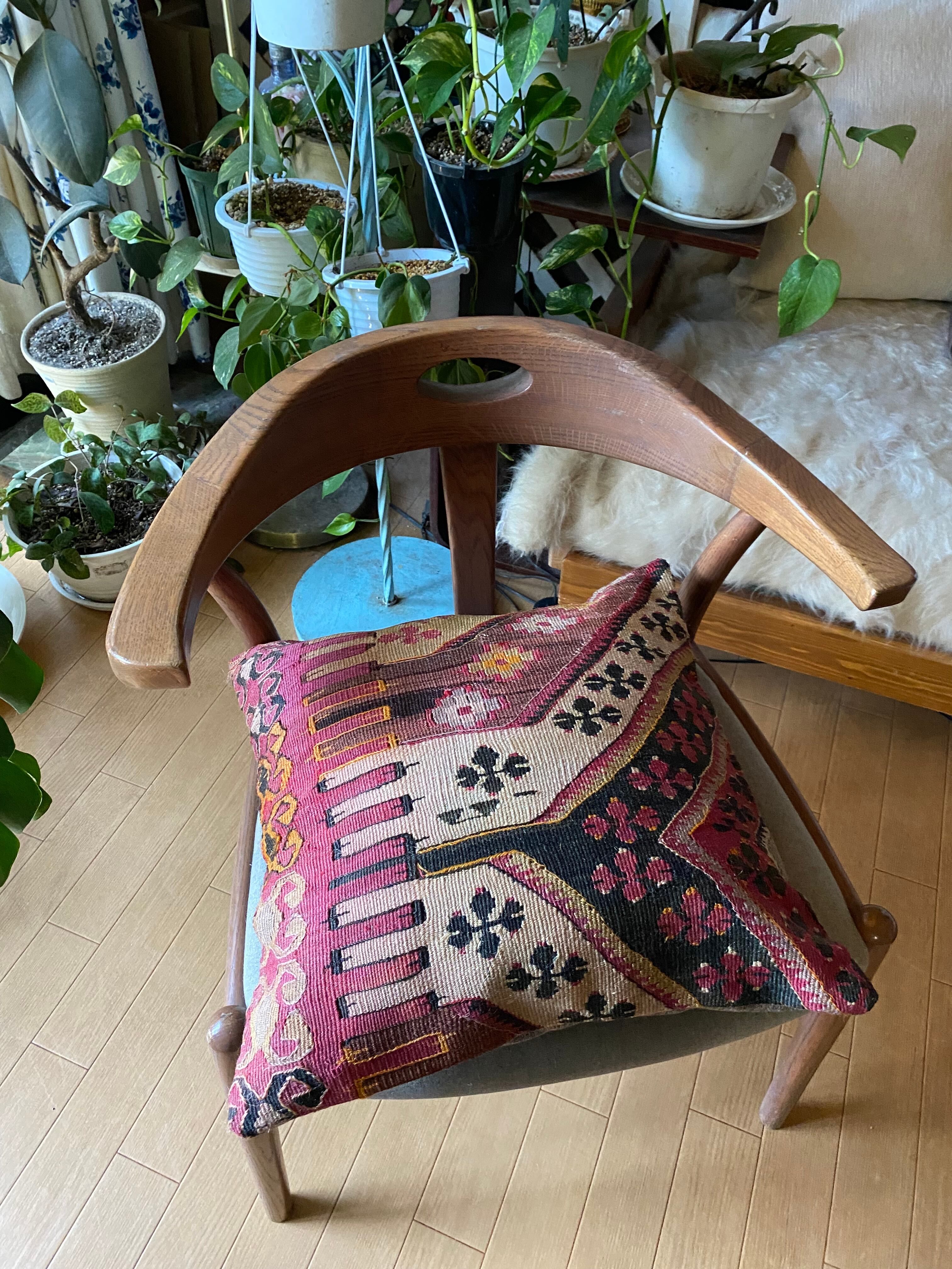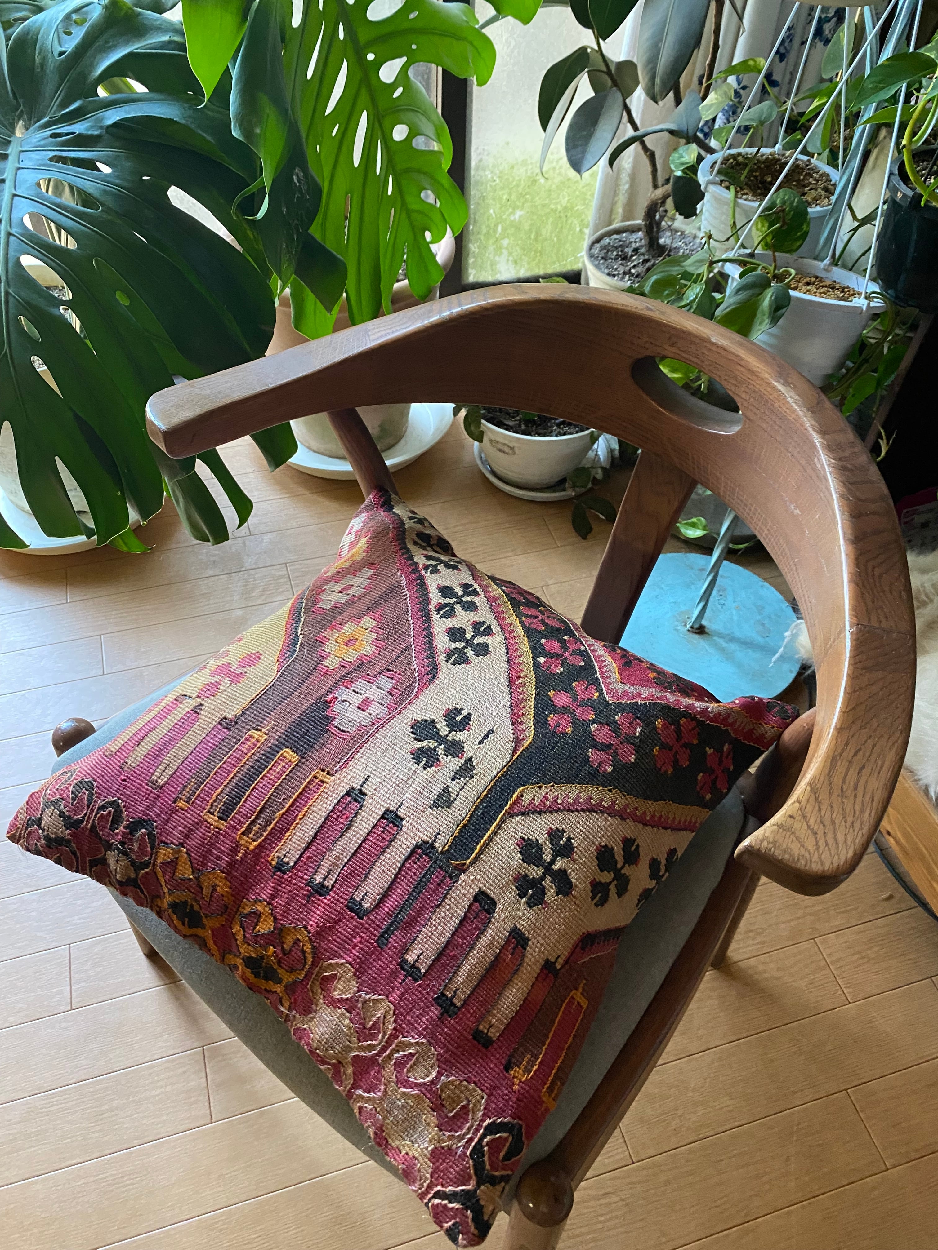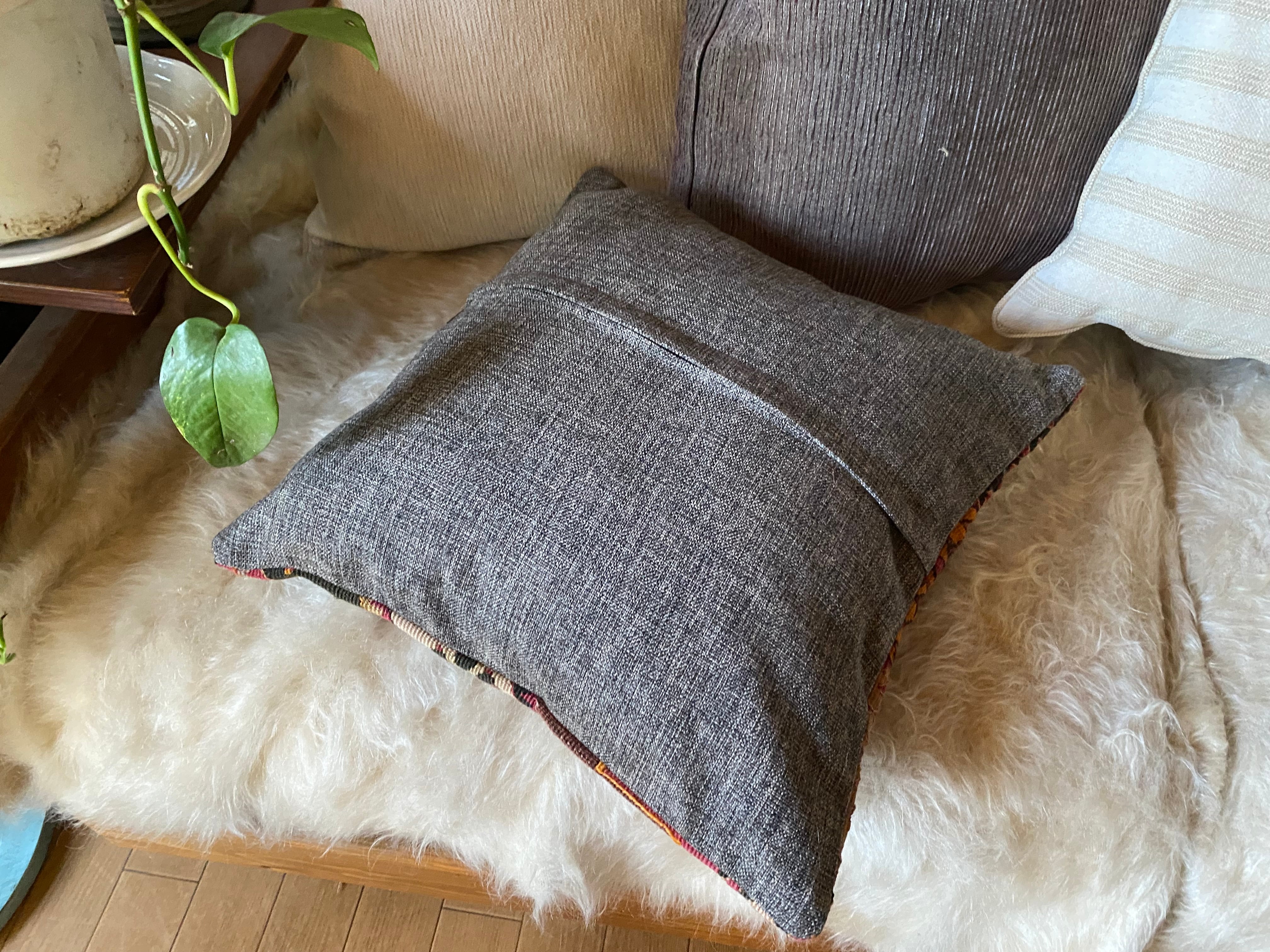 オールドキリム~アンティークキリムから作ったカバーには多少の色染みや、修理跡のあるもの、セミアンティークなどは縦糸 が見えているものもございます。