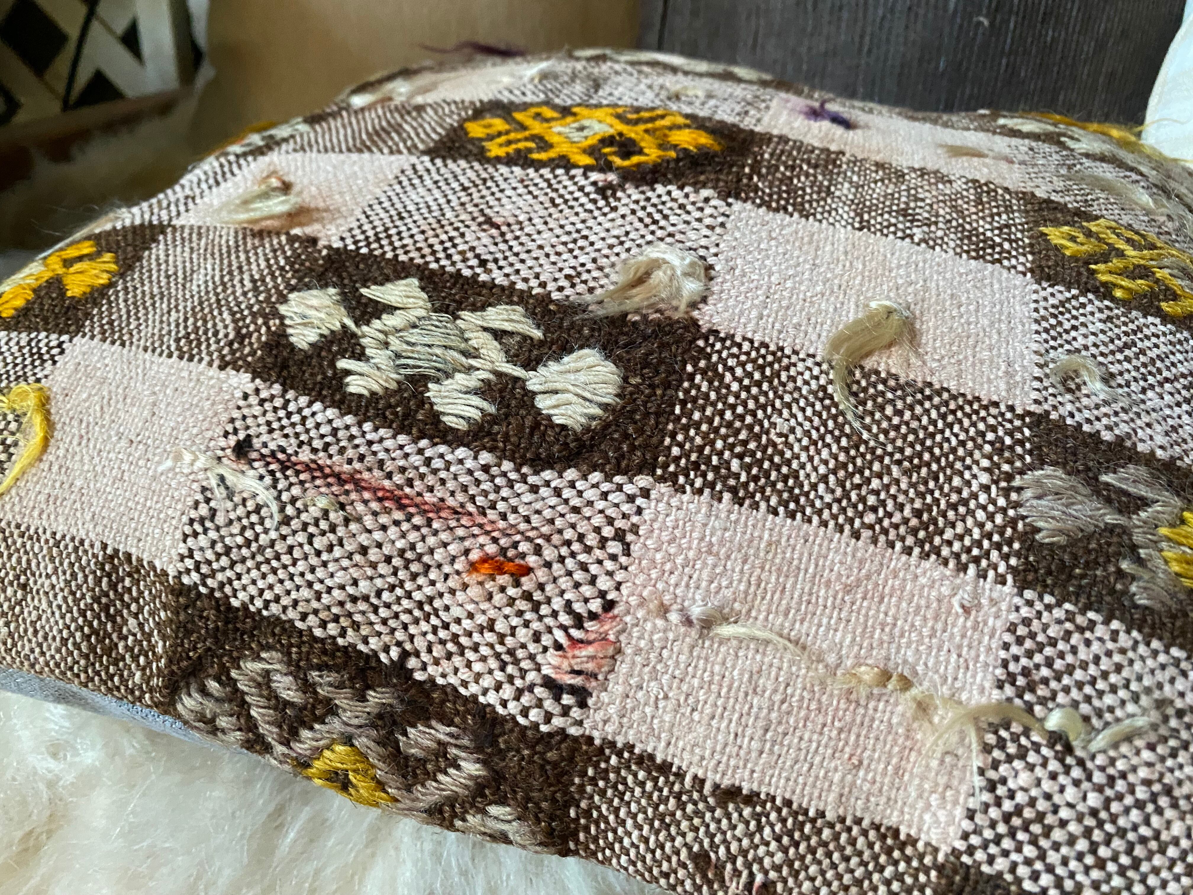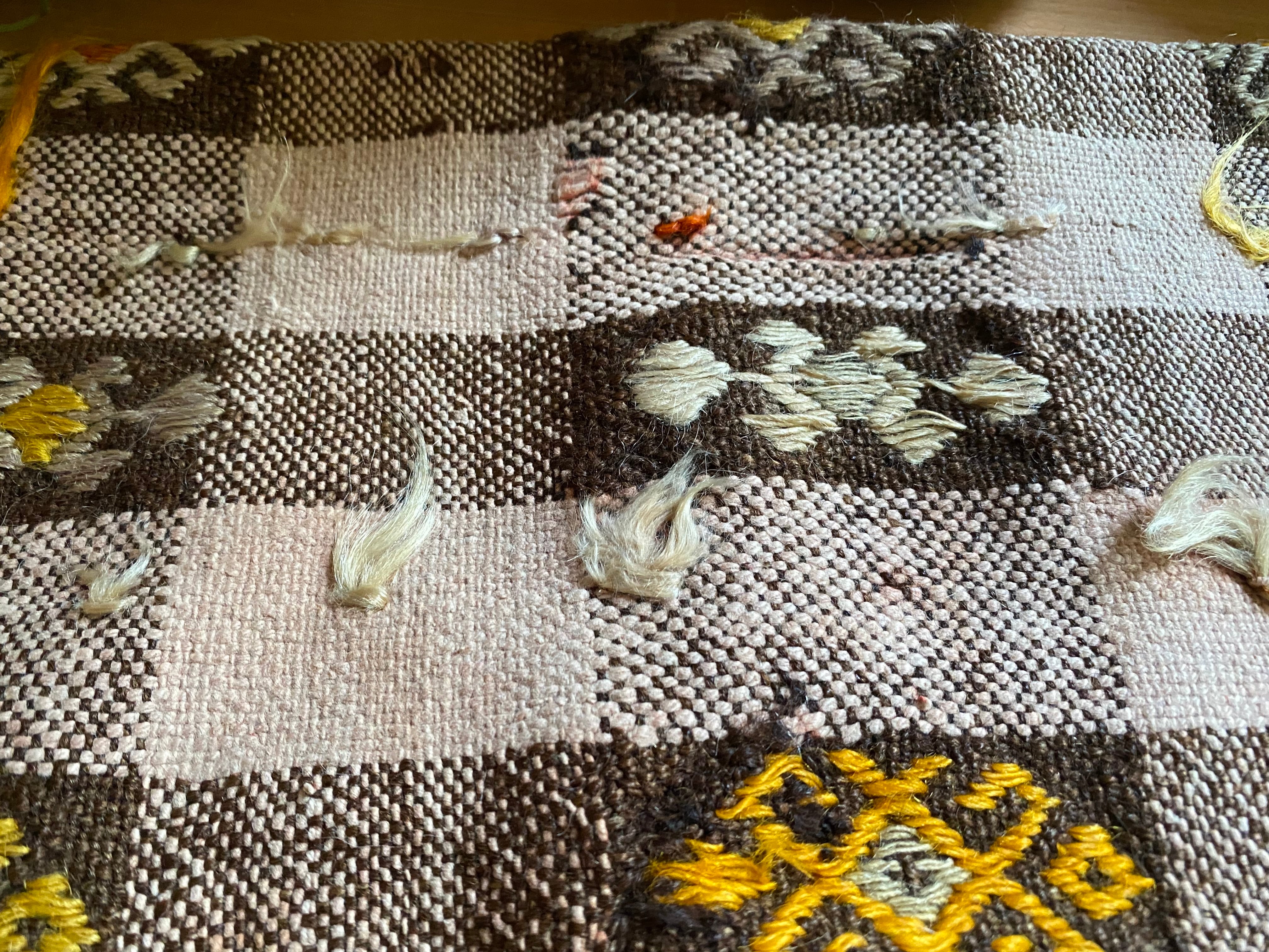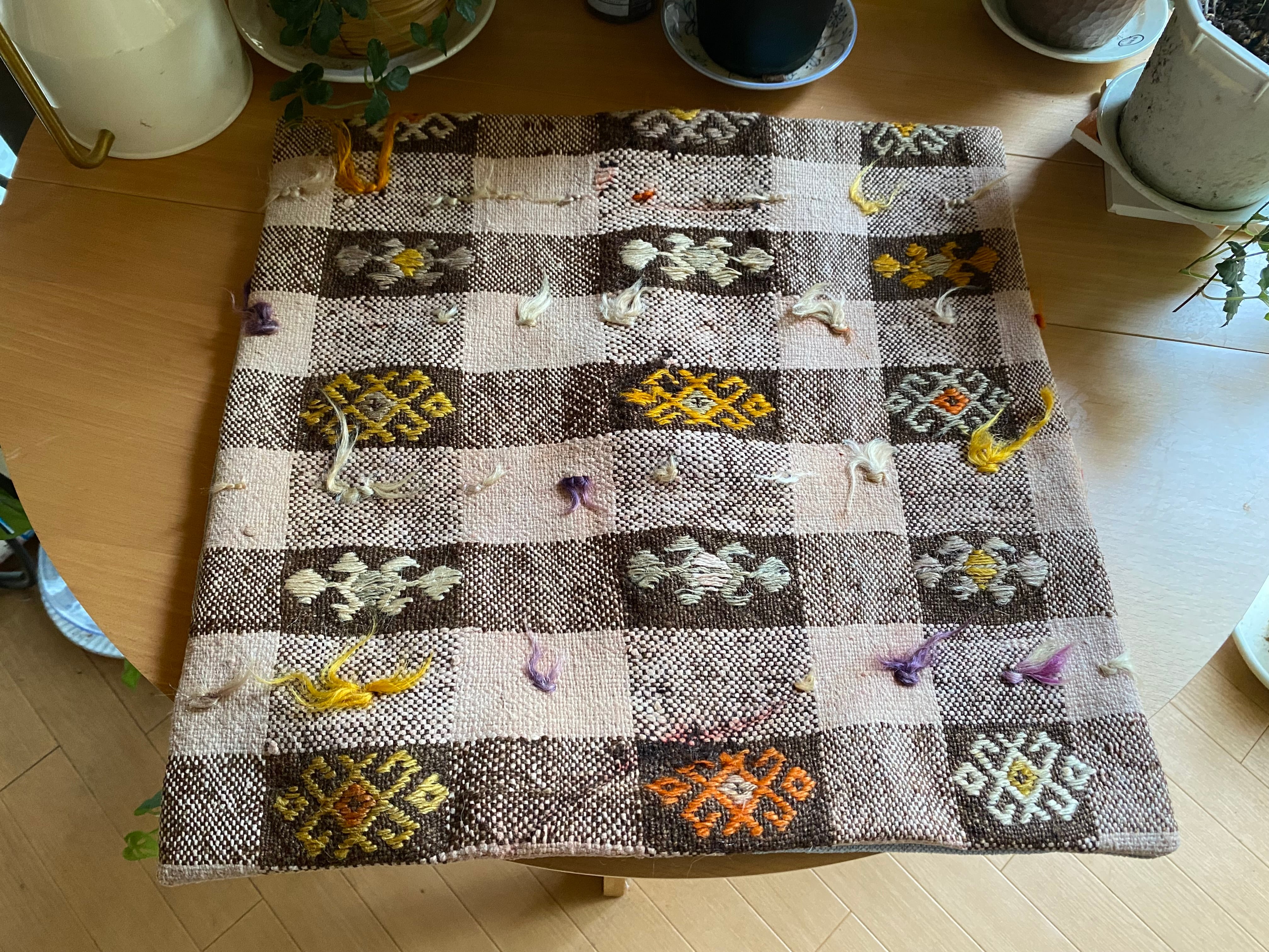 オールドキリム~アンティークキリムから作ったカバーには多少の色染みや、修理跡のあるもの、セミアンティークなどは縦糸 が見えているものもございます。