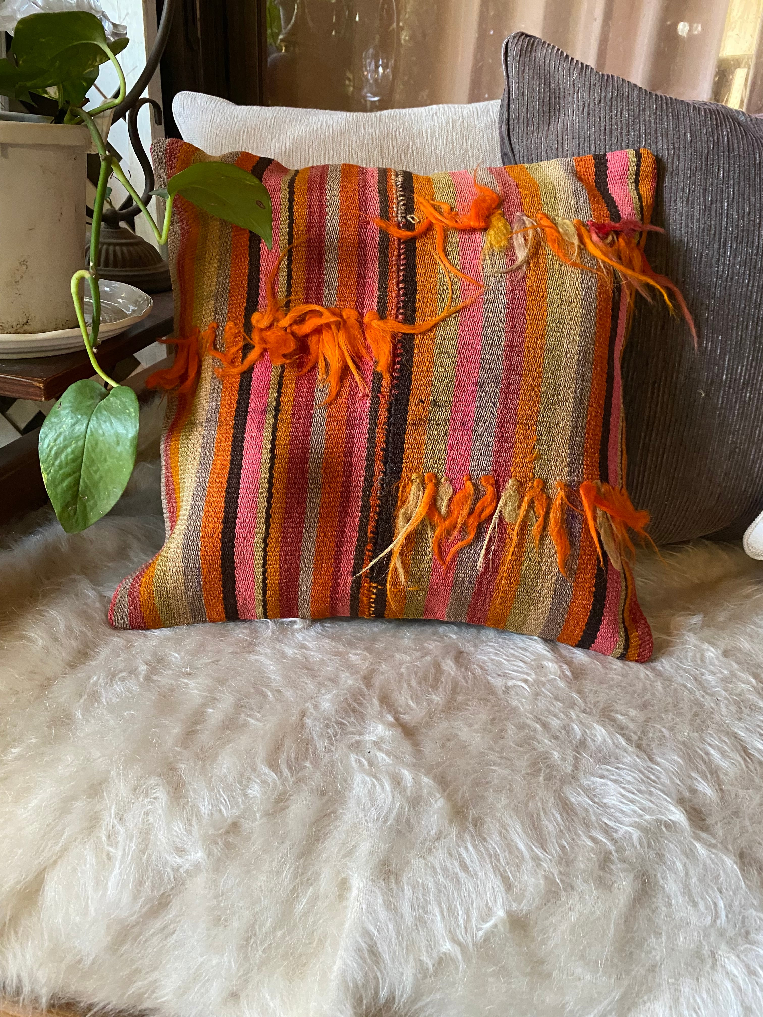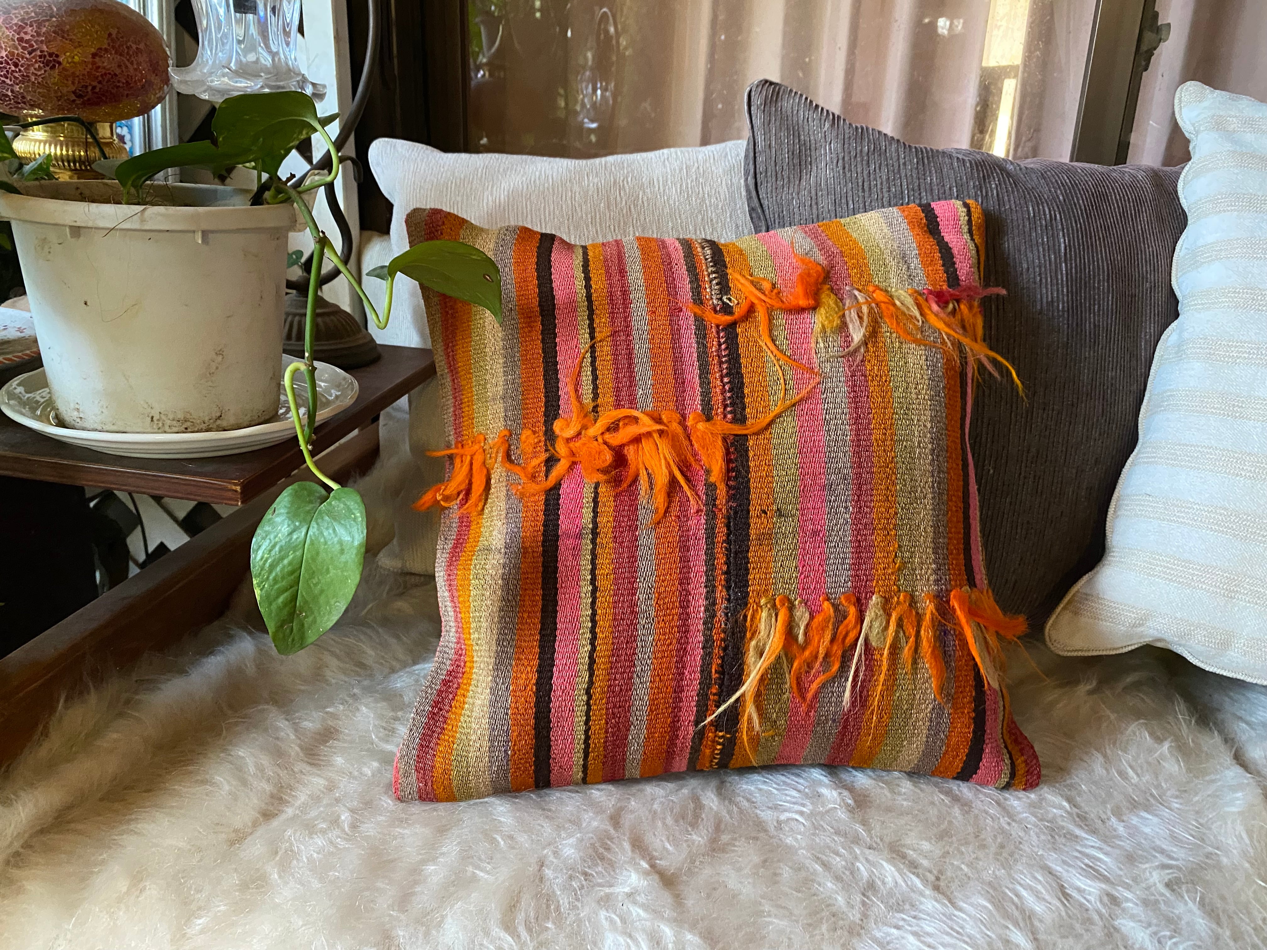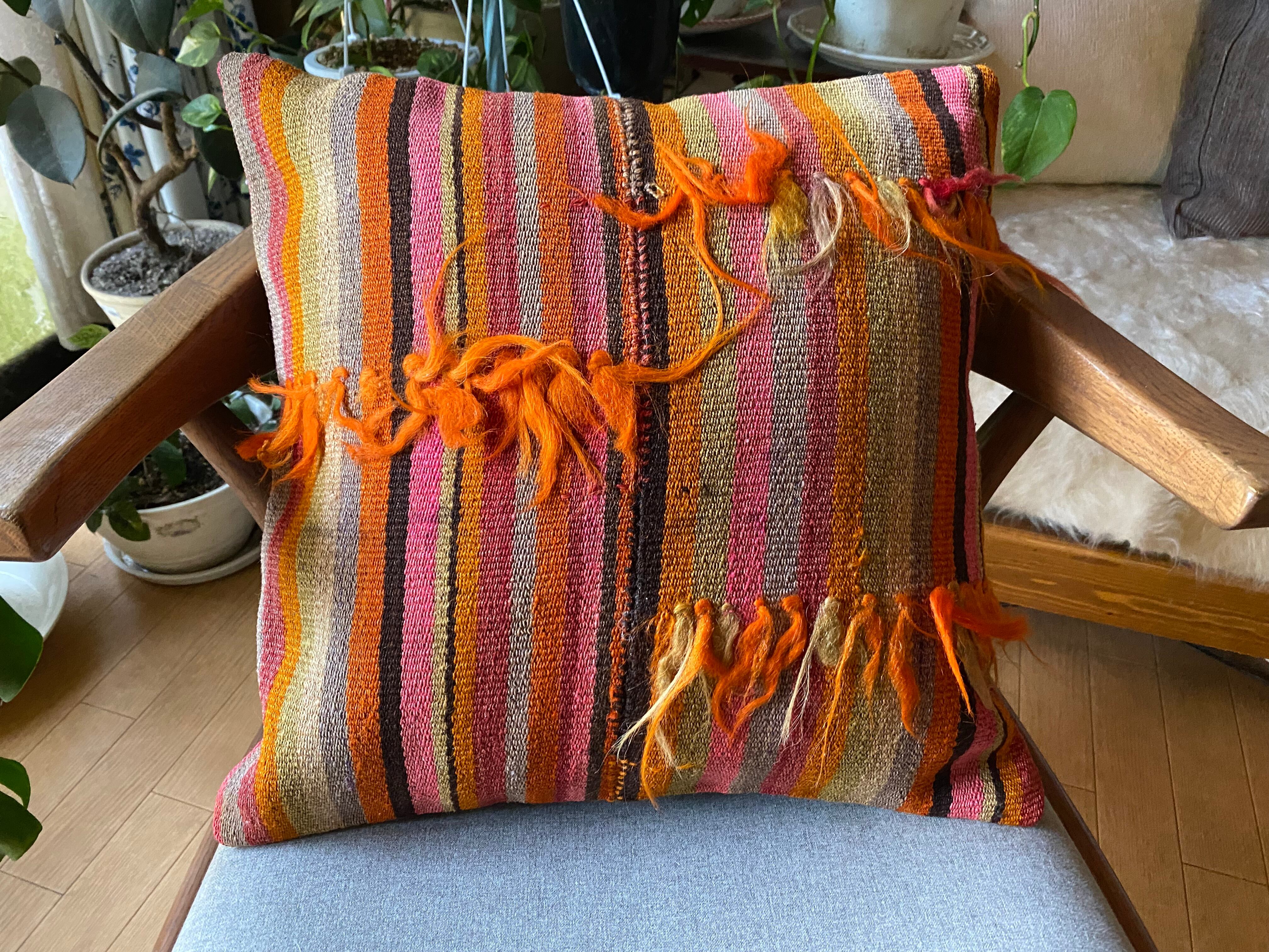 キリムのある素敵な暮らしを始めませんか?42×42クッションカバー一枚でお部屋が素敵に!房が可愛いトルコシヴァスキリムクッションカバー