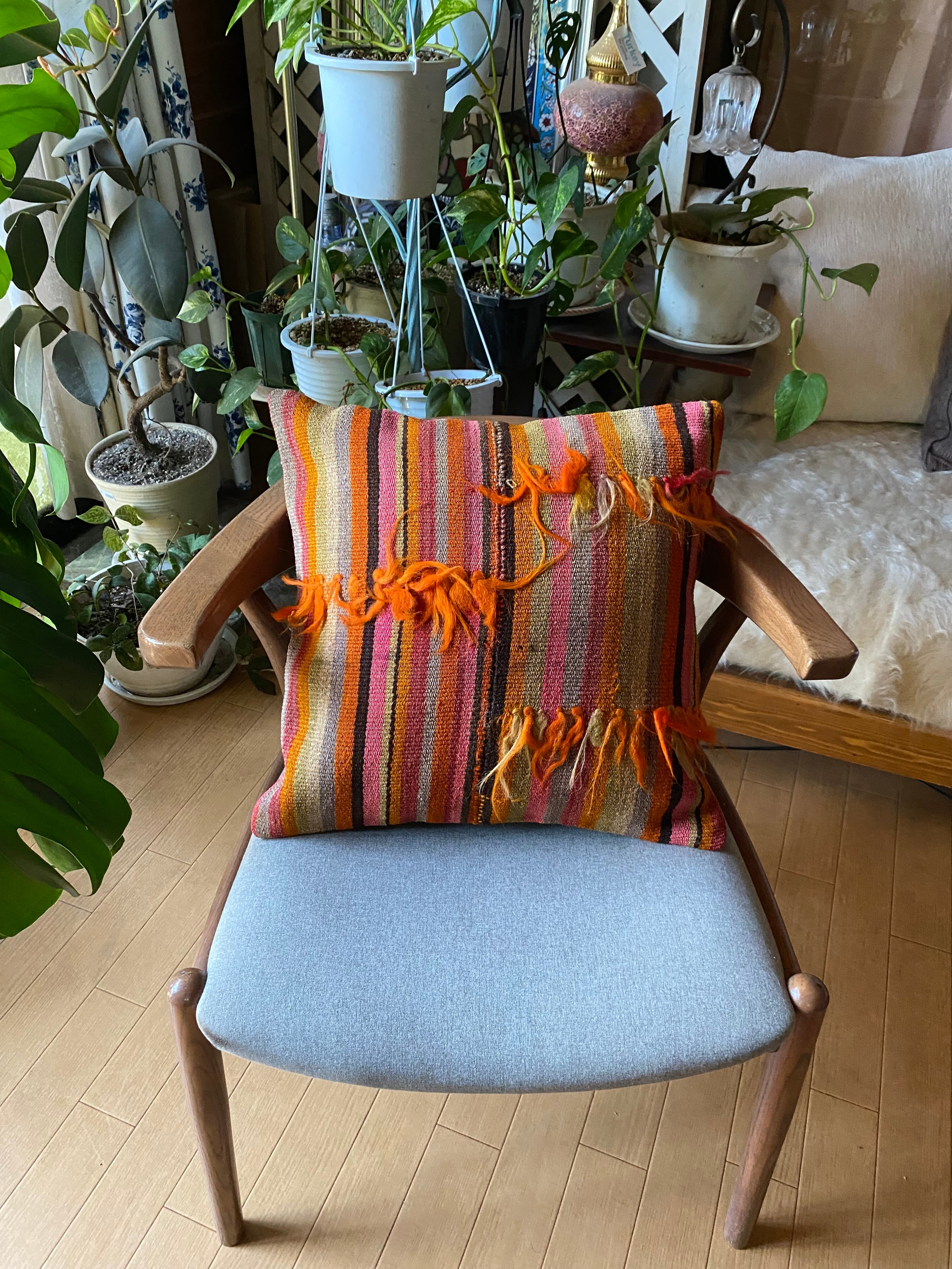 オールドキリム~アンティークキリムから作ったカバーには多少の色染みや、修理跡のあるもの、セミアンティークなどは縦糸 が見えているものもございます。
