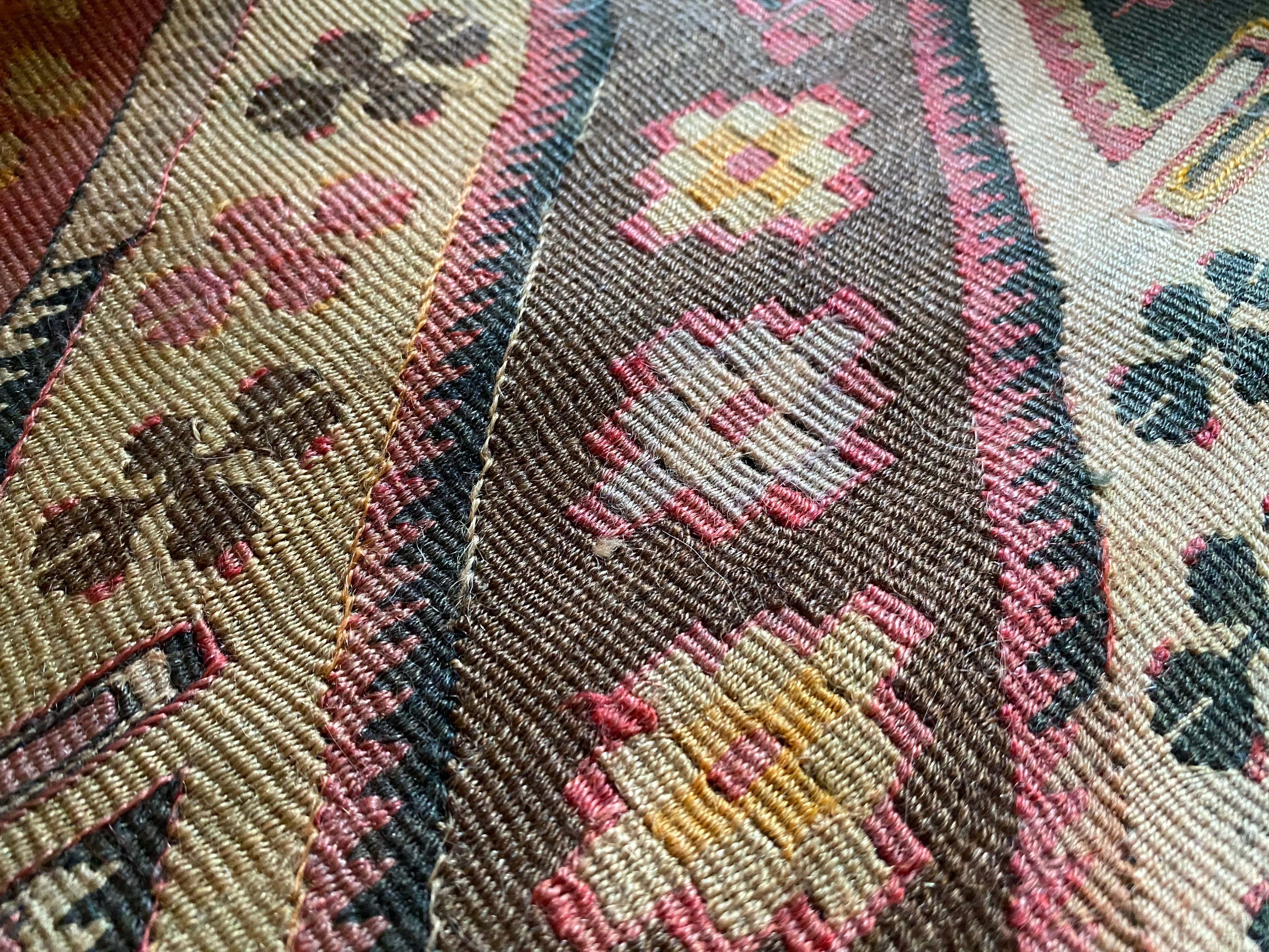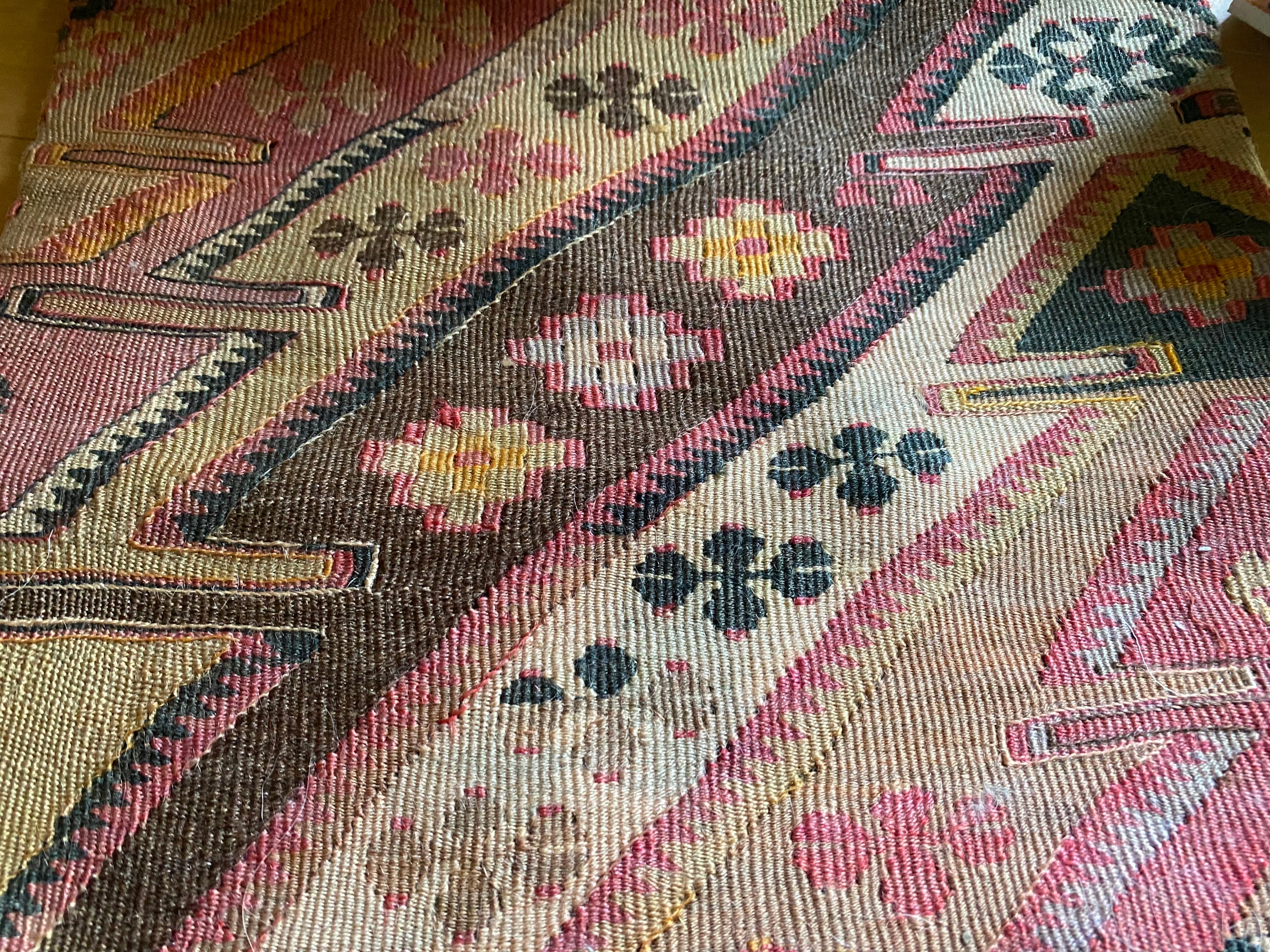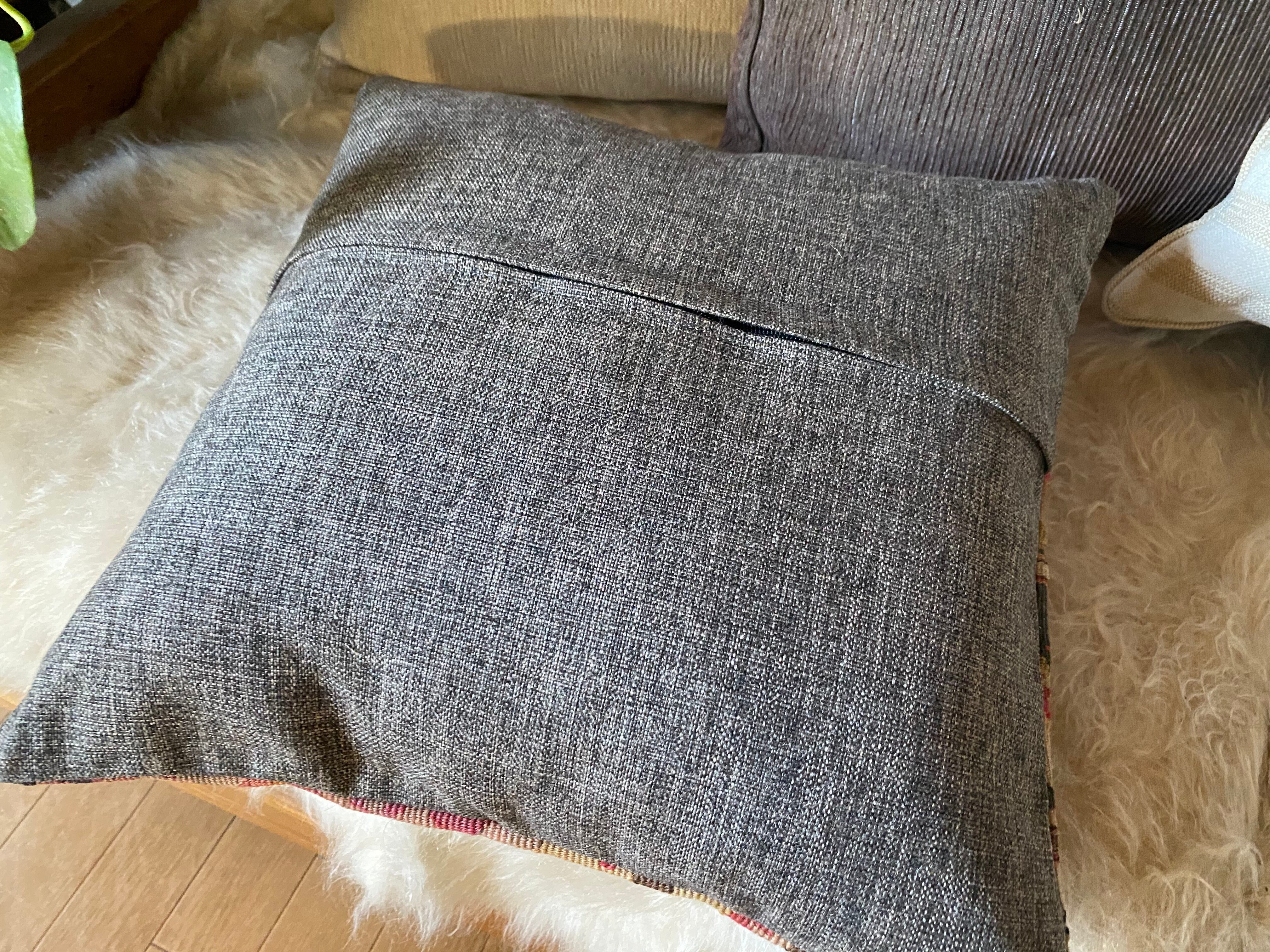 オールドキリム~アンティークキリムから作ったカバーには多少の色染みや、修理跡のあるもの、セミアンティークなどは縦糸 が見えているものもございます。