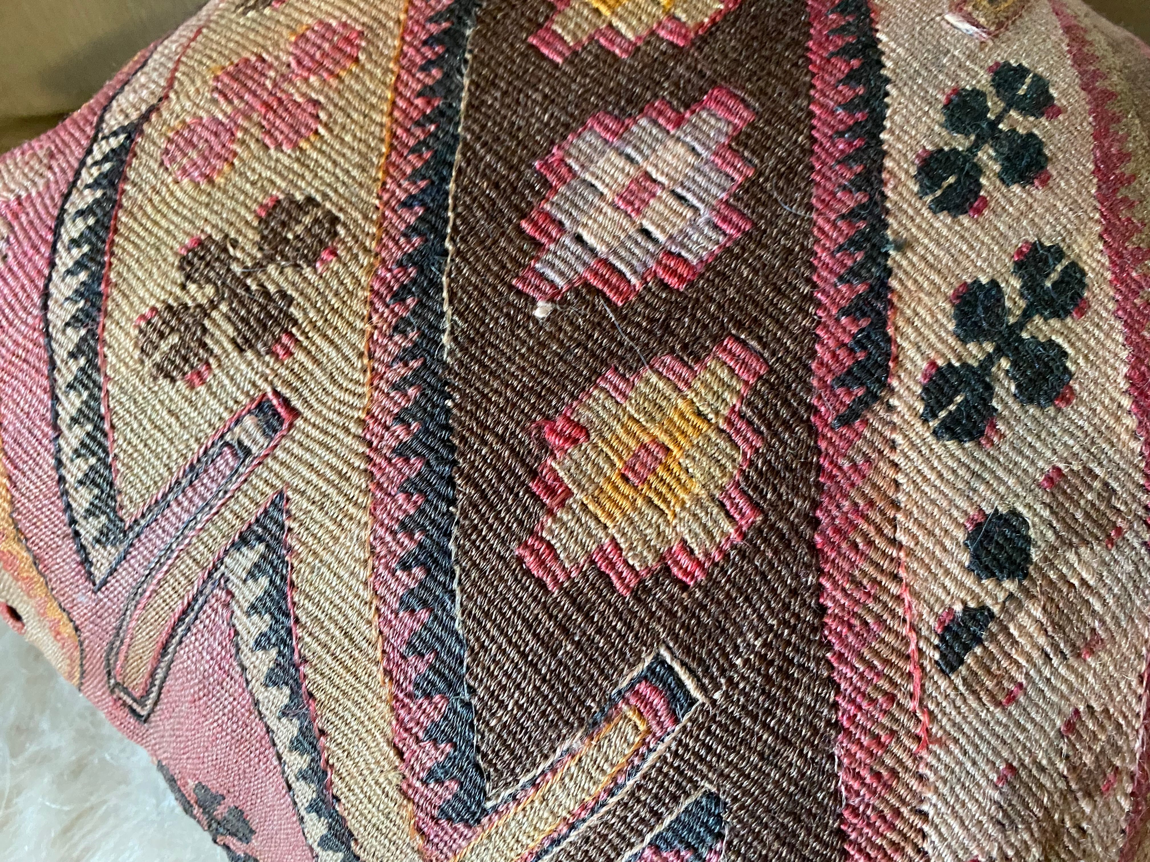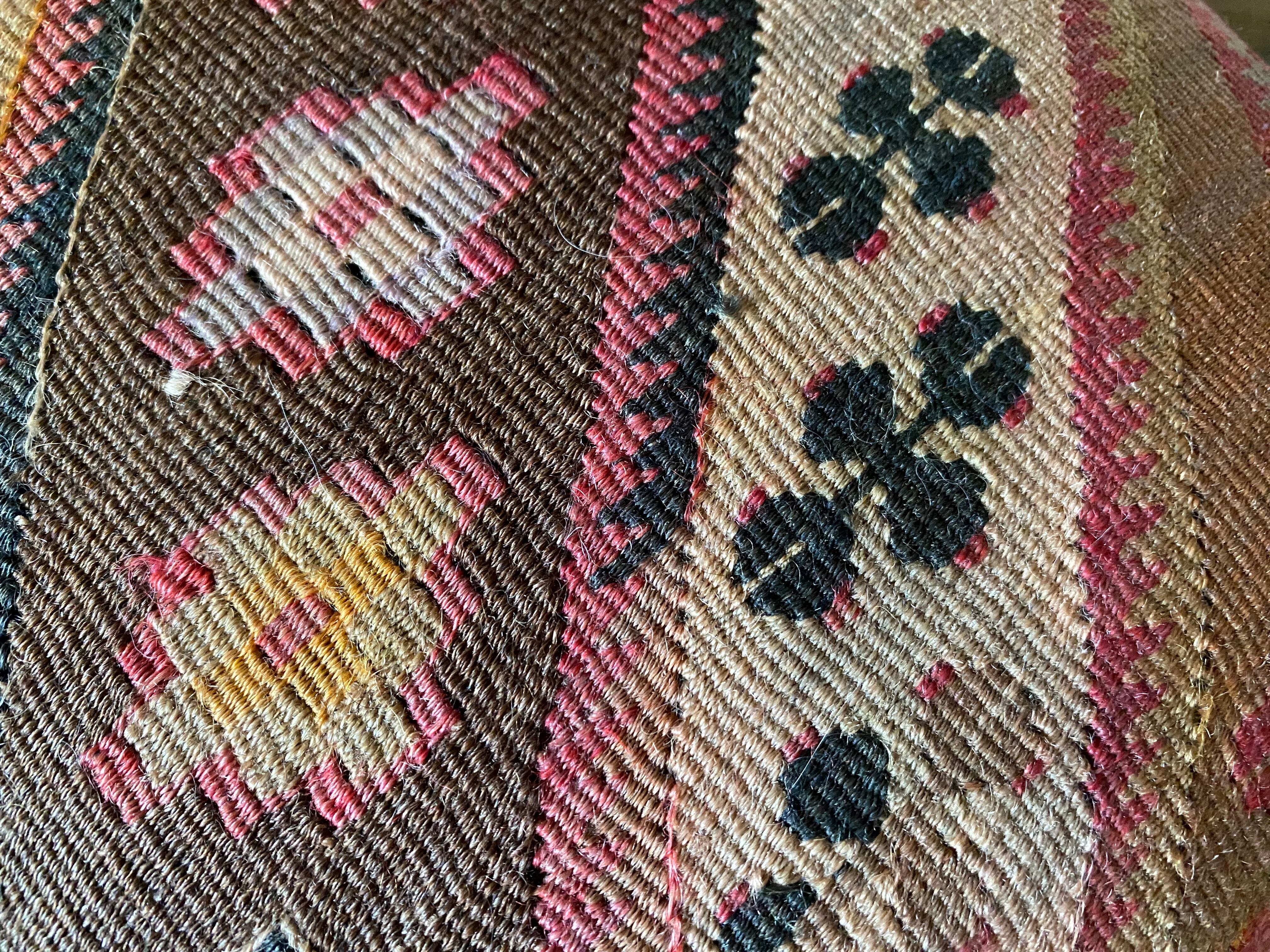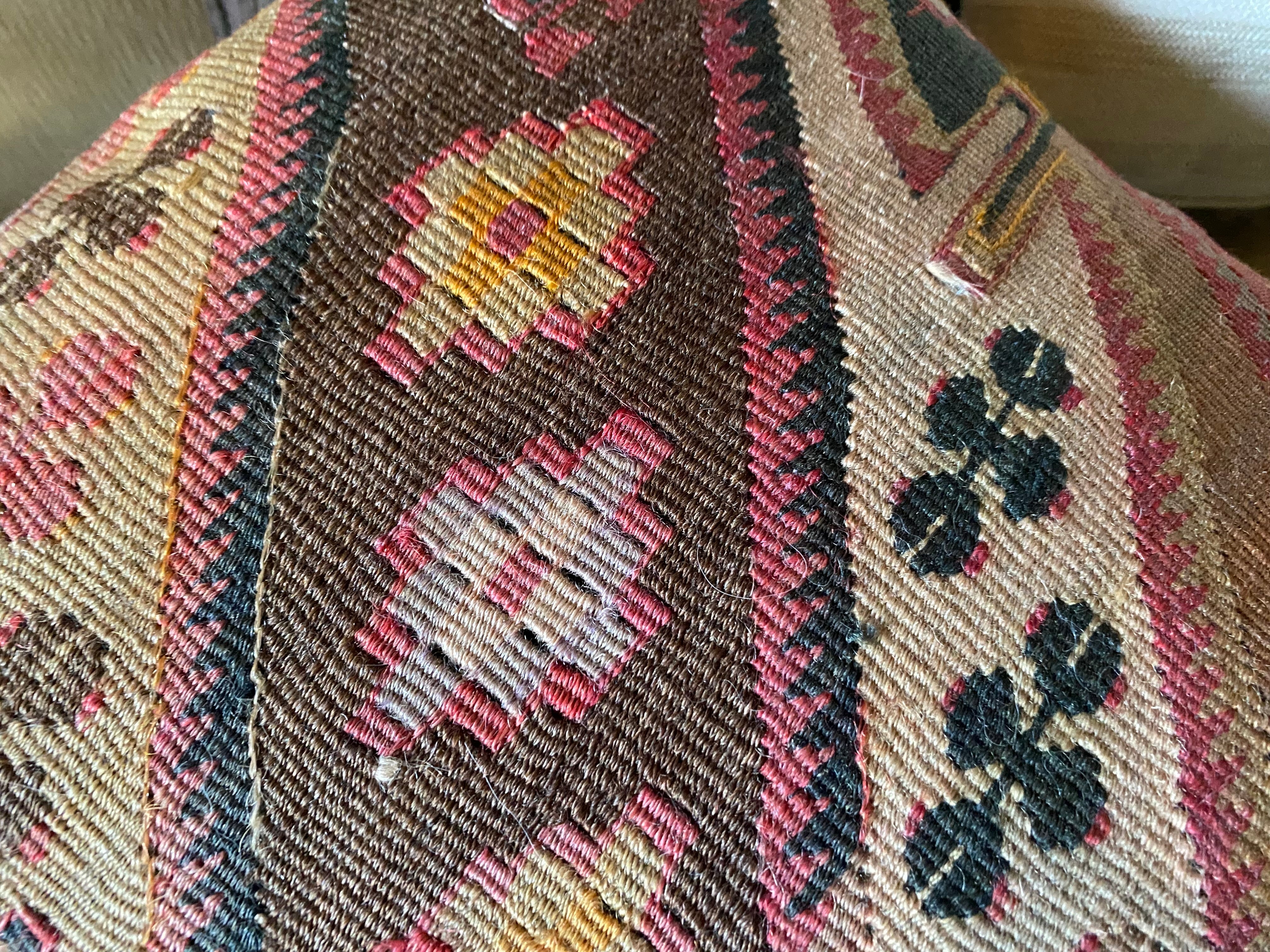 オールドキリム~アンティークキリムから作ったカバーには多少の色染みや、修理跡のあるもの、セミアンティークなどは縦糸 が見えているものもございます。