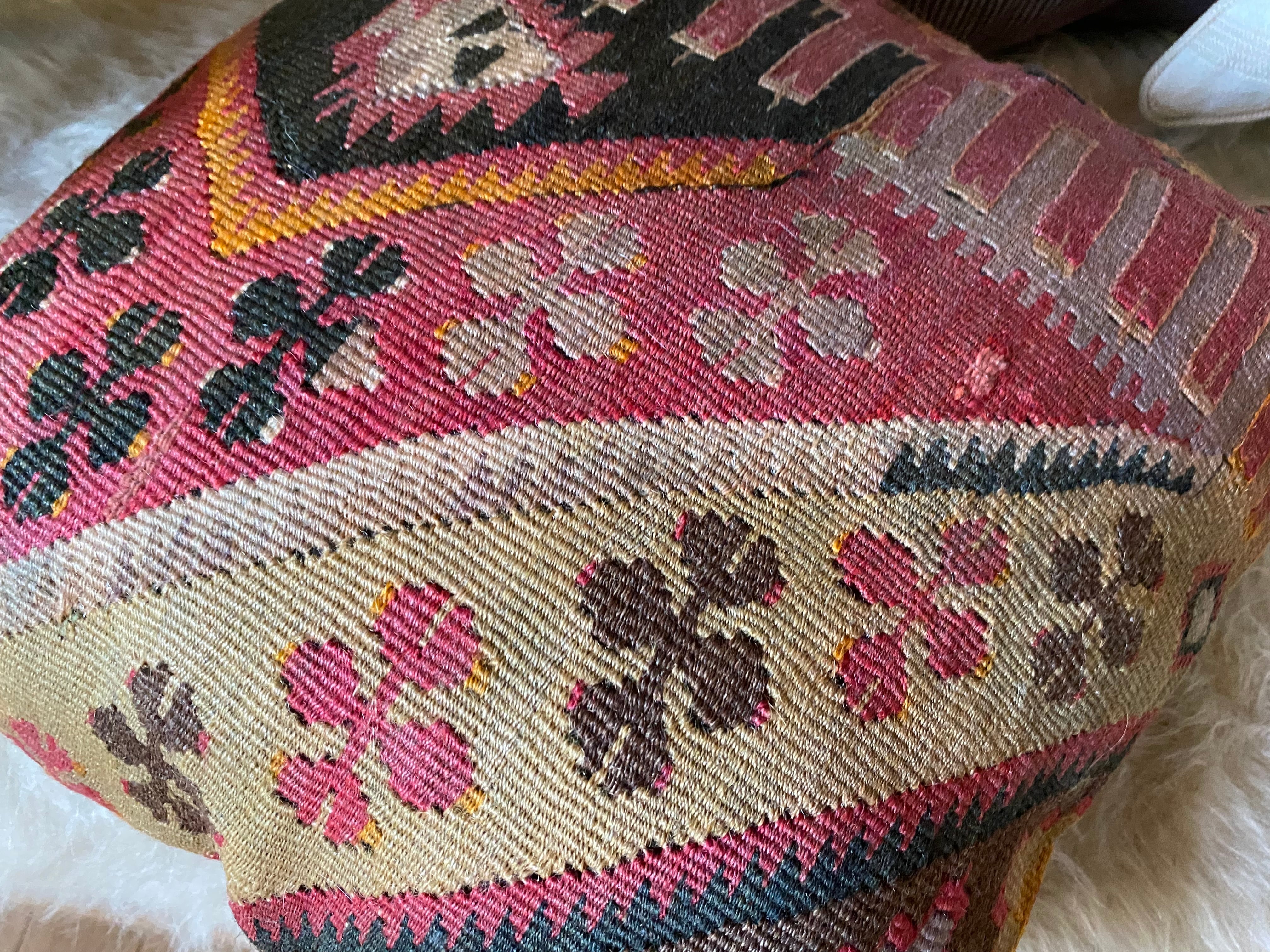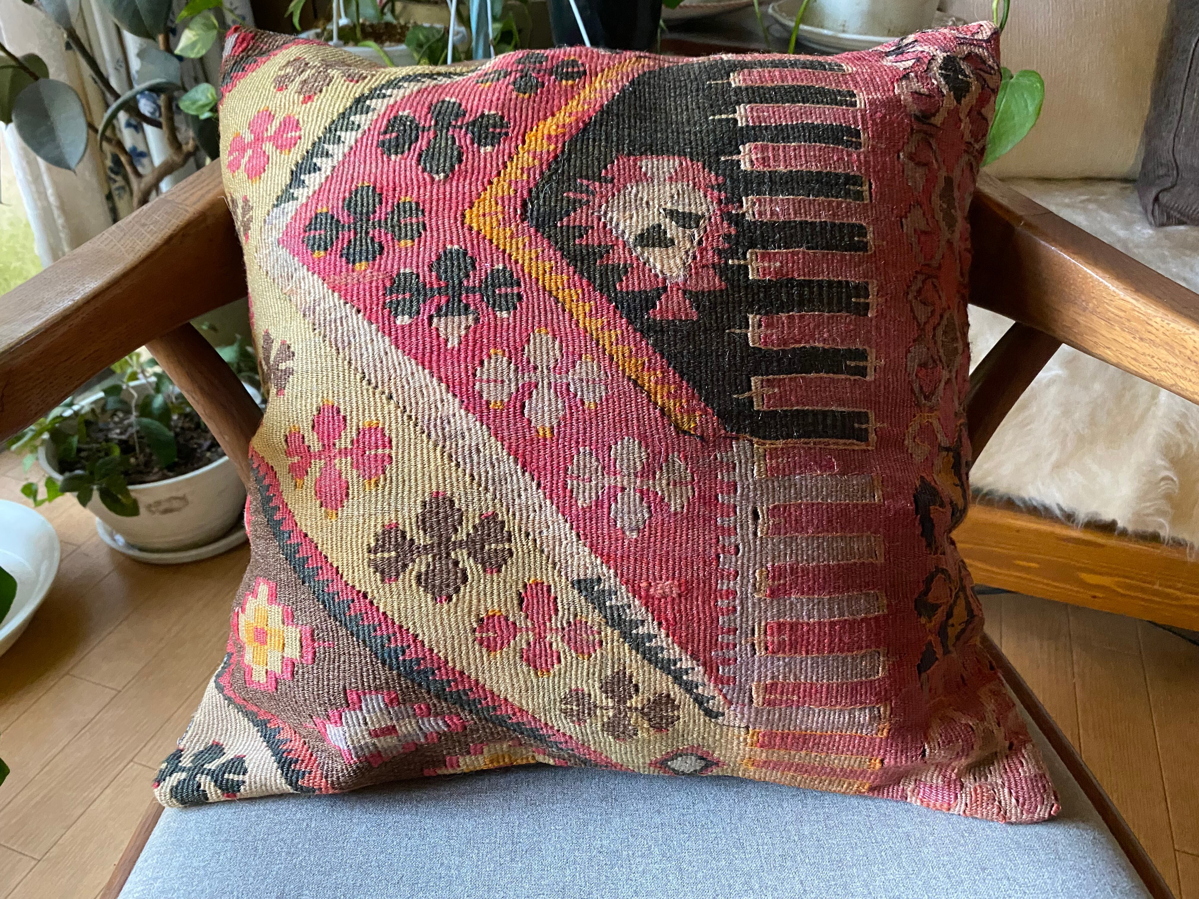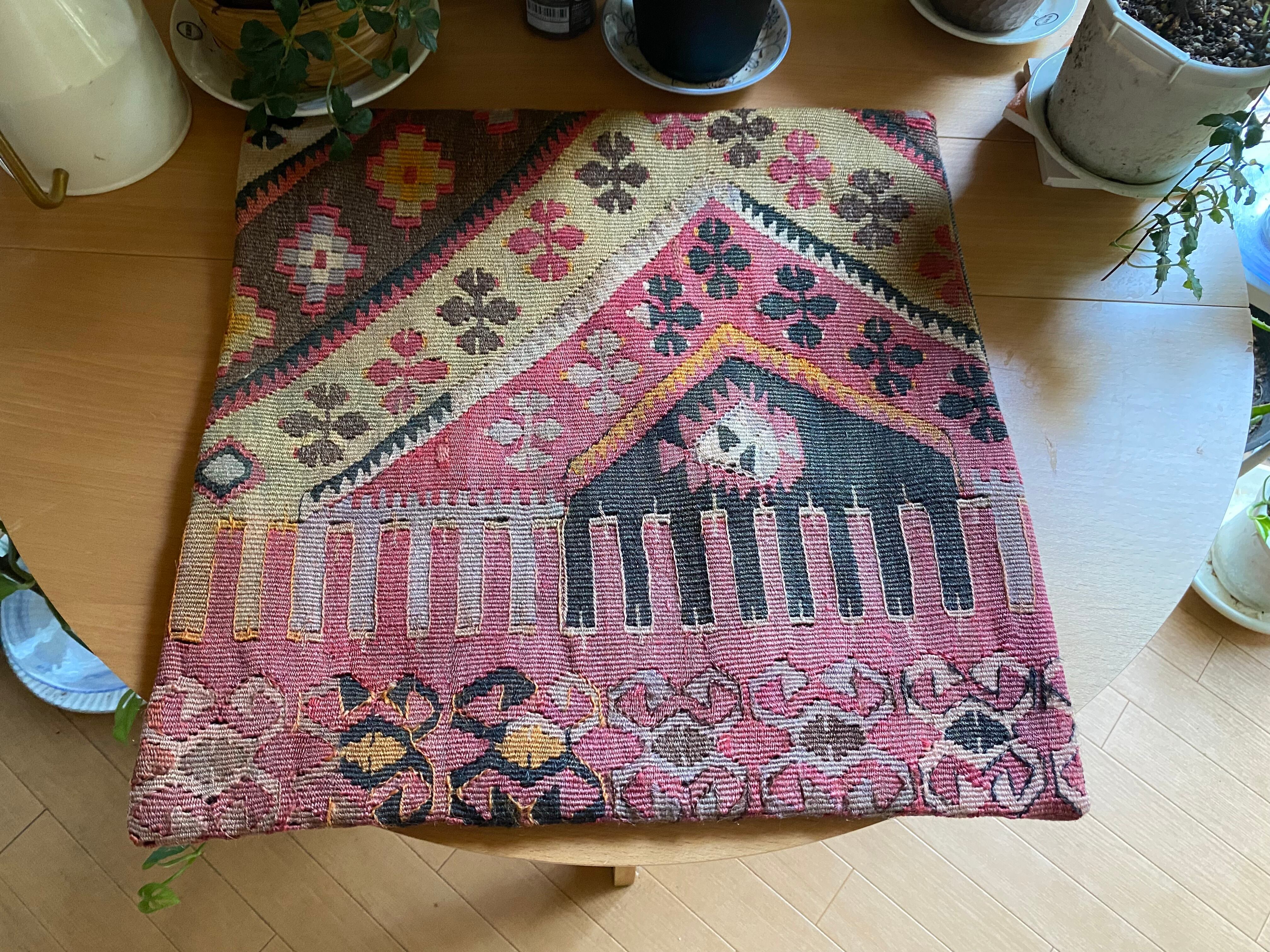 厳選したオールドキリムをカットして作ったカバーです。通常観光地などで販売されているカバーはトルコの絨毯屋で、もう捨てるようなはぎれでつく っておりますのでお安く質もあまりよくないものが多いですが、当店のカバーは一つ一つ厳選したキリムをカットして作っております。