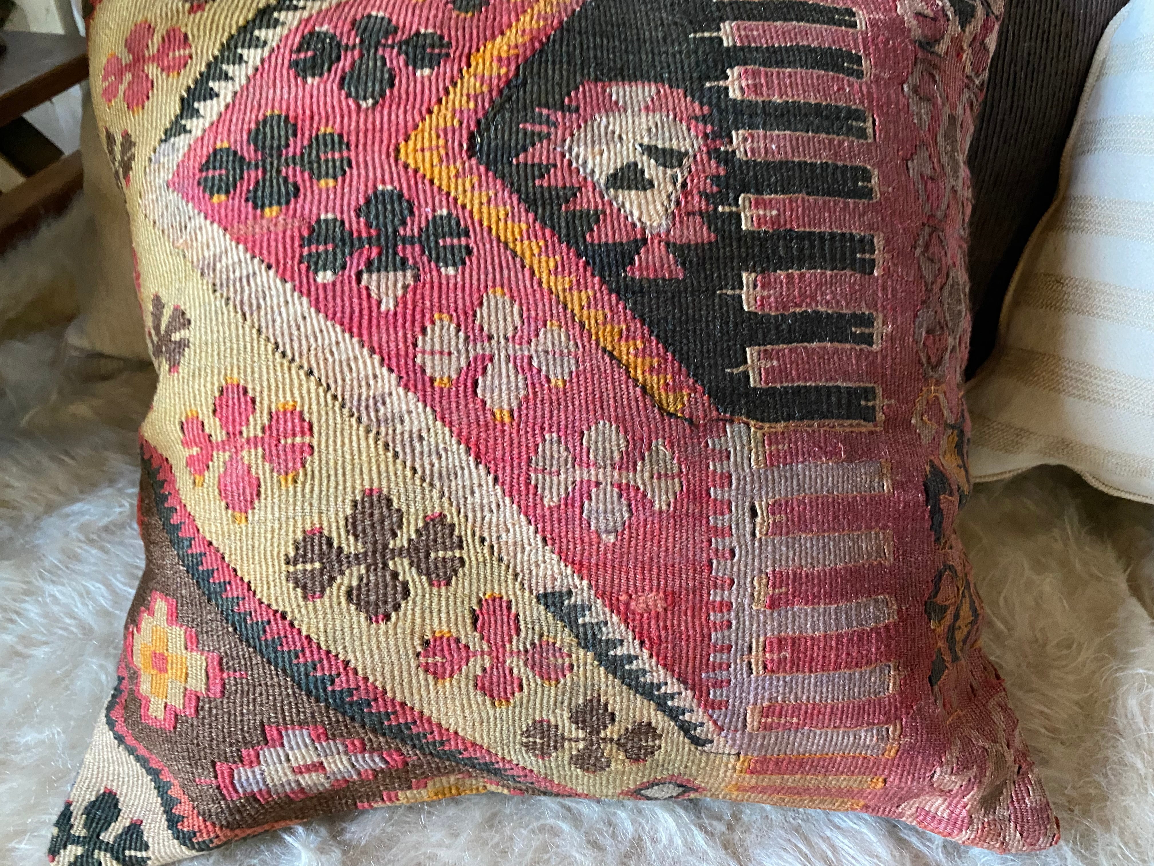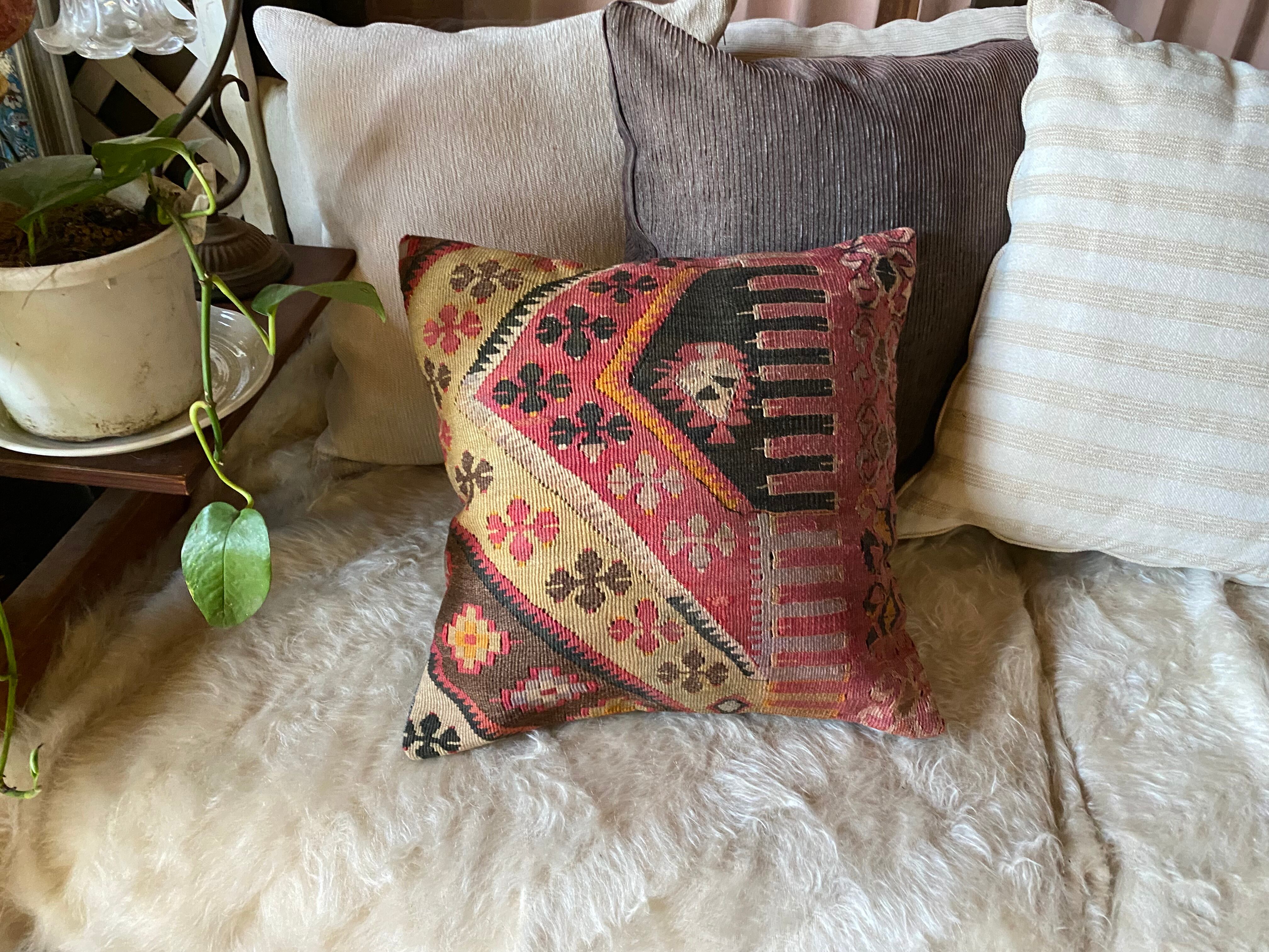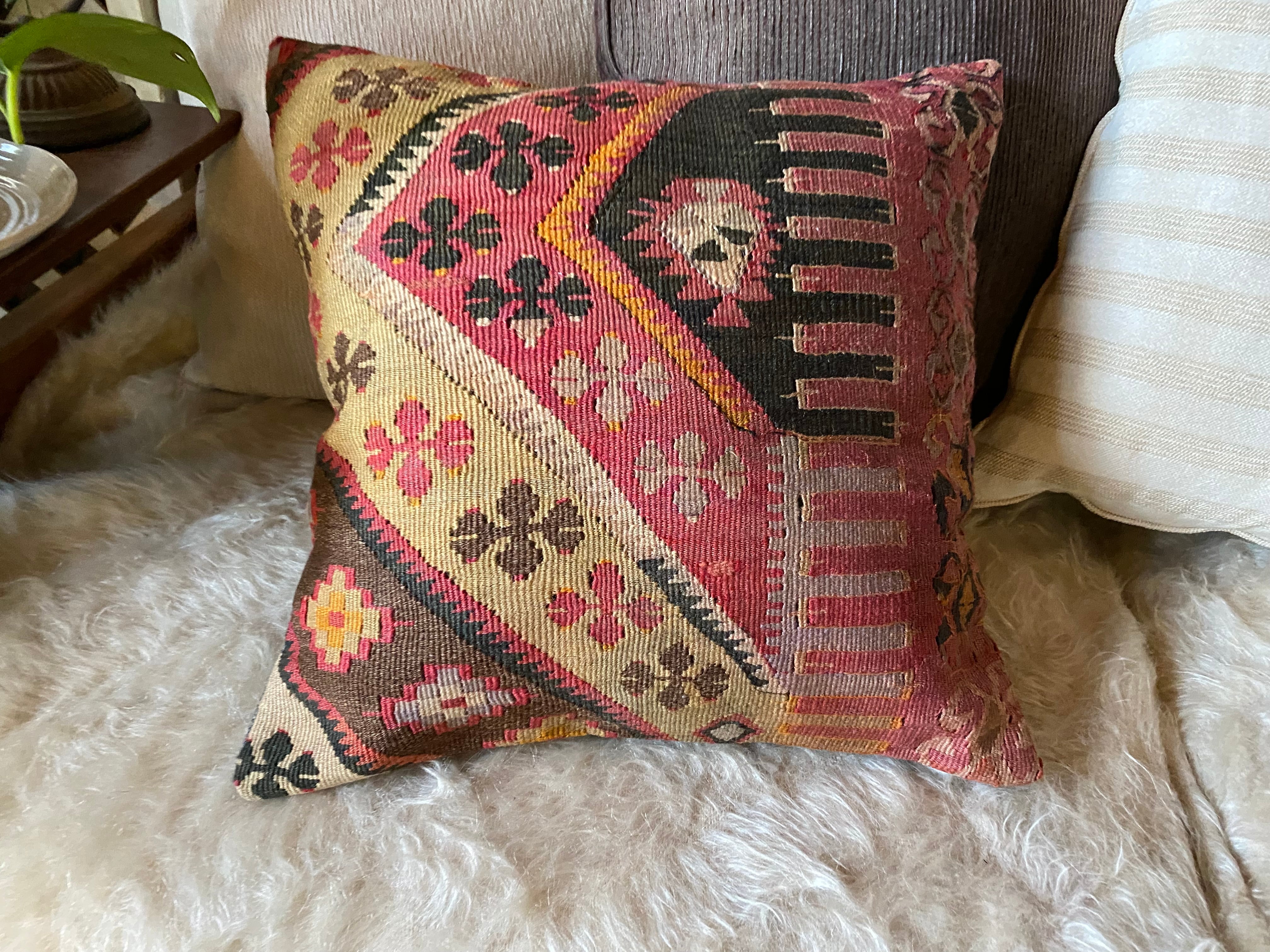 厳選したオールドキリムをカットして作ったカバーです。通常観光地などで販売されているカバーはトルコの絨毯屋で、もう捨てるようなはぎれでつく っておりますのでお安く質もあまりよくないものが多いですが、当店のカバーは一つ一つ厳選したキリムをカットして作っております。