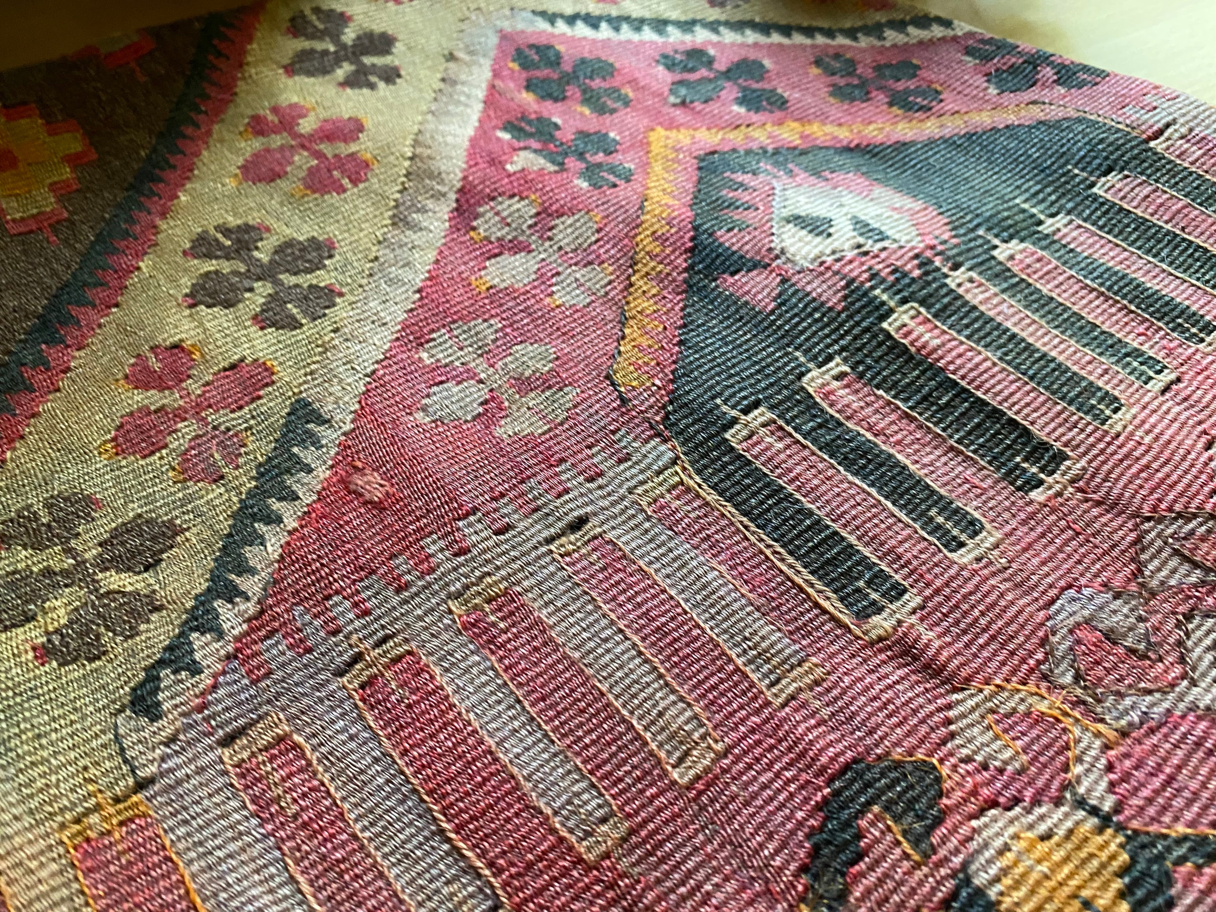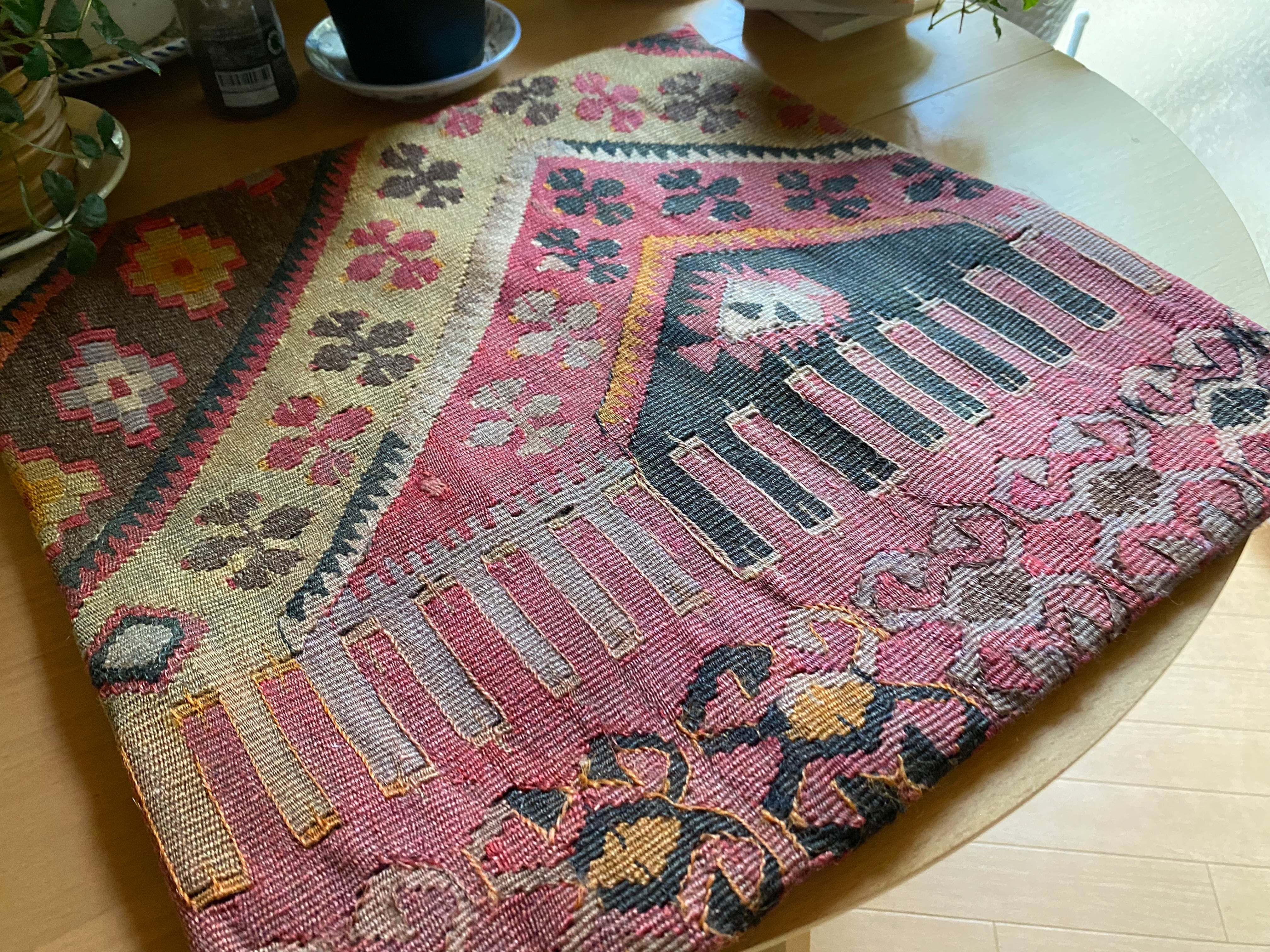 オールドキリム~アンティークキリムから作ったカバーには多少の色染みや、修理跡のあるもの、セミアンティークなどは縦糸 が見えているものもございます。