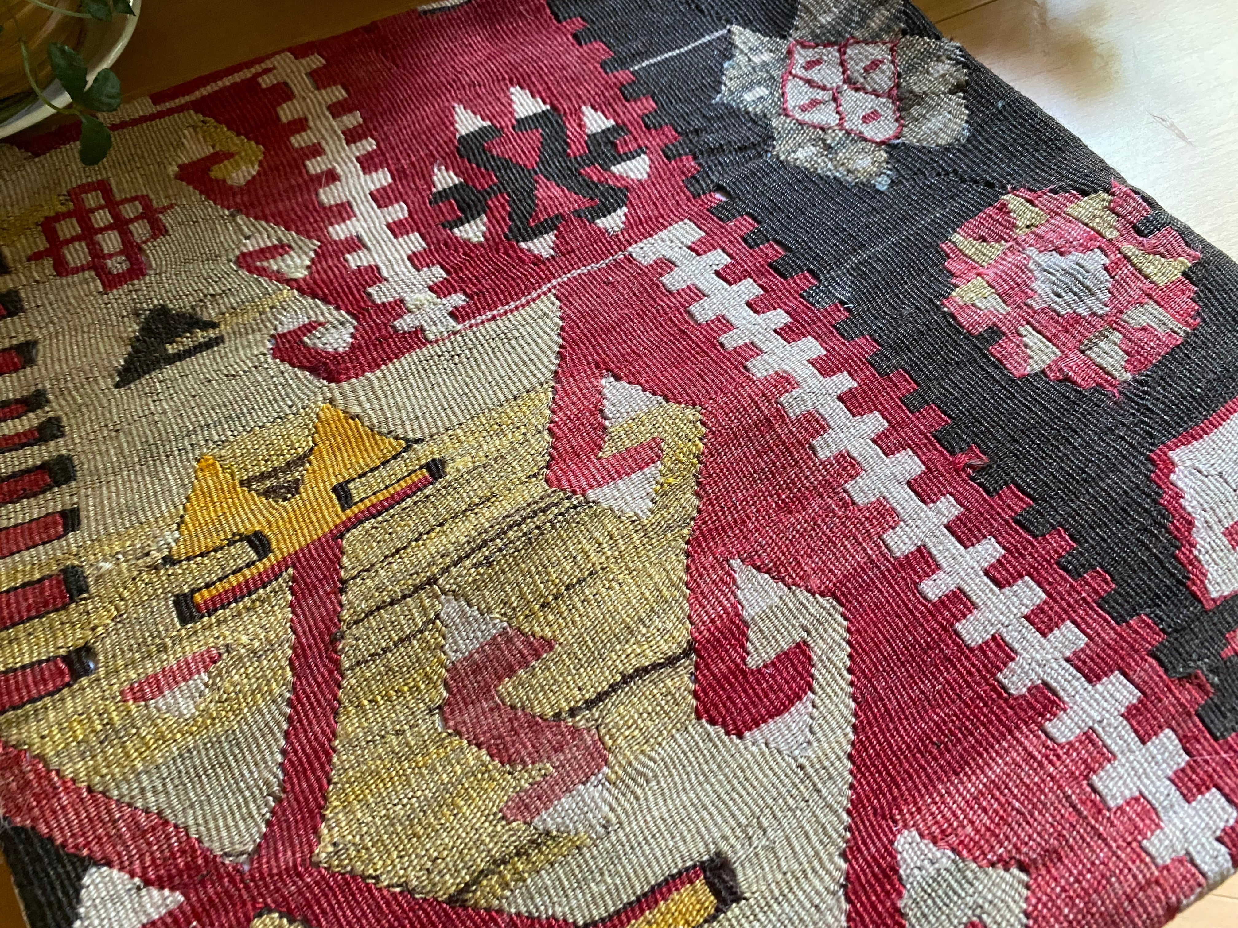 オールドキリム~アンティークキリムから作ったカバーには多少の色染みや、修理跡のあるもの、セミアンティークなどは縦糸 が見えているものもございます。