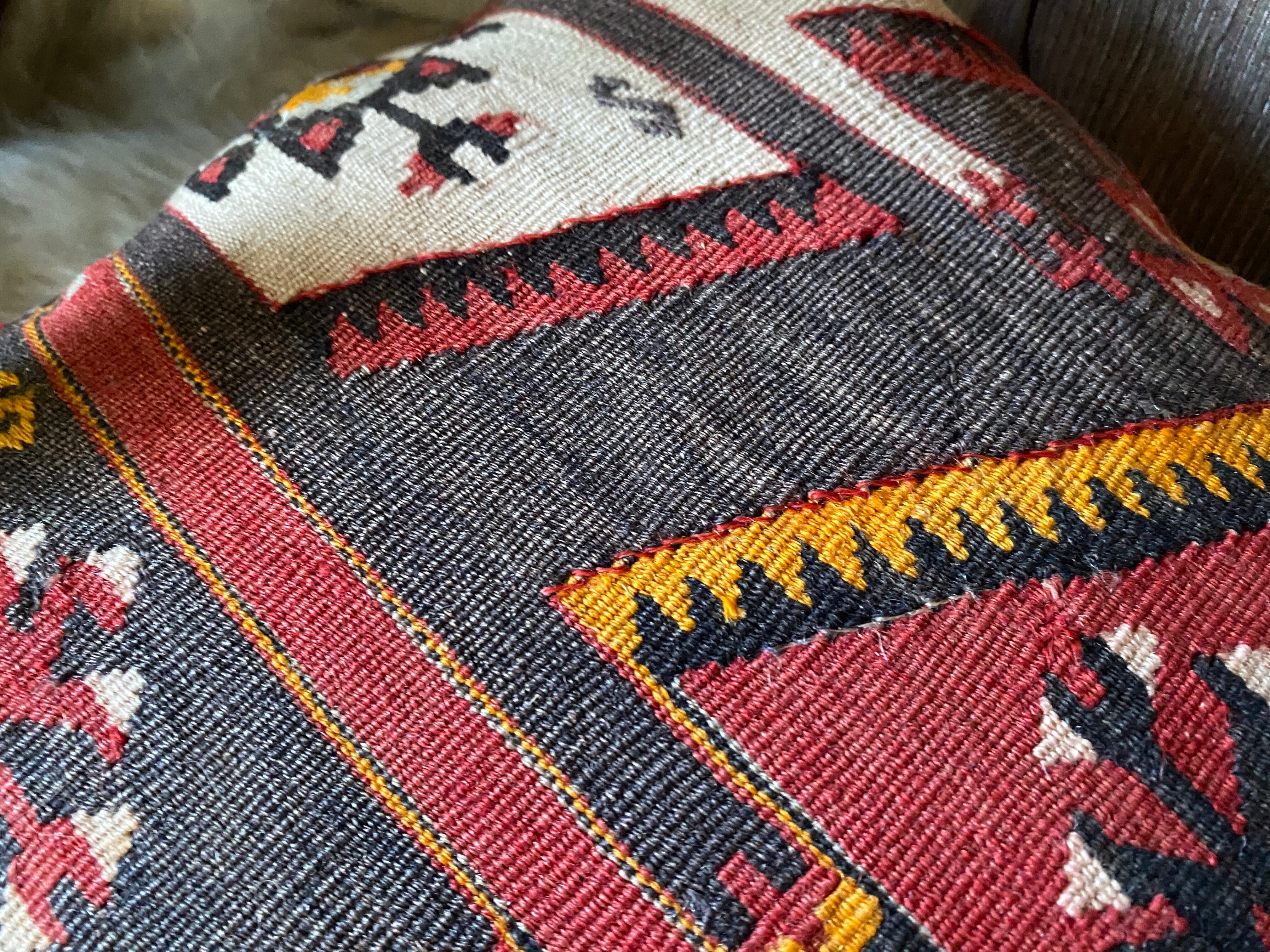 オールドキリム~アンティークキリムから作ったカバーには多少の色染みや、修理跡のあるもの、セミアンティークなどは縦糸 が見えているものもございます。